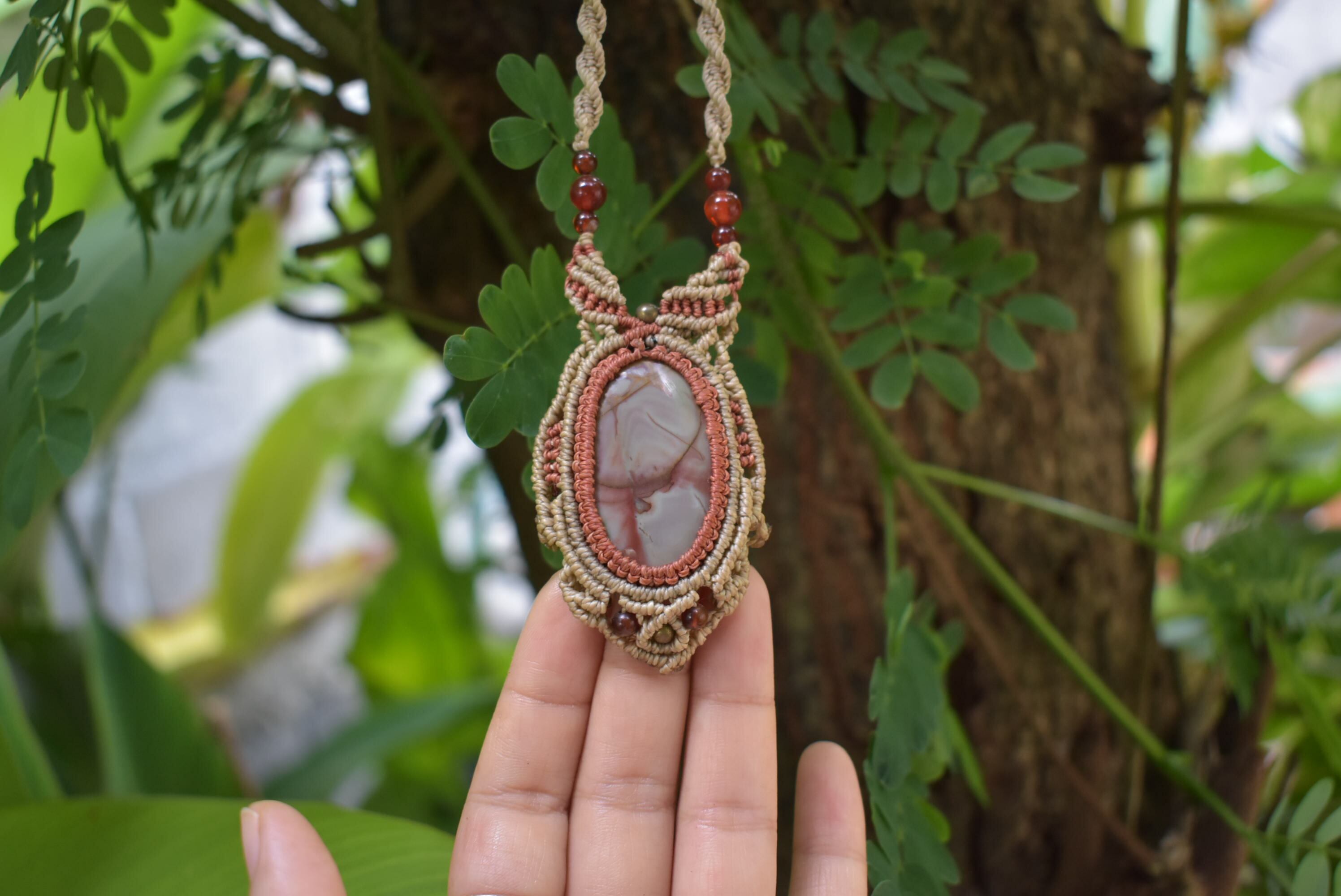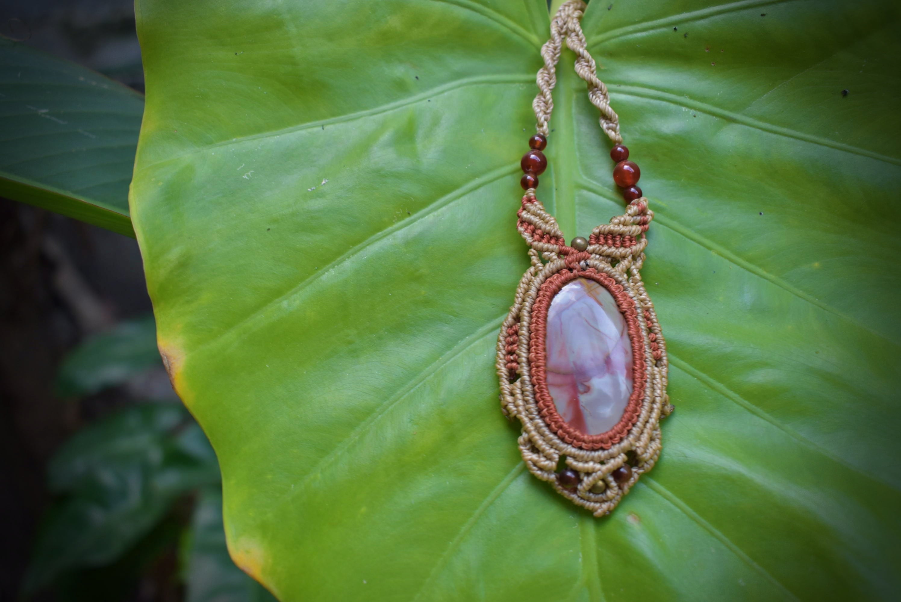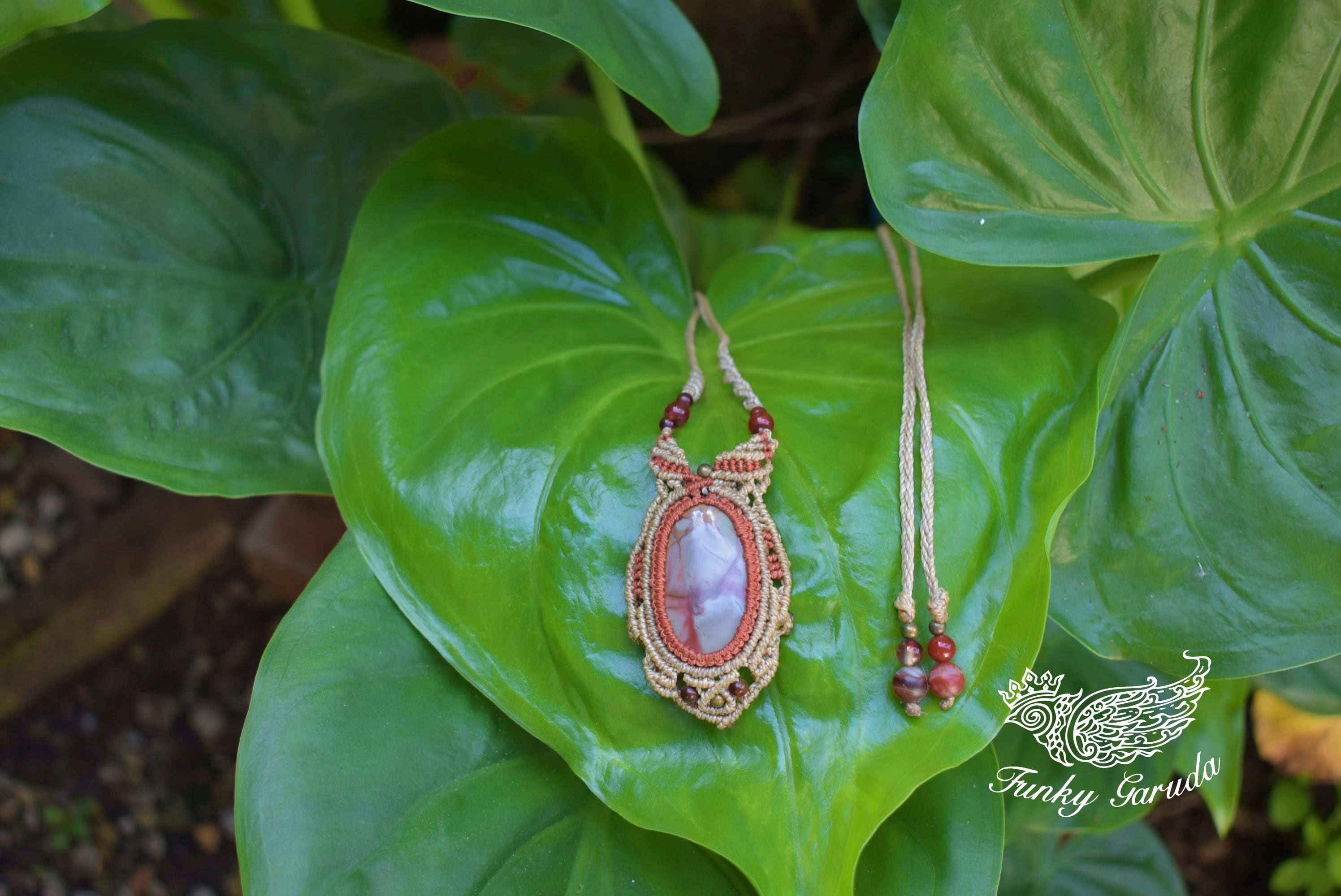 このたびのネックレスはインディアンスタイルにマクラメ編み装飾をしっかりと編み込んだもの。レッドスネークジャスパーの模様と色味をロウビキ糸と編み模様にて表現したネックレスになります。カーネリアンビーズをトッピングして胸元をオールドスクールなデザインが引き立つように編み込み、仕上げました。