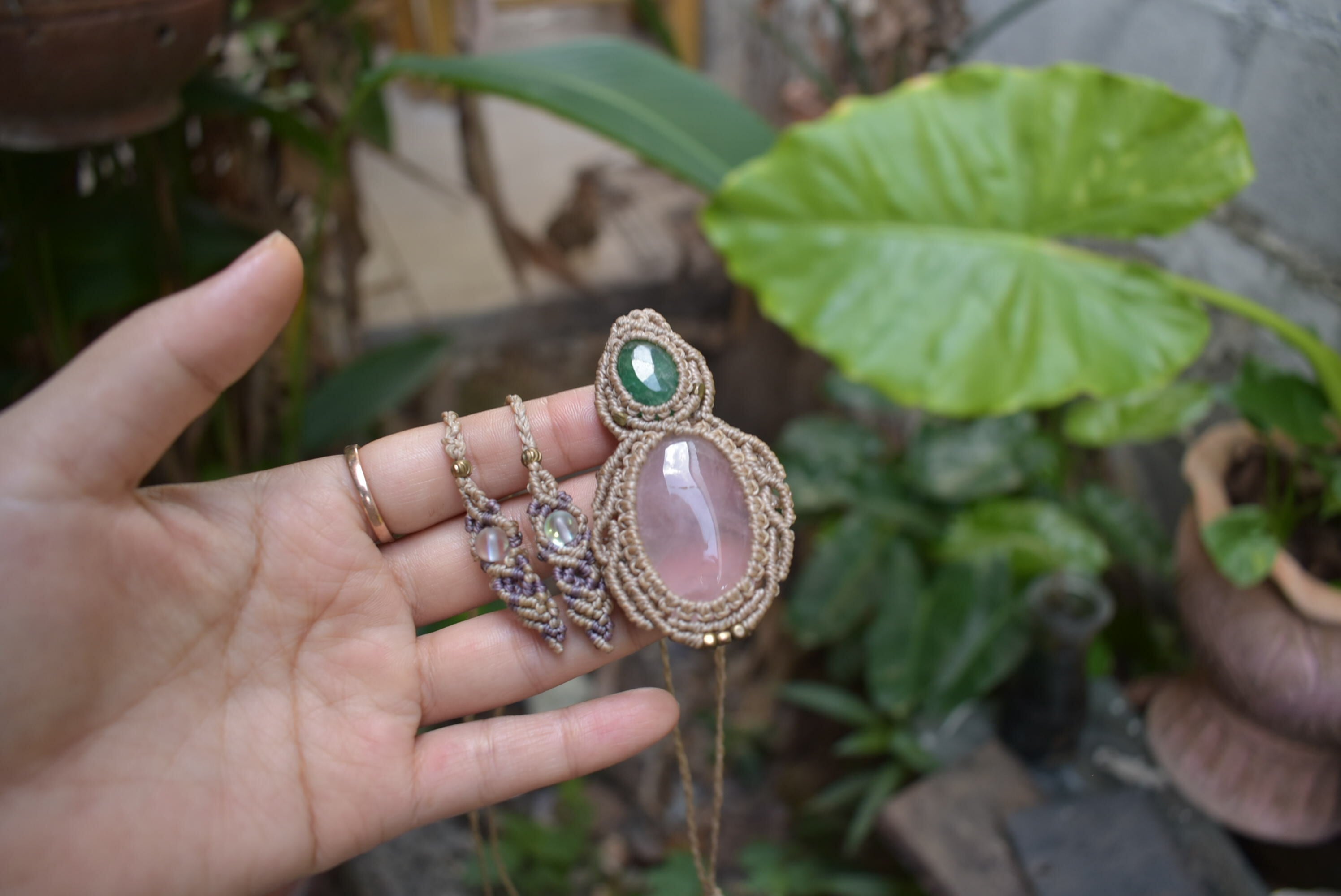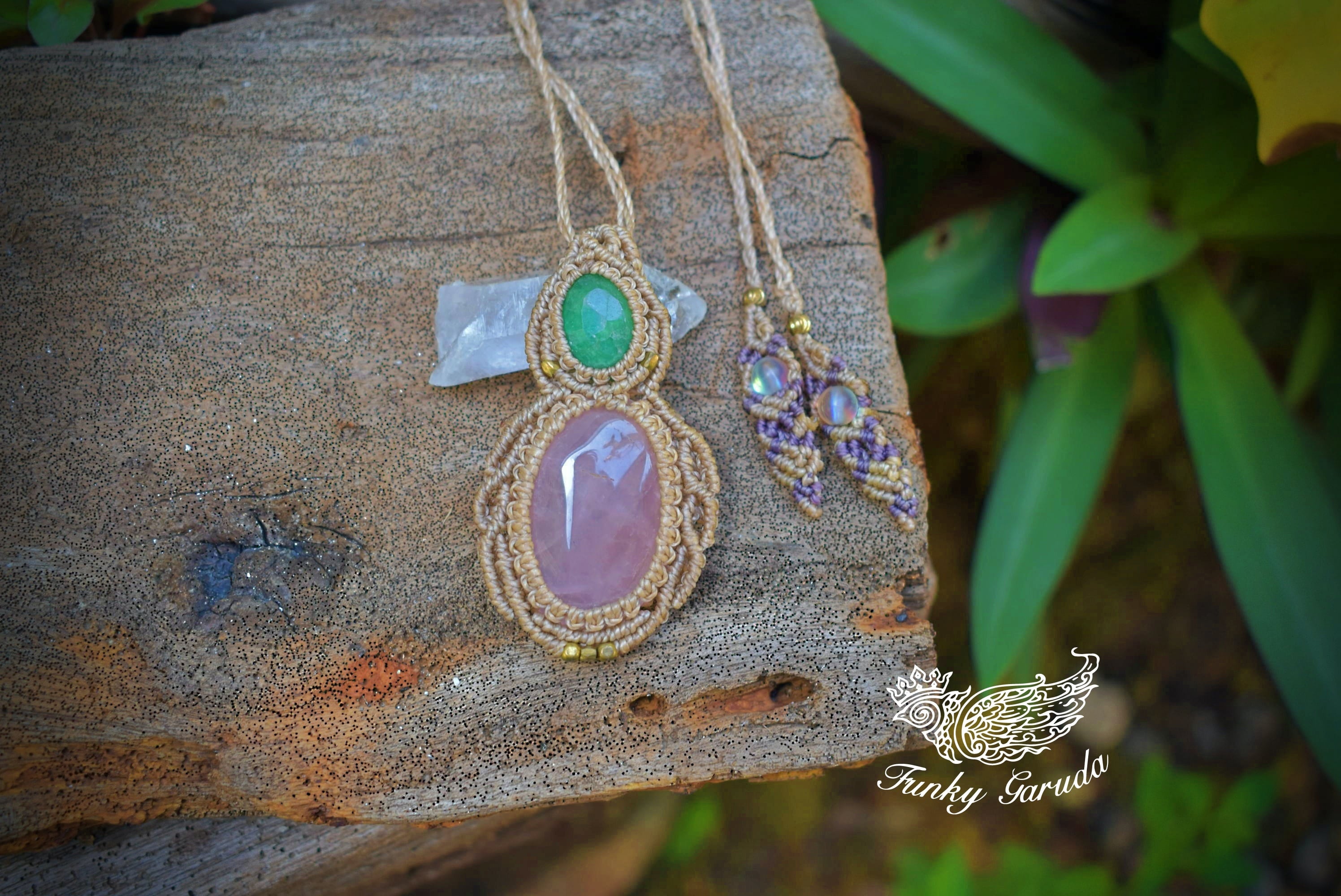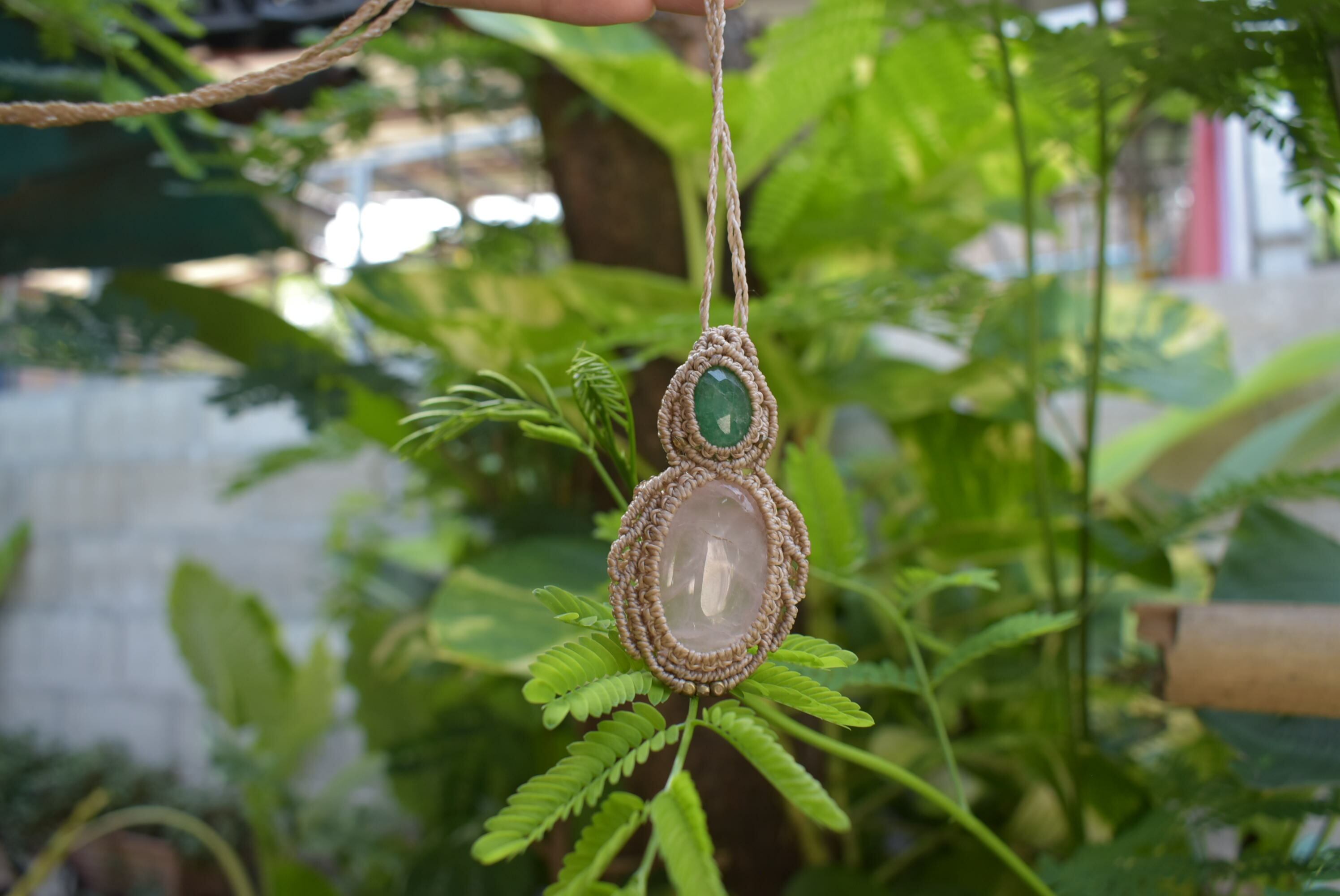 ファセットカットが施されたエメラルドと優しい色合いのピンク色を合わせたローズクォーツ をひとつに、縄の目を意識してマクラメ編み装飾を施しペンダントに仕上げました。