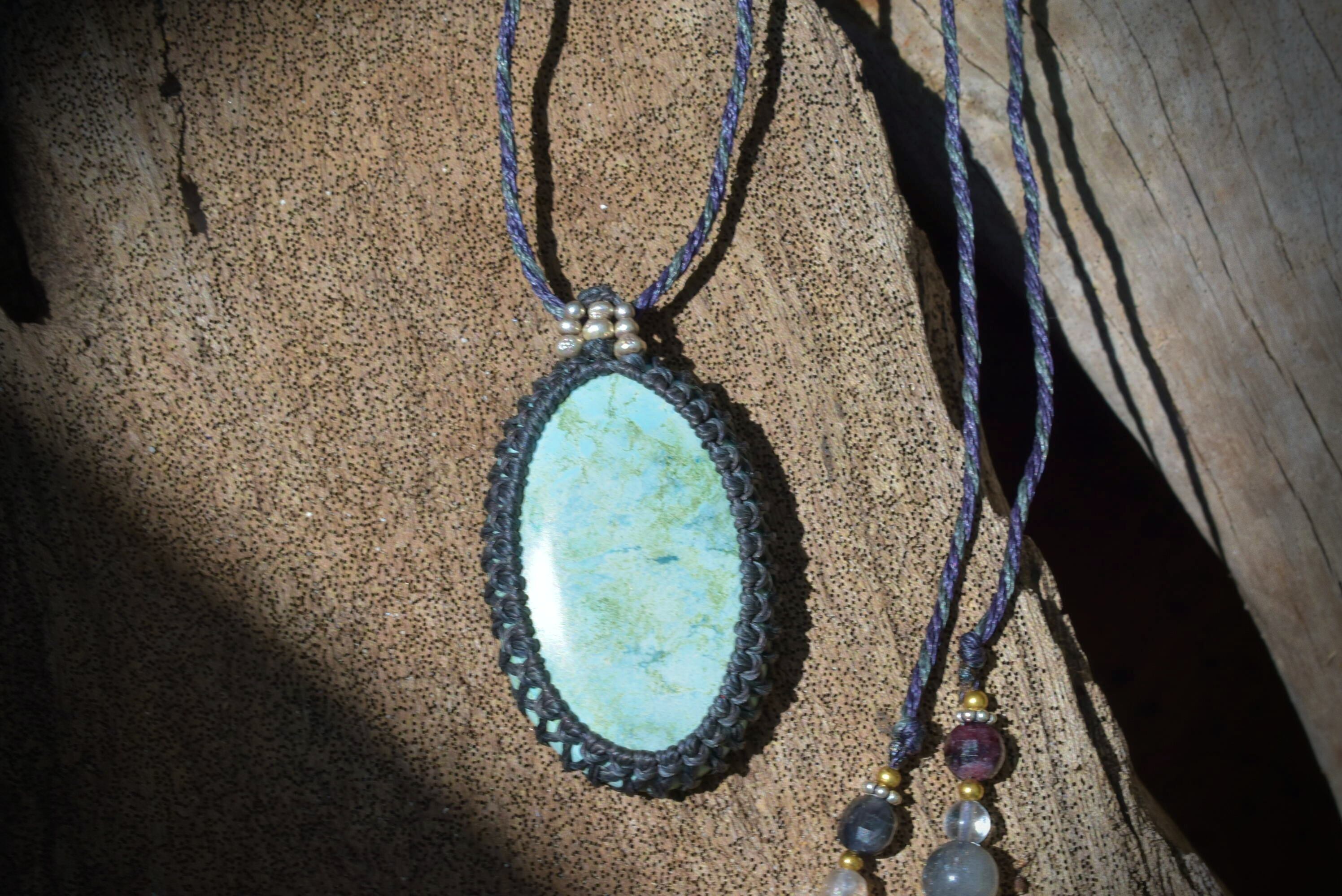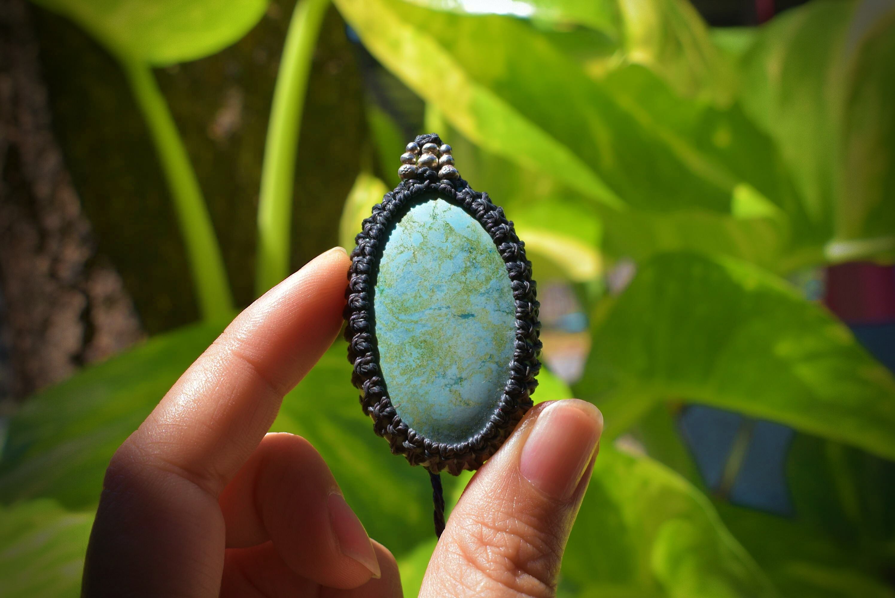 ◆このたびはピーコックブルーインディゴブルー、ゴールドブラウン2色の蝋引き糸を使用しマクラメ編み装飾を施しました。