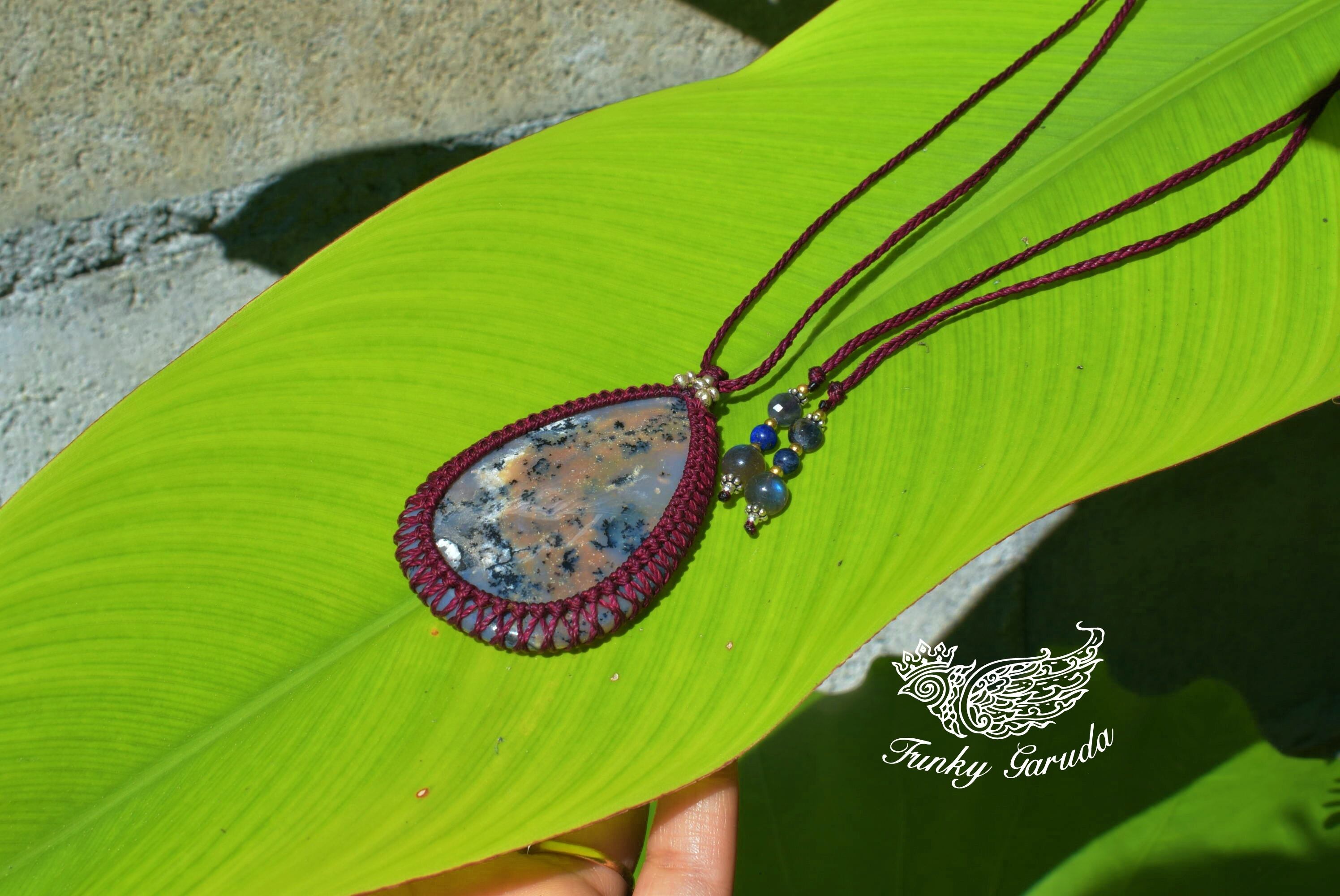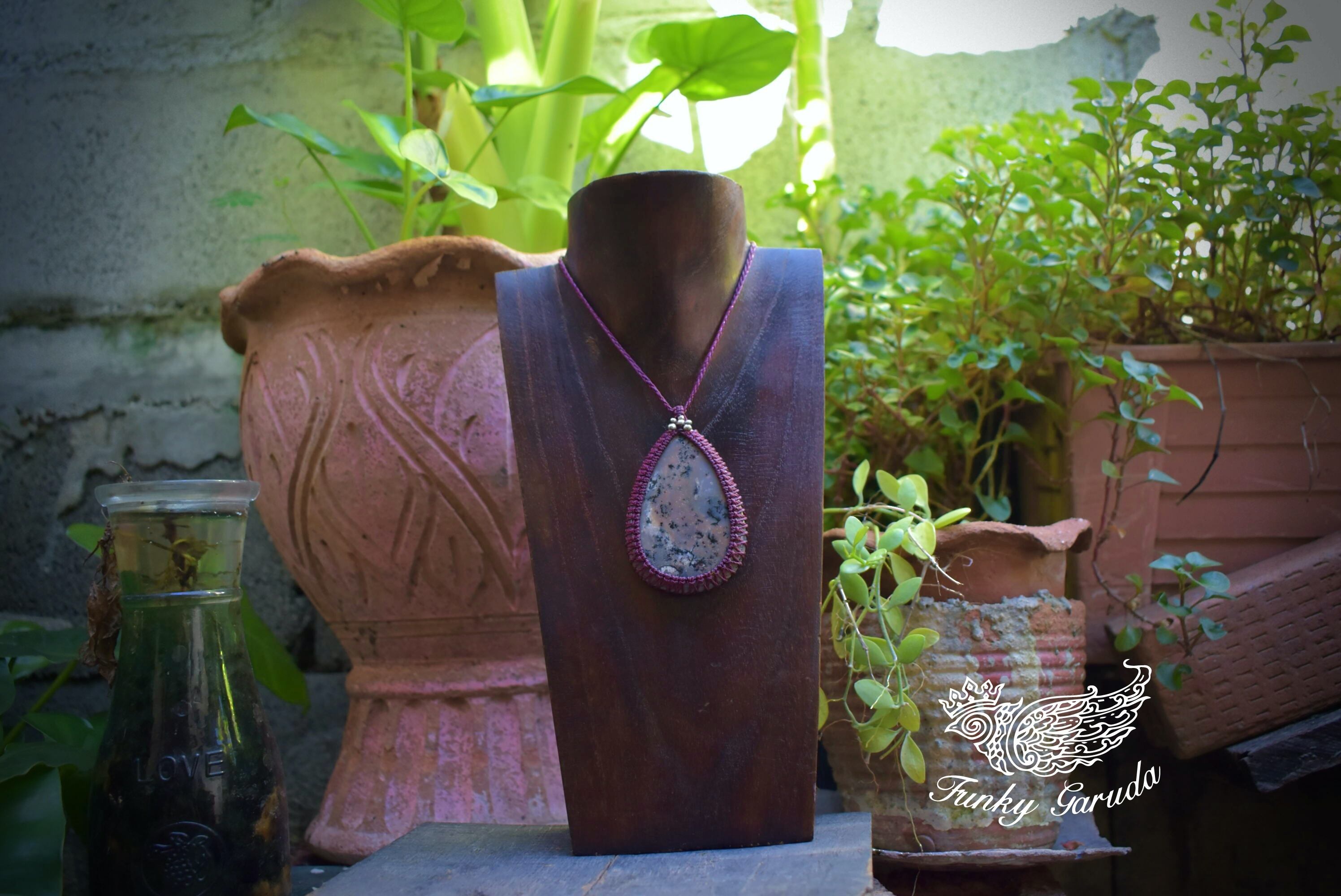 ◆このたびはボルドー色の蝋引き糸を使用しマクラメ編み装飾を施しました。
