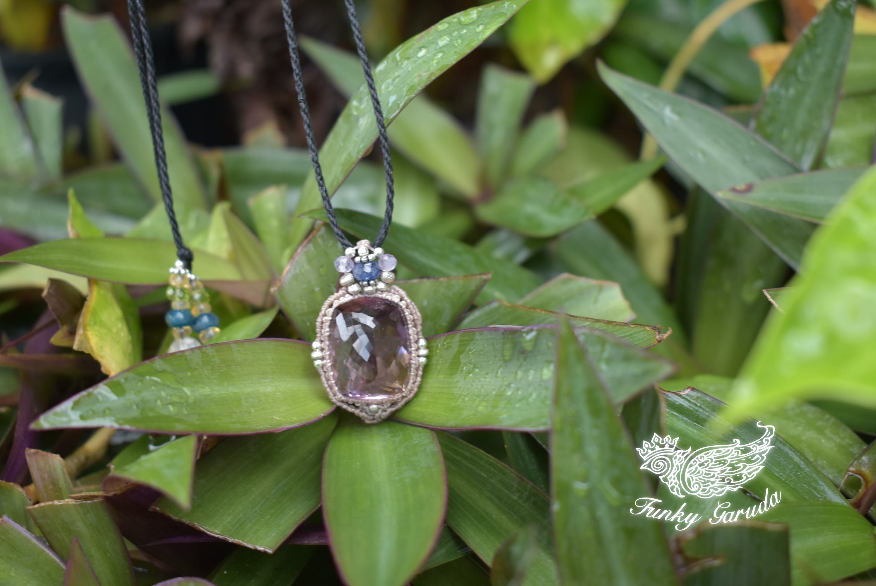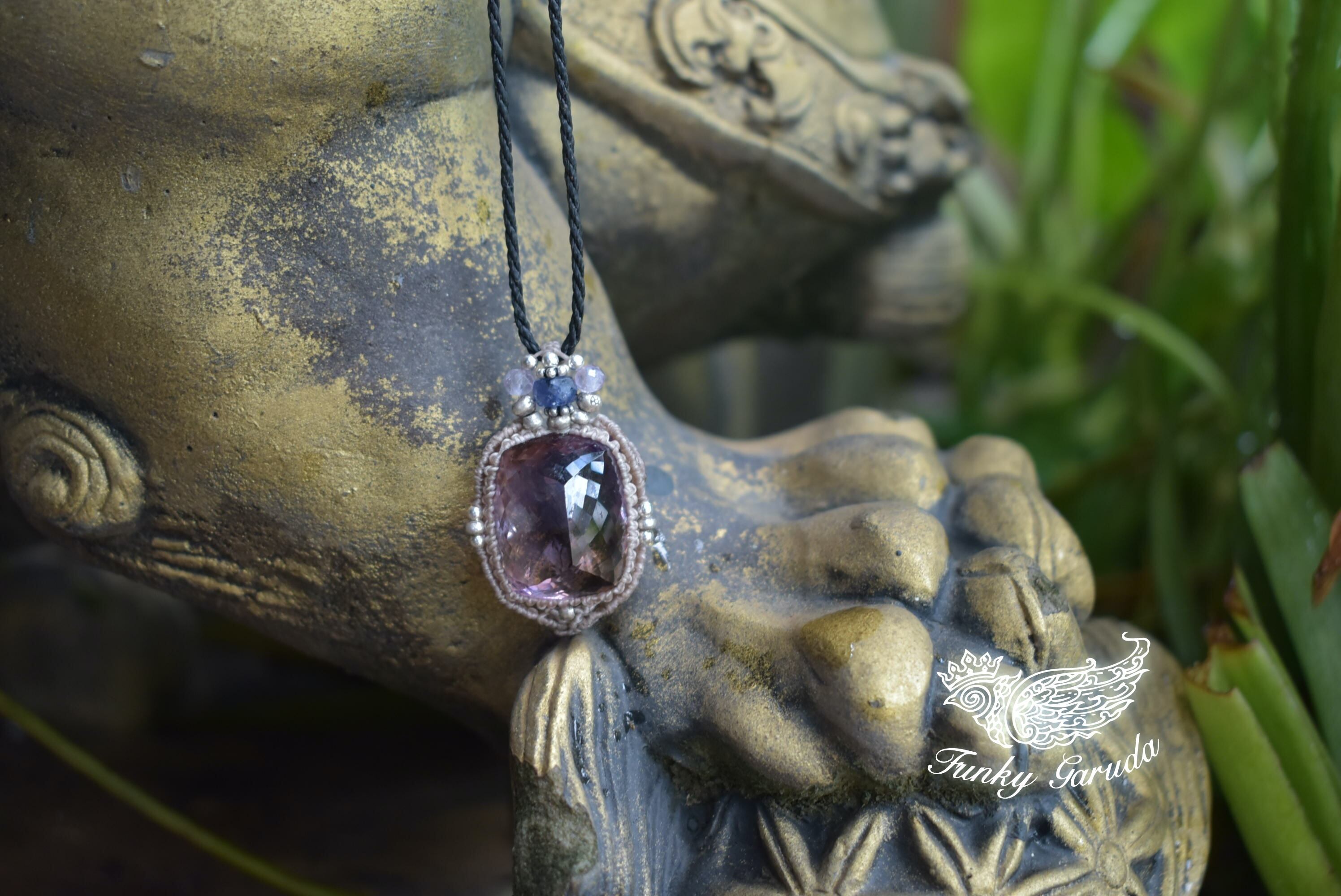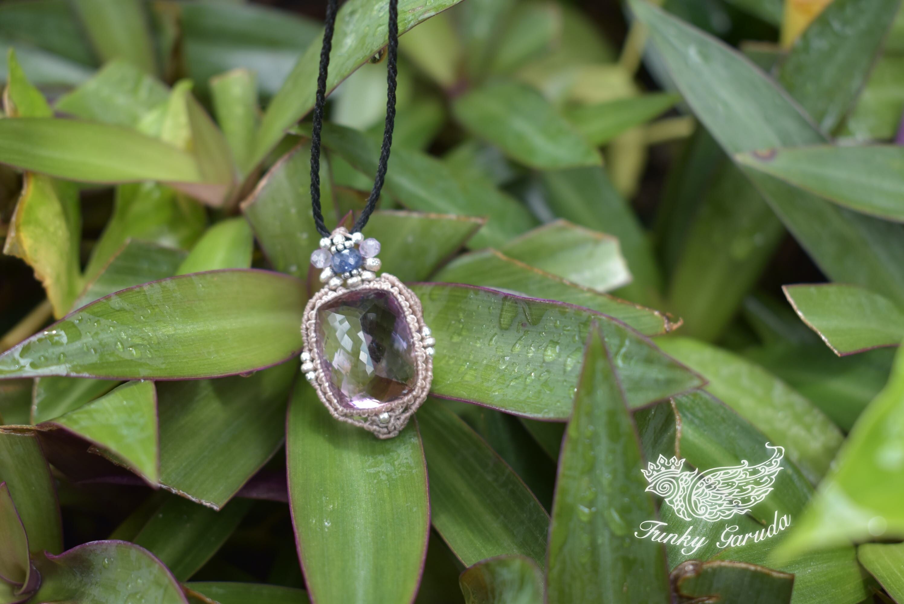 カットが施されたアイオライトとアメジストビーズをあしらい、より繊細なマクラメペンダントに仕上げました。