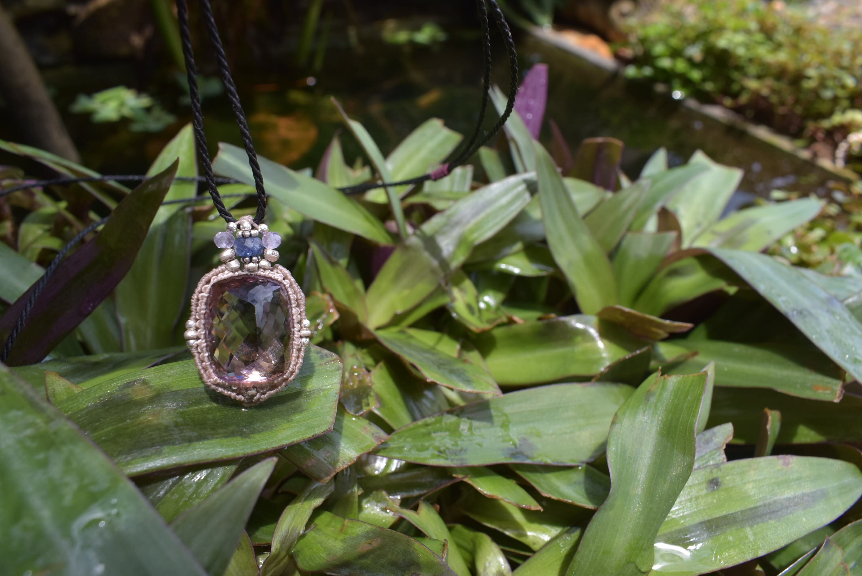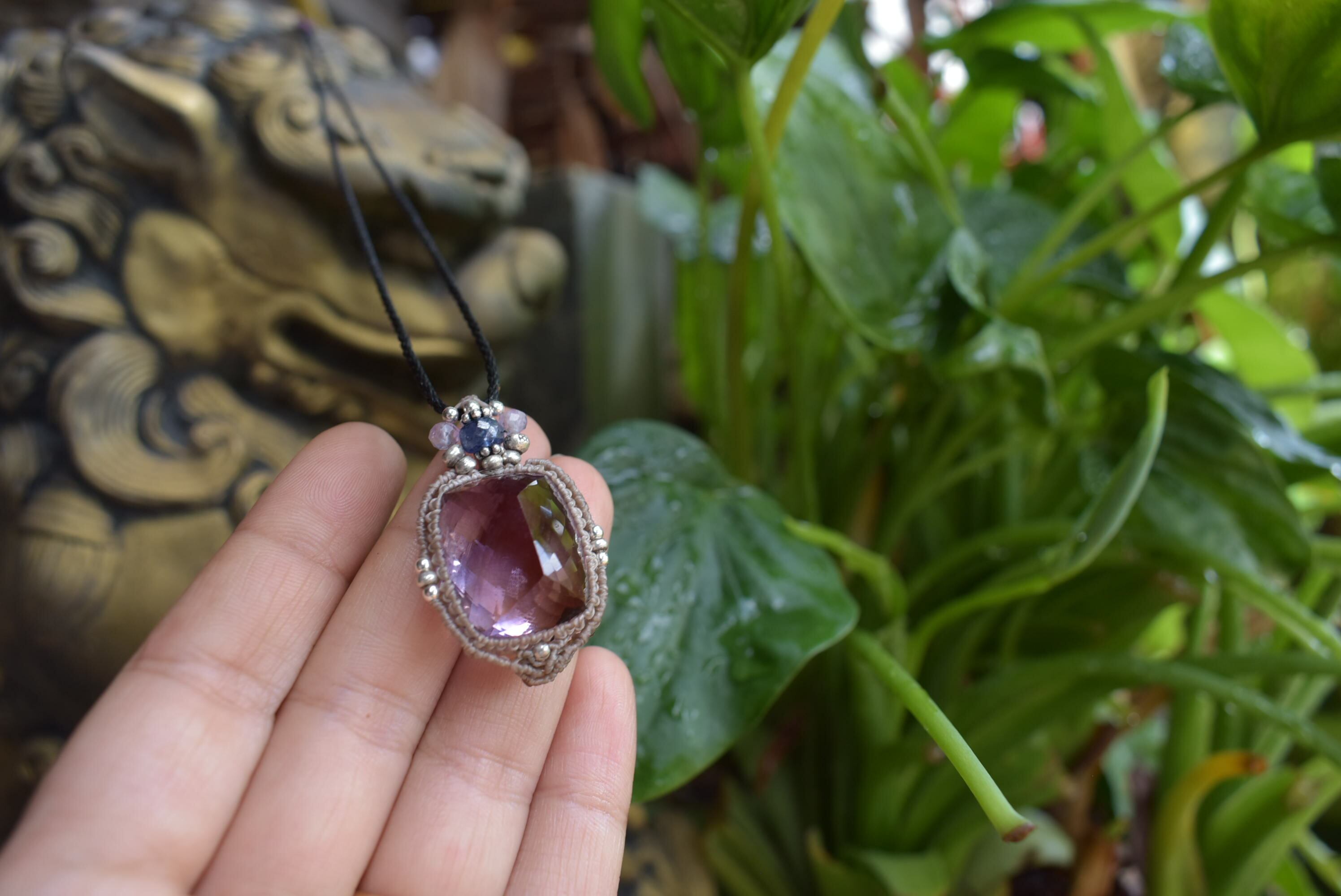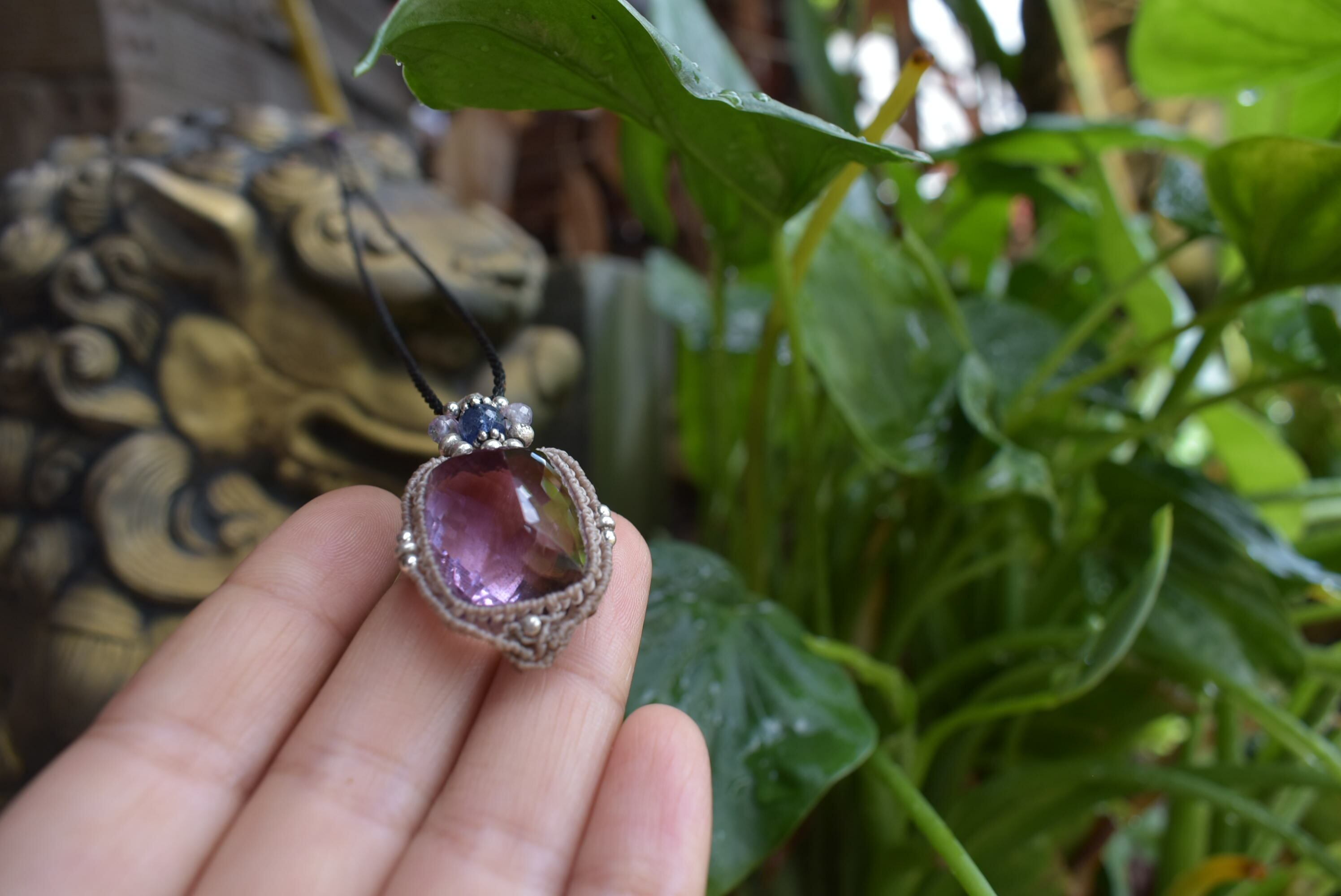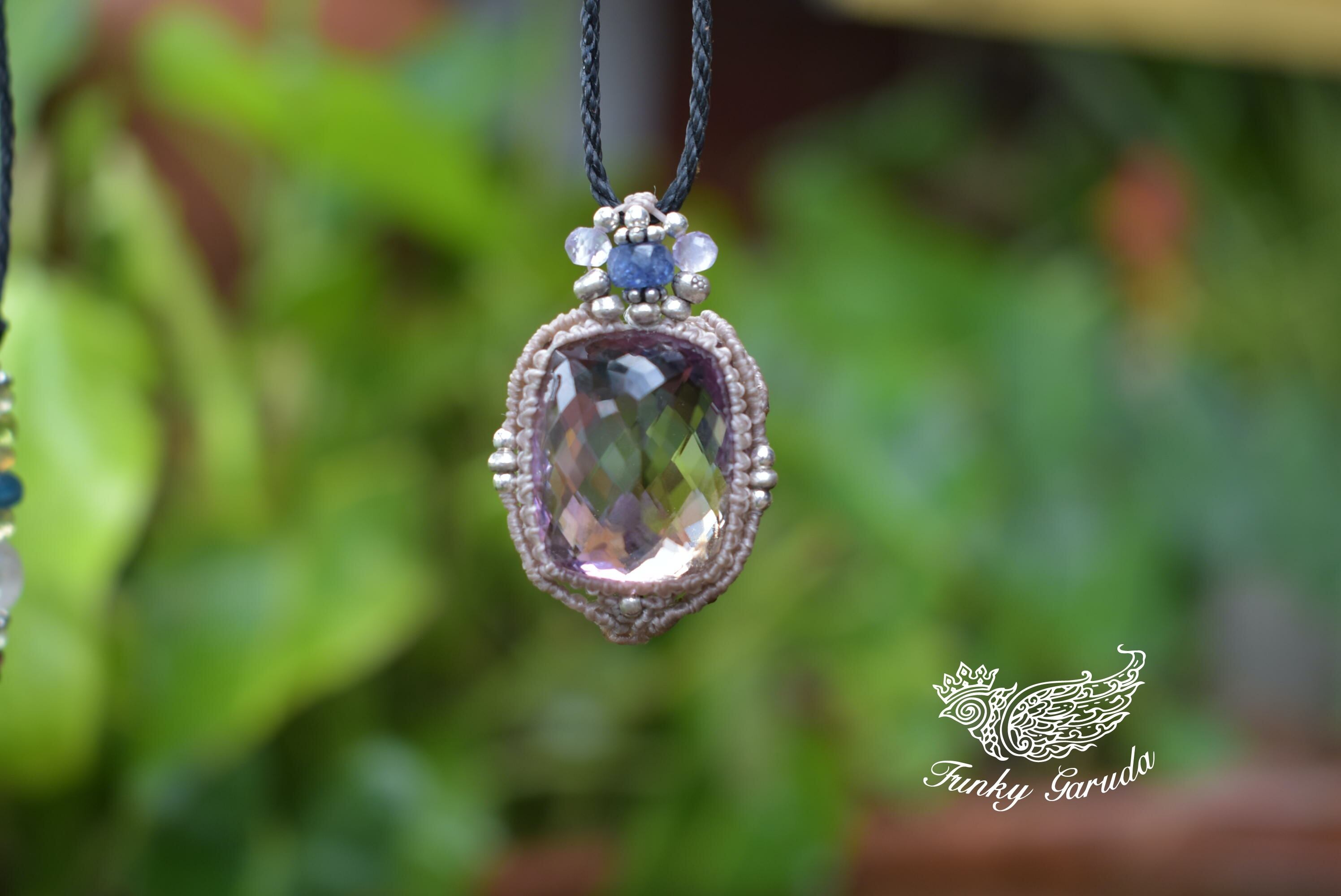 カットが施されたアイオライトとアメジストビーズをあしらい、より繊細なマクラメペンダントに仕上げました。