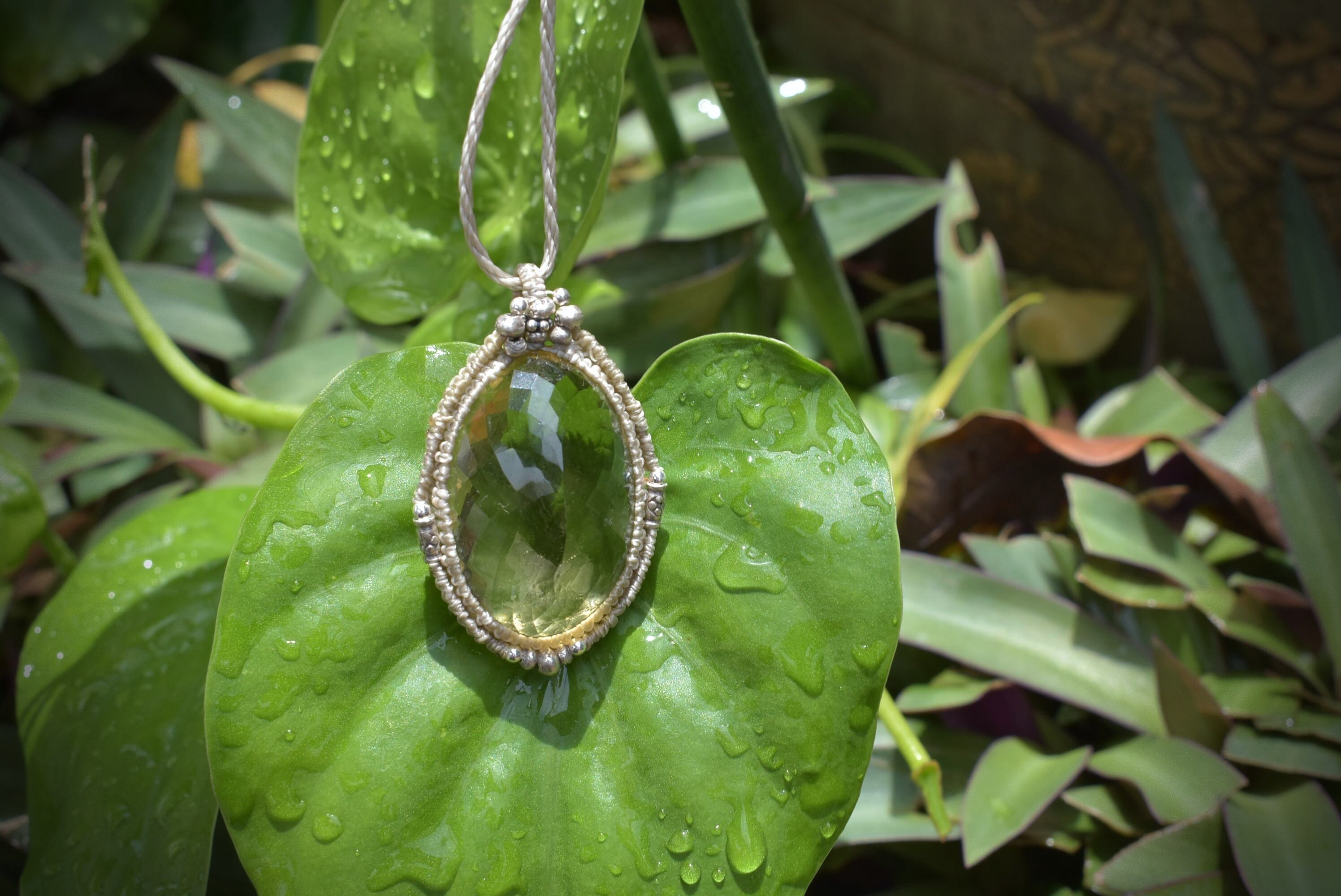 洗練されたファセットカットとこの石の持つ透明感はほんとうに宝石色です。細い糸を使用して細やかに仕上げました。装飾したカレンシルバー92.5ビーズパーツもポイントのひとつです。