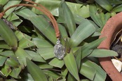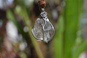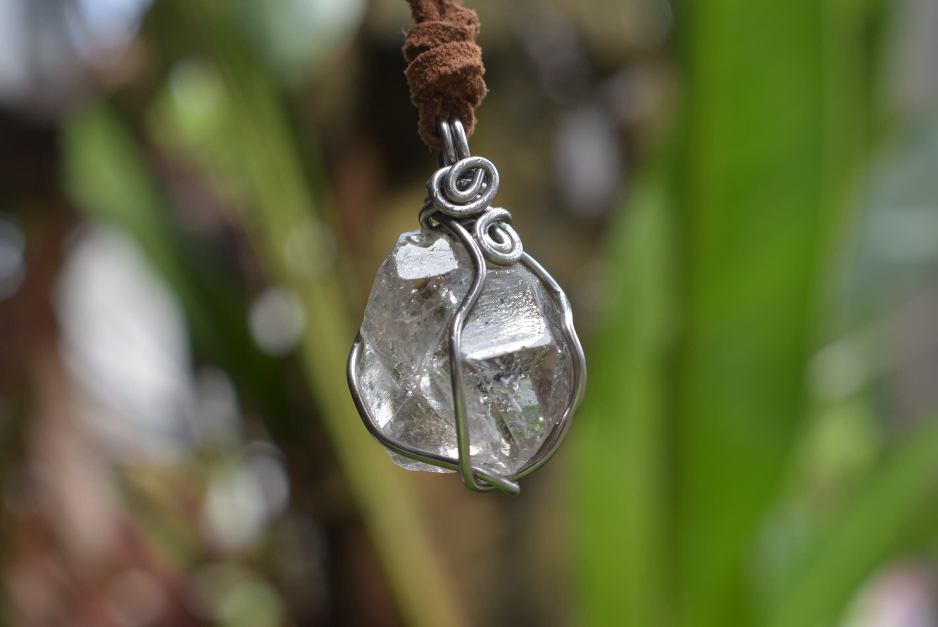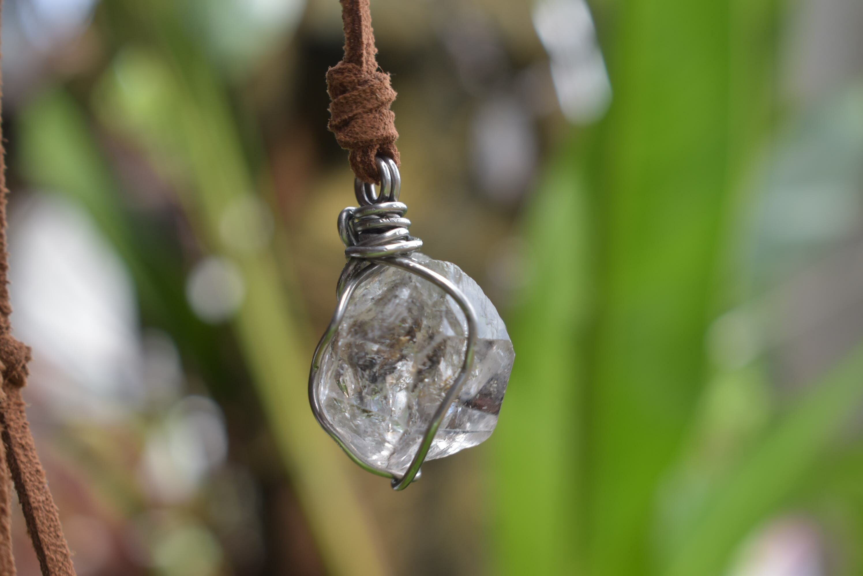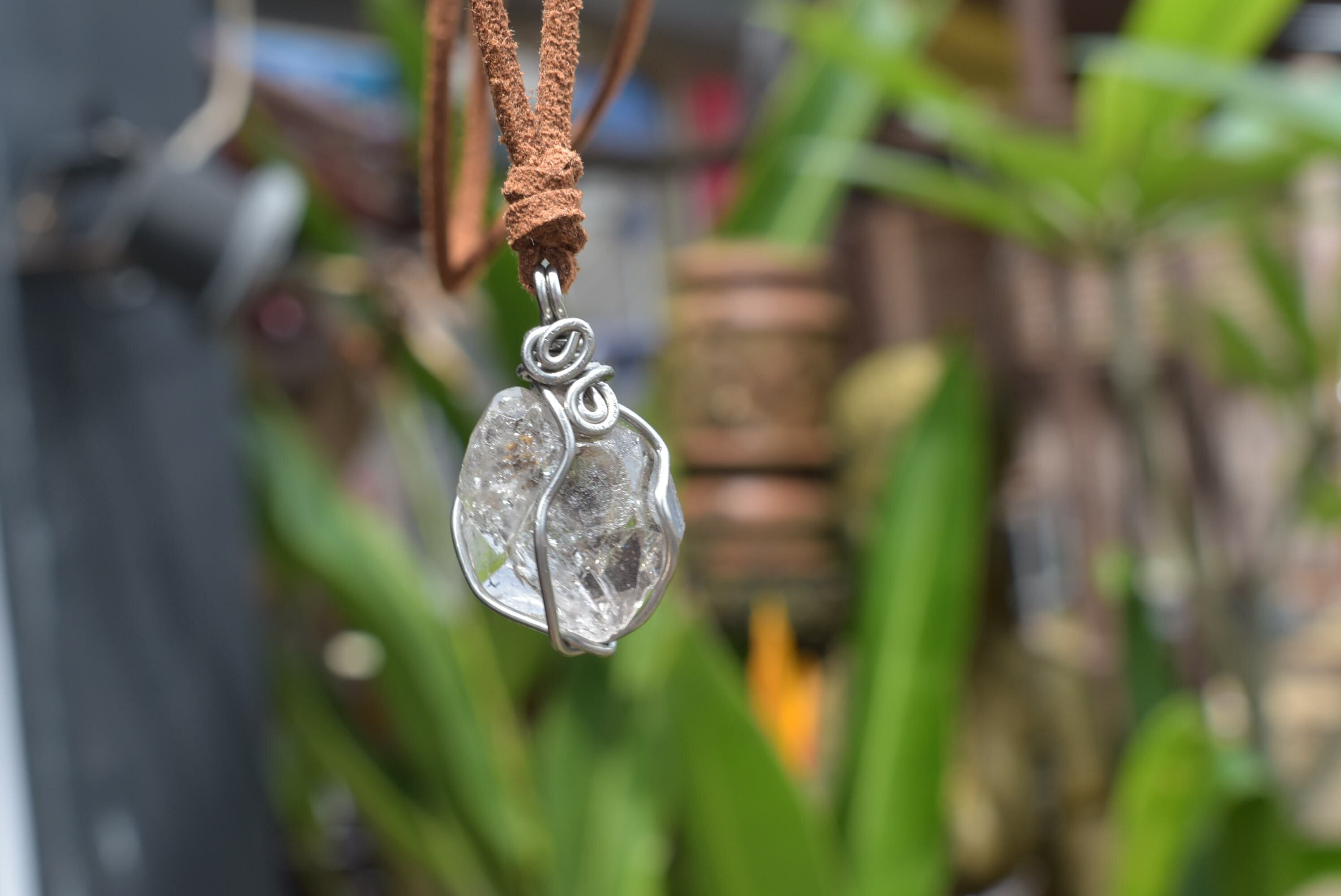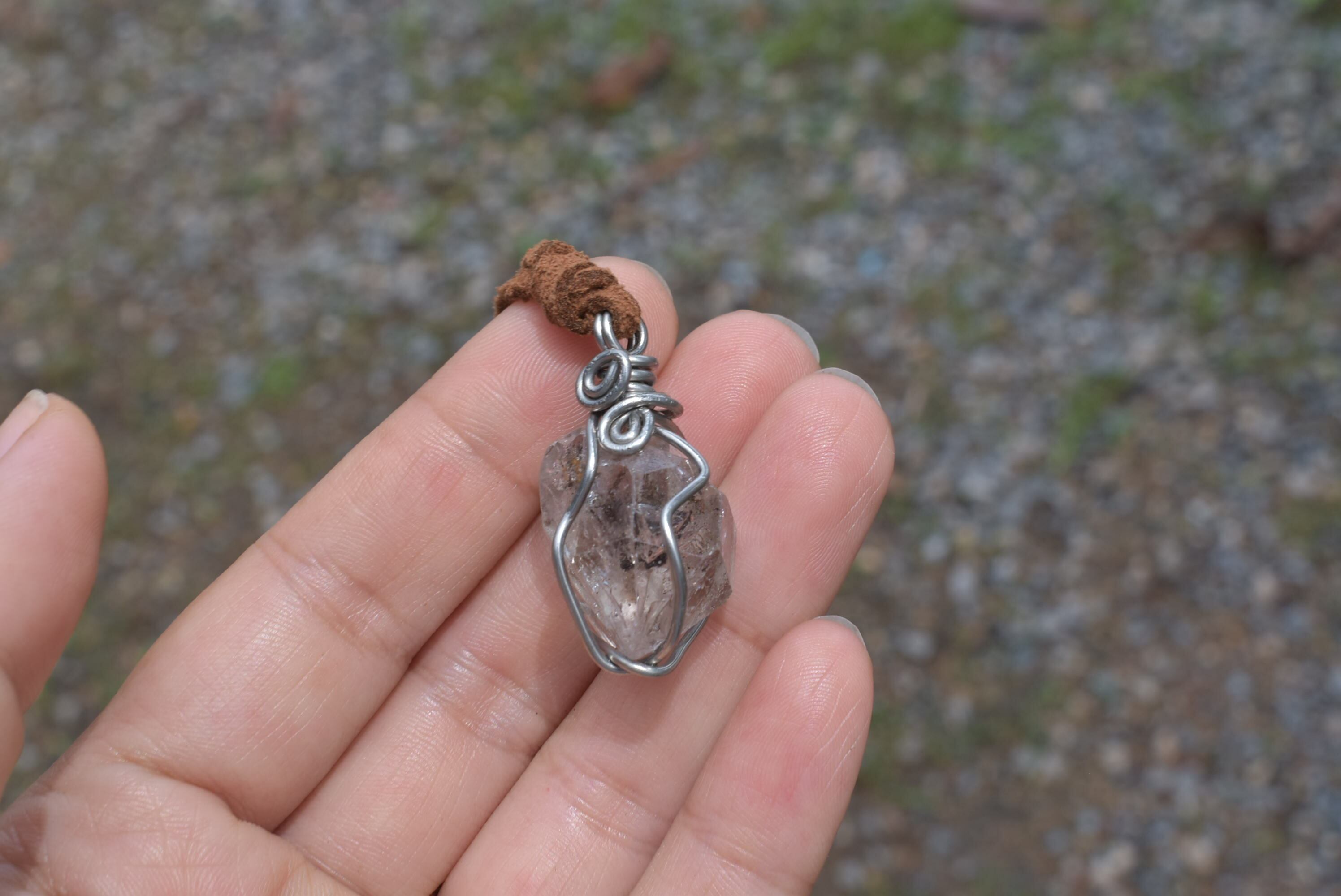ハーキマー水晶のカットに沿って太めのワイヤーを巻き込んだペンダント。しっかりと水晶を捉えています。キラキラと美しいシラーと気泡を見ることができます。