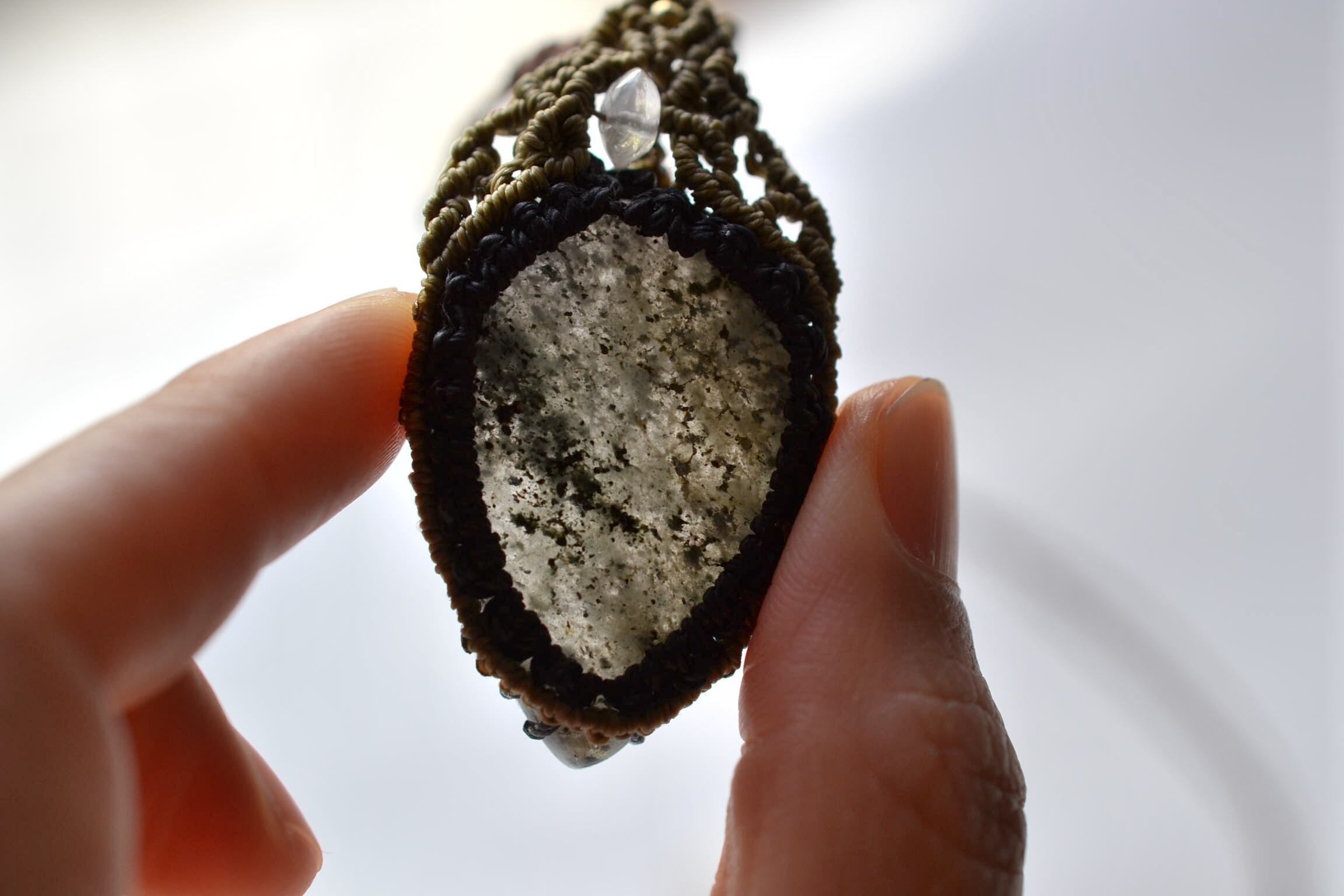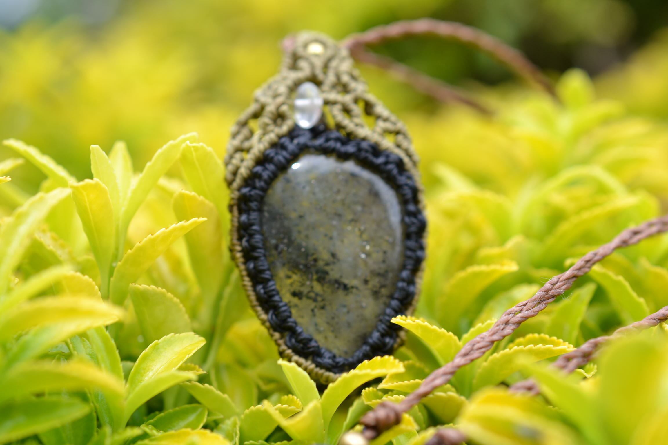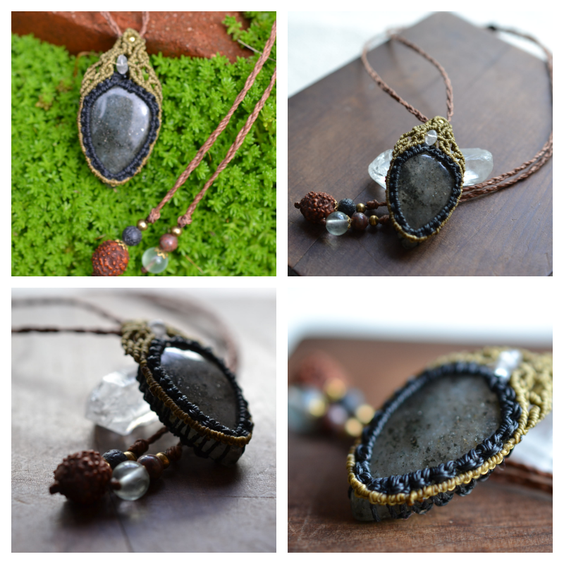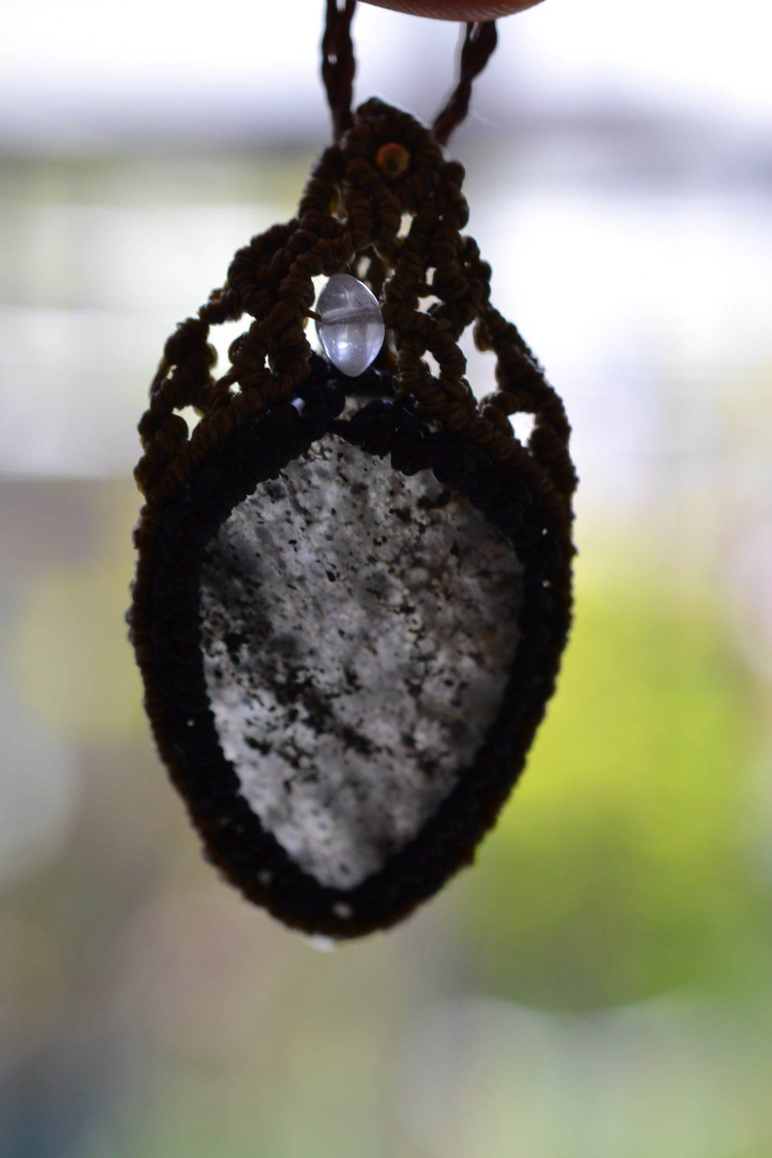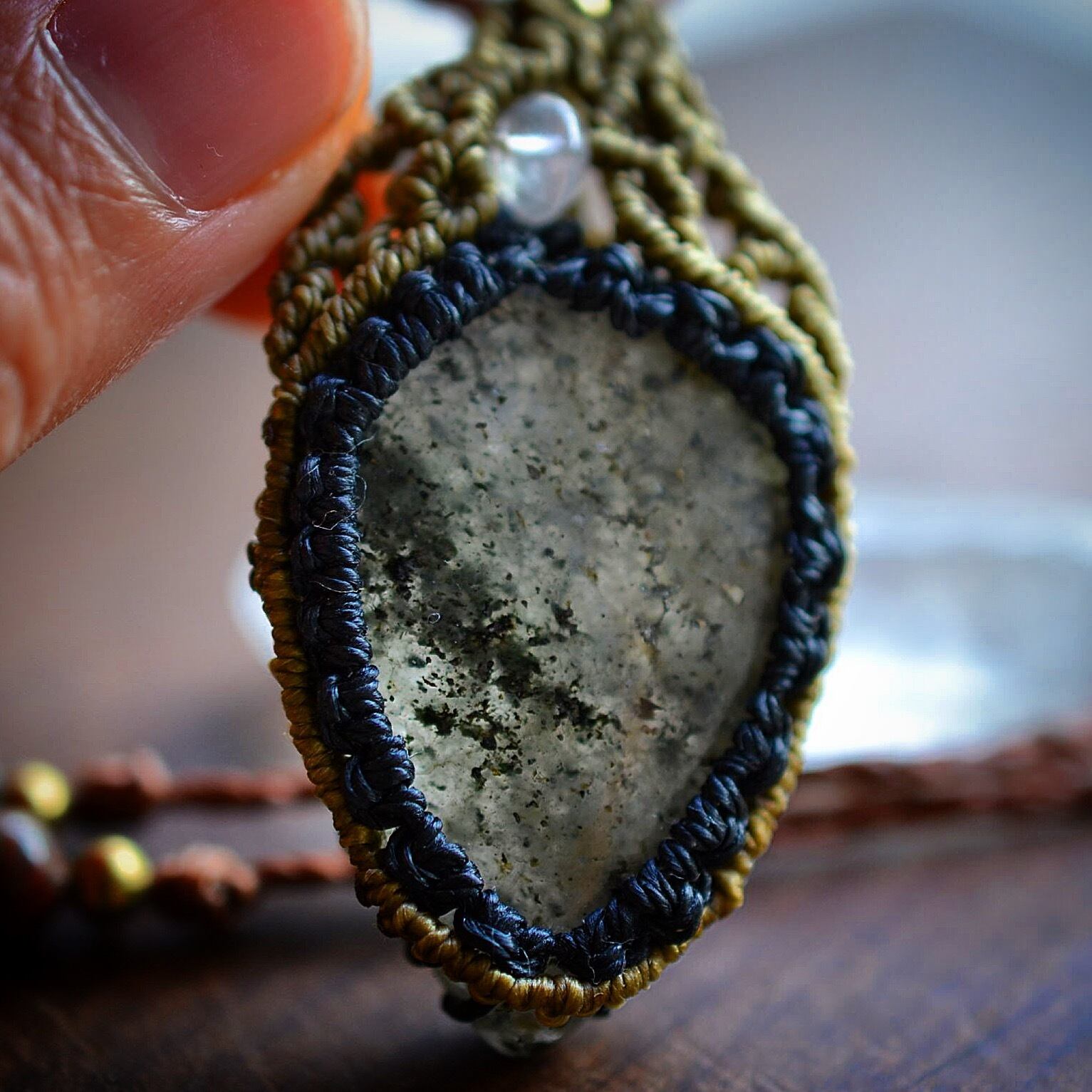 水晶の中には一体何が入っているのか..と謎めいたトルマリンインクオーツをペンダントにマクラメ編み装飾を施しました。