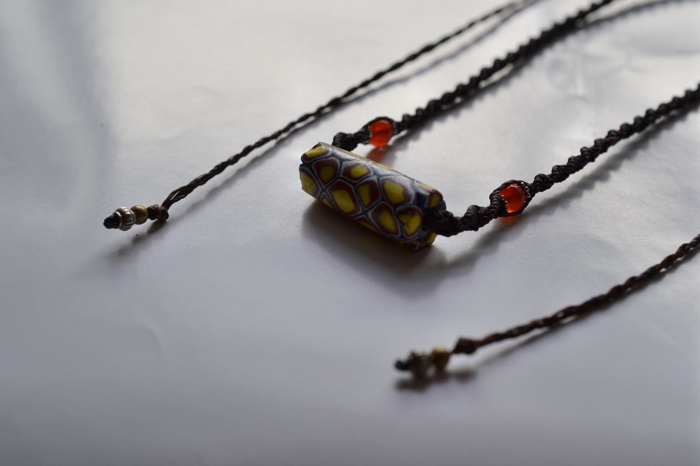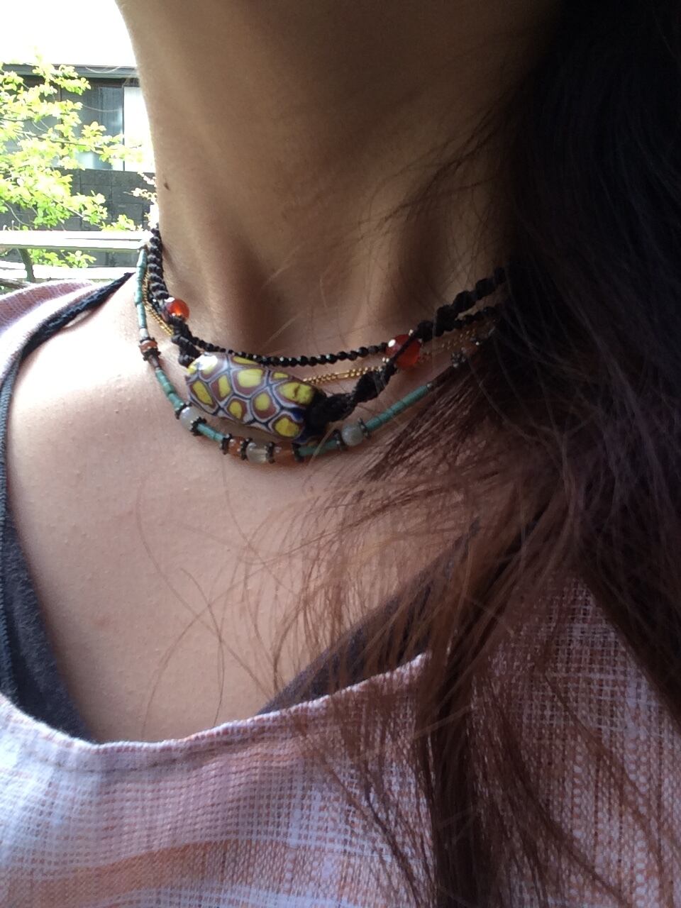 モロッコの貴重で彩り鮮やかなアンティークビーズをアクセサリーに編みました。1〜2万年前につくられたといわれるビーズです。色味はなかなか出せるものではなく、あらゆるファッションにもよく似合う、年齢問わずお使いいただけるビーズアクセサリーです。