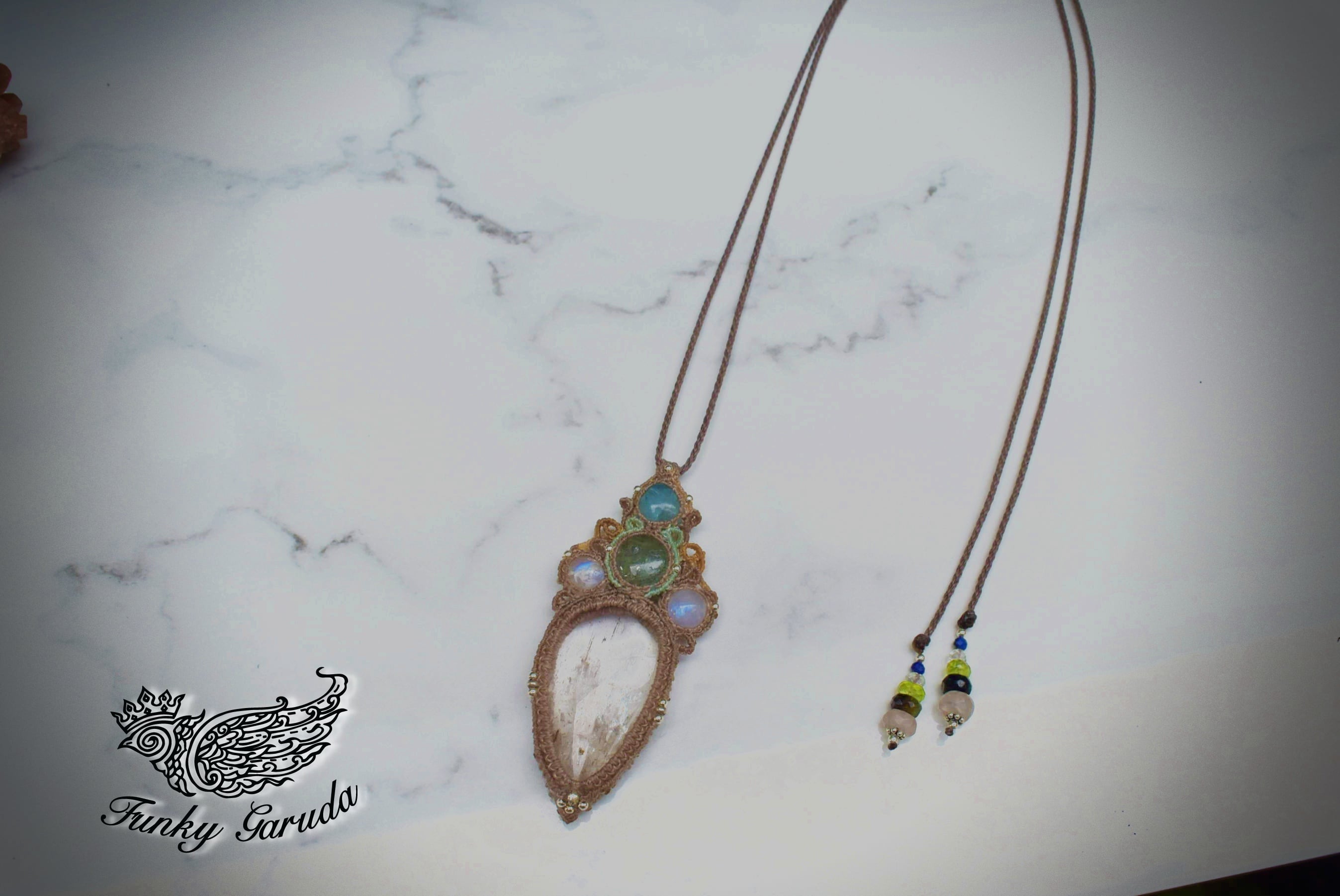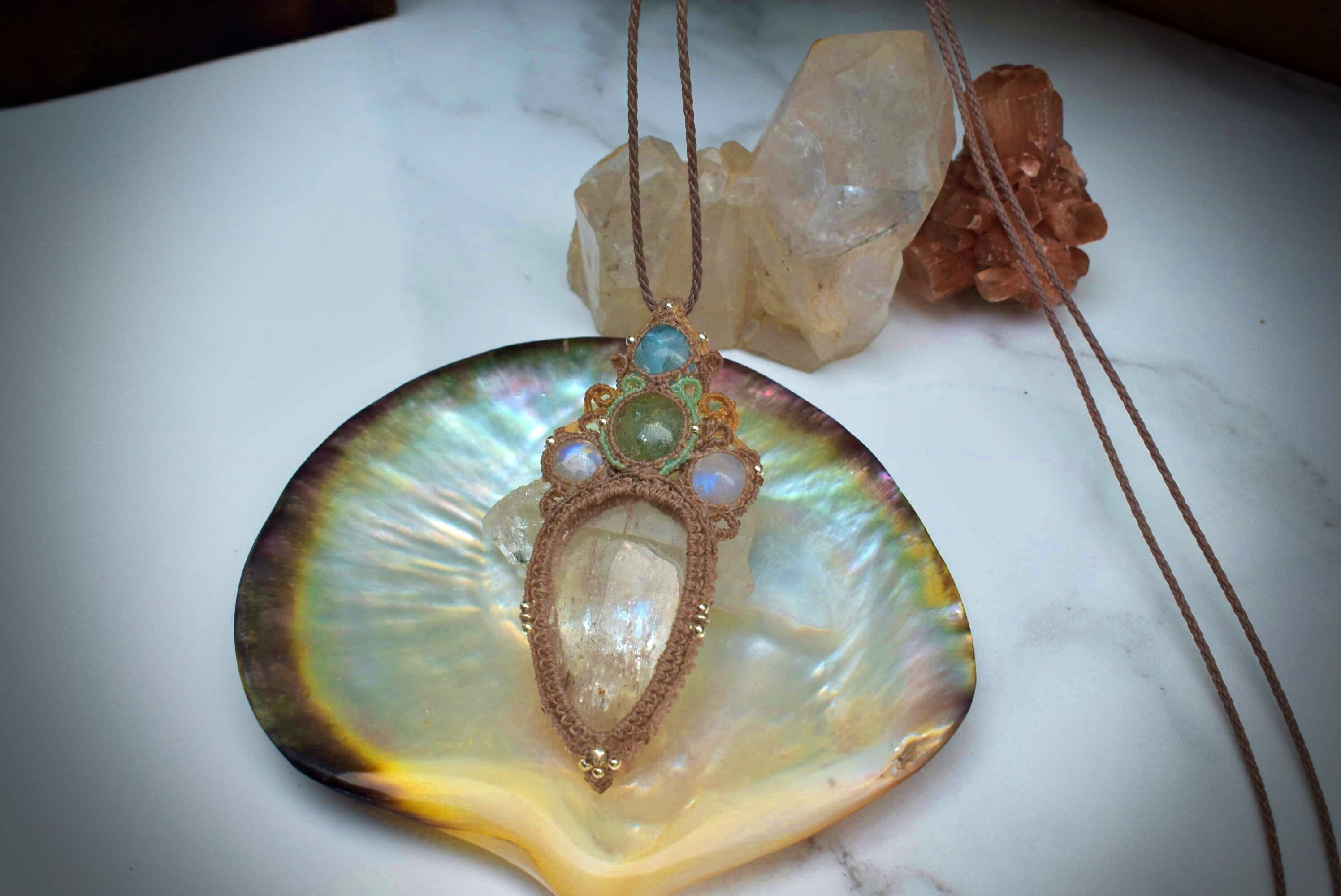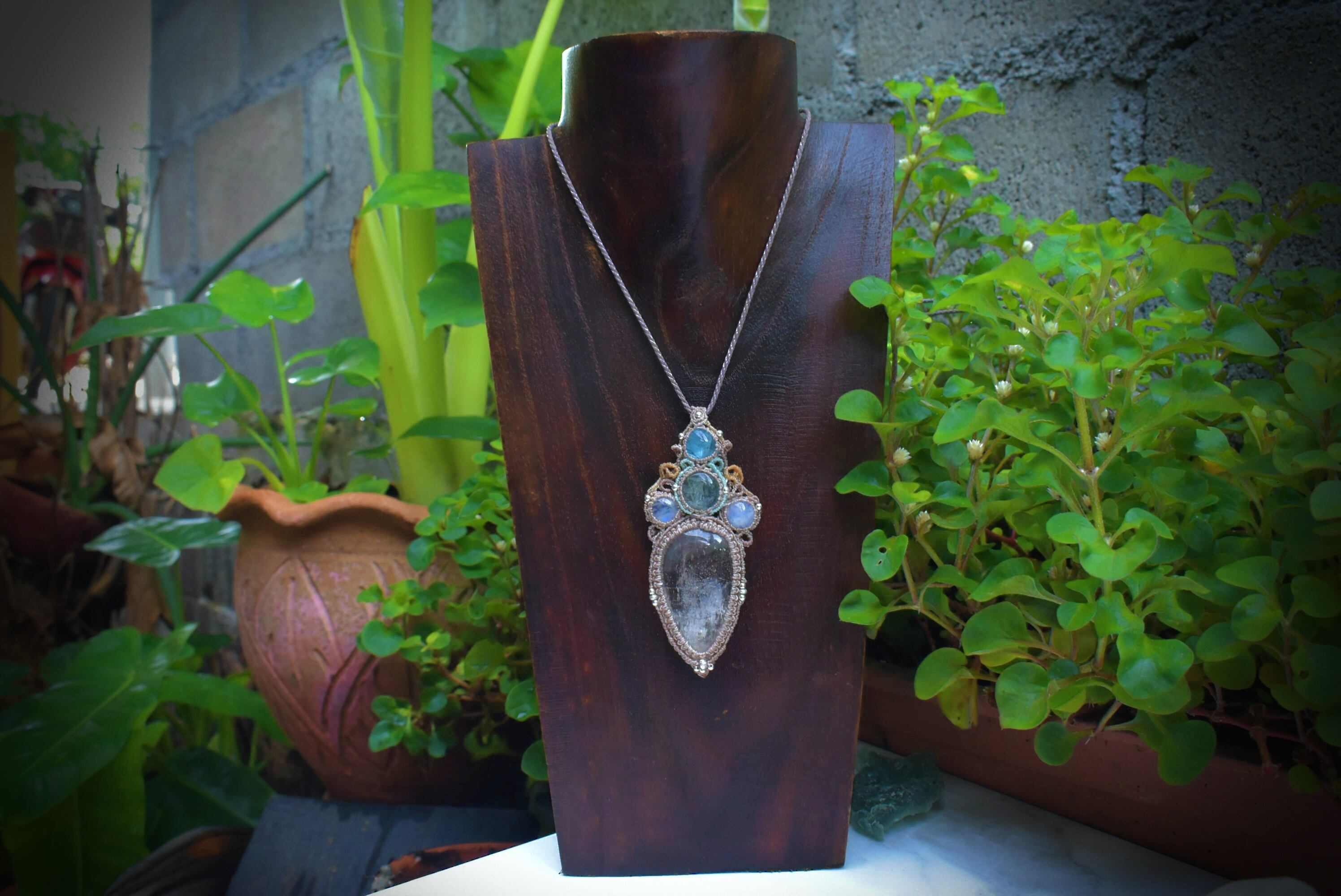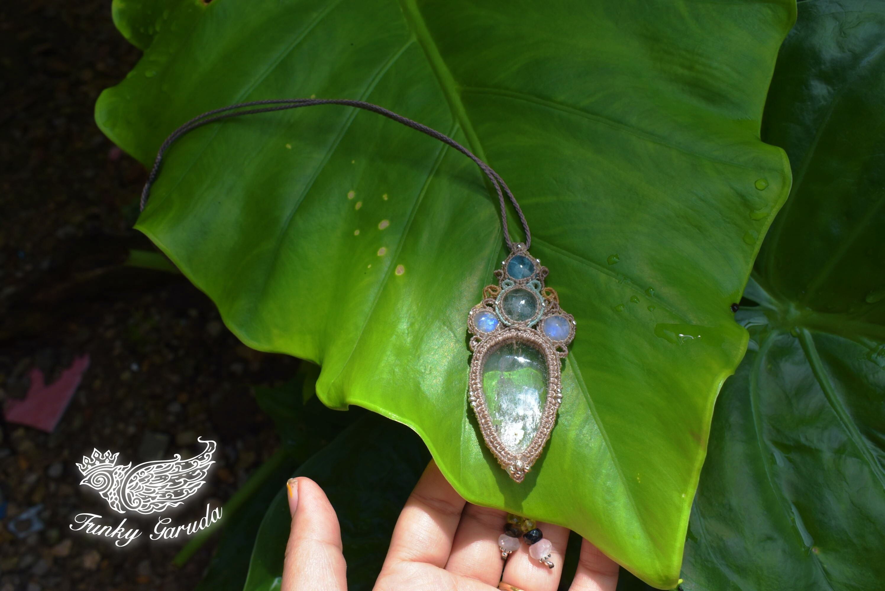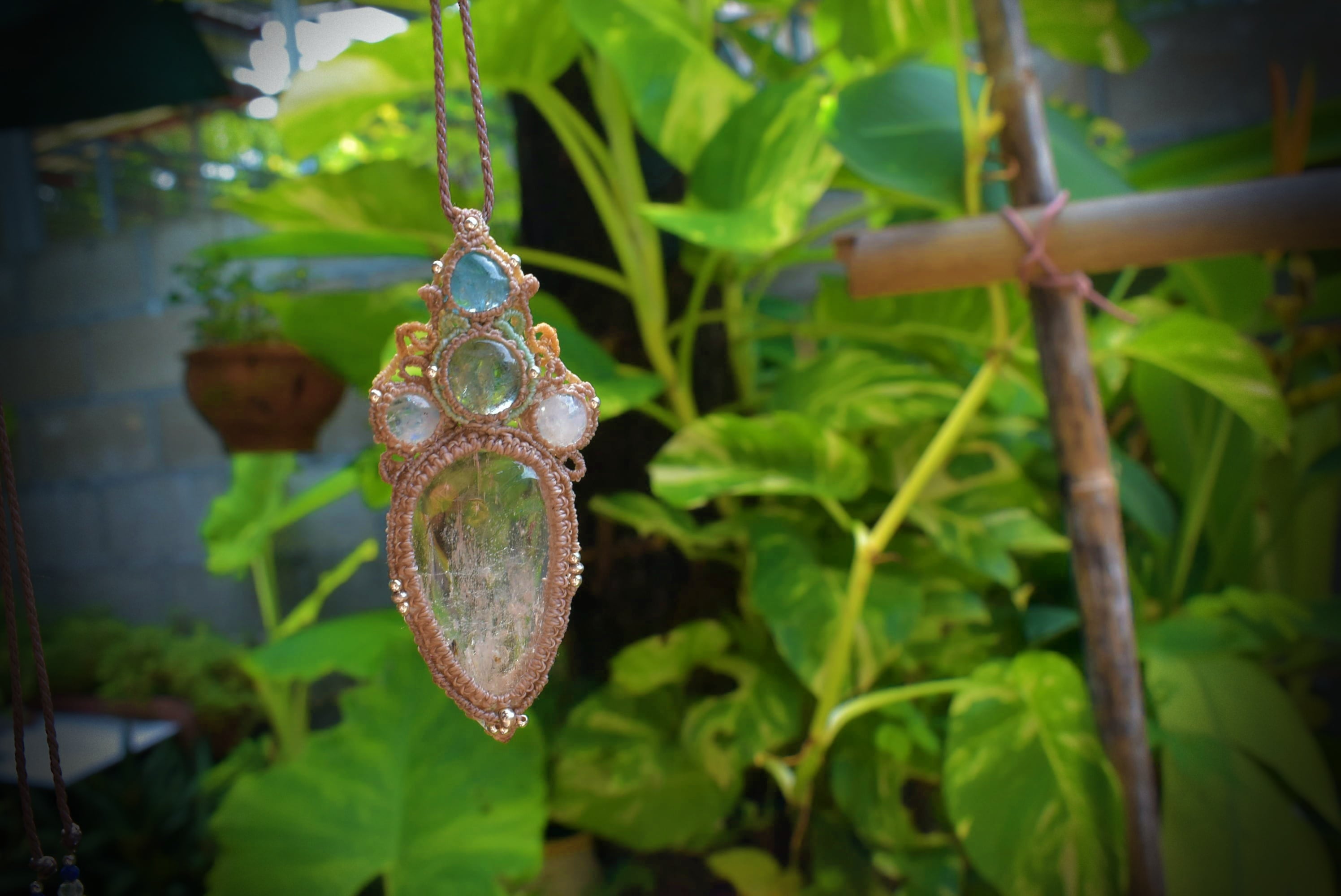 淡い思い出を思い出す時に見える優しい色合いをイメージして組み合わせた天然石とマクラメ編み装飾。自然に溶けてなくなる泡のような無機質な形をマクラメ編み装飾にて表現しました。使用している天然石たちは輝気の強いものばかり。