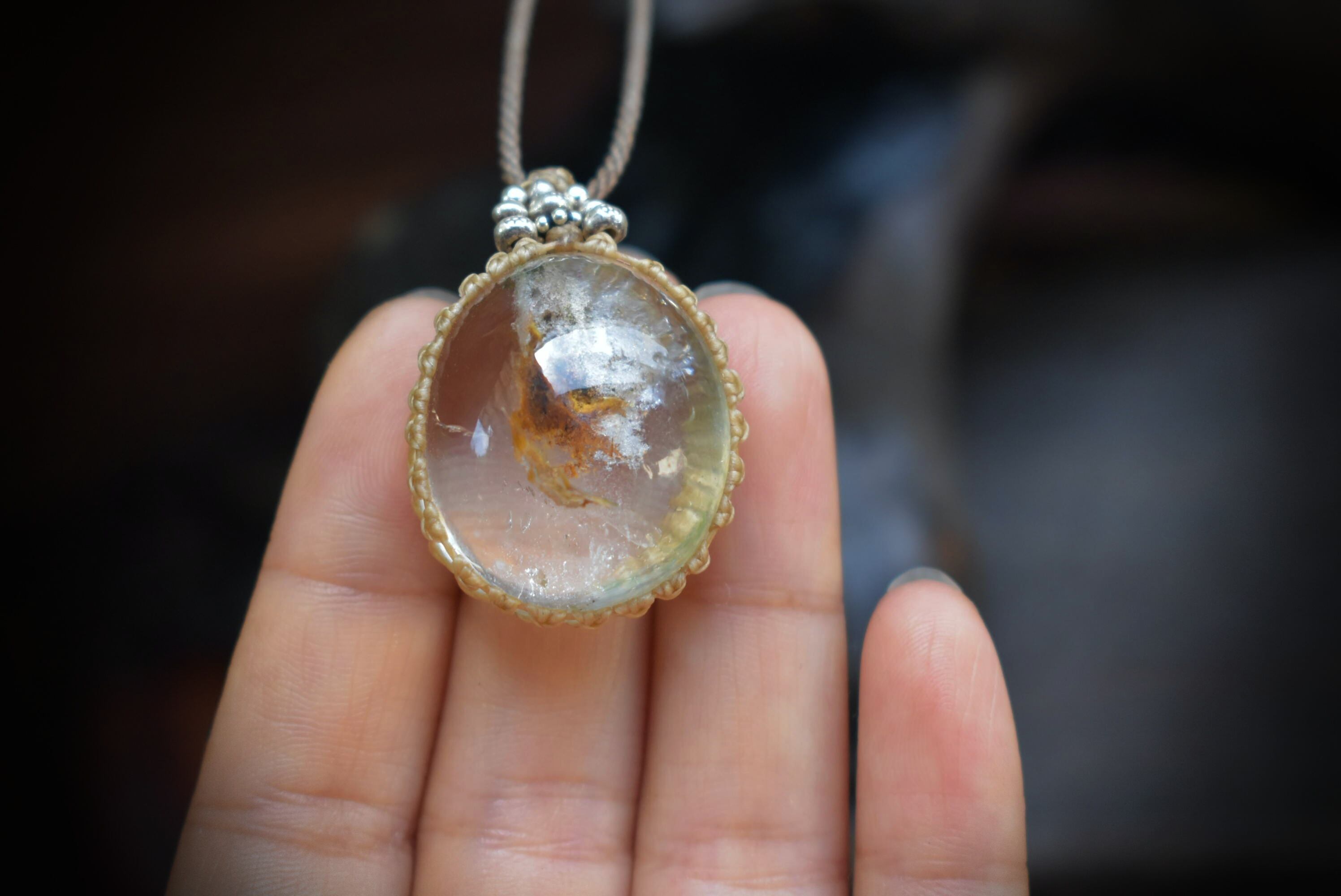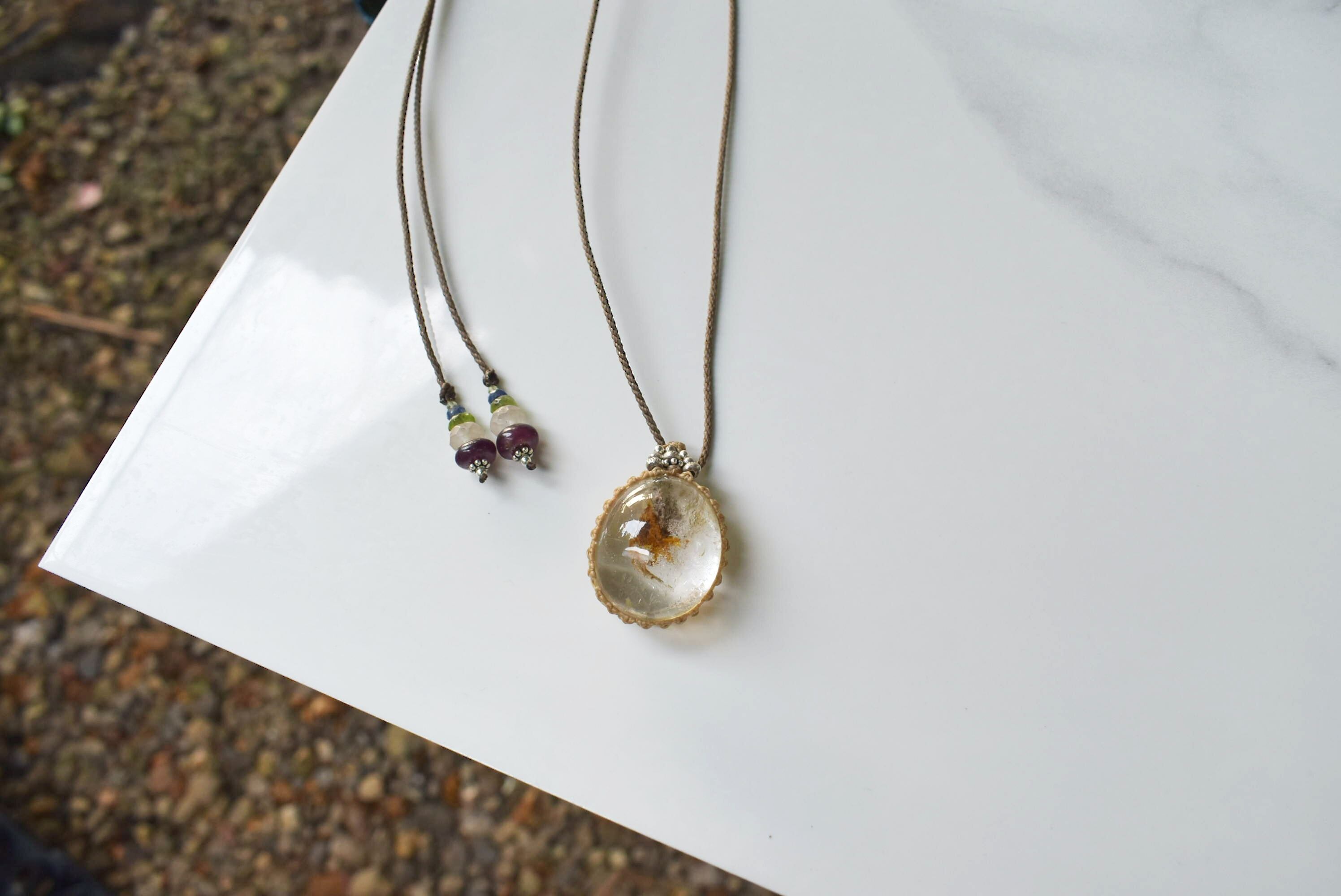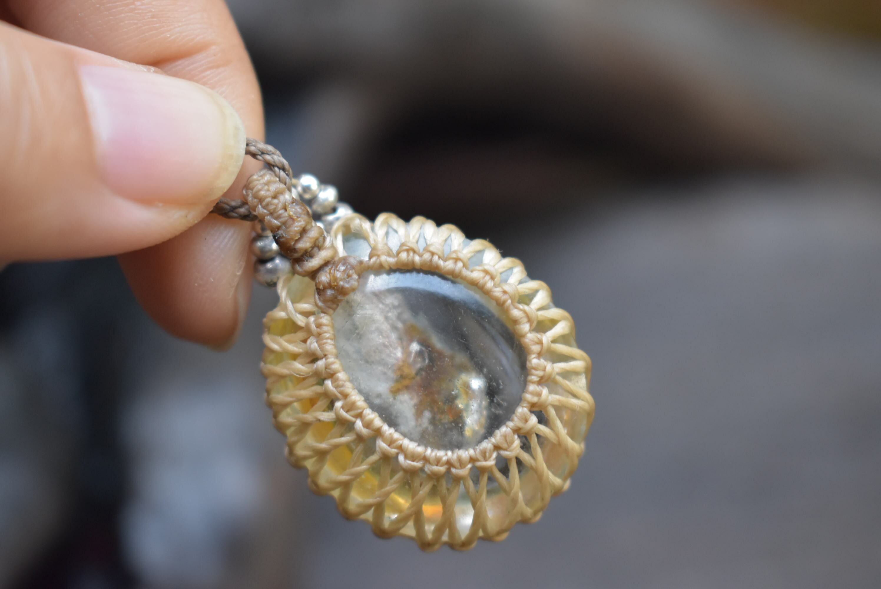 ピンク色のシラーとリモナイトと呼ばれるイエローカラーの内包物が混ざり合う天然色の美しいガーデン水晶をシンプルにマクラメ編みペンダントに仕上げました。