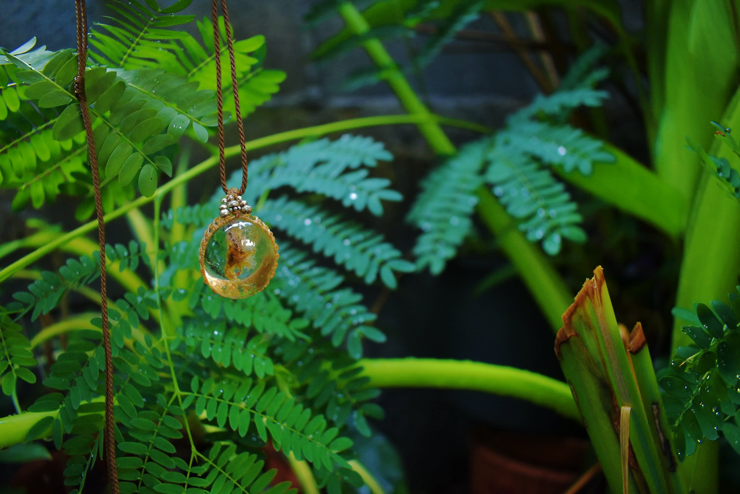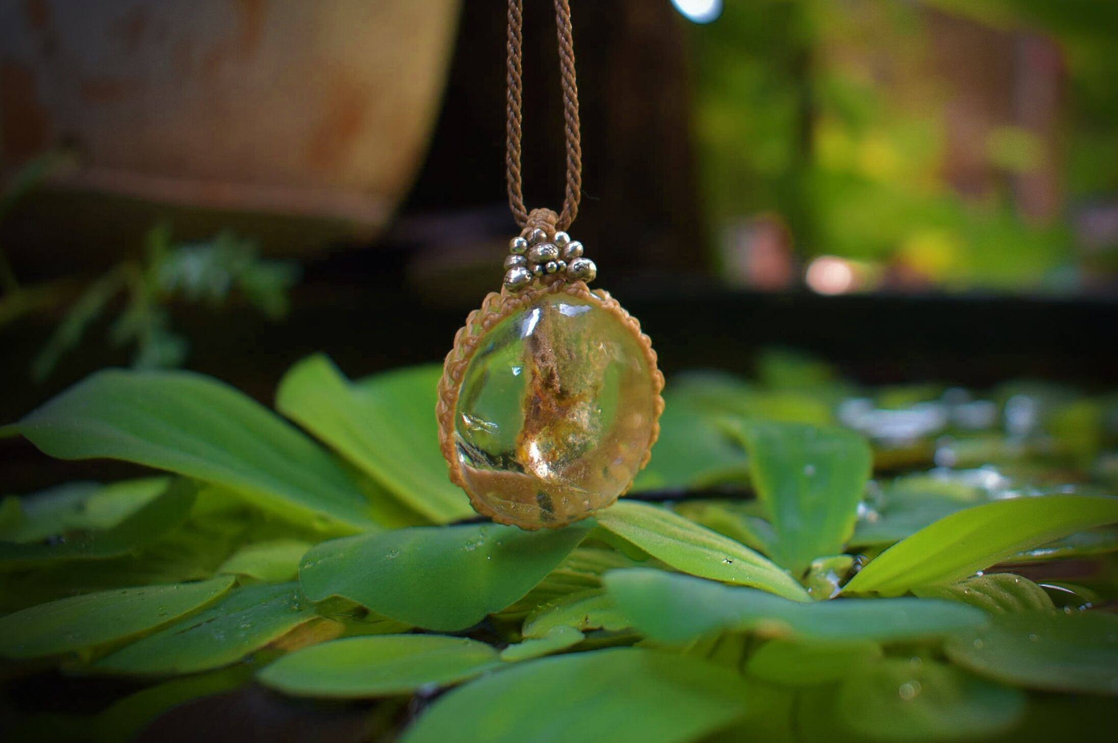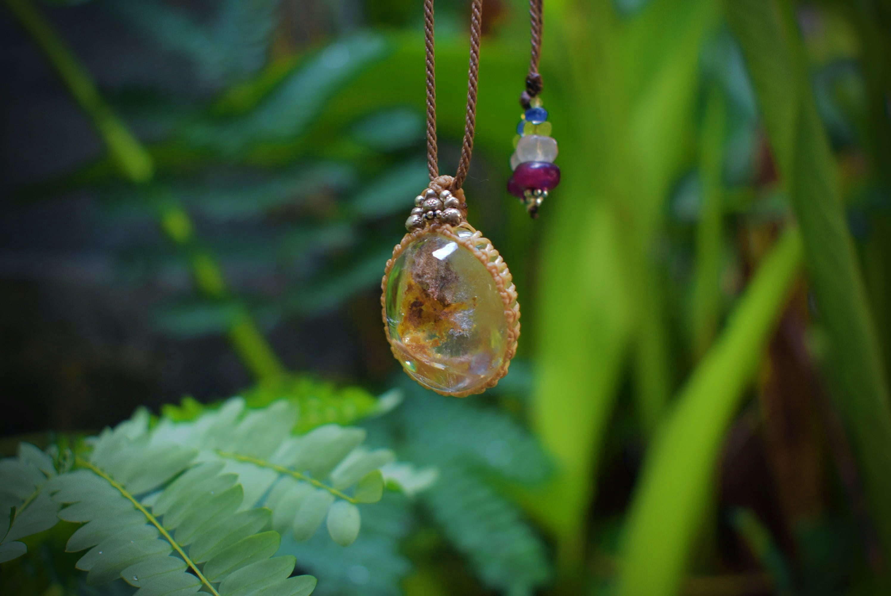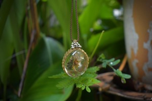 ピンク色のシラーとリモナイトと呼ばれるイエローカラーの内包物が混ざり合う天然色の美しいガーデン水晶をシンプルにマクラメ編みペンダントに仕上げました。