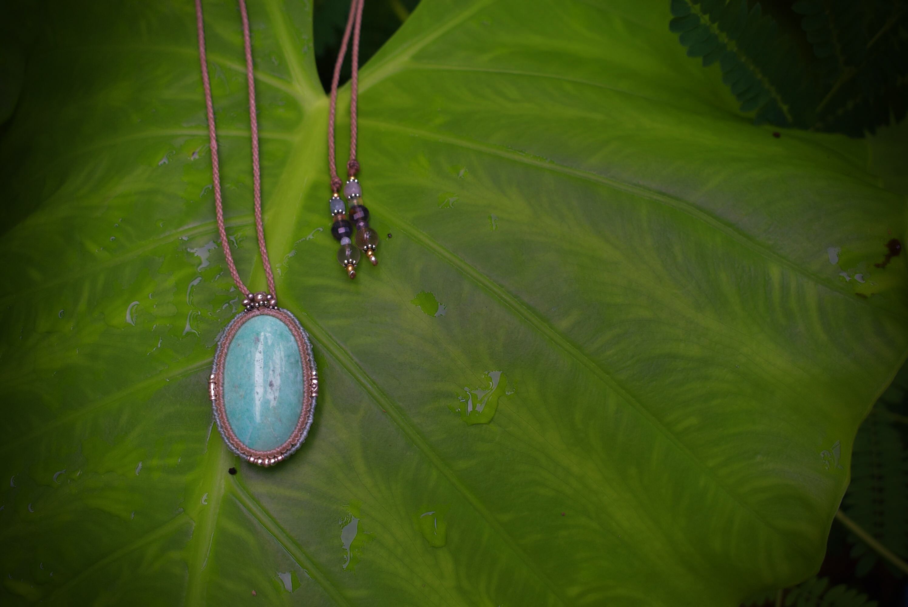 ◆このたびはヘンプ、差し色としてミント色の蝋引き糸を使用しマクラメ編み装飾を施しました。