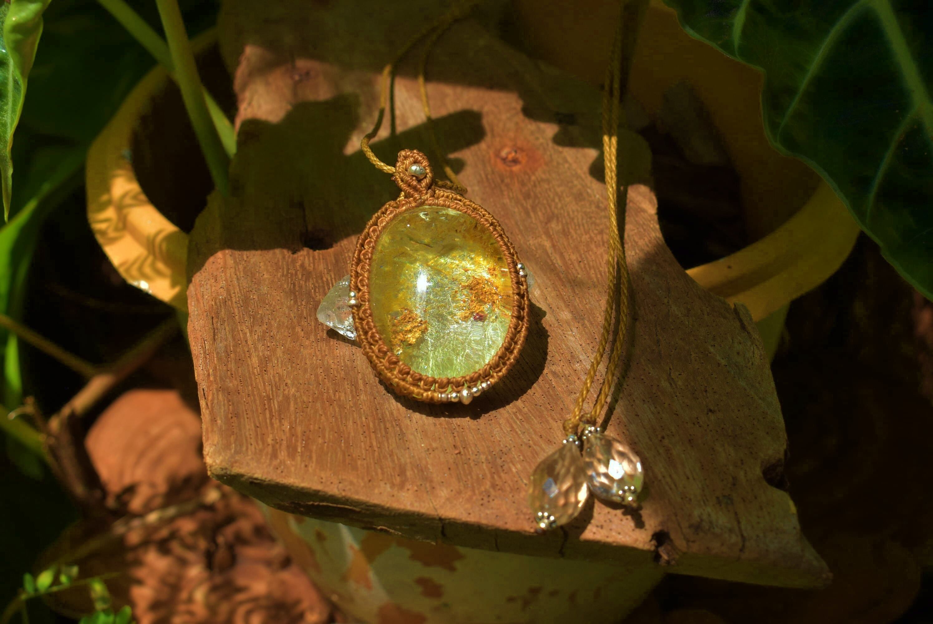 ◆このたびはゴールドブラウン色の蝋引き糸を使用しマクラメ編み装飾を施しました。