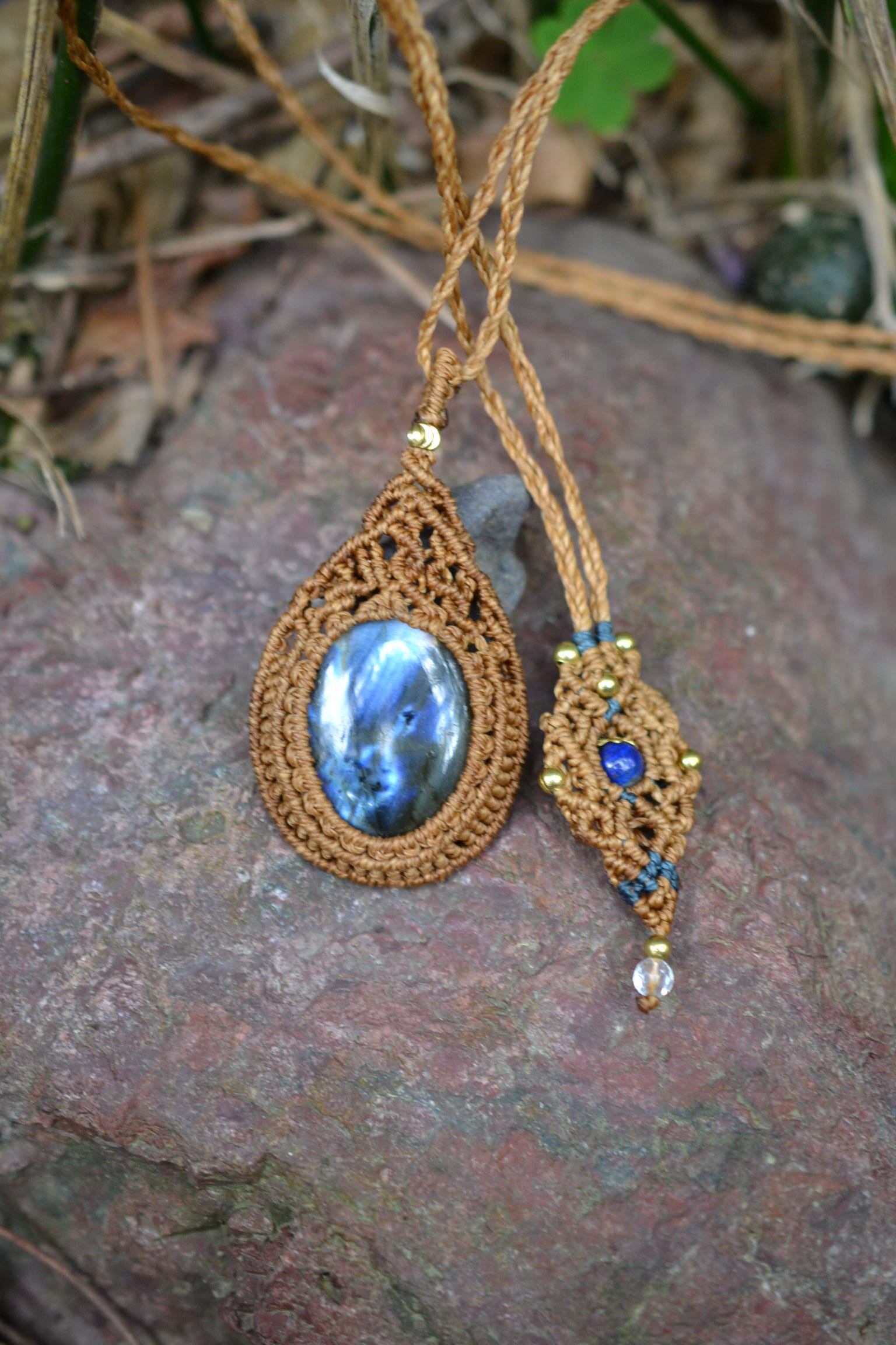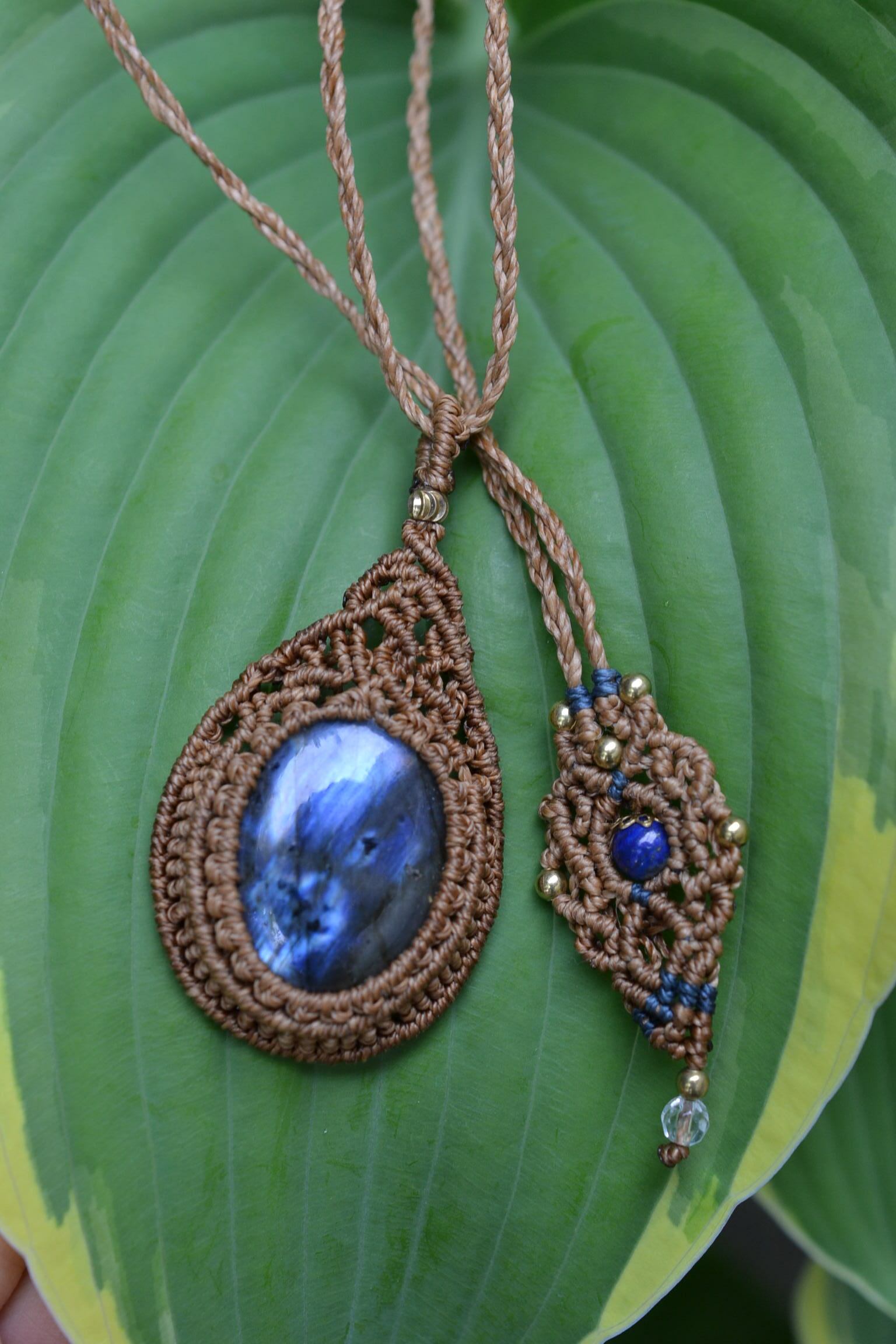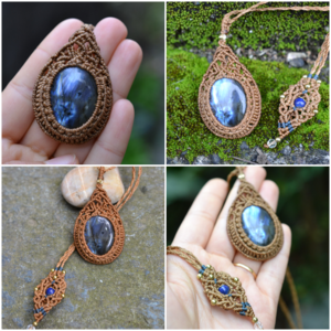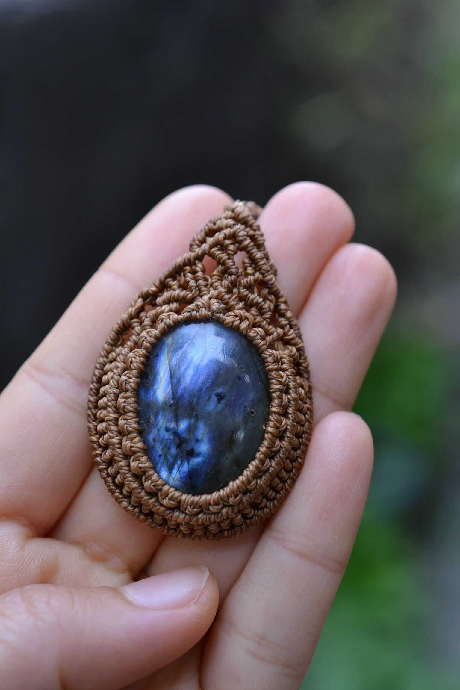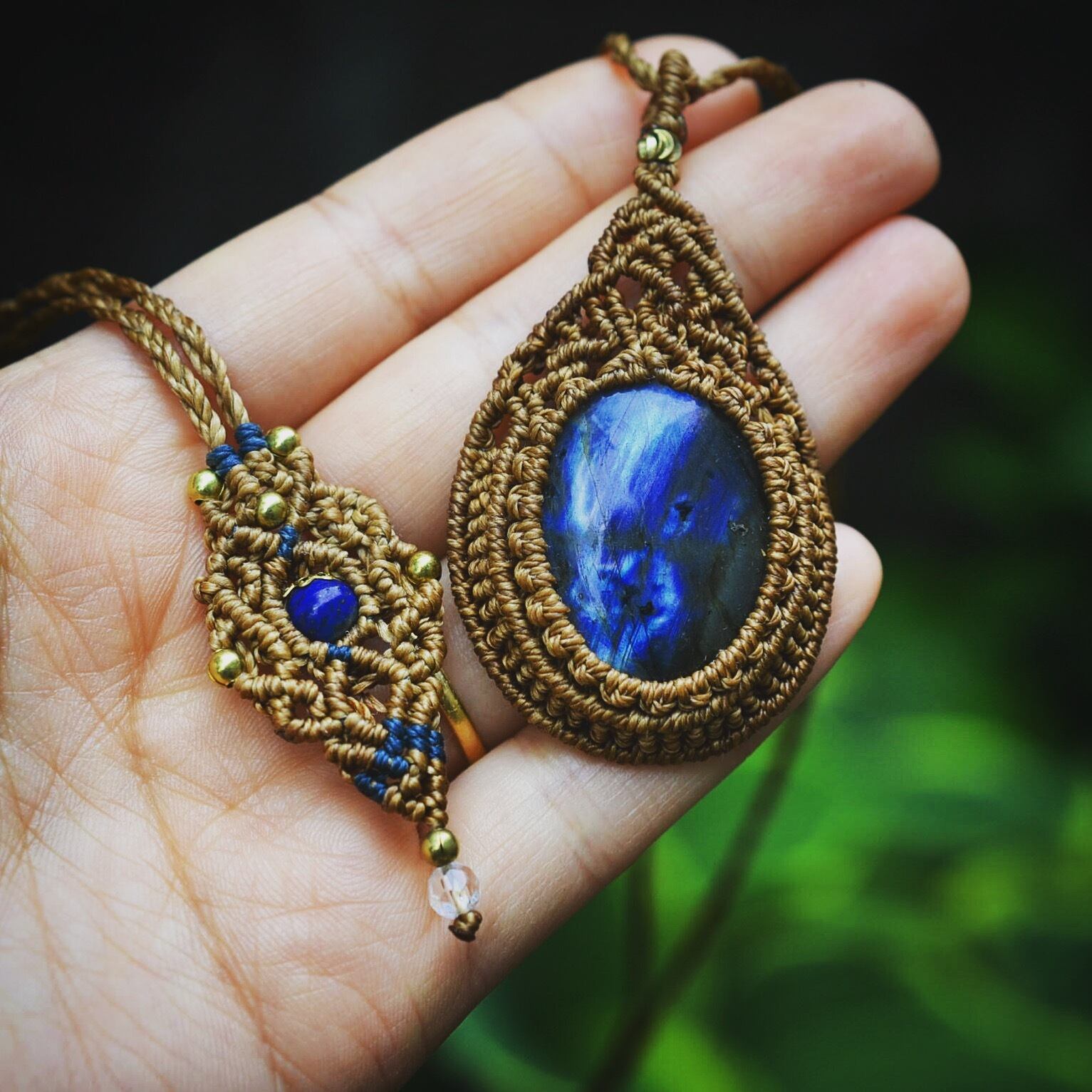 ブルーの輝きがレーザービームのごとく反射して見えるラブラドライトをきっちり細かくマクラメ編み装飾を施しました。