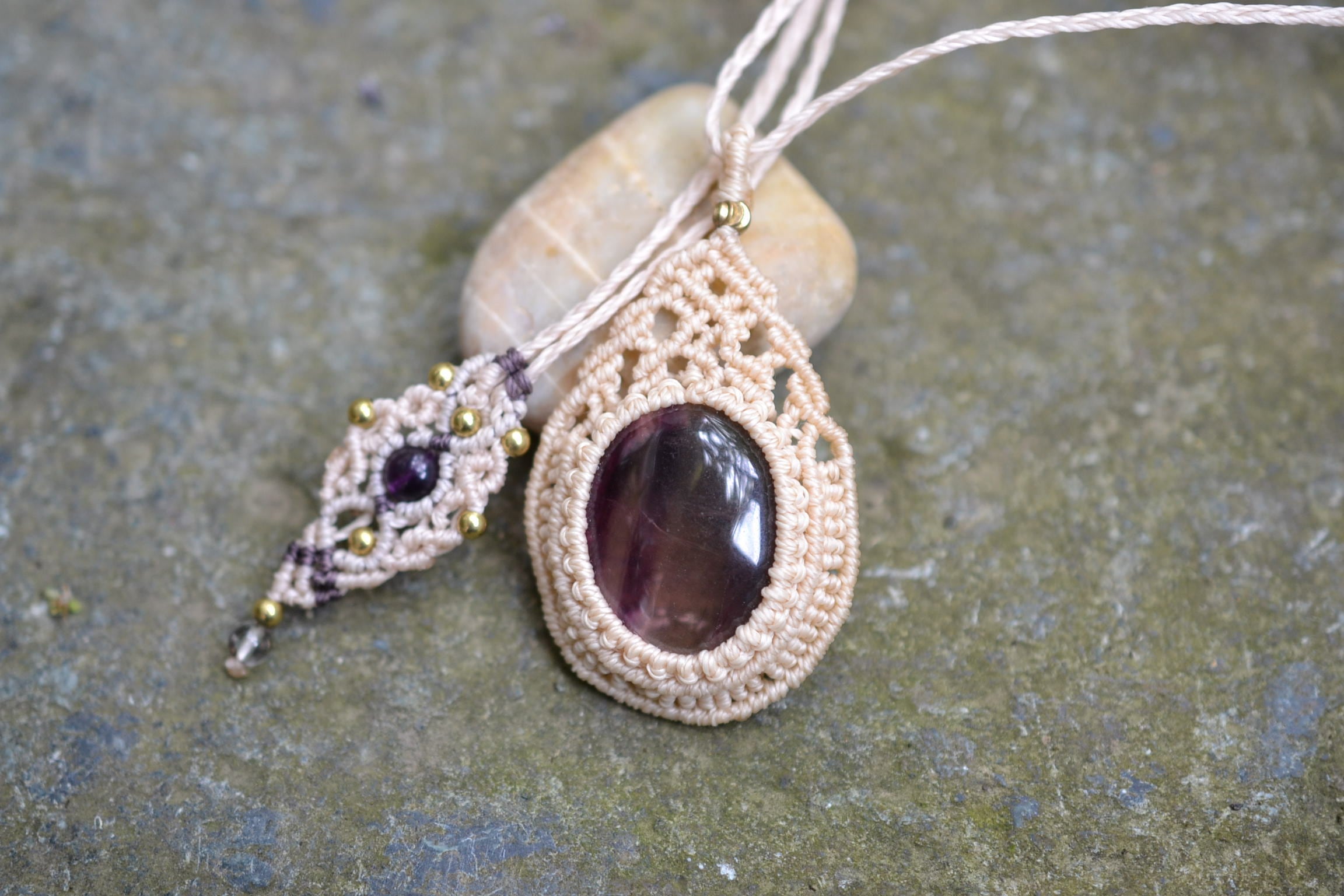 ぷるんとしたクリアな表面にパープルのラインが波打つようにそっと入り込んでいるこちらのフローライトの世界はまるで3Dのデザインであり、世界が広がっています。生成りカラーの蝋引き糸を使用して清潔にフレッシュに感じるペンダントに仕上がりました。