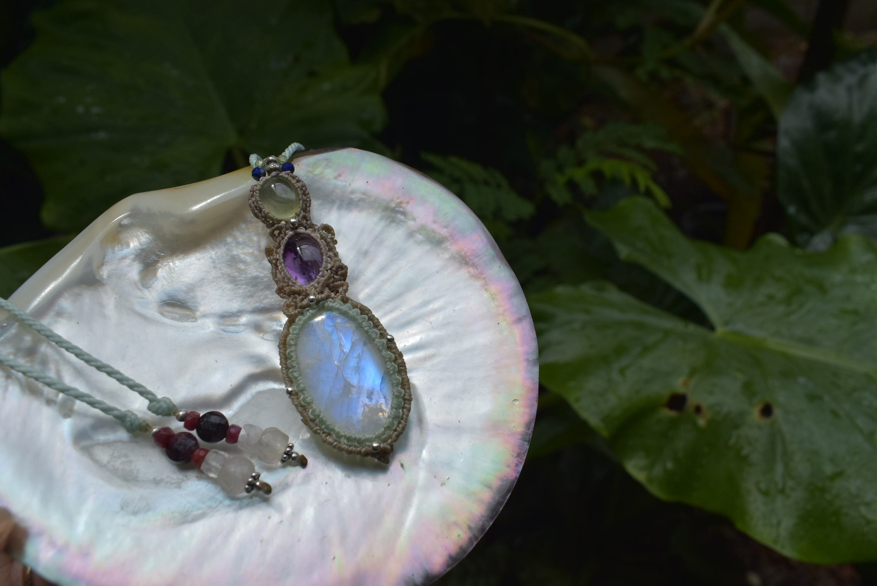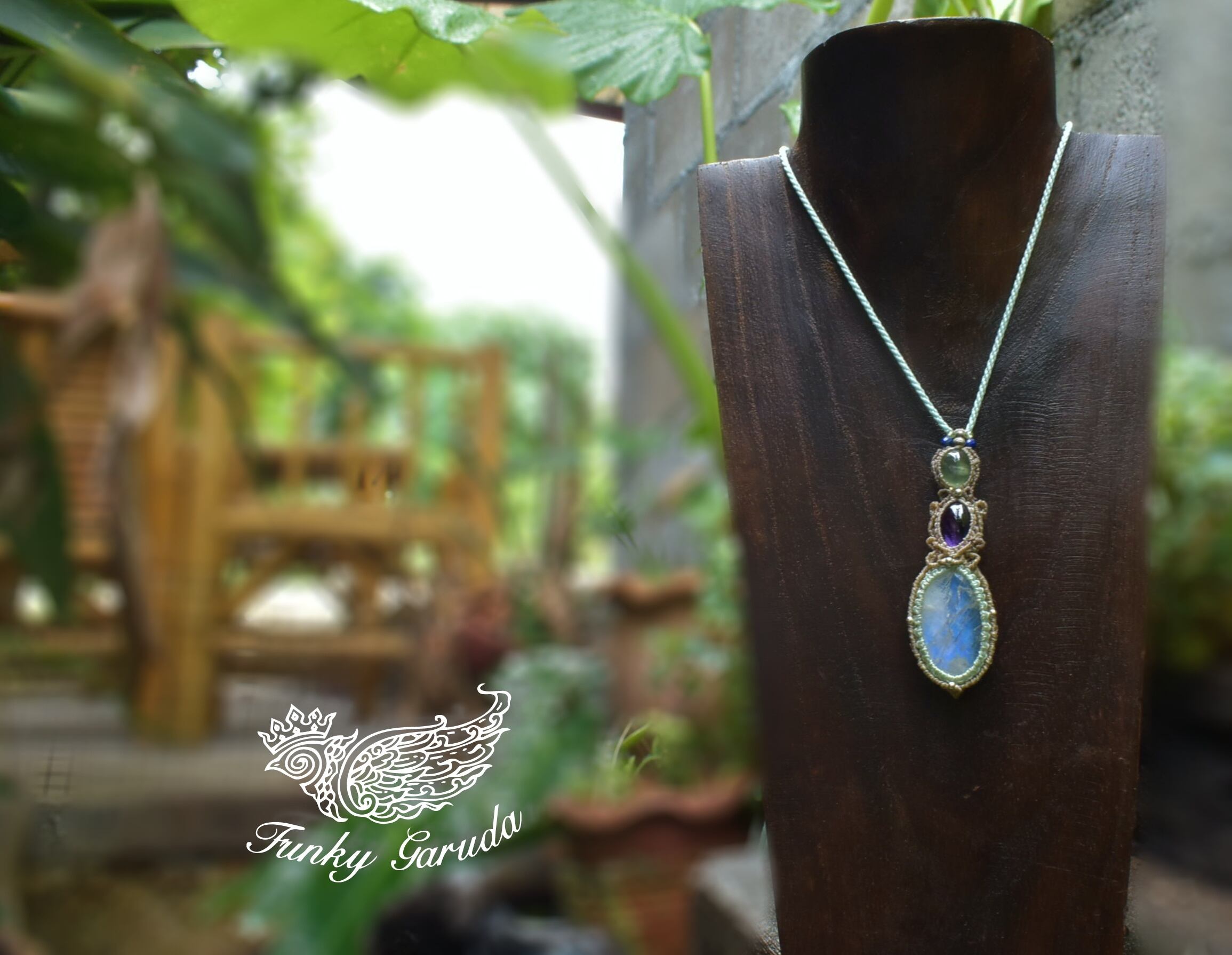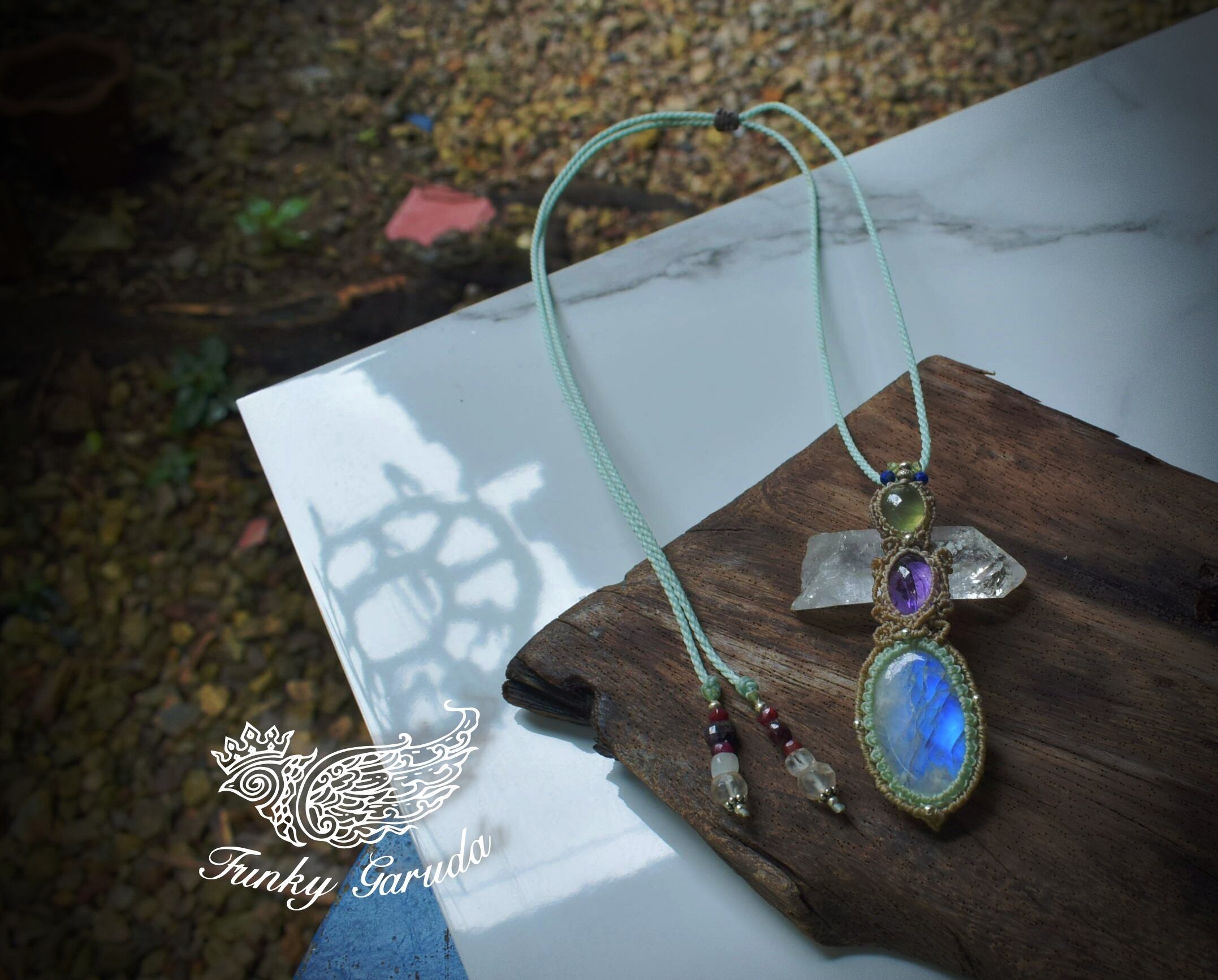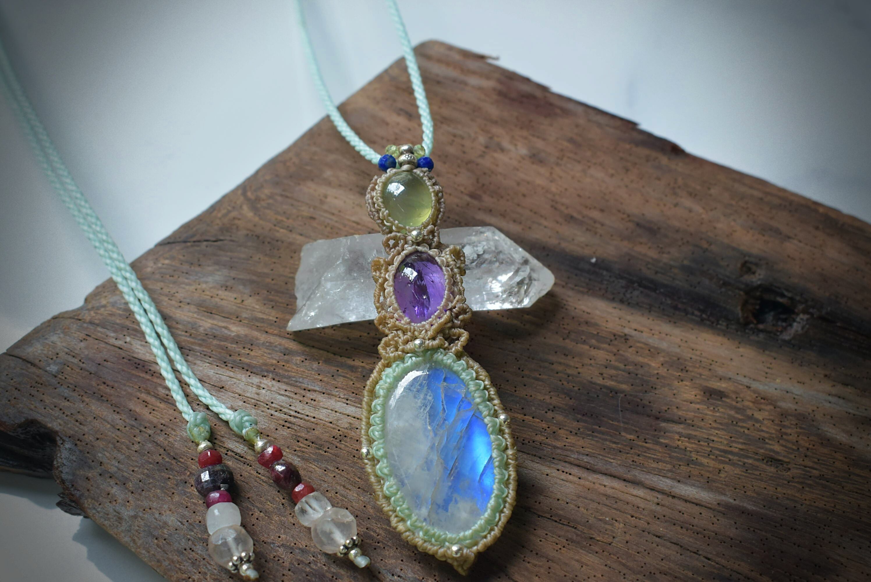 鍵の宝石★透明高品質★ホワイトラブラドライト+アメトリン+プレナイト マクラメペンダントmoon020