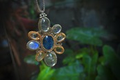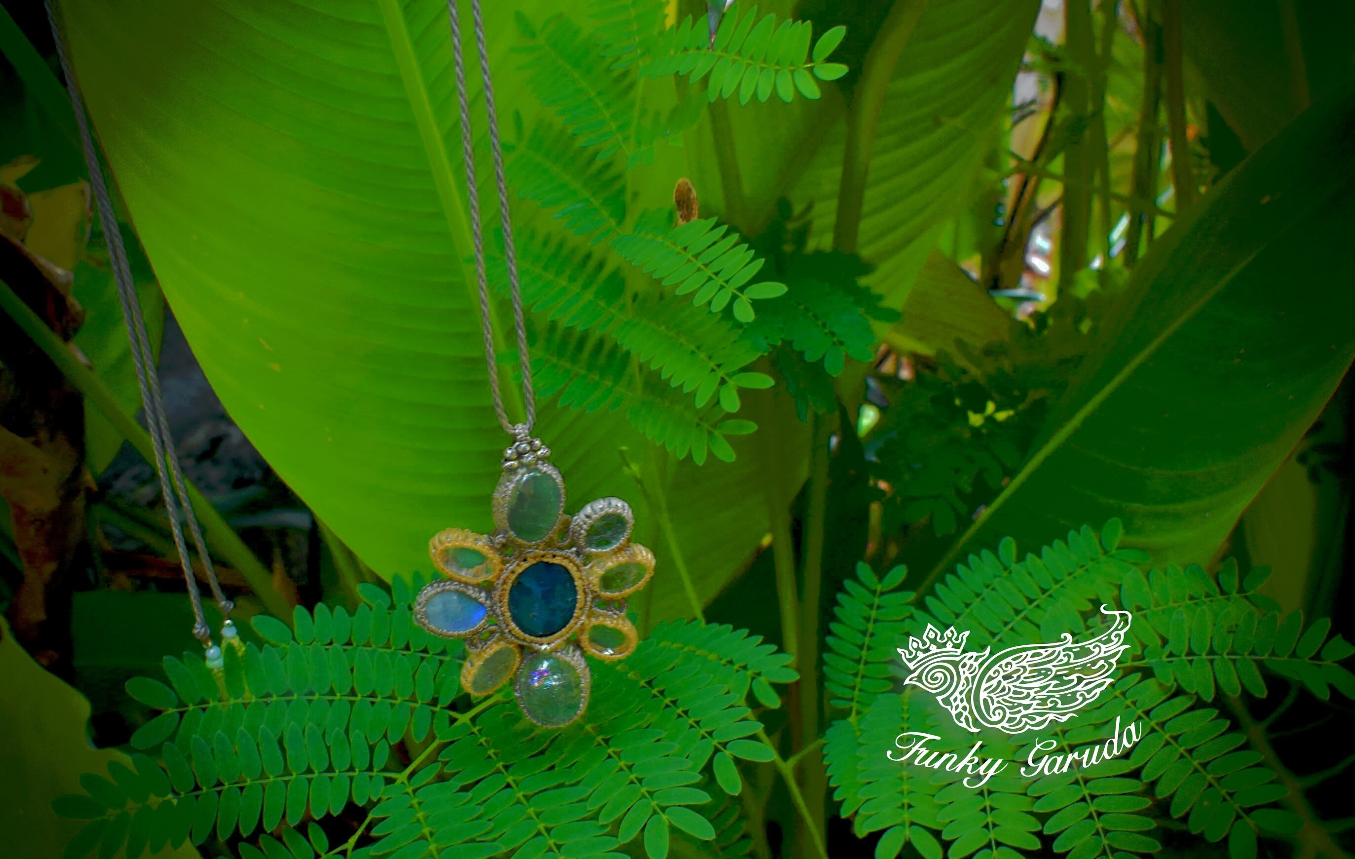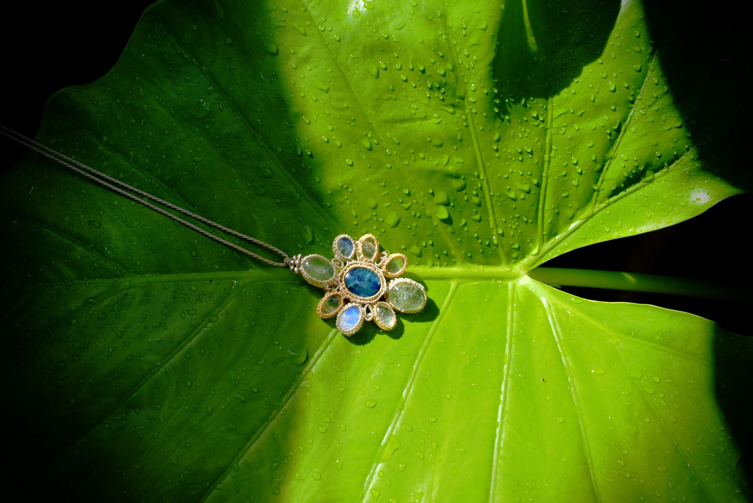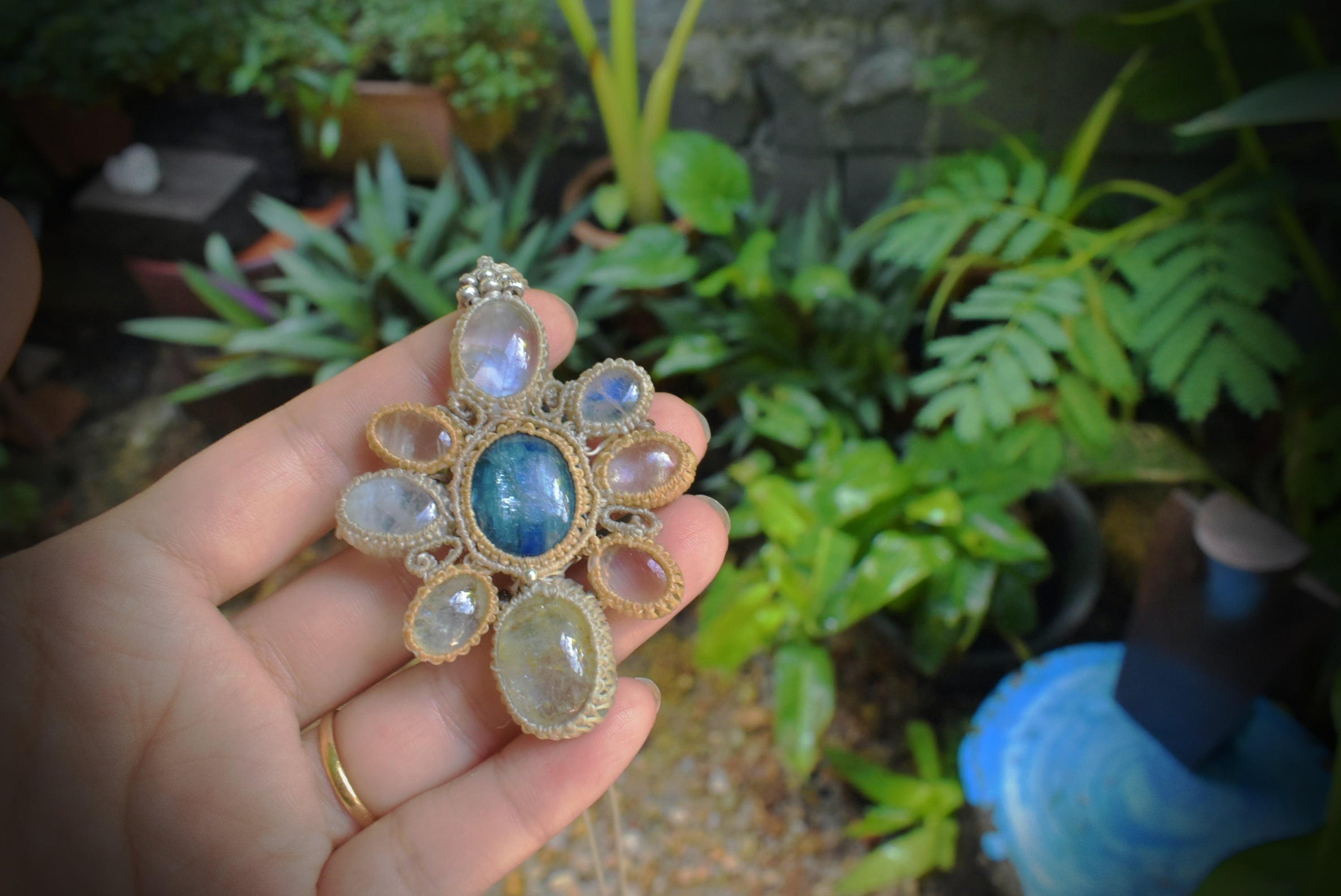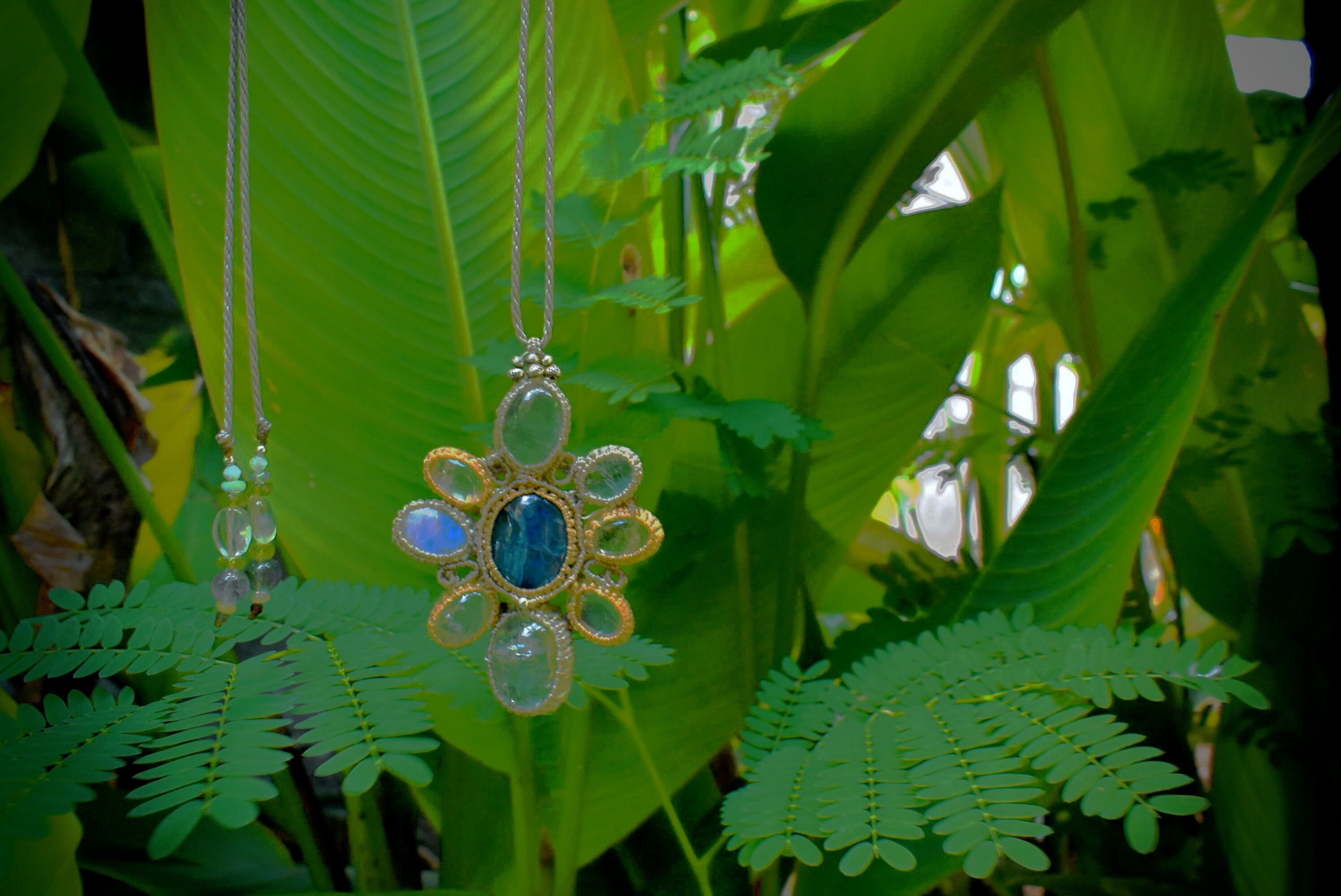 このたびはこの石を中心に様々なタイプのムーンストーン、そしてアクアマリンを使用して自然から生み出された小さな生命体をイメージしてマクラメペンダントを仕上げました。