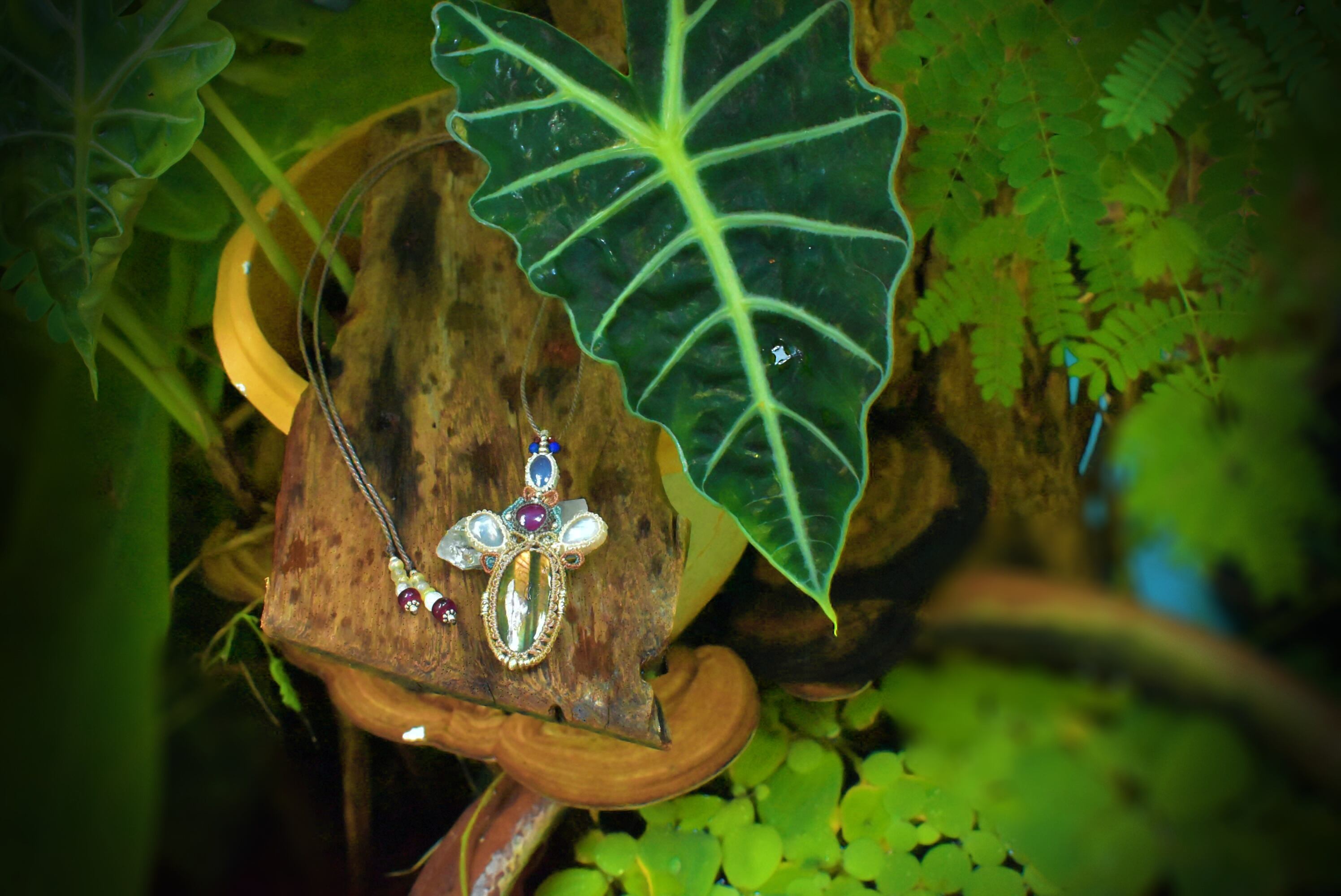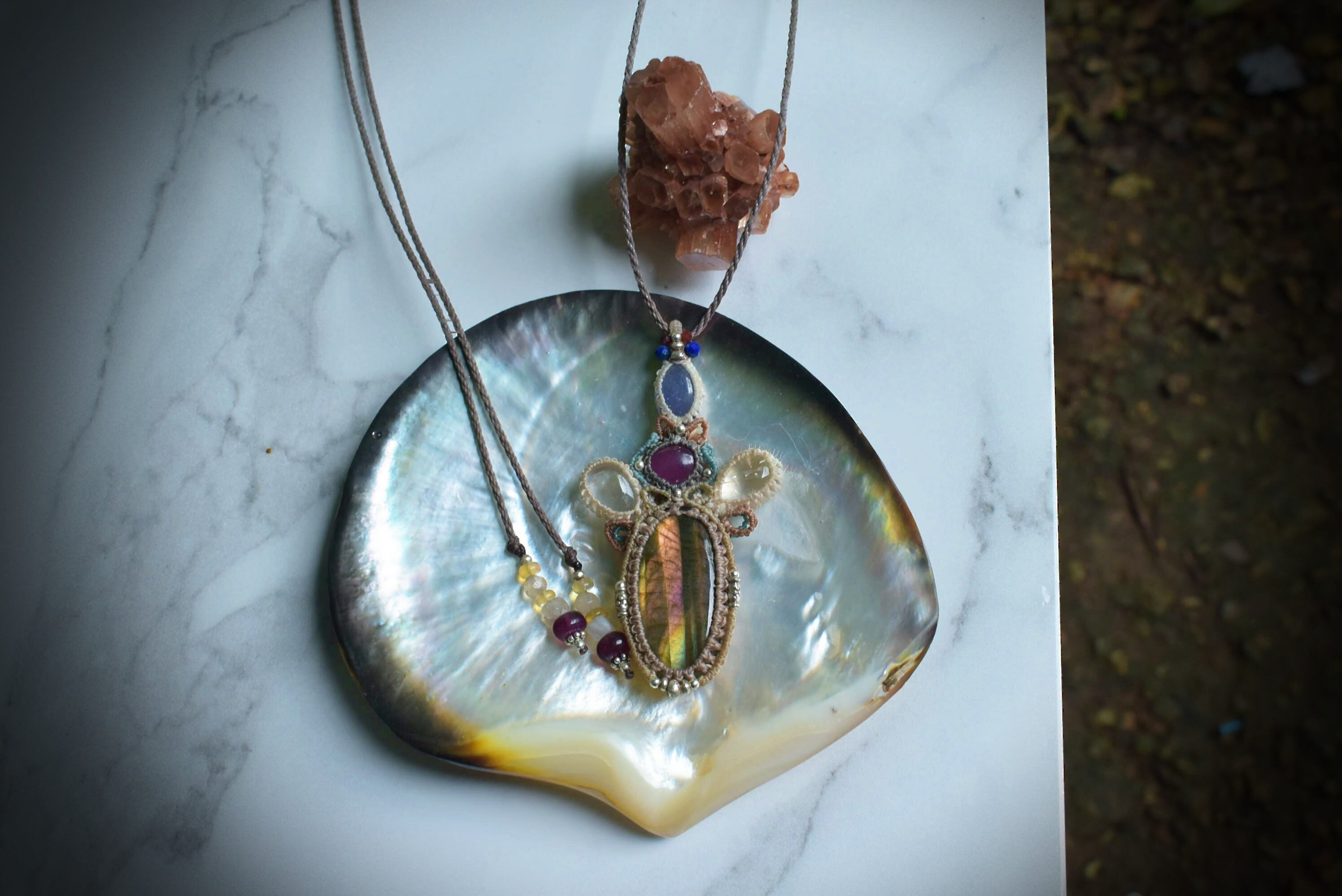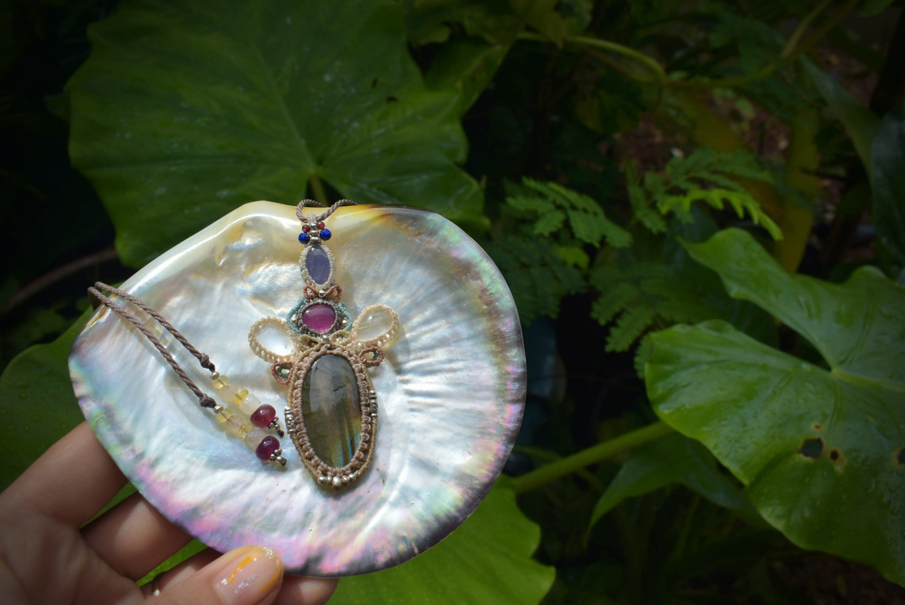 自然の中でもキラキラと輝くようひとつひとつを見立てて、ロウビキ糸で結び妖精のようなpペンダントに仕上げました。