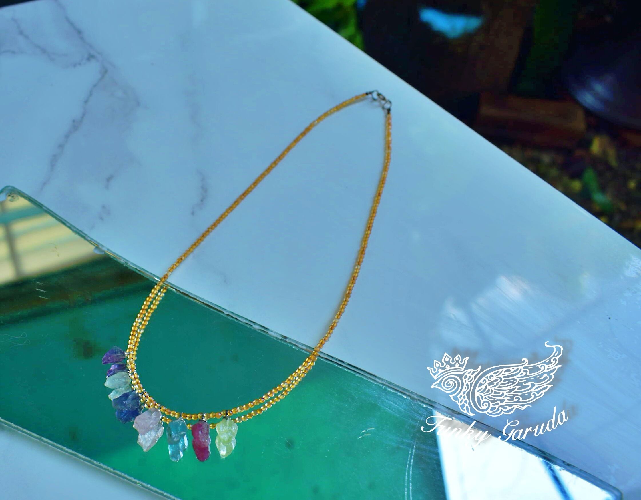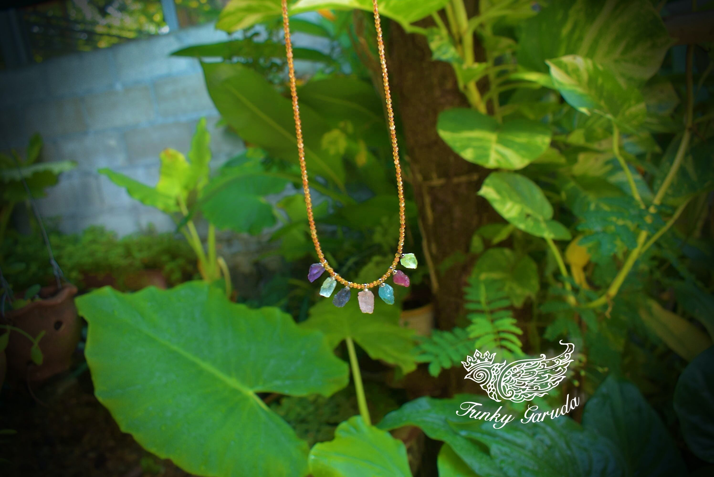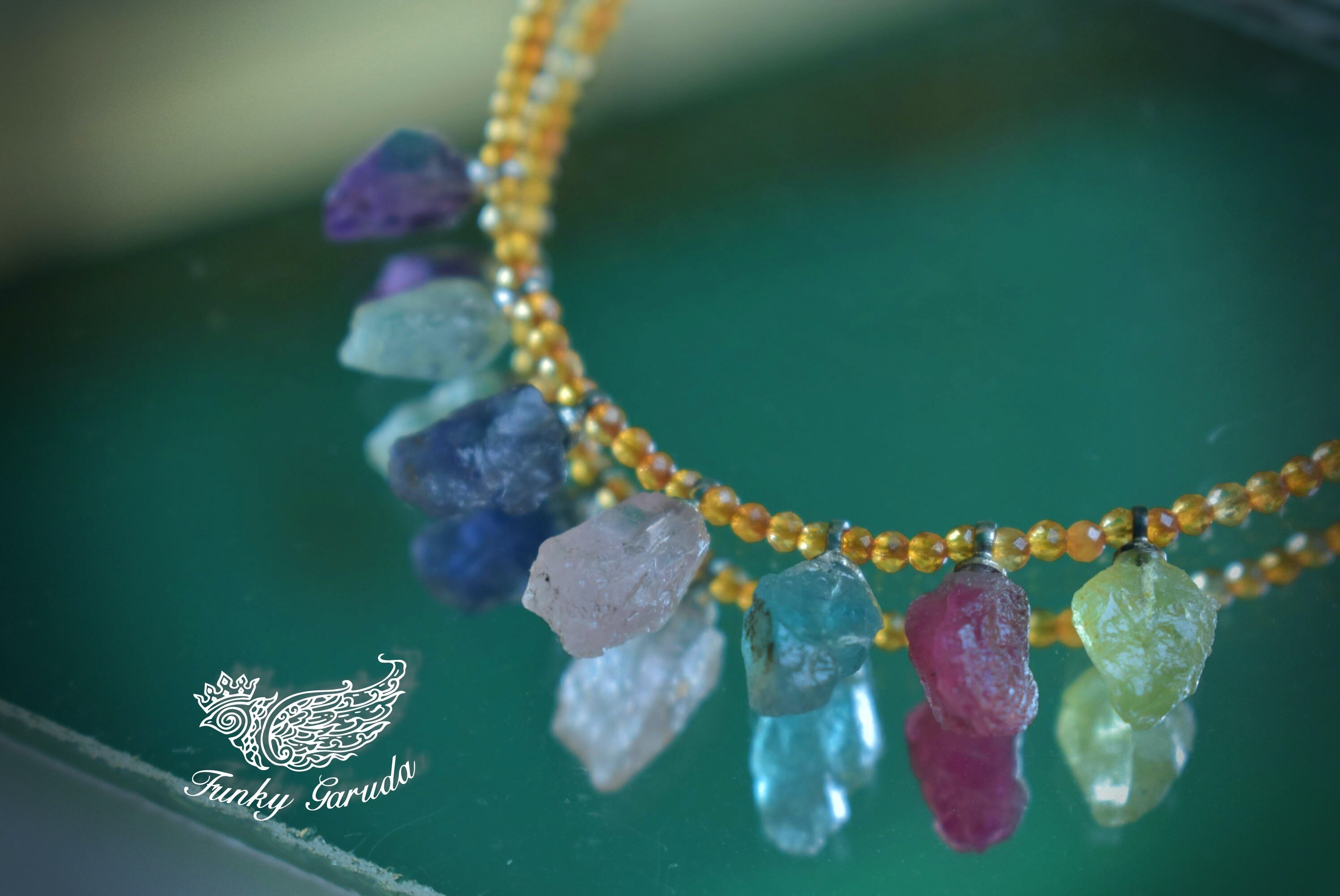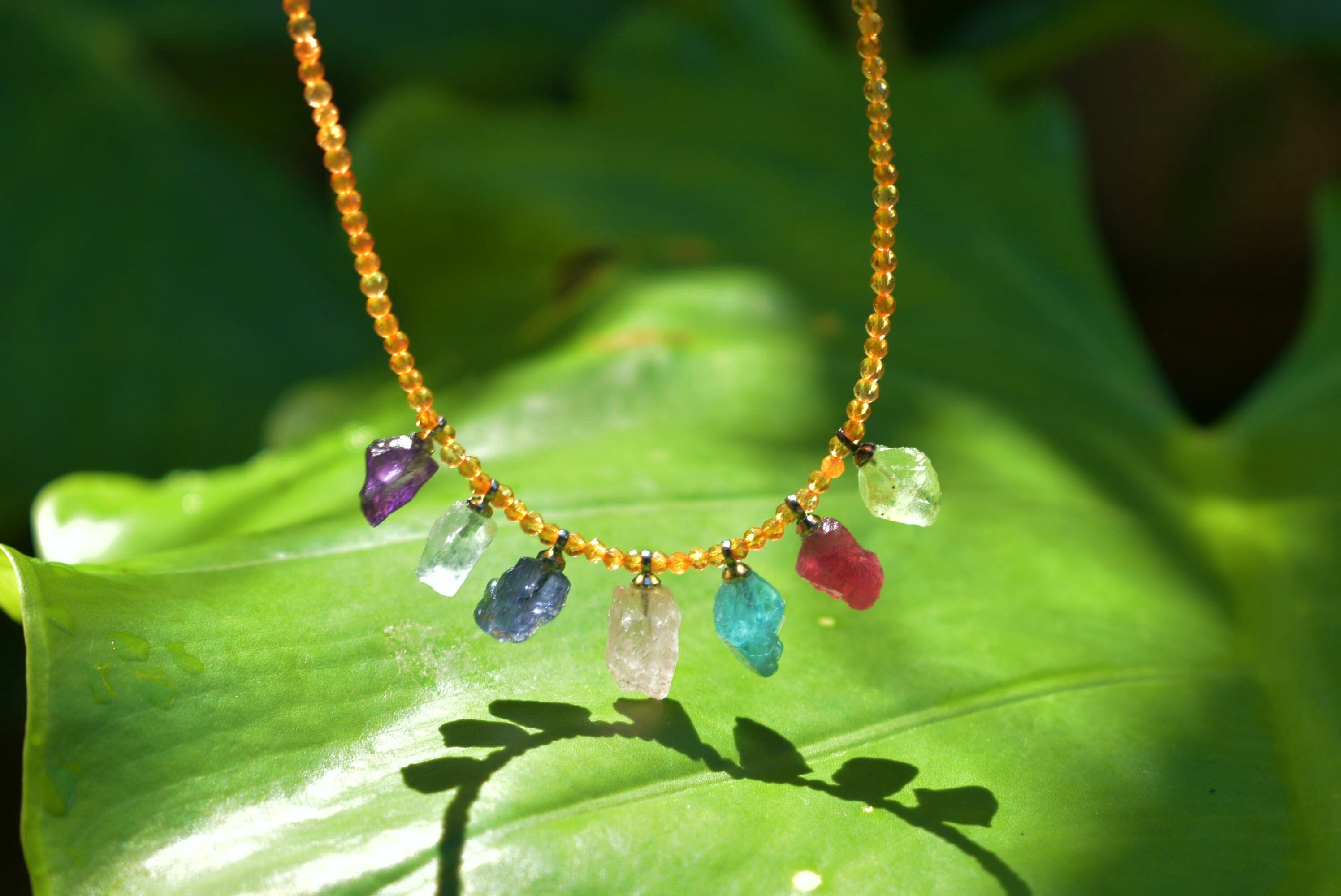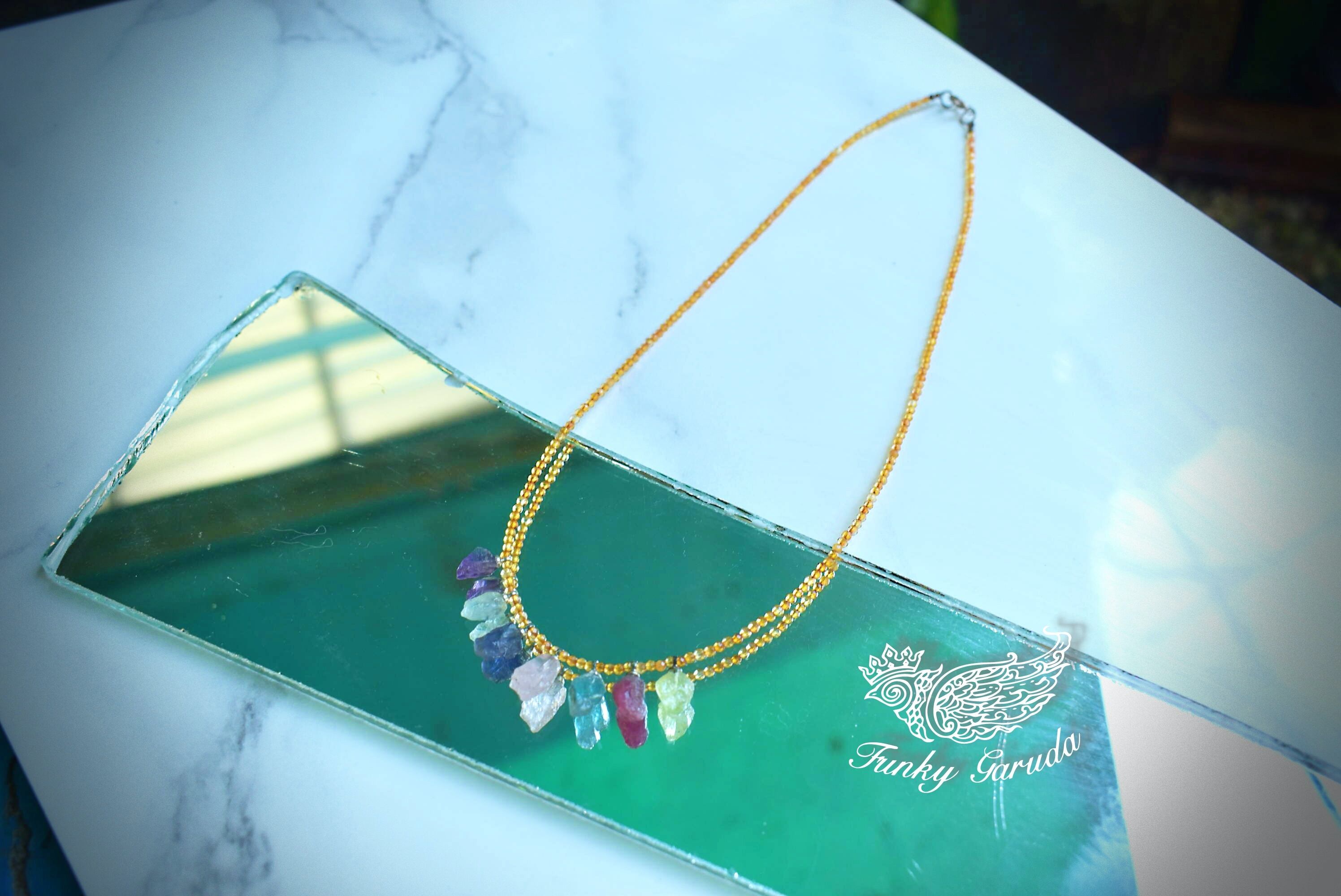 体と共鳴すると言われている7チャクラ称して原石を組み合わせて使用、制作したネックレス。