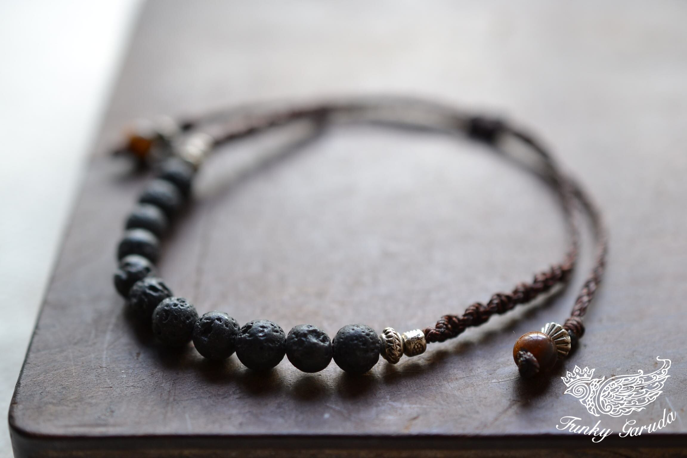 様々な模様の11つのラヴァビーズを組み合わせました。旅人のお守り、交友関係を築くパワーストーンといわれています。