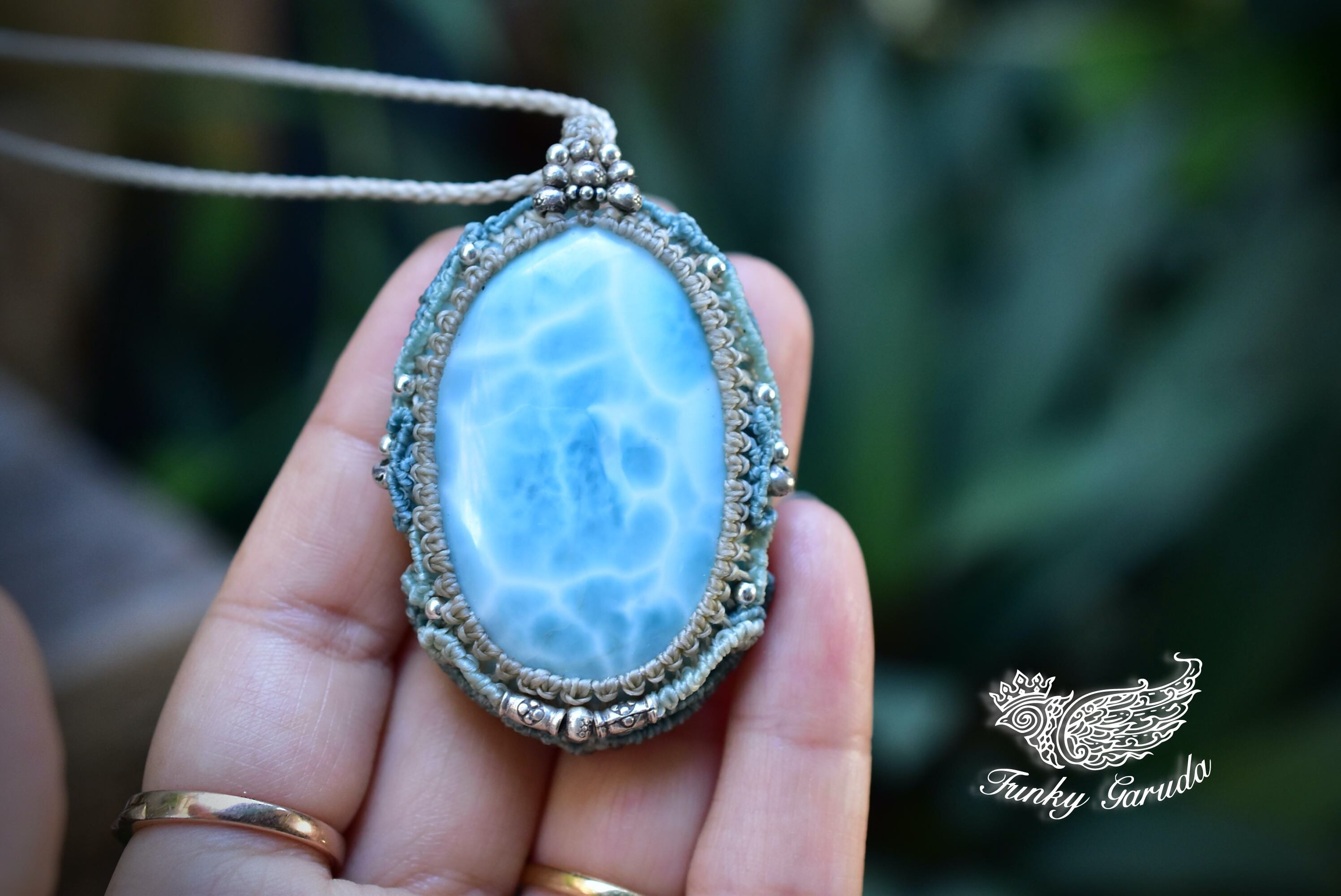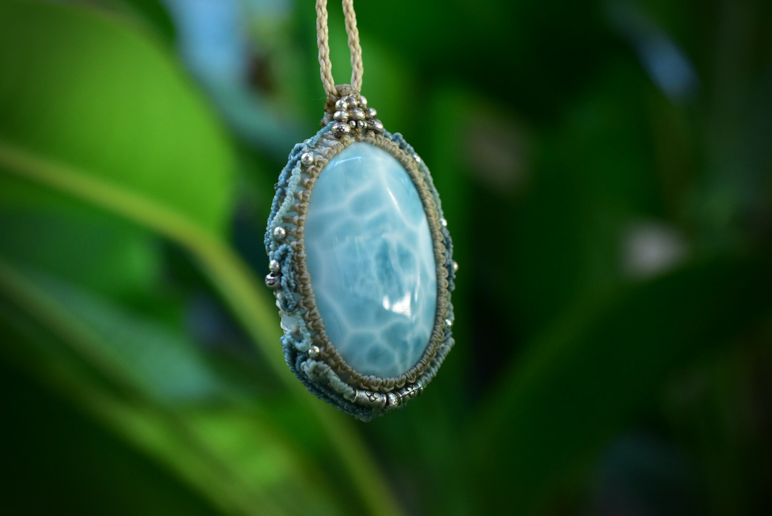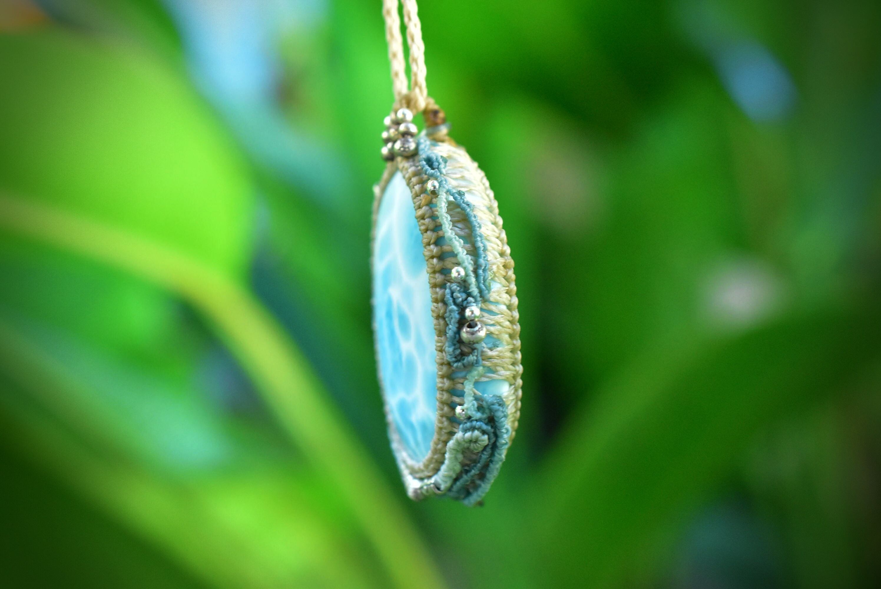 光にかざすと波模様がしっかりと透ける、大振りなラリマー。この石の模様を大切にマクラメ編み装飾にて曼荼羅のような動きを表現したペンダント。所々に散りばめたカレンシルバーがアイキャッチとしてペンダントの存在感が出るように装飾しました。