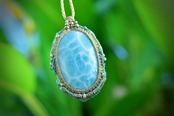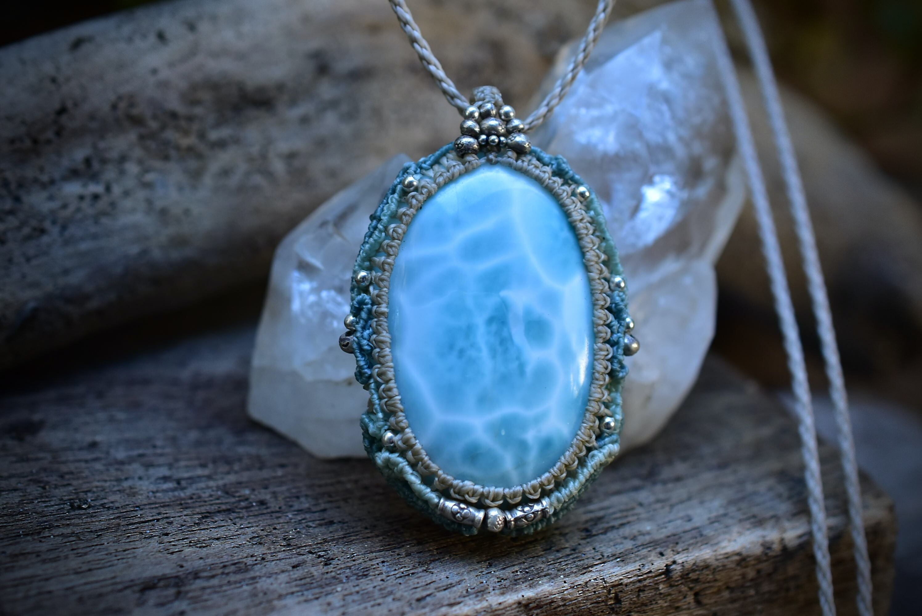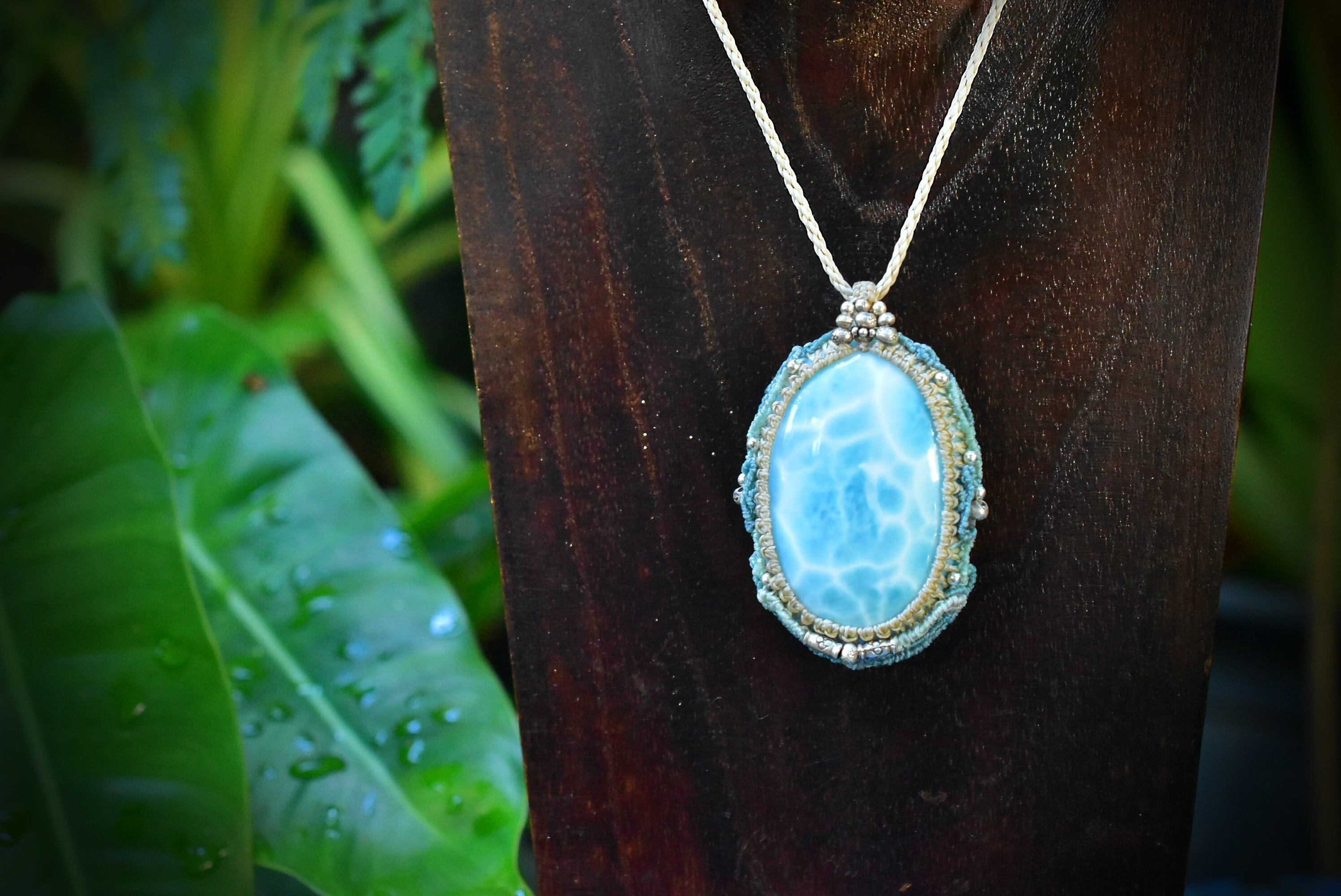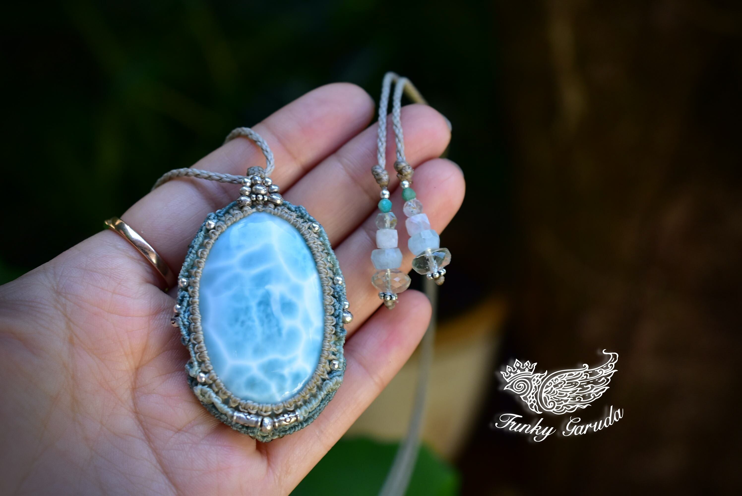 光にかざすと波模様がしっかりと透ける、大振りなラリマー。この石の模様を大切にマクラメ編み装飾にて曼荼羅のような動きを表現したペンダント。所々に散りばめたカレンシルバーがアイキャッチとしてペンダントの存在感が出るように装飾しました。