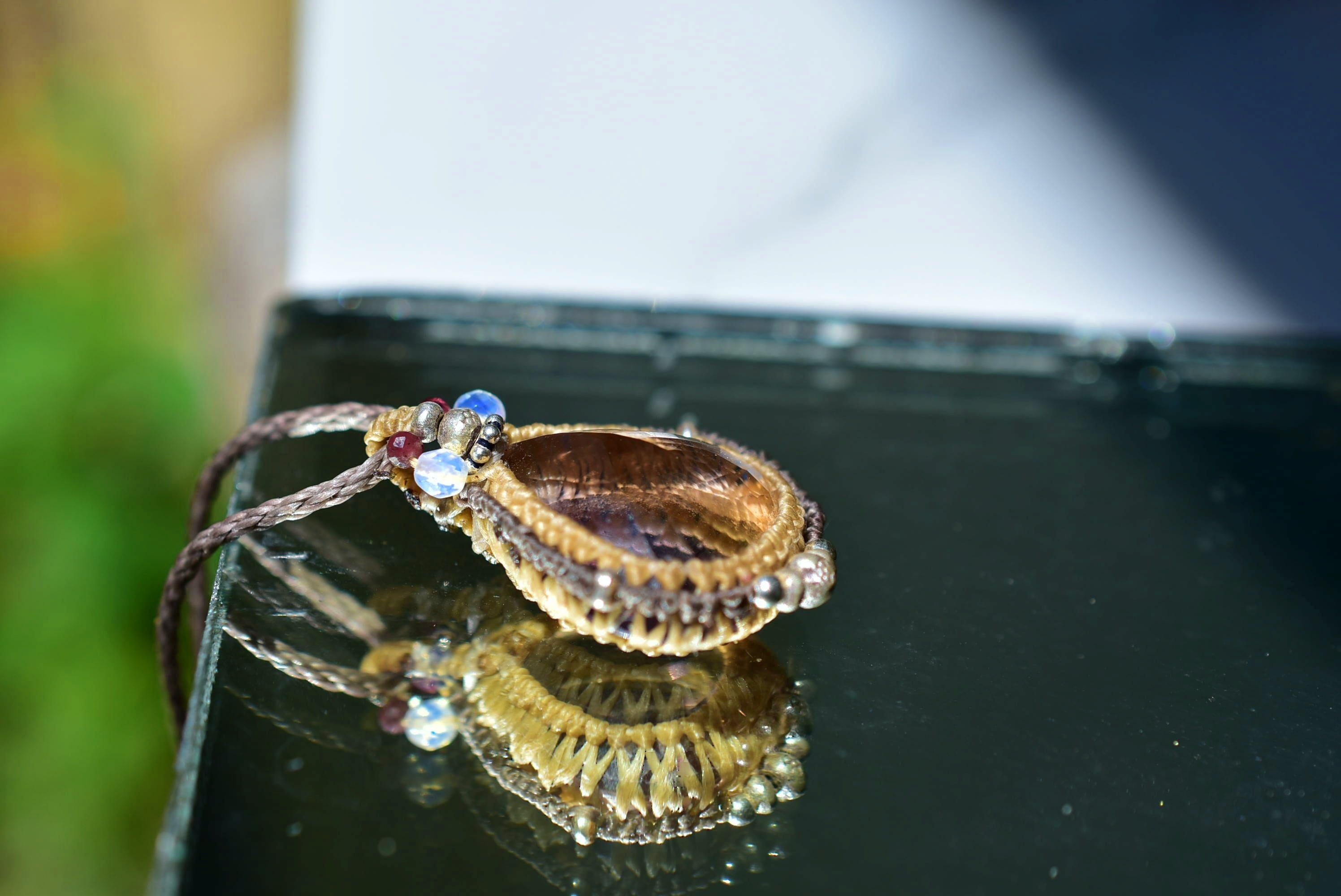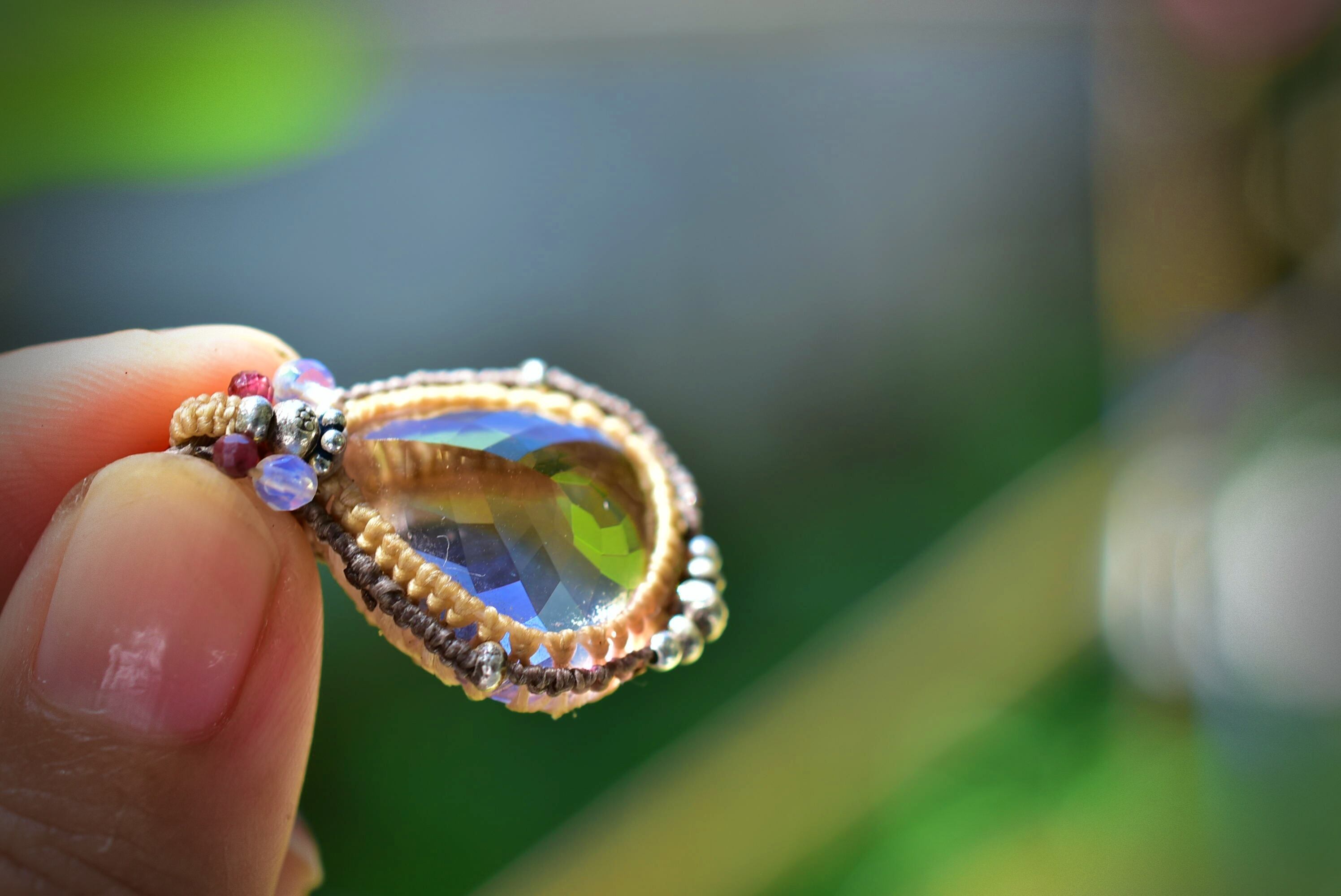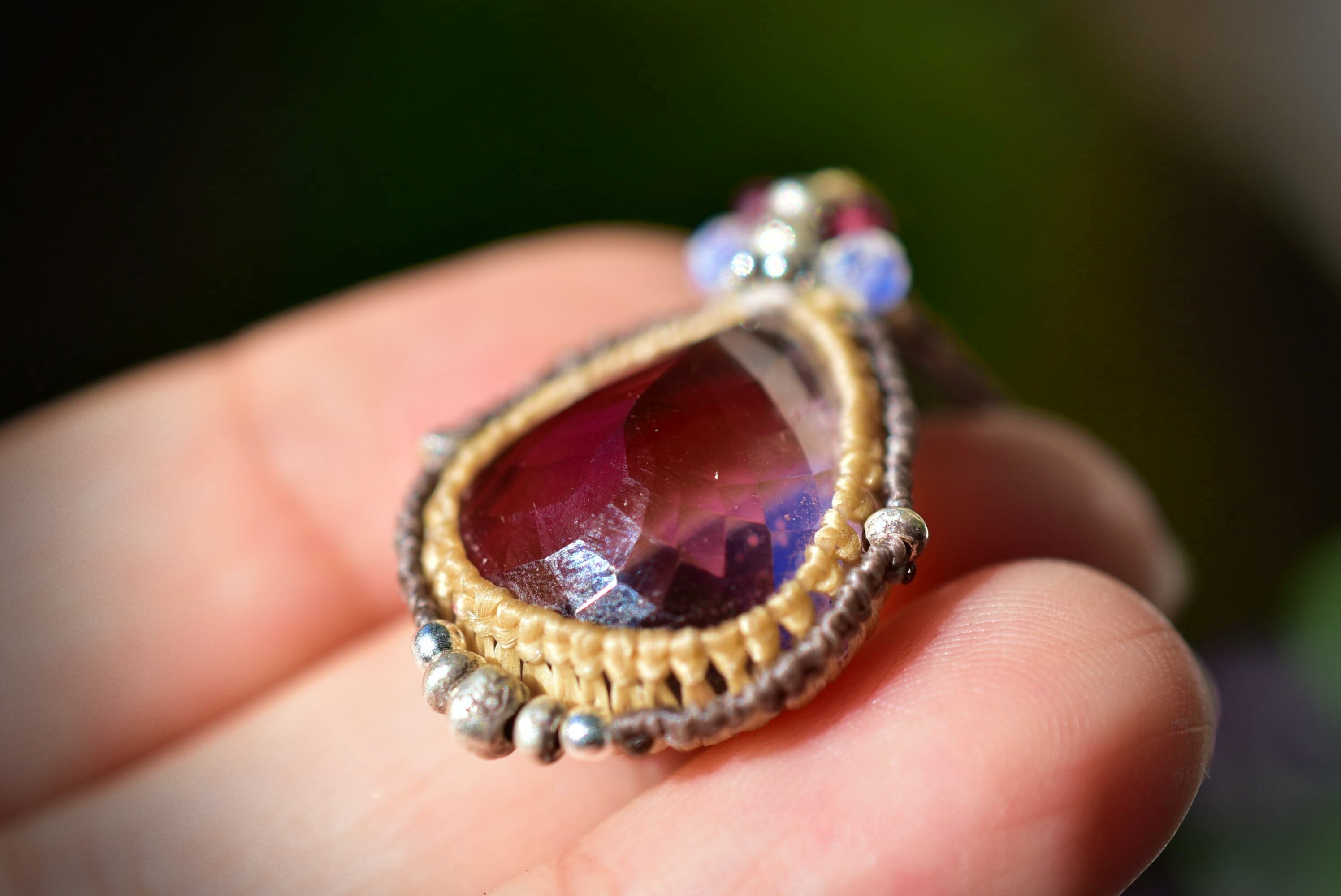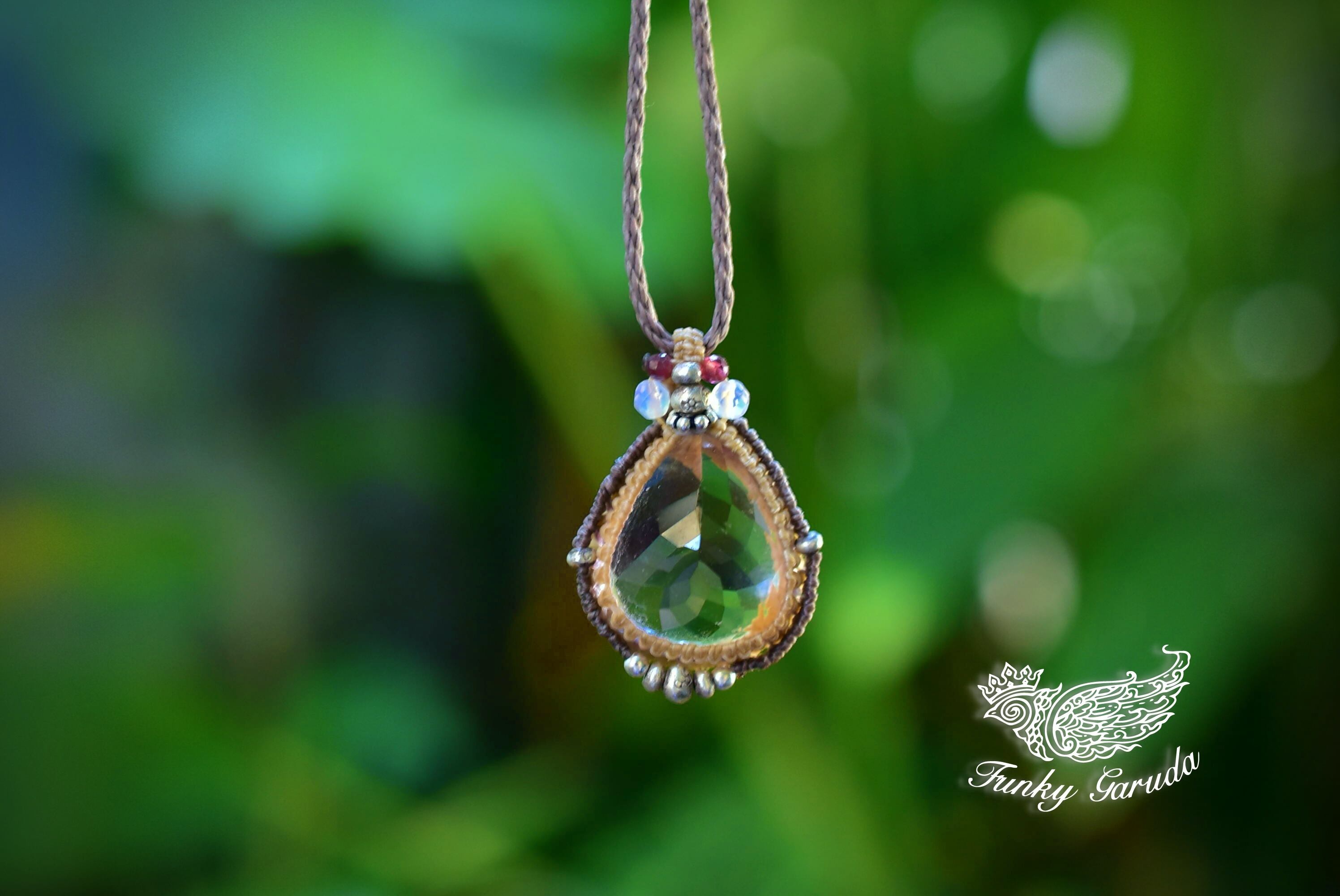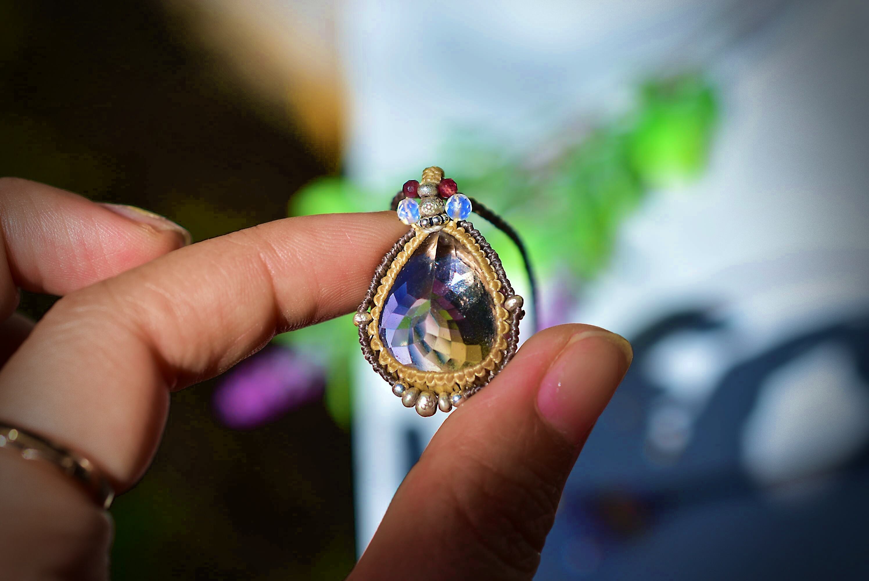 マクラメ編みのタッチは体にも優しいもの。宝石を見に付ける時にこんな宝石のスタイルもいいな.。と考えました。