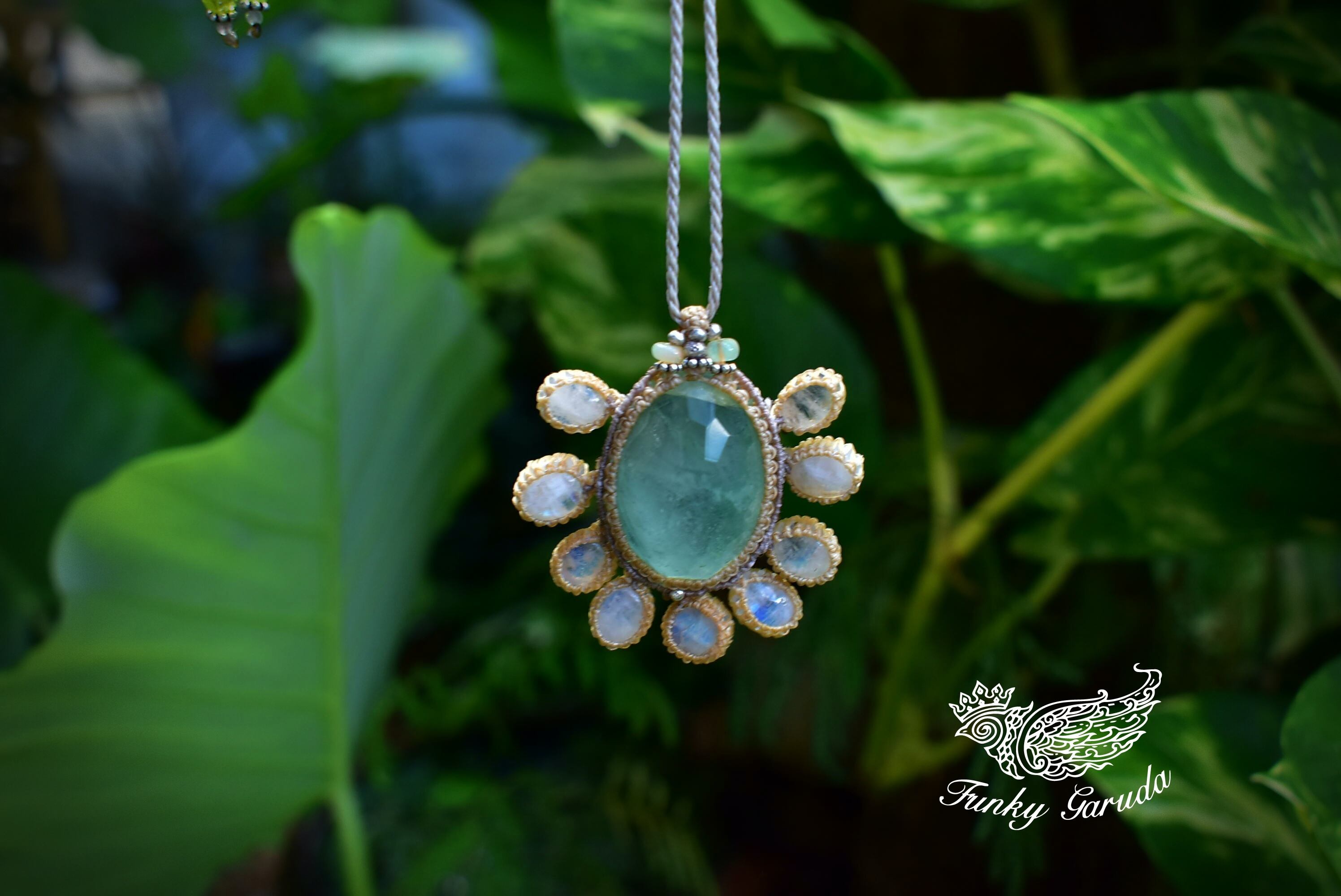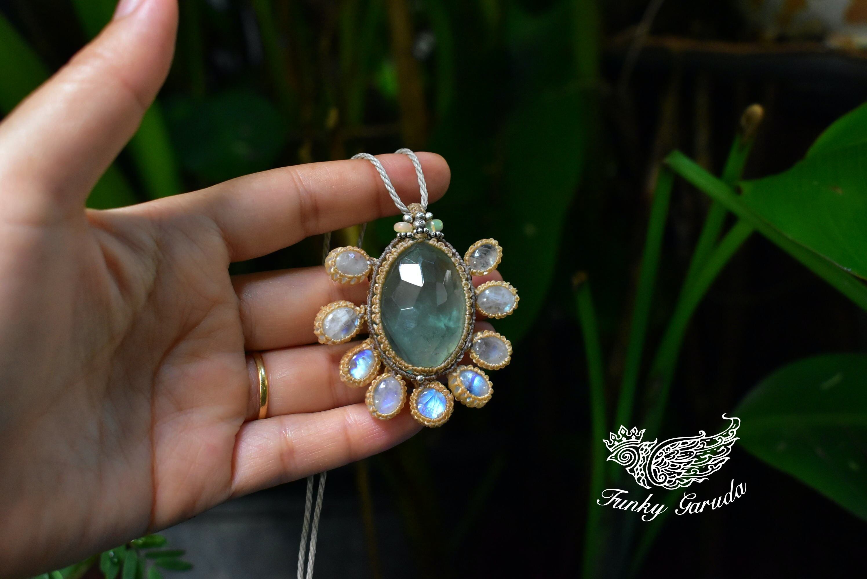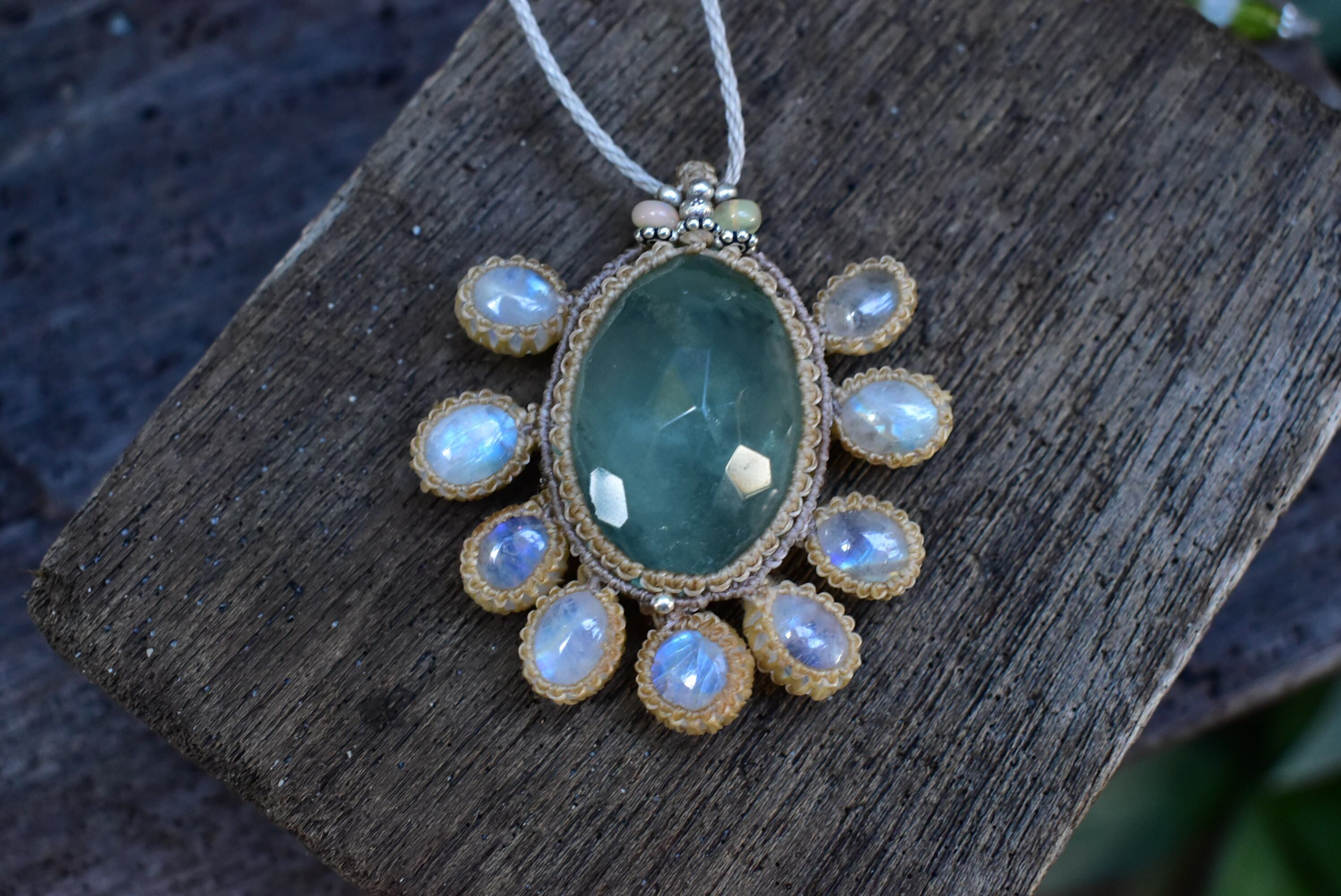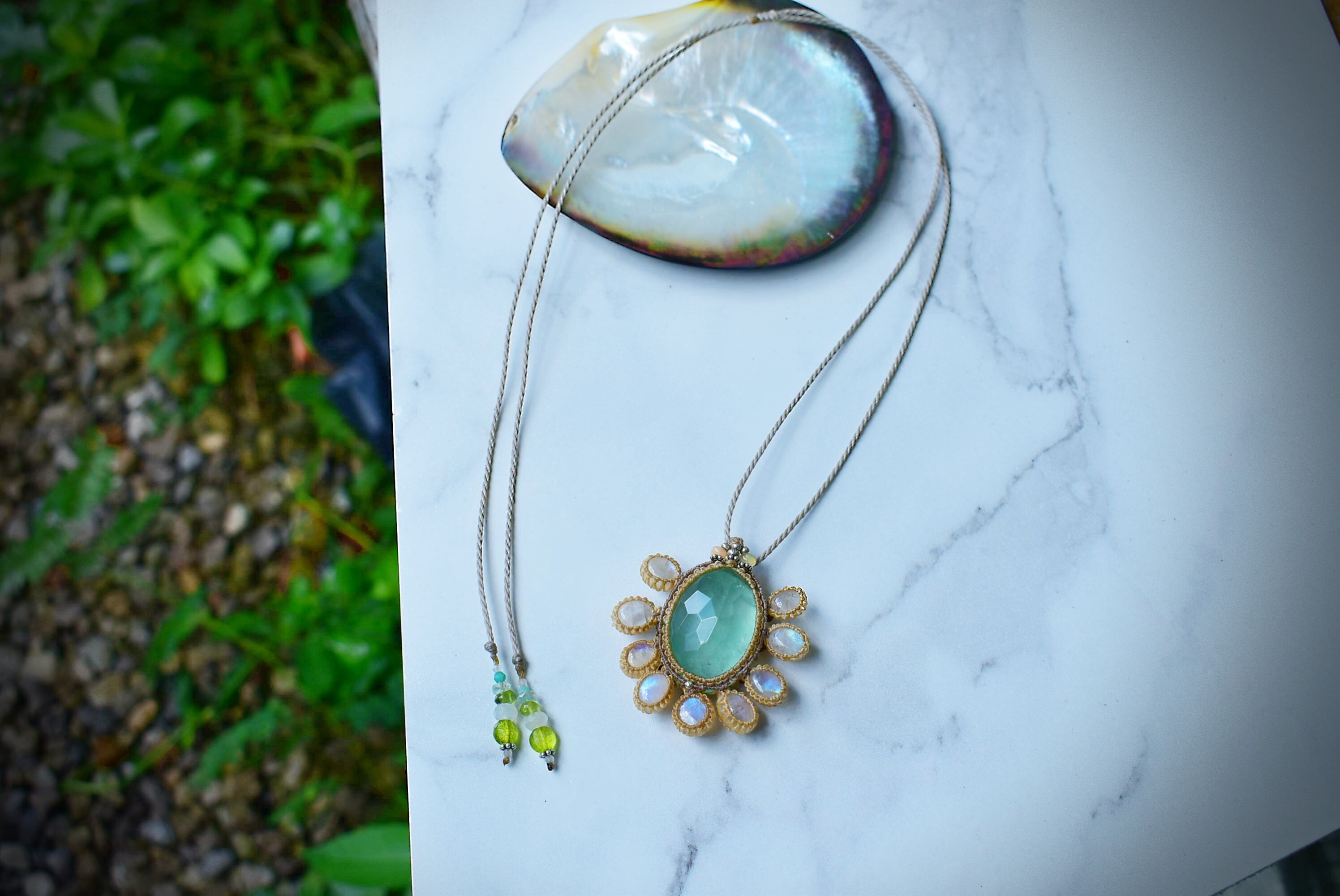 幻想の世界★グリーンフローライトとホワイトラブラドライト マクラメペンダントmoon023