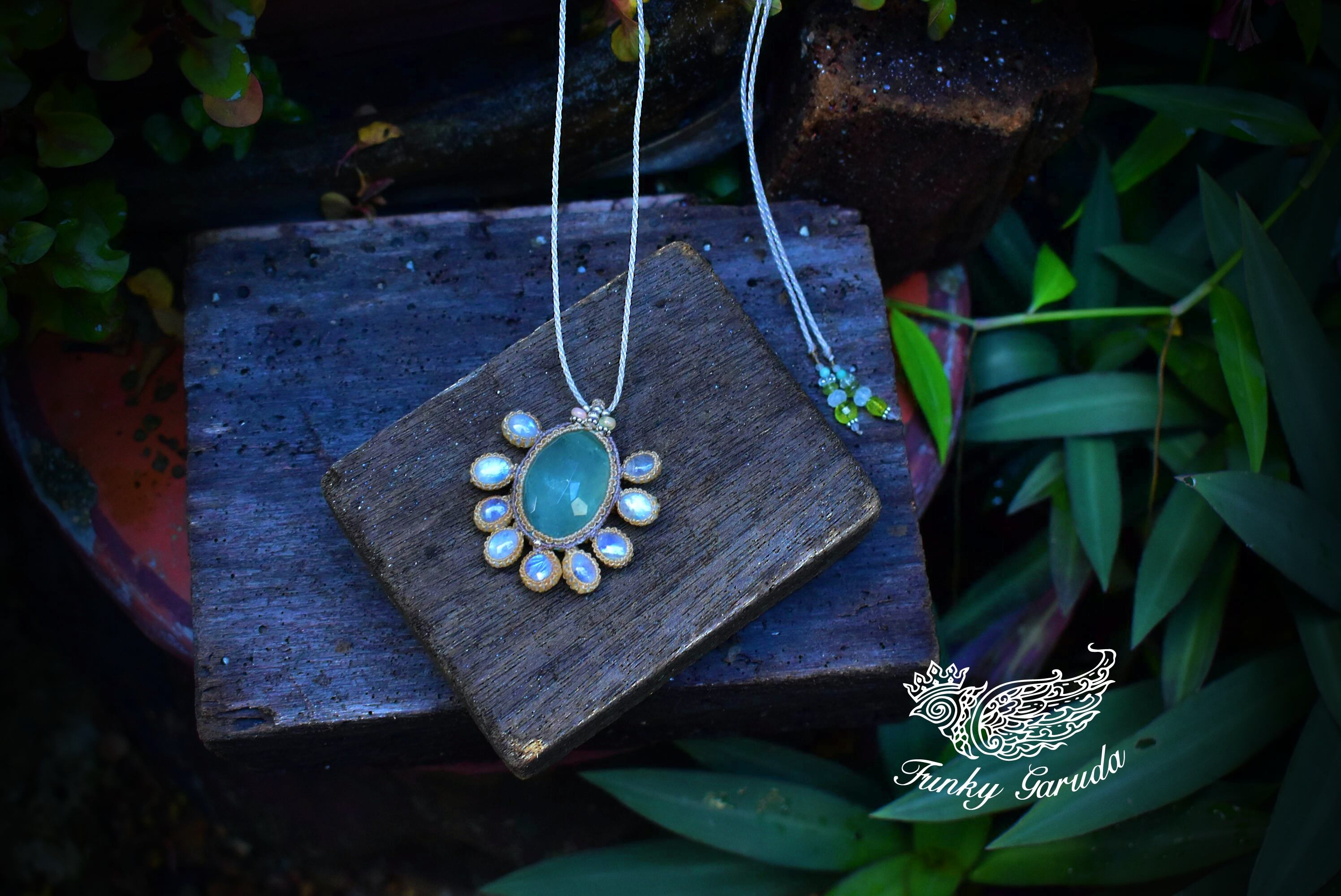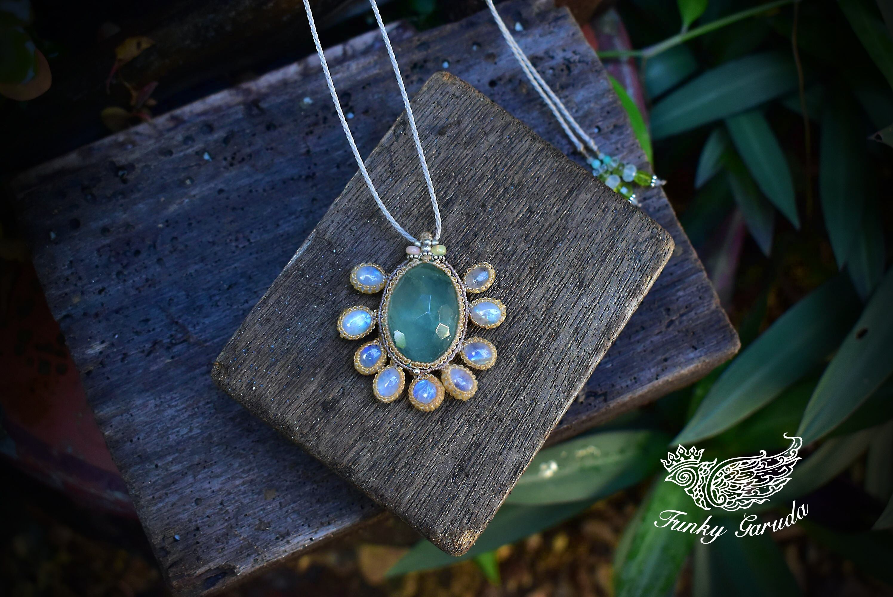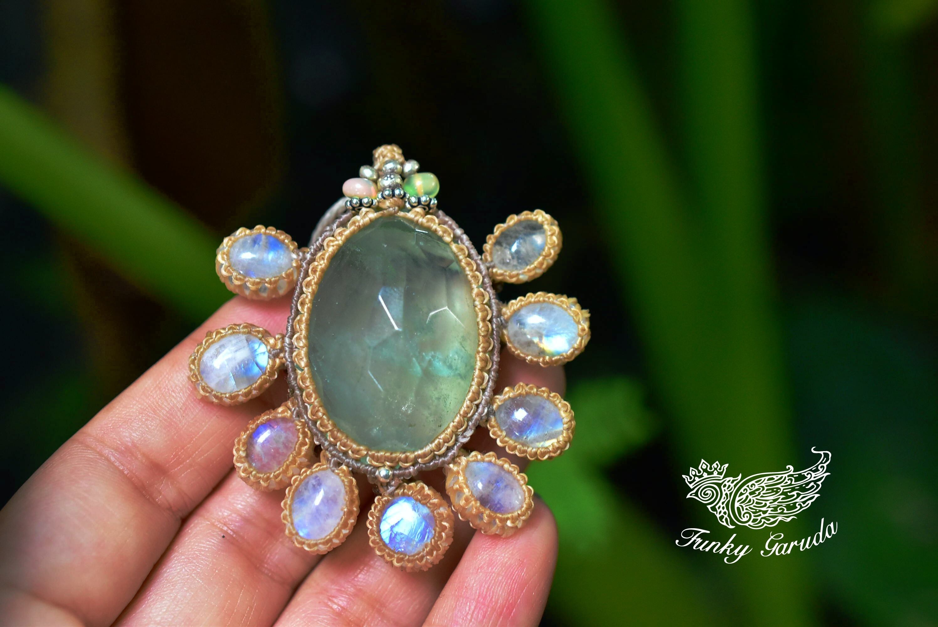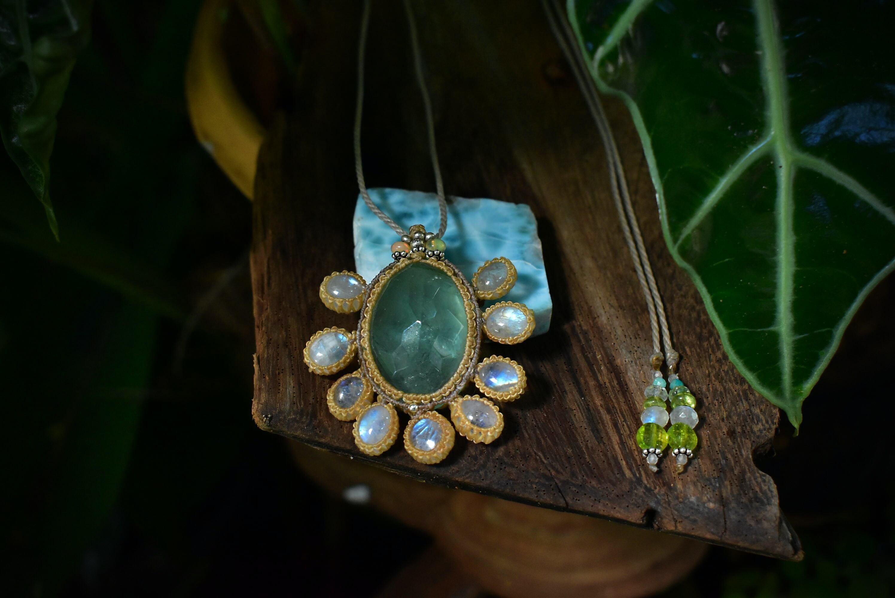 幻想の世界★グリーンフローライトとホワイトラブラドライト マクラメペンダントmoon023