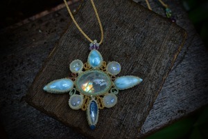 透明感とイエローレインボーカラーが入り込んだ美しいレインボームーンストーンを中心に咲かせたコンパスお花モチーフ。