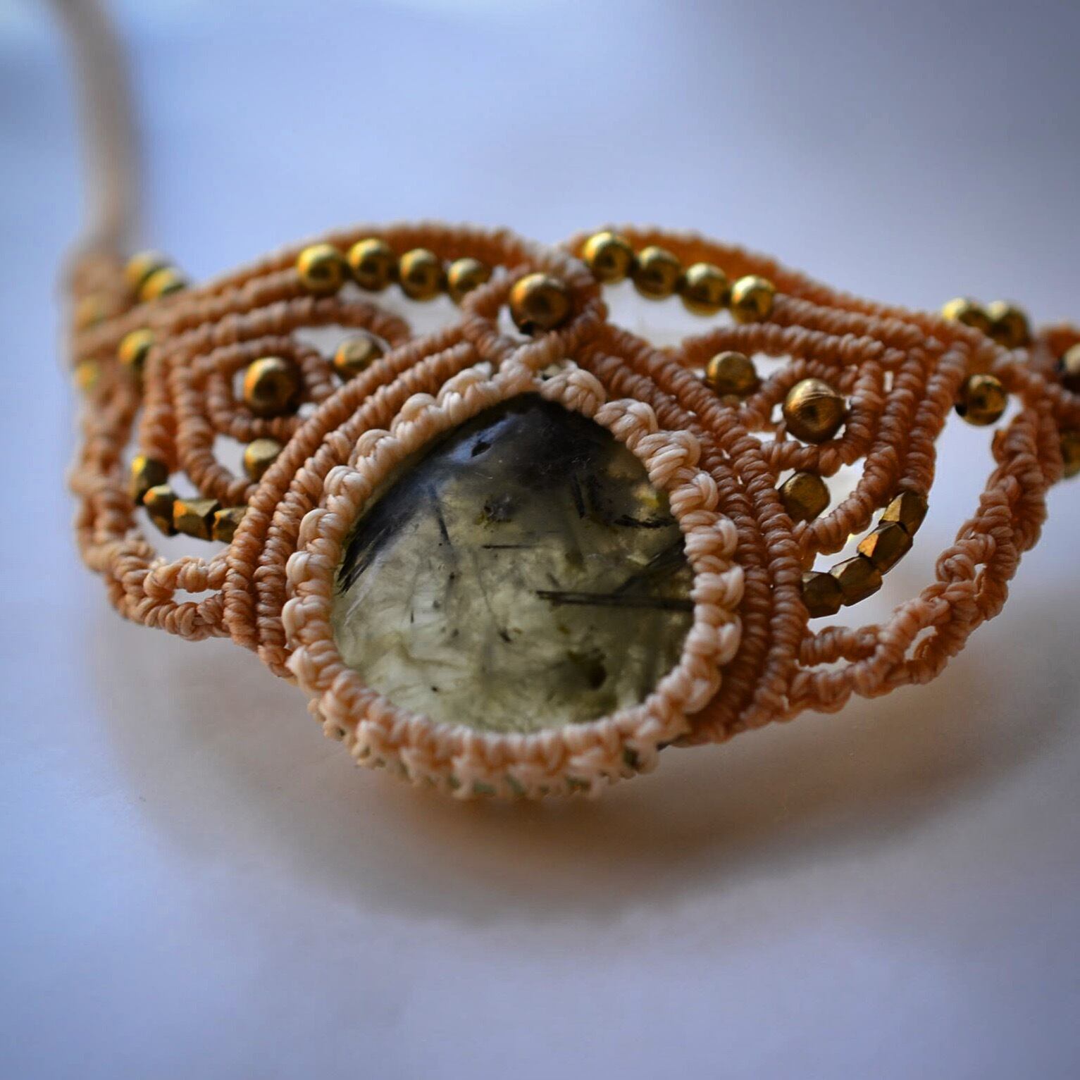 なぜか癖になる石プレーナイトをチョーカータイプにマクラメ編み装飾を施しました。インパクトある組み合わせと馴染みのある色味の蝋引き糸を使用して、ゴージャスでエレガントな雰囲気のアクセサリーに仕上がりました。