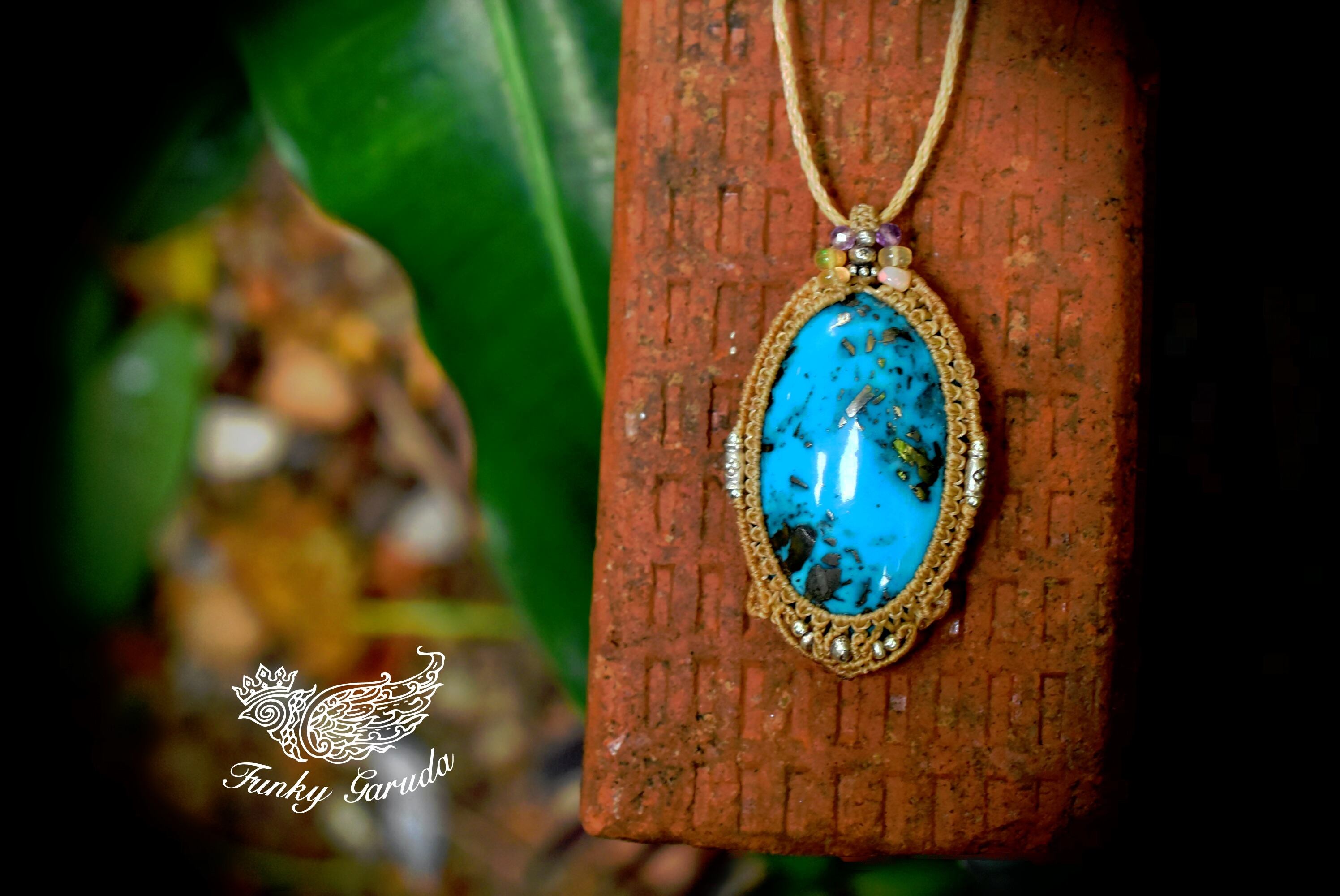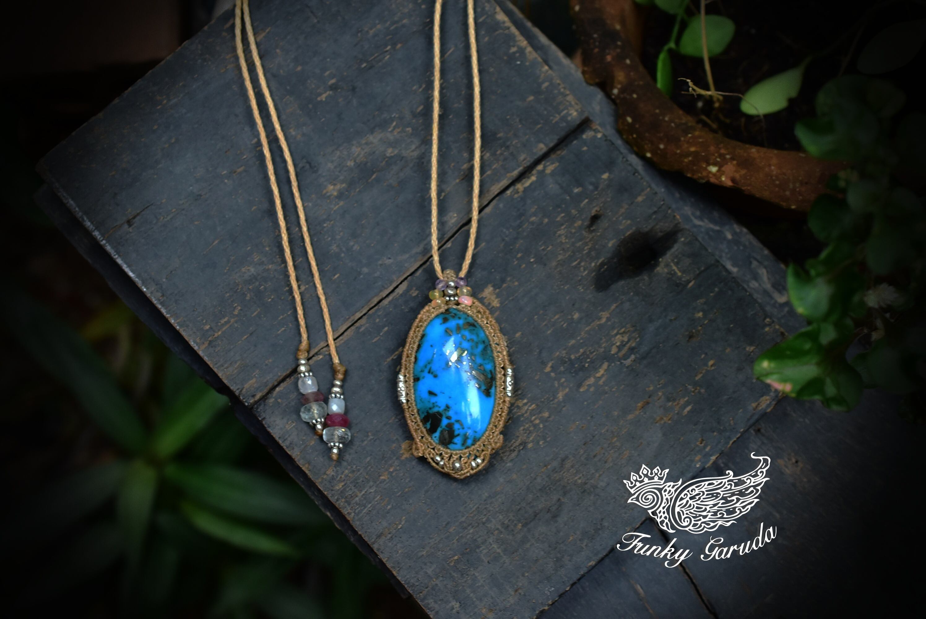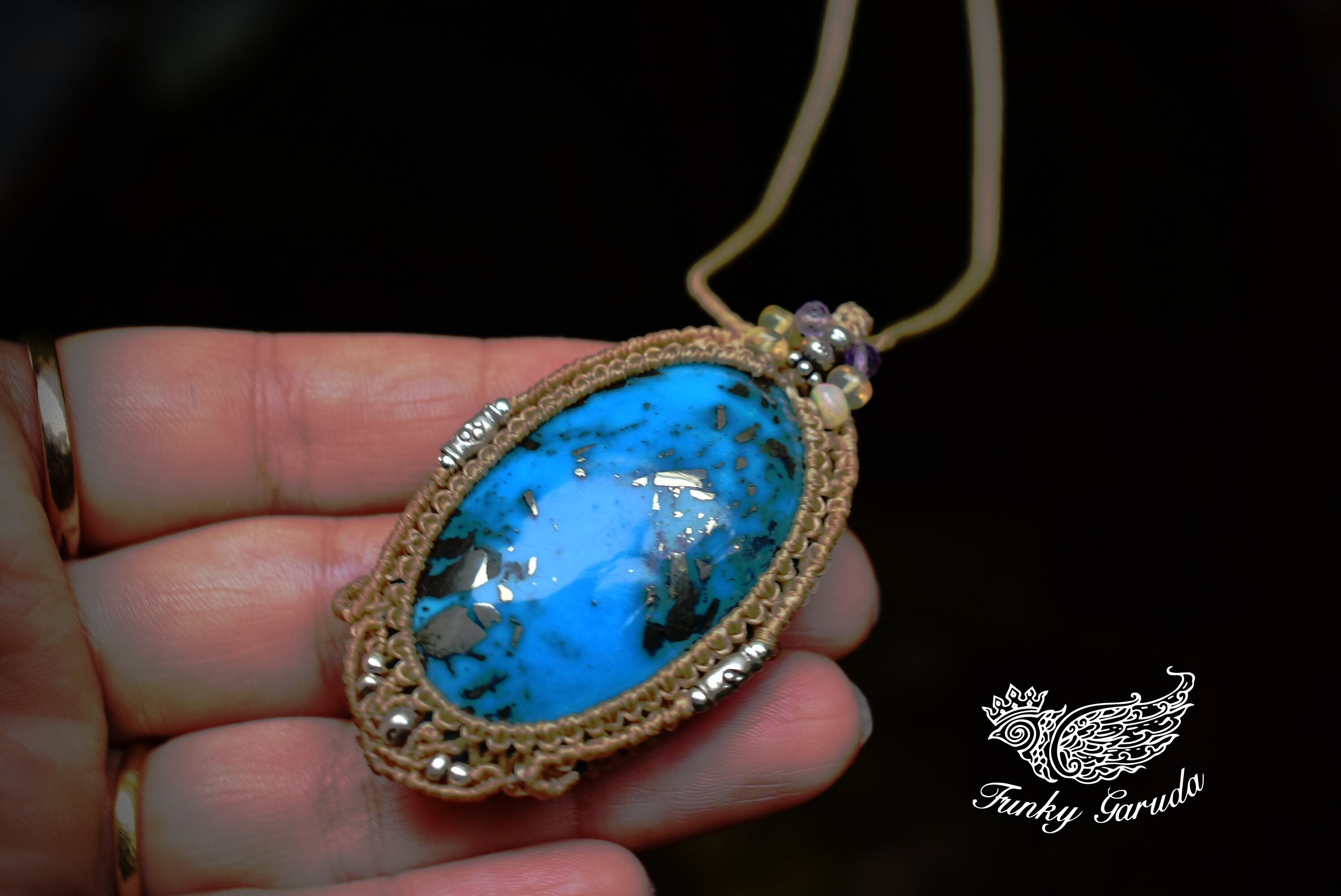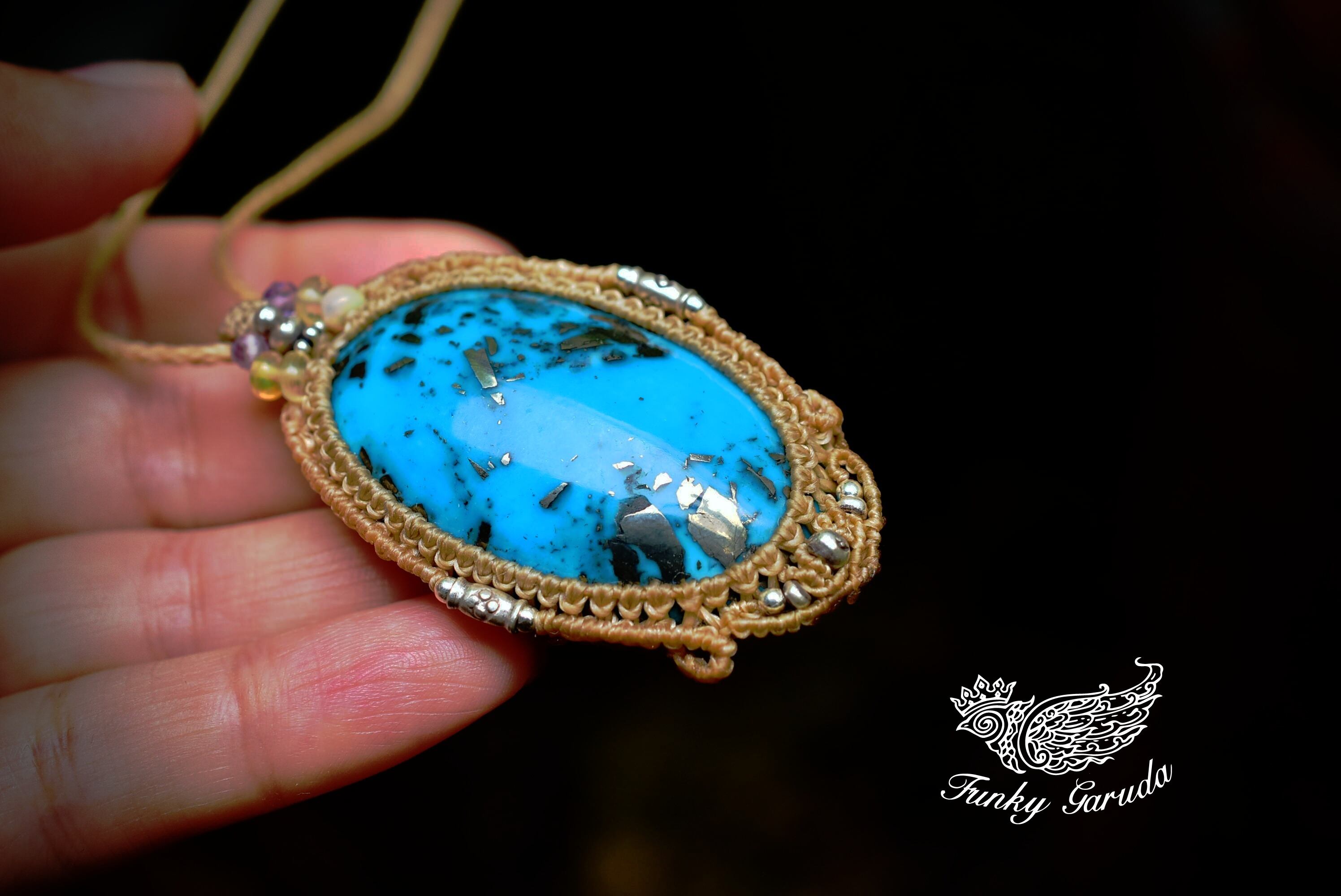 大きなルースの中には見事なまでに美しいパイライトが入り込んだ美しいビースのターコイズを使用してマクラメ編み装飾を施し、ペンダントに仕上げました。