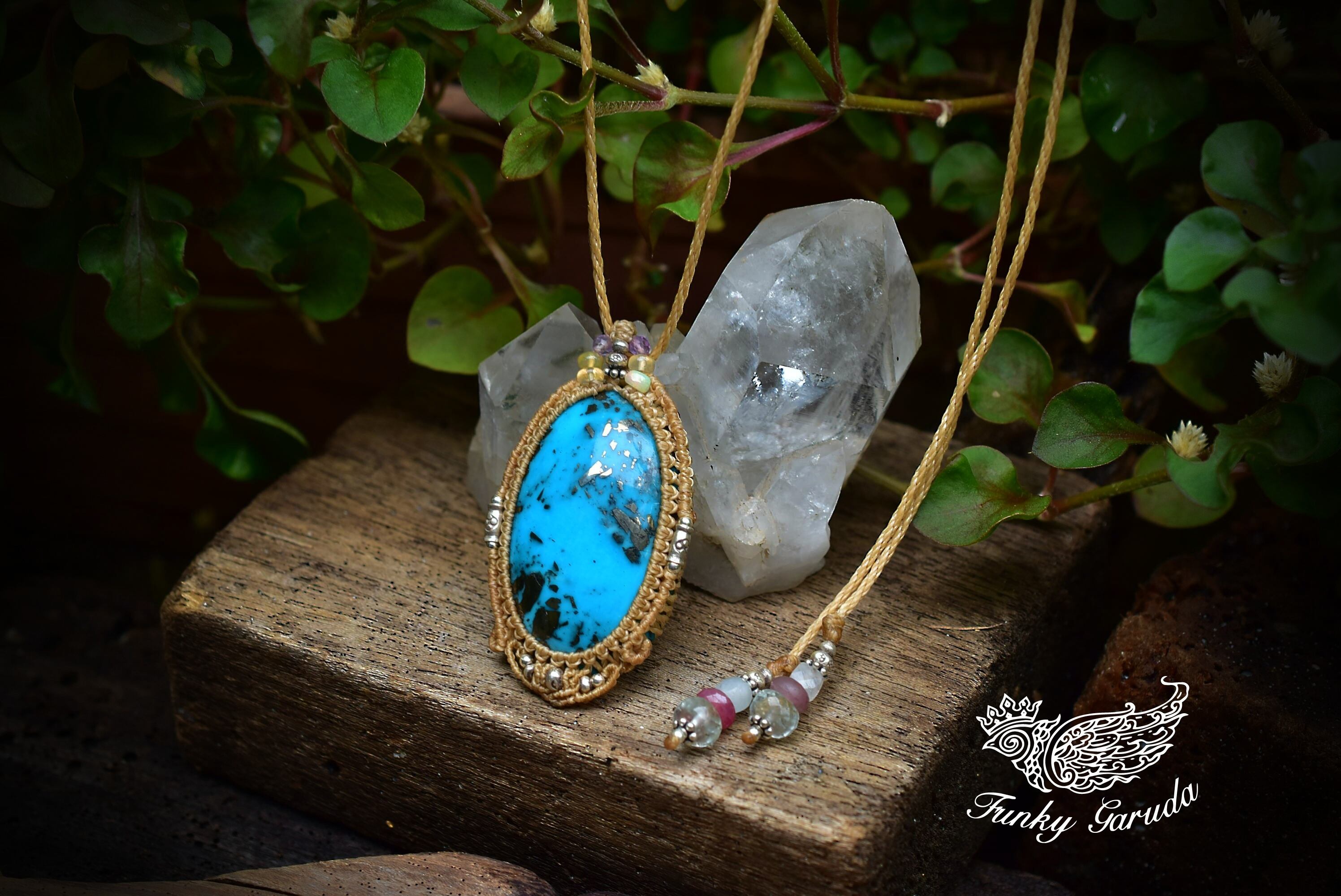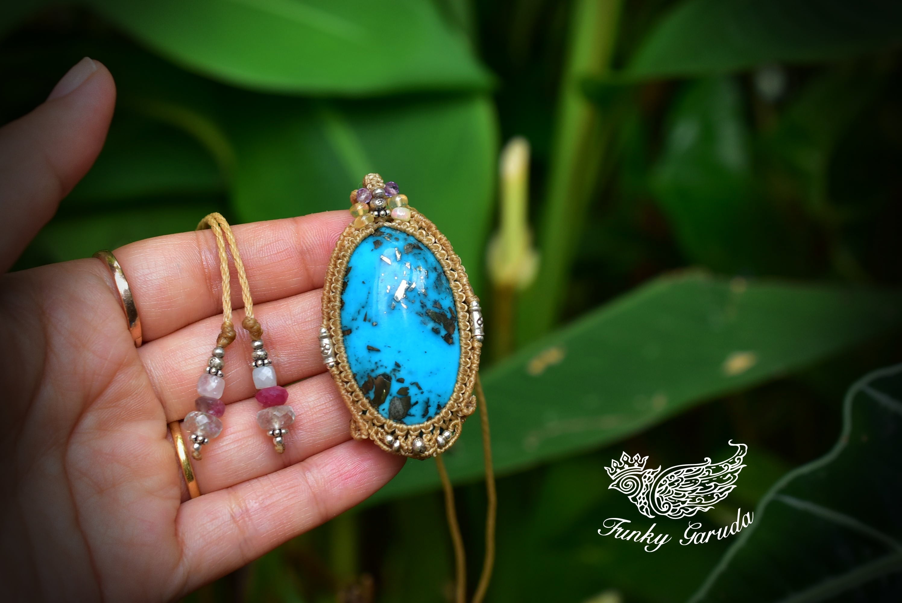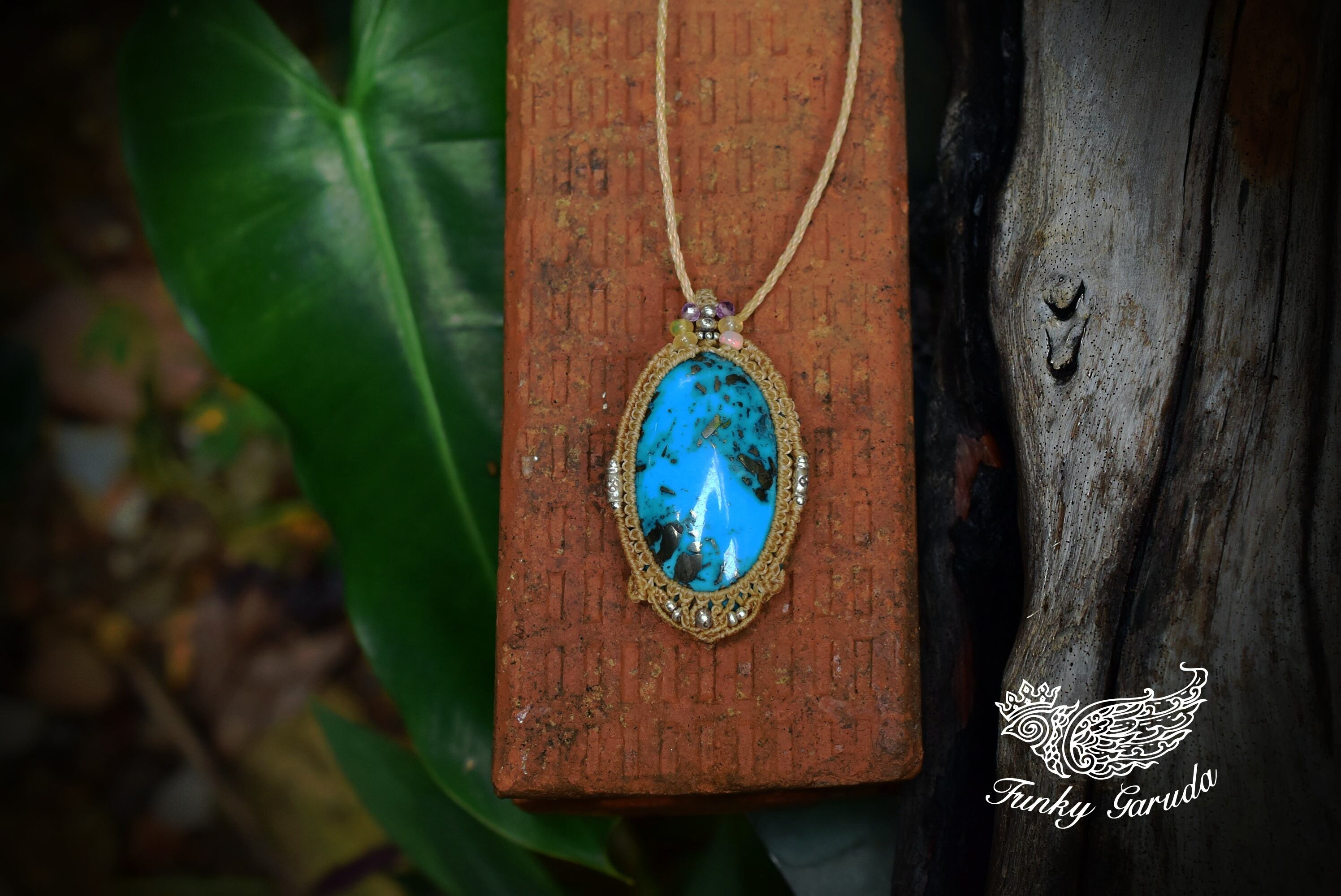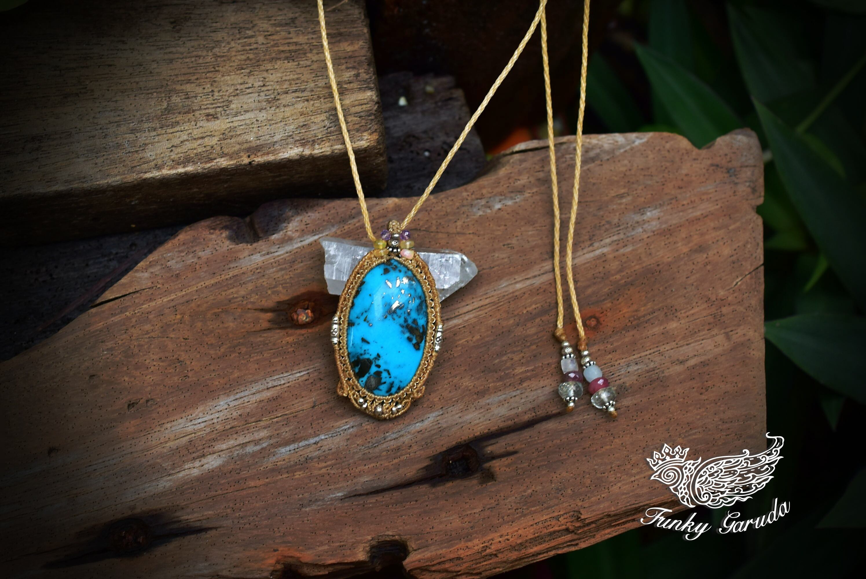 大きなルースの中には見事なまでに美しいパイライトが入り込んだ美しいビースのターコイズを使用してマクラメ編み装飾を施し、ペンダントに仕上げました。