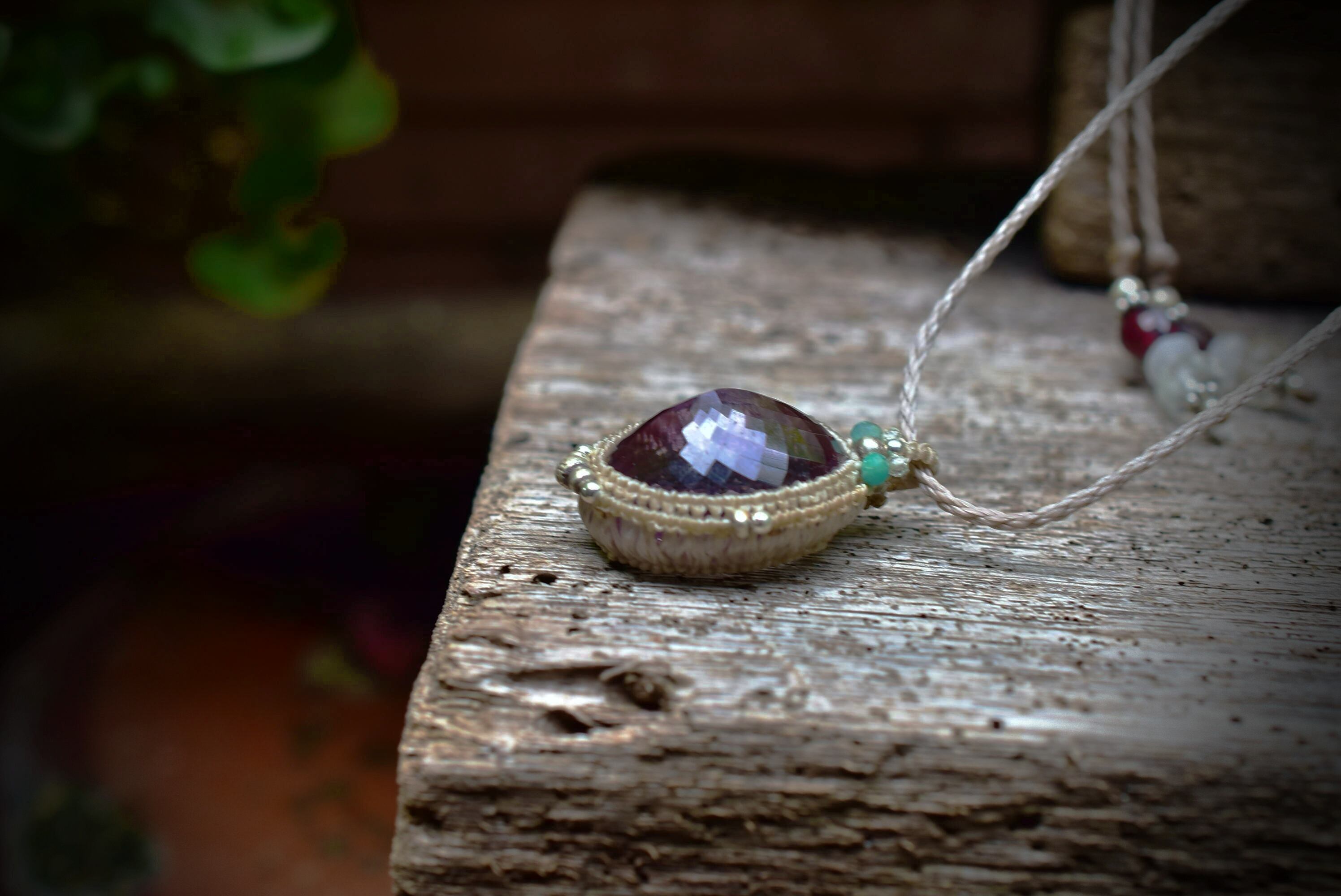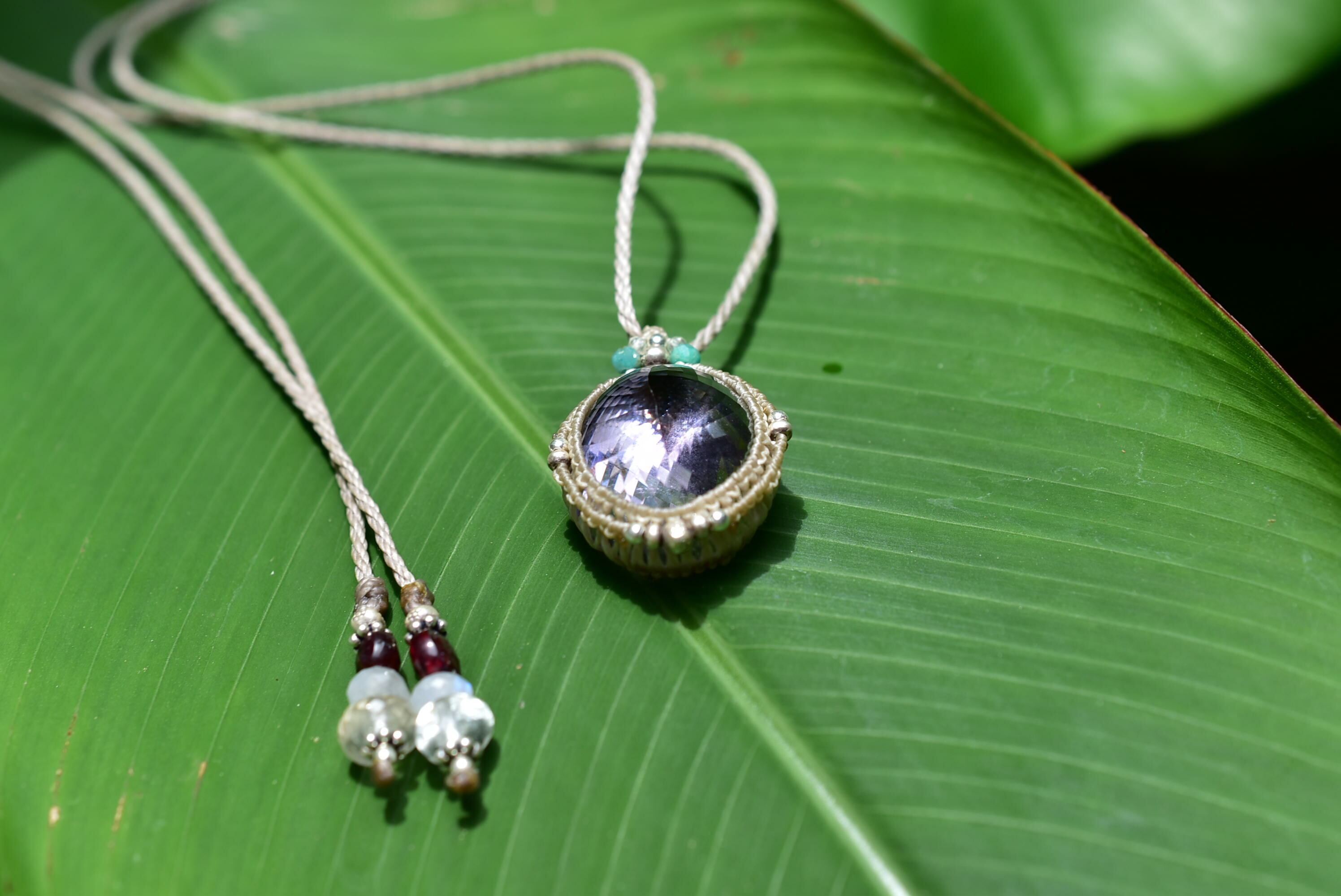 ◆このたびはヘンプ、ミルクココア色の蝋引き糸を使用しマクラメ編み装飾を施しました。
