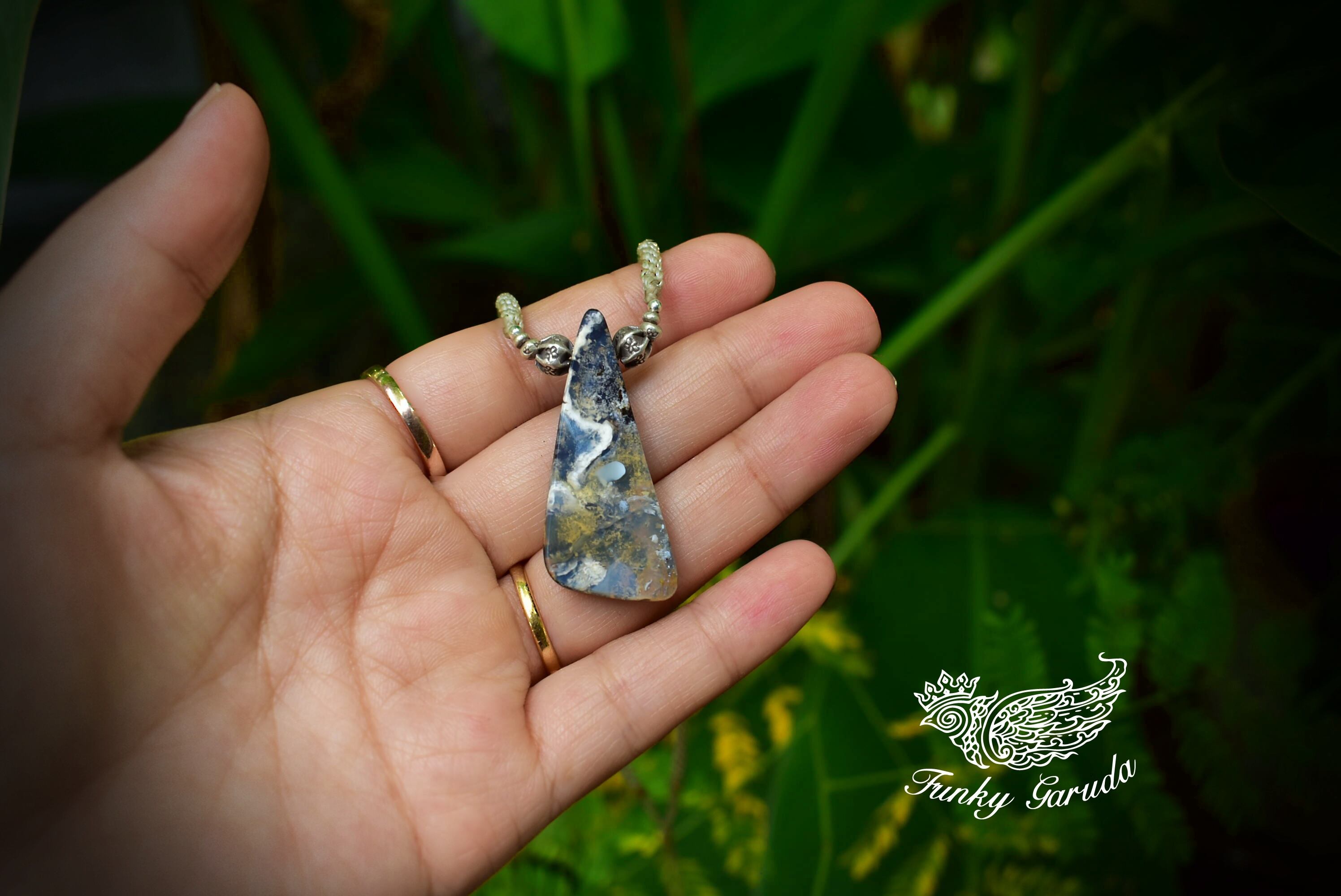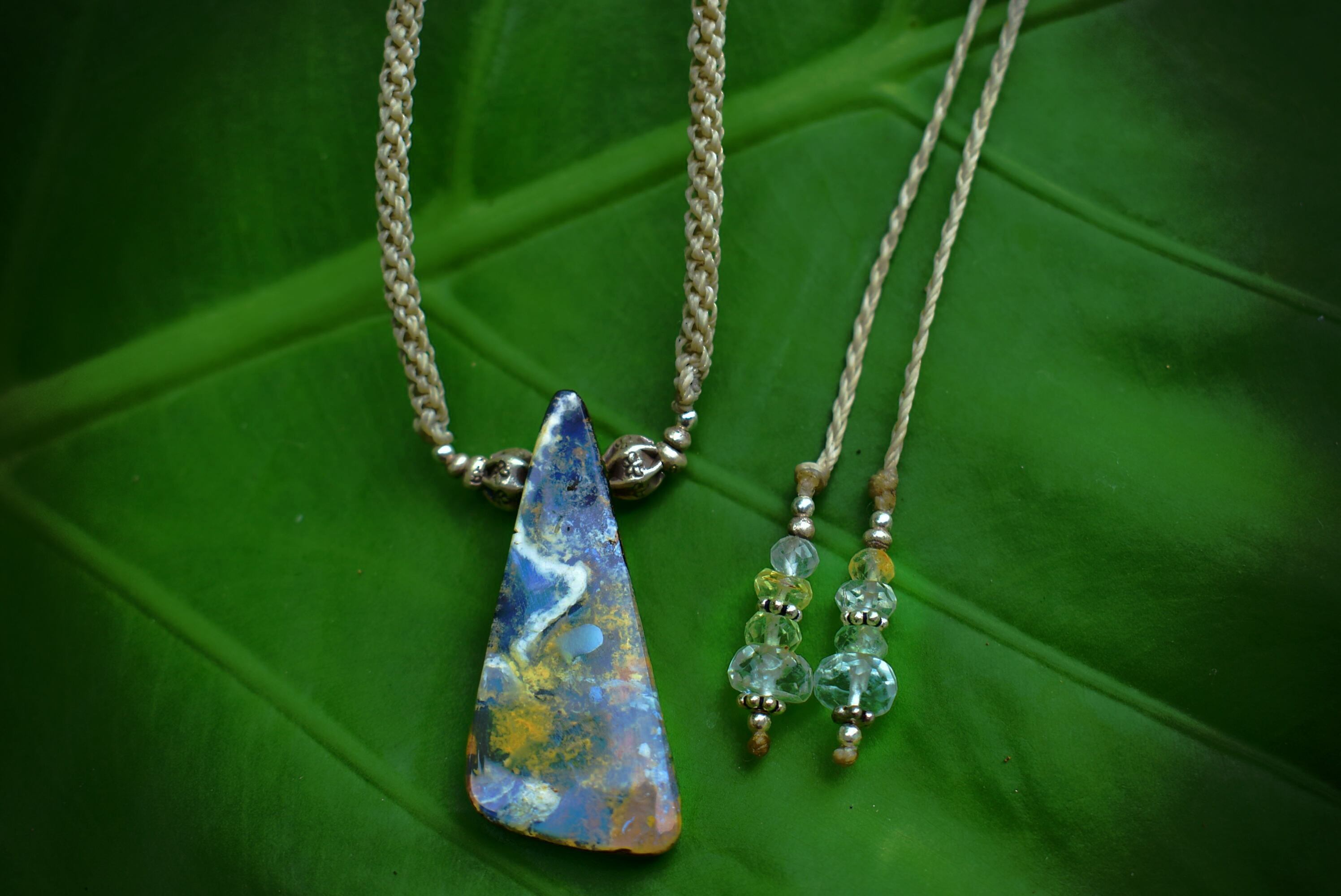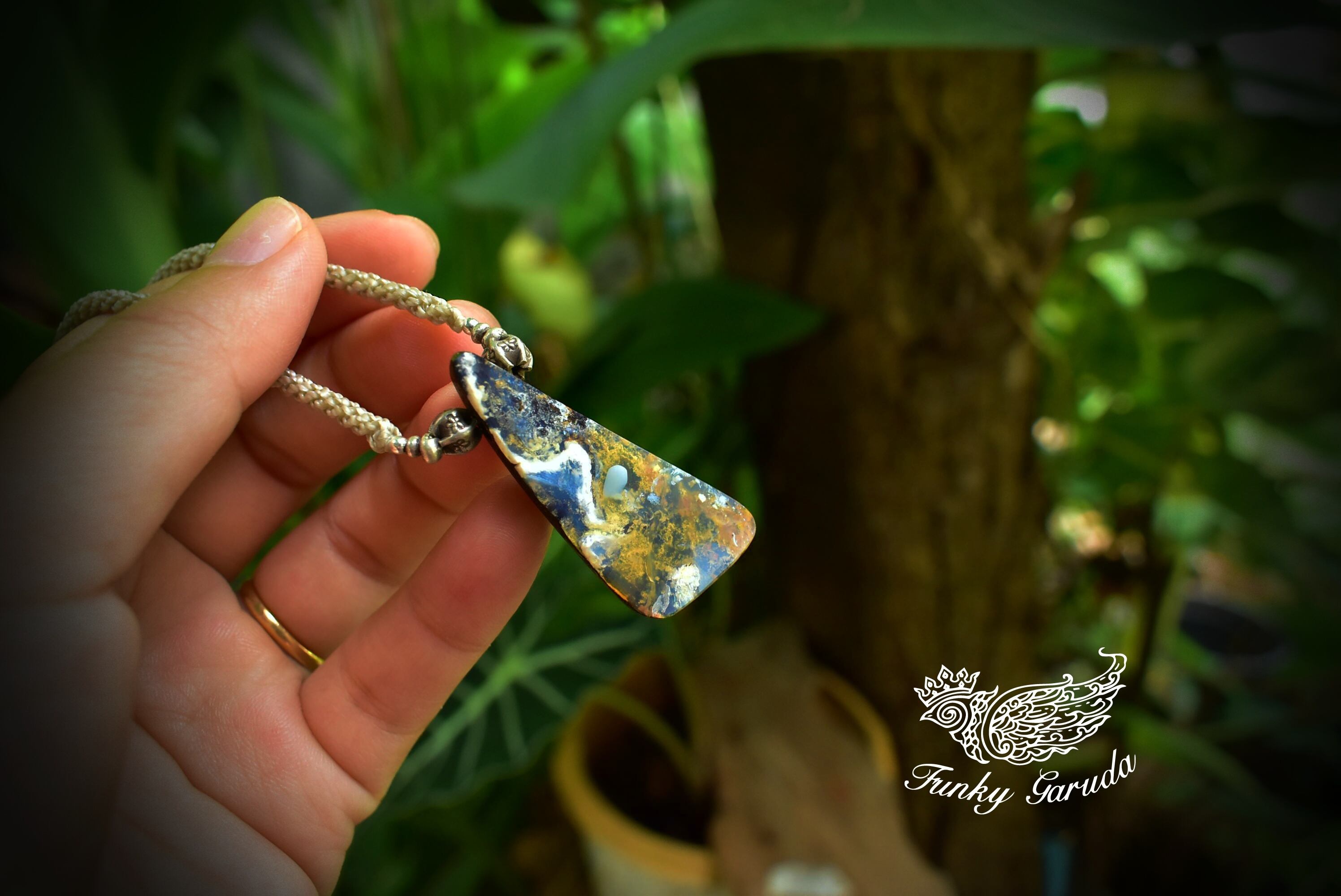 透明感ある石の世界の中にはまるで描かれたような不思議な世界が宿っている..とも言えるオーストラリア産のボルダーオパール。 自然から生まれたとしても大きさといい、不思議な世界観を持つこの石をシンプルに首元を着飾れるようにマクラメ編み装飾を施しました。
