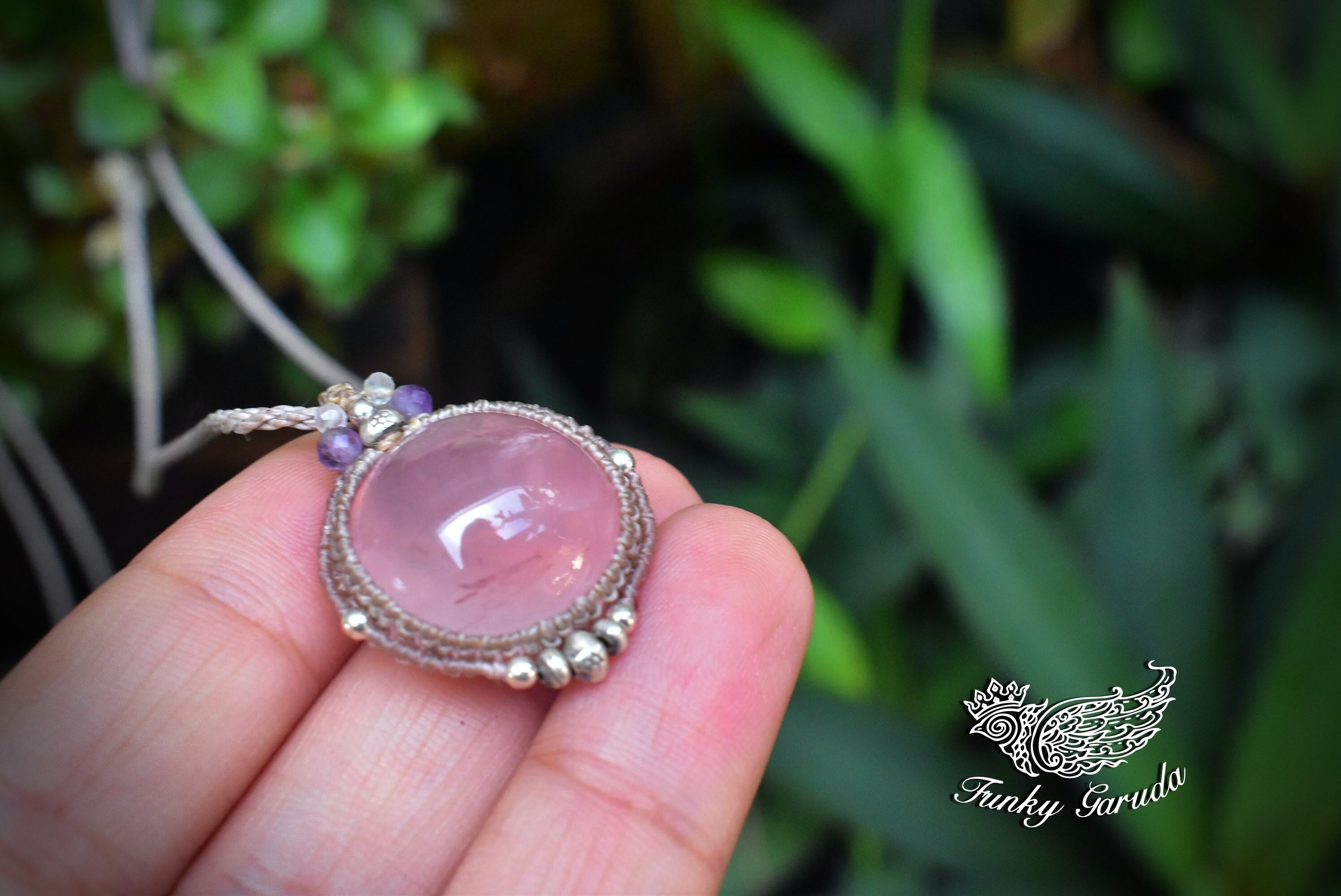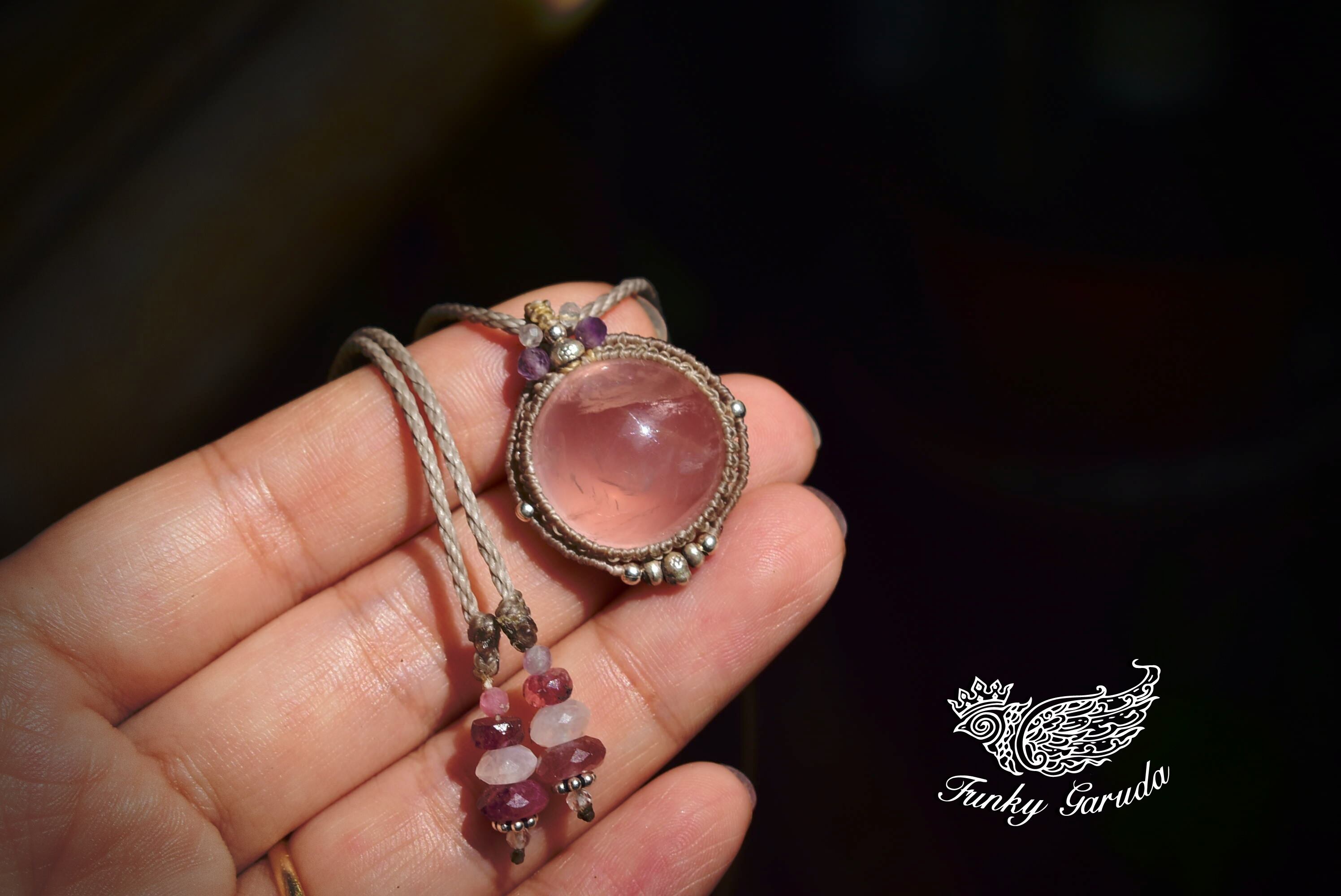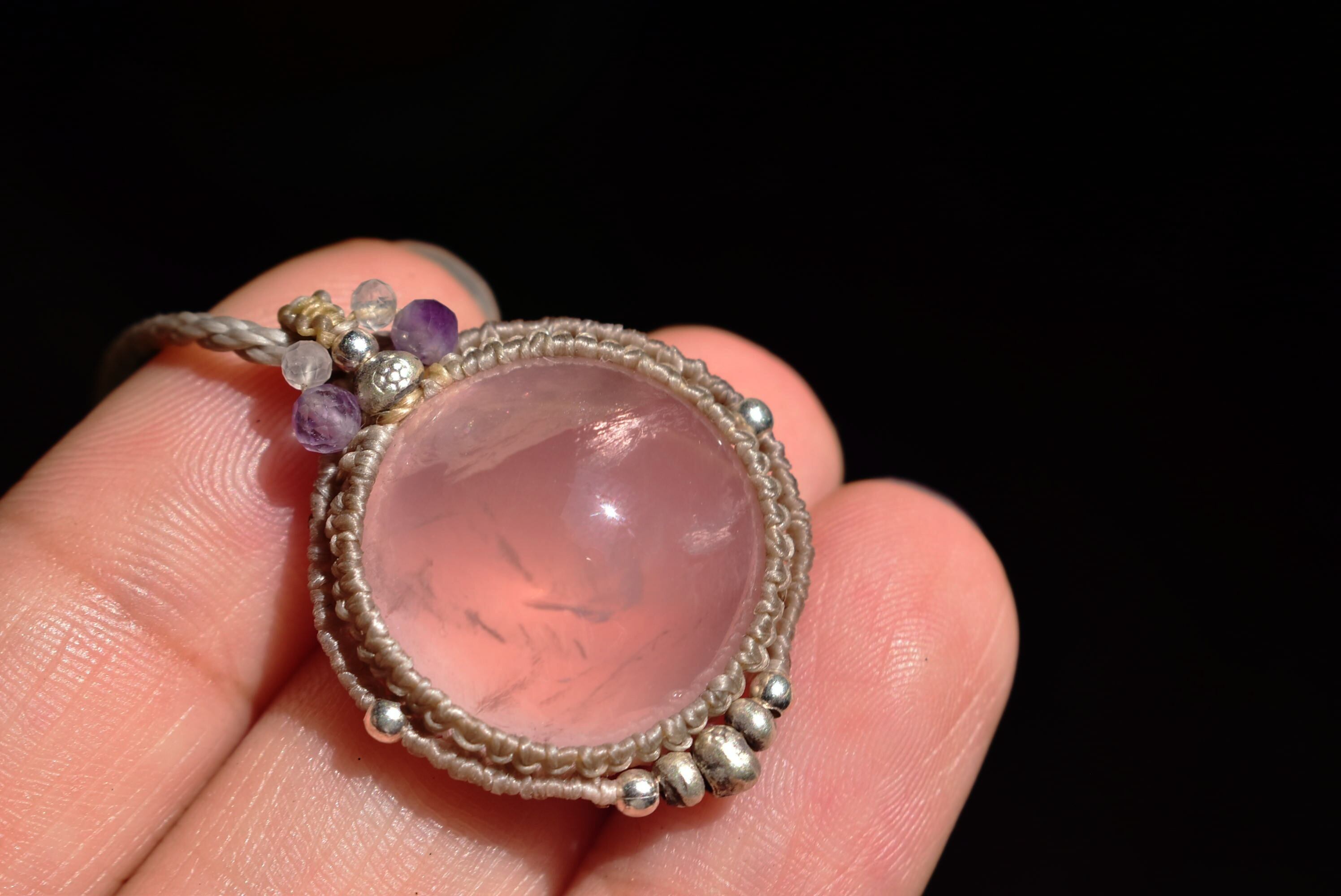 愛らしいピンクカラーはじつは透き通る色合いのもの。ツルツルとした光沢と輝きが小ぶりな石であるにもかかわらず、存在感を魅せてくれるスターローズクォーツをシンプルにマクラメ編みペンダントに仕上げました。