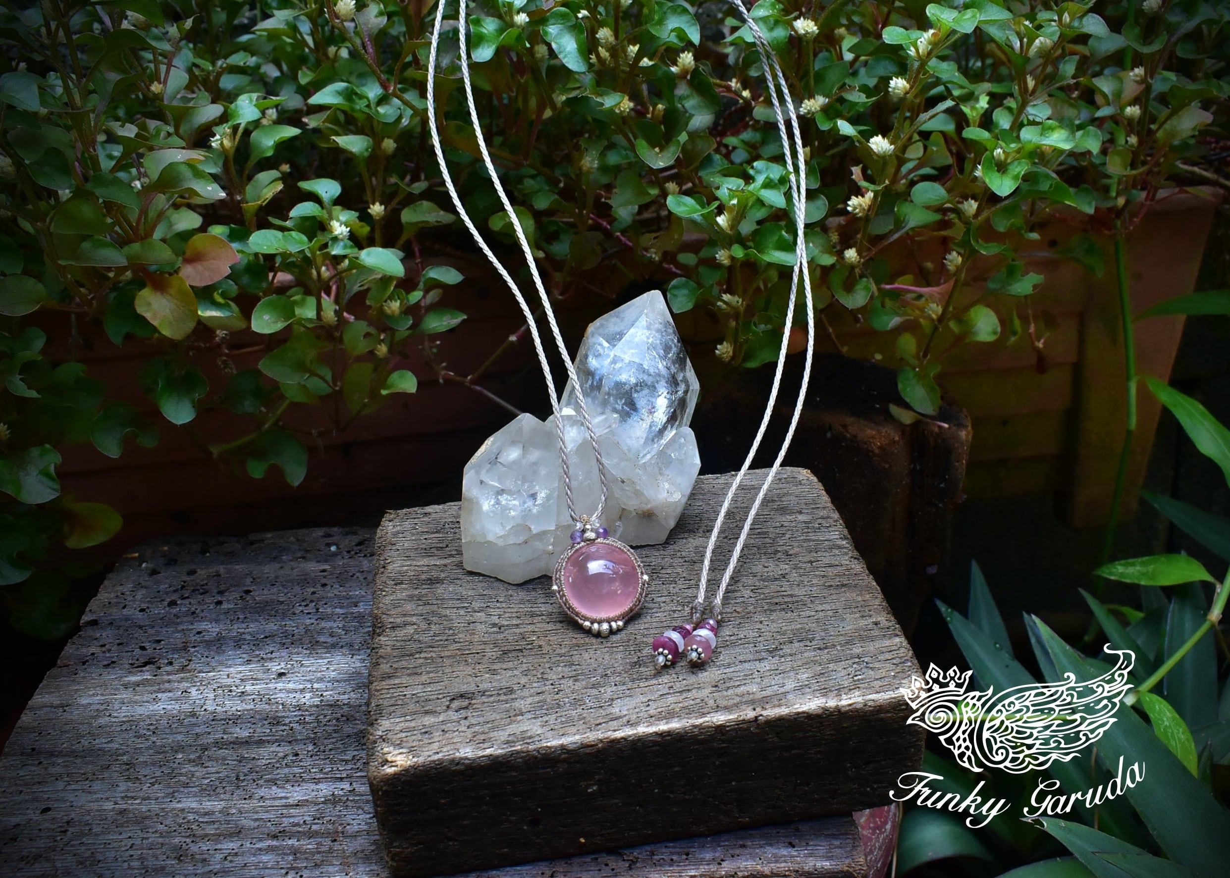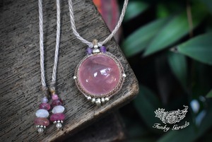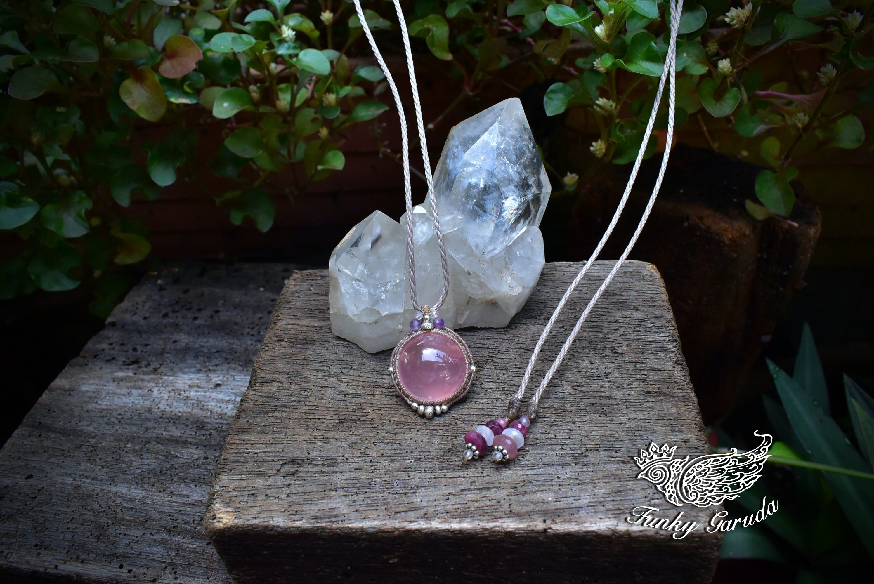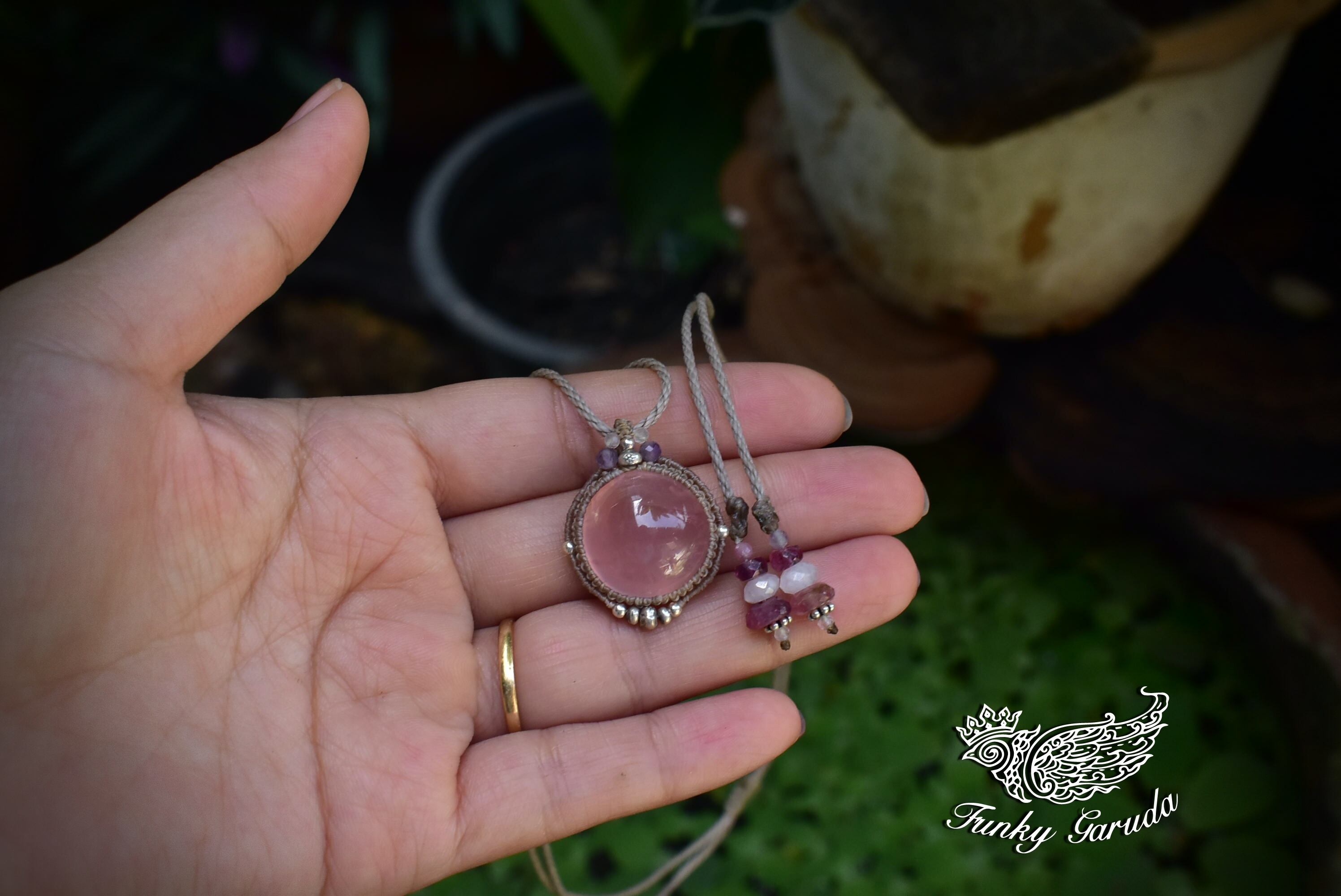 愛らしいピンクカラーはじつは透き通る色合いのもの。ツルツルとした光沢と輝きが小ぶりな石であるにもかかわらず、存在感を魅せてくれるスターローズクォーツをシンプルにマクラメ編みペンダントに仕上げました。