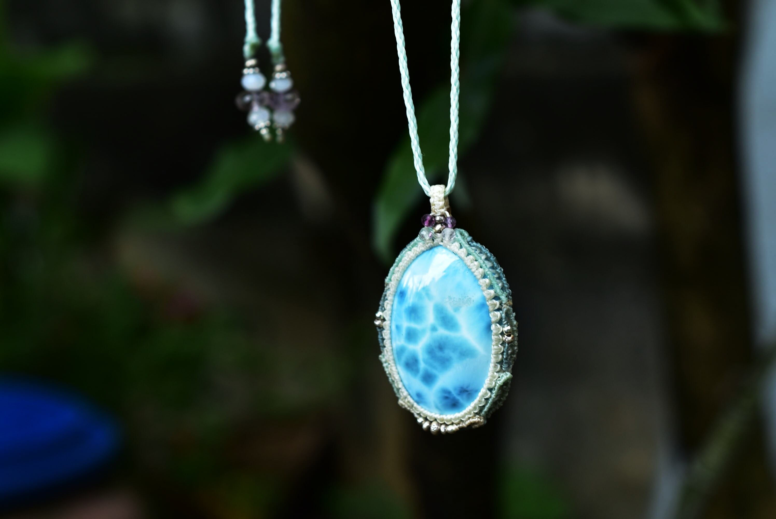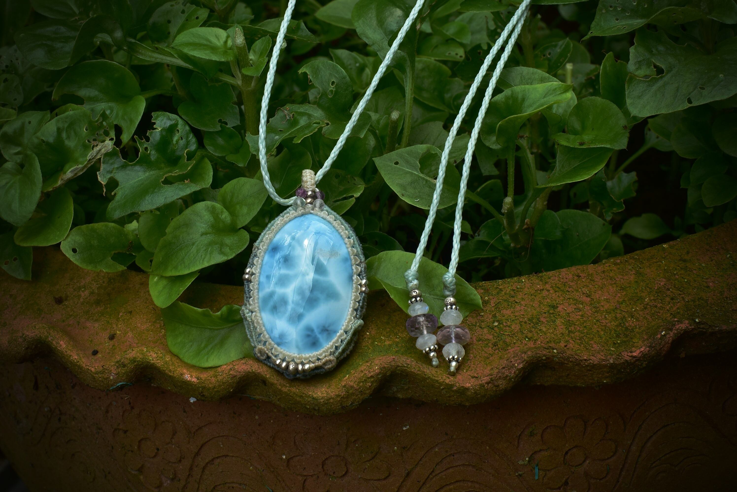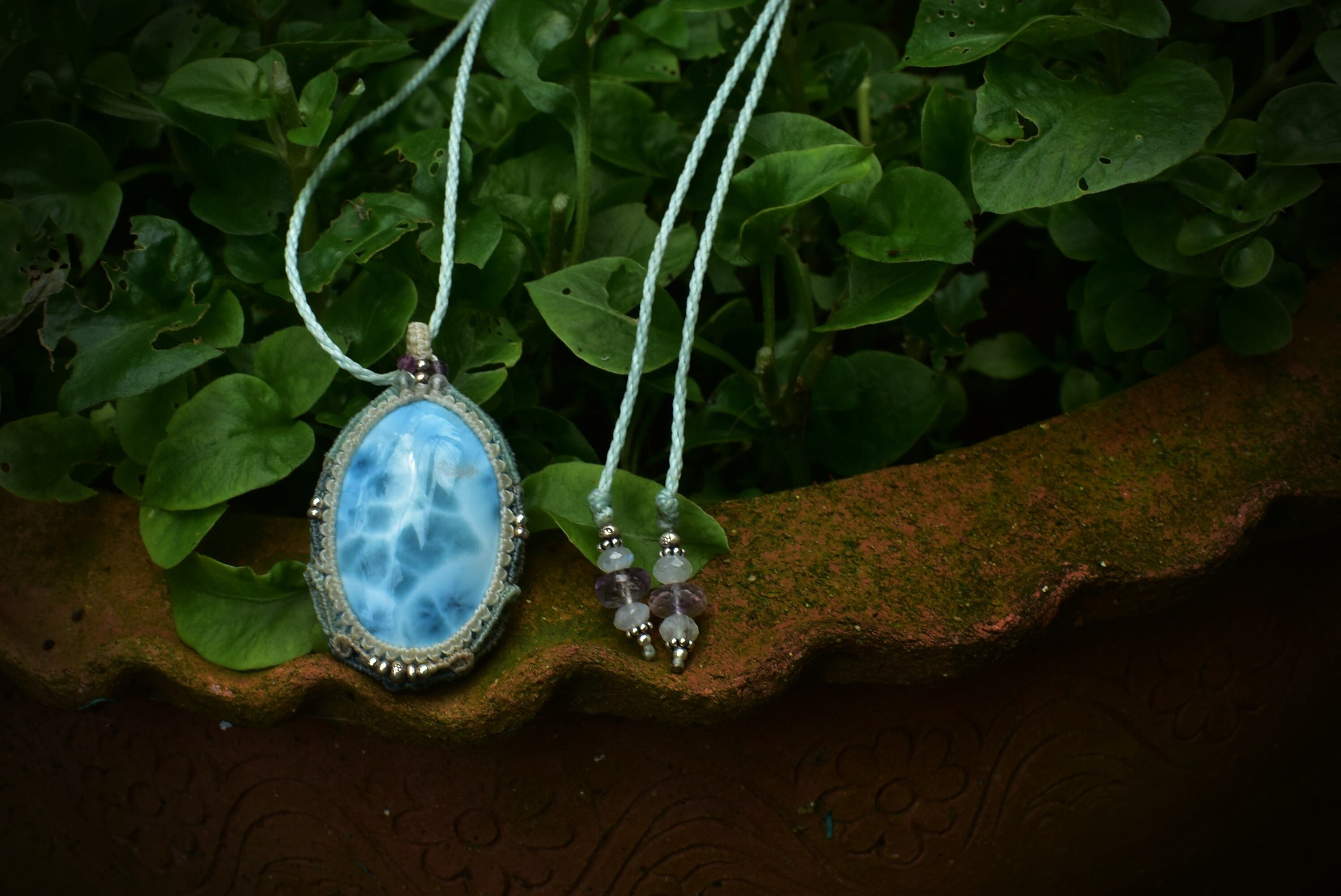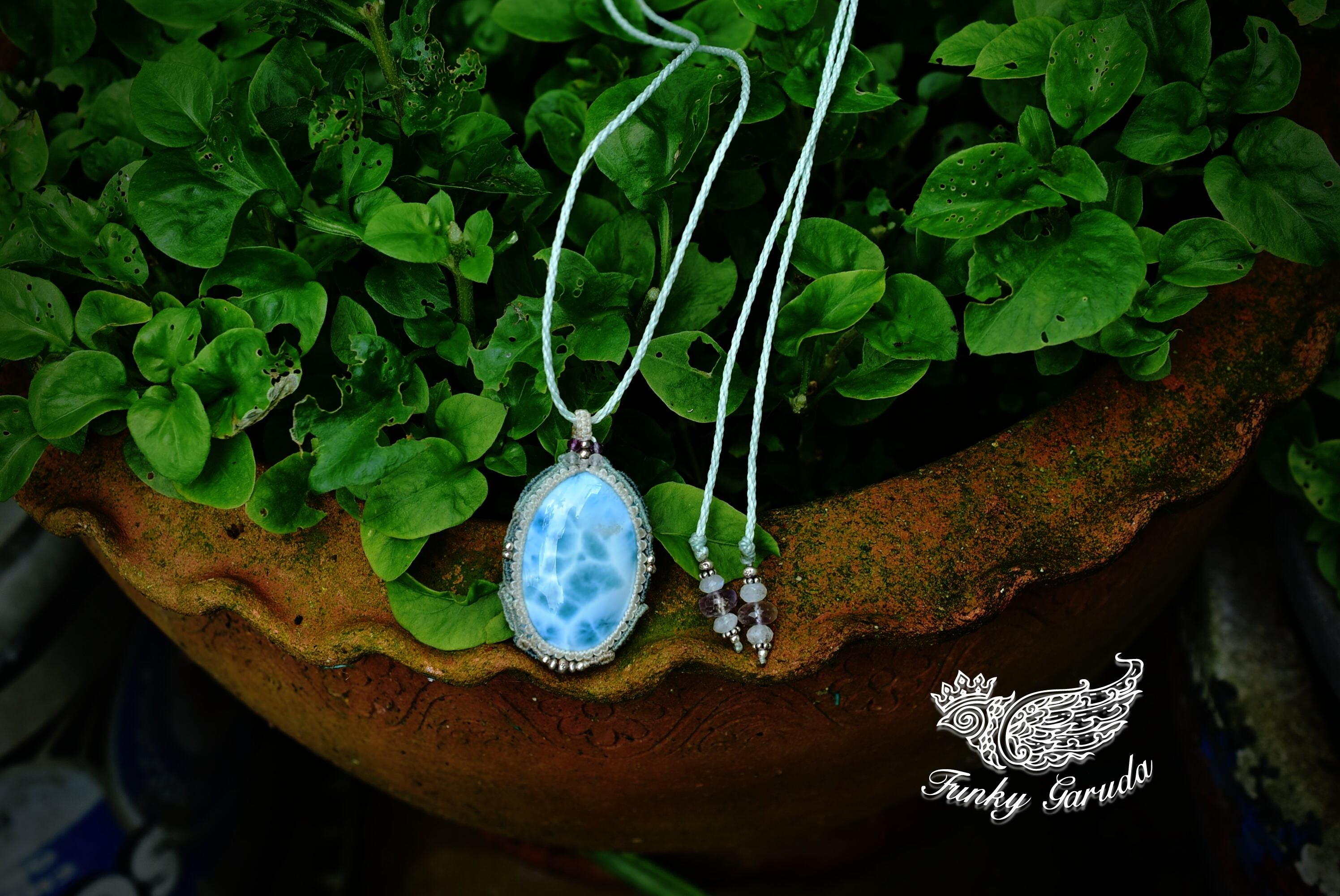 存在感ある中粒のさざ波模様のラリマーの周りをぐるっとツルが伸びる動きをマクラメ編み装飾にてイメージしたペンダントに仕上げました。この石のように愛と平和をイメージして創り出した世界観。優しいラリマーのイメージを後押しできると良いと想いました。