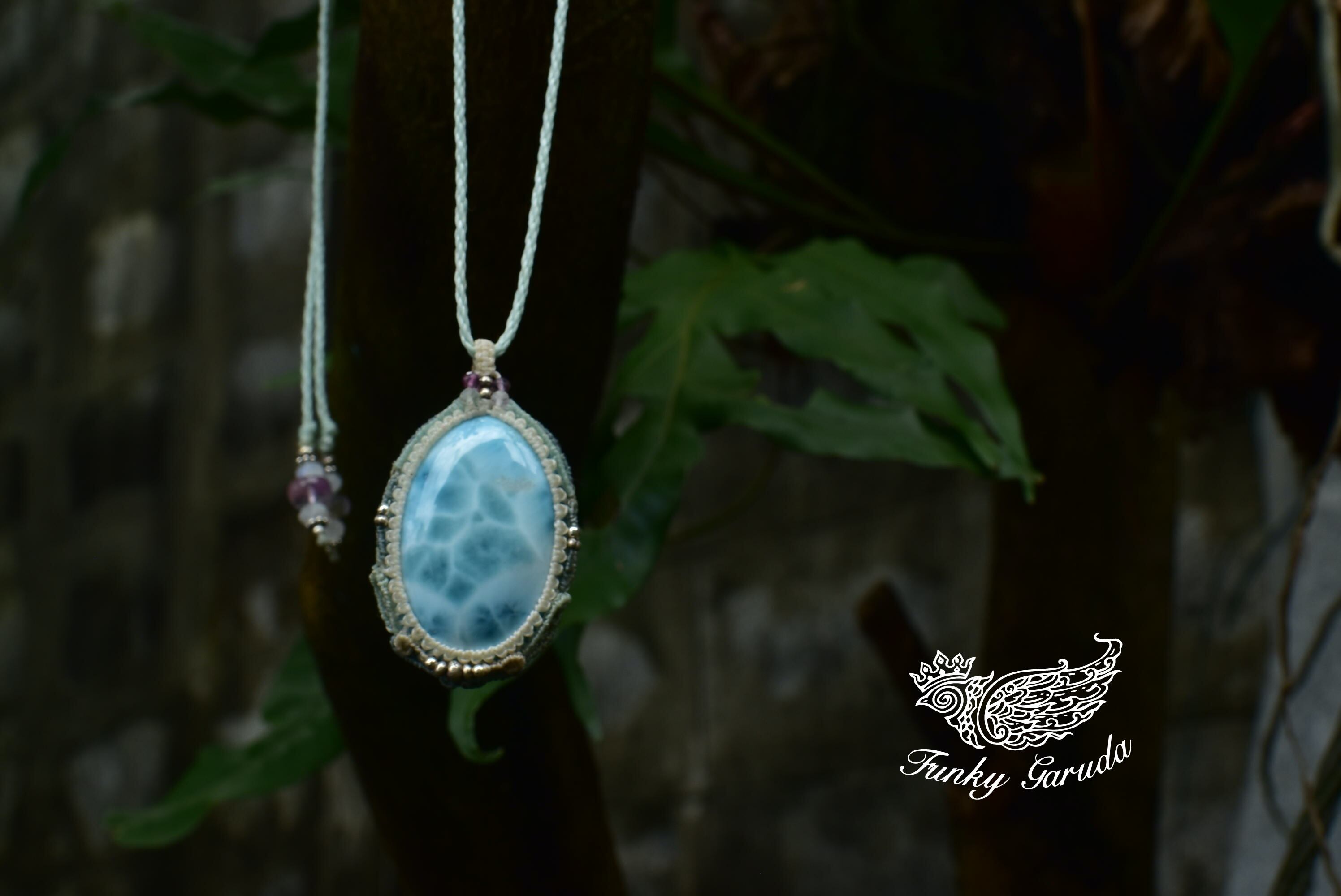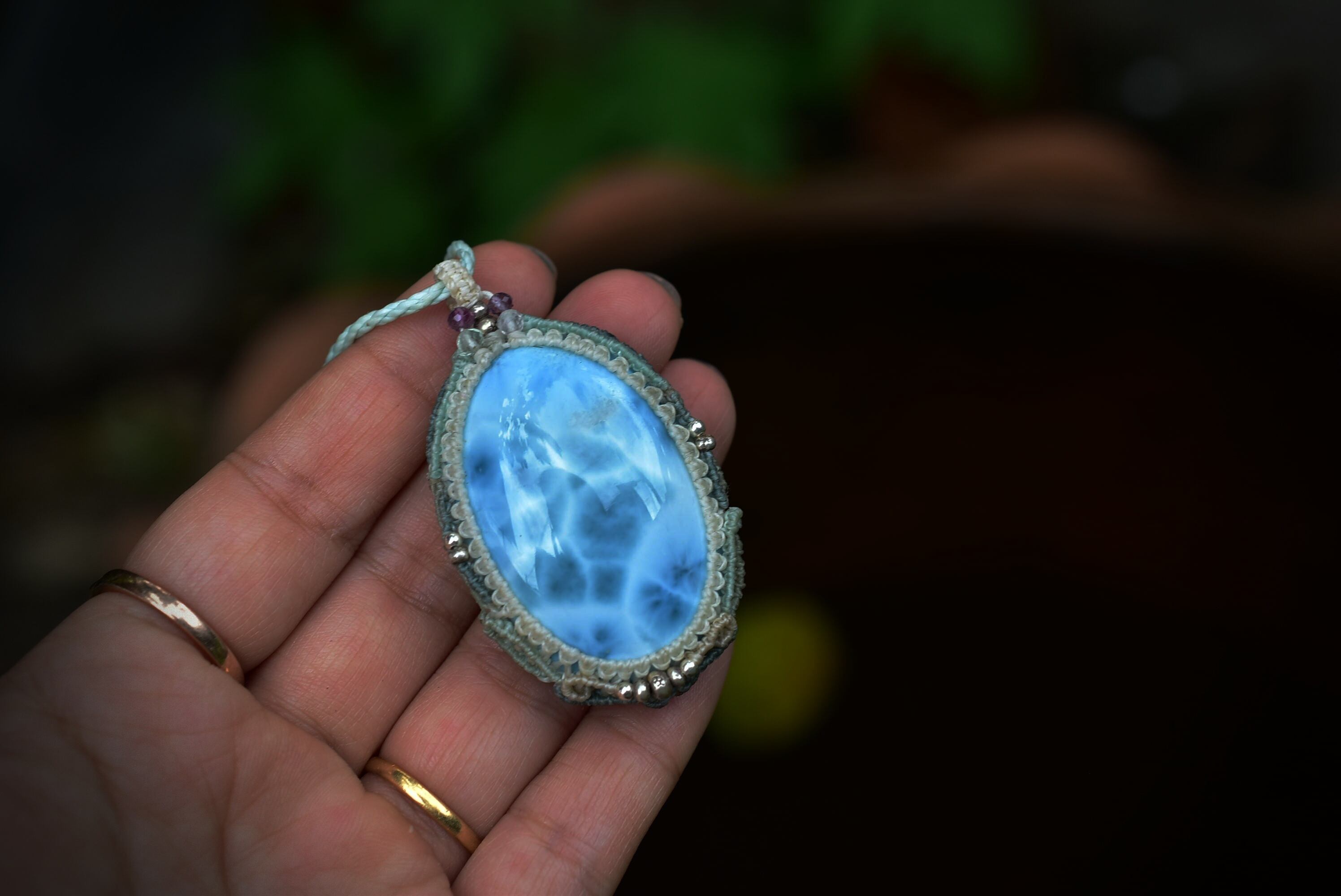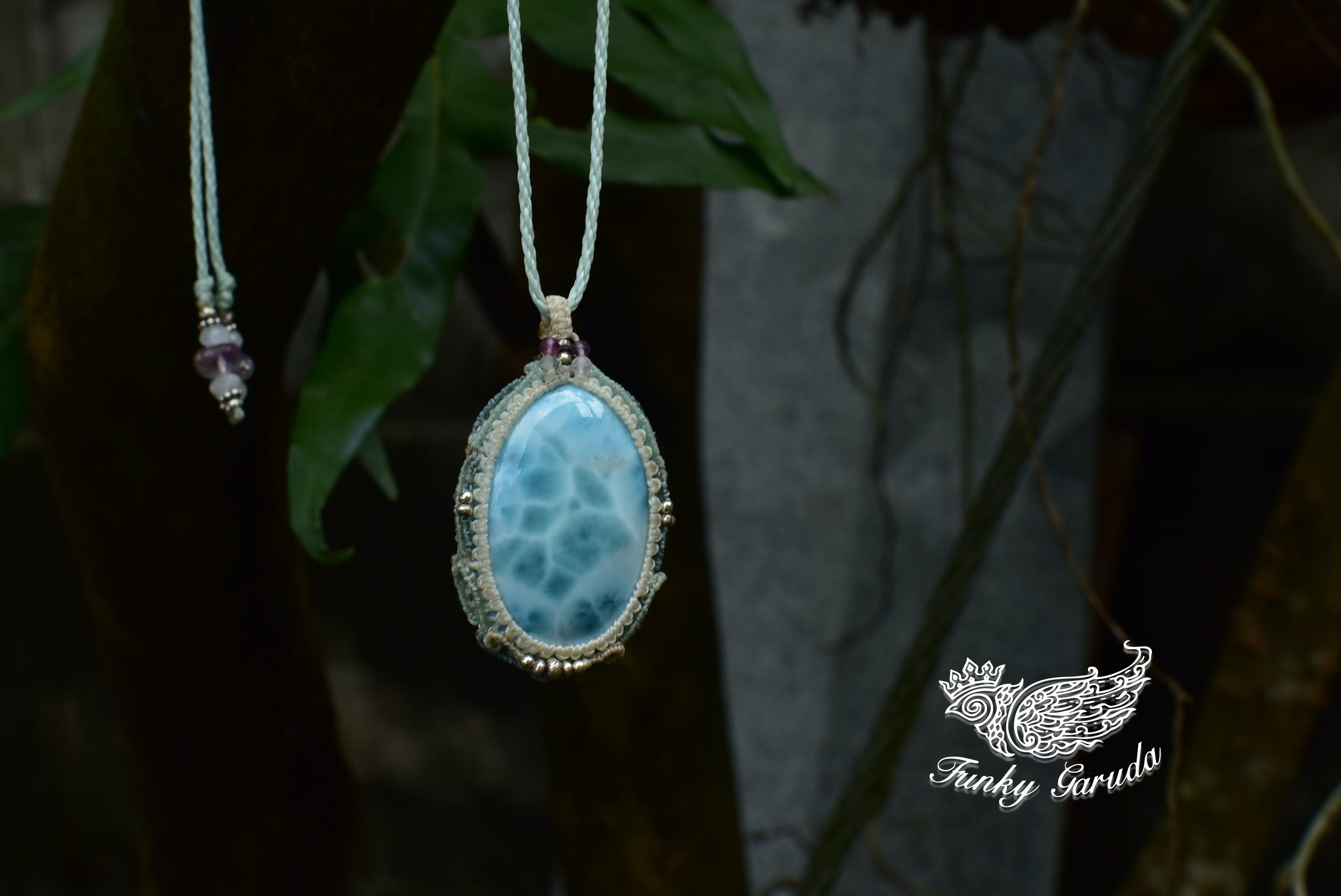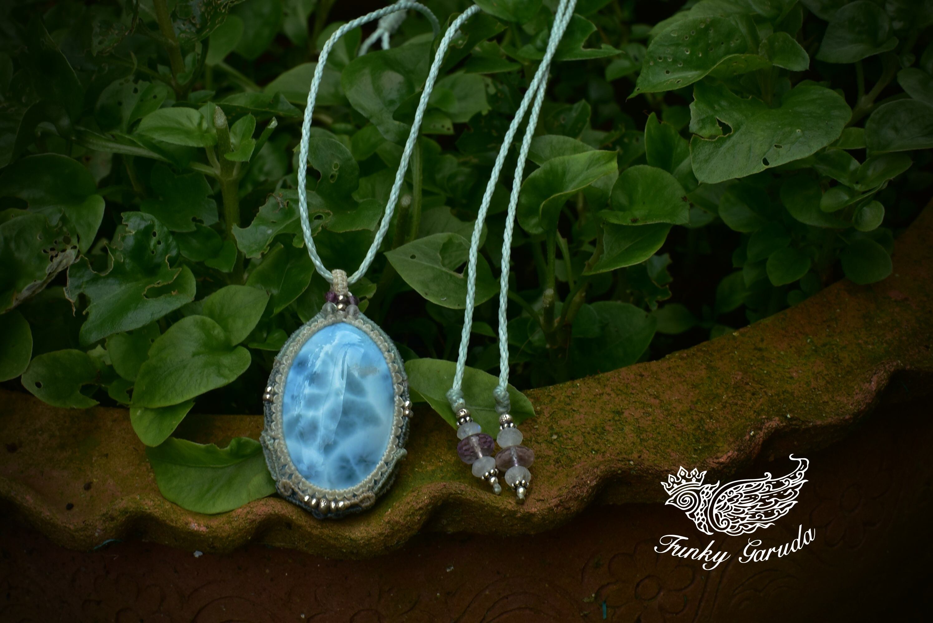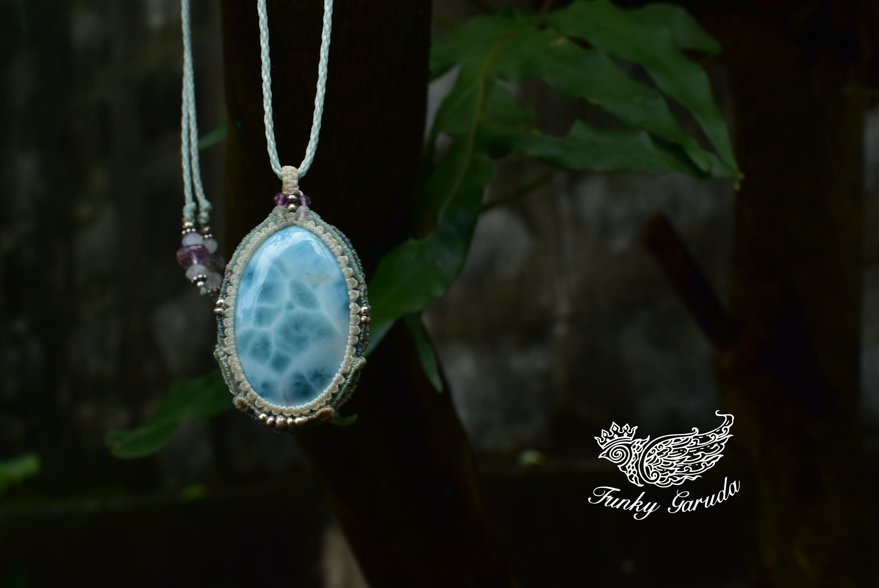 存在感ある中粒のさざ波模様のラリマーの周りをぐるっとツルが伸びる動きをマクラメ編み装飾にてイメージしたペンダントに仕上げました。この石のように愛と平和をイメージして創り出した世界観。優しいラリマーのイメージを後押しできると良いと想いました。