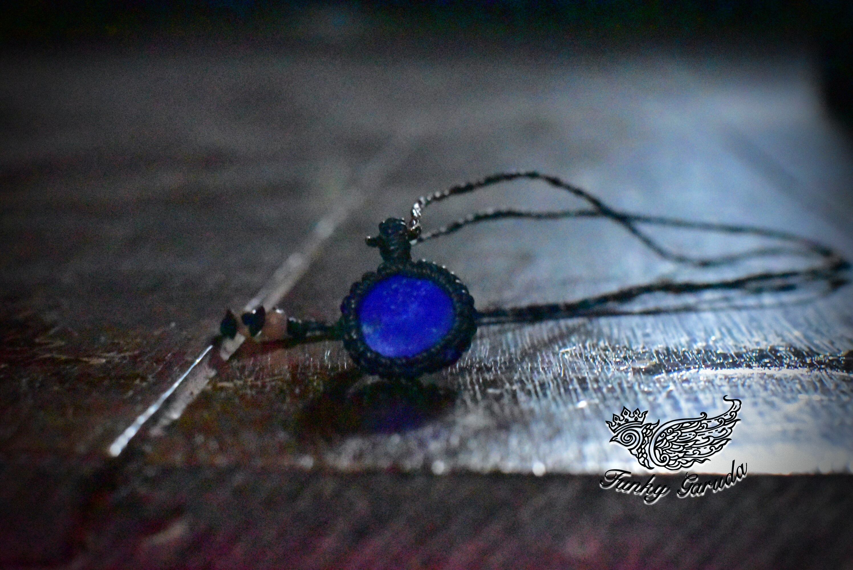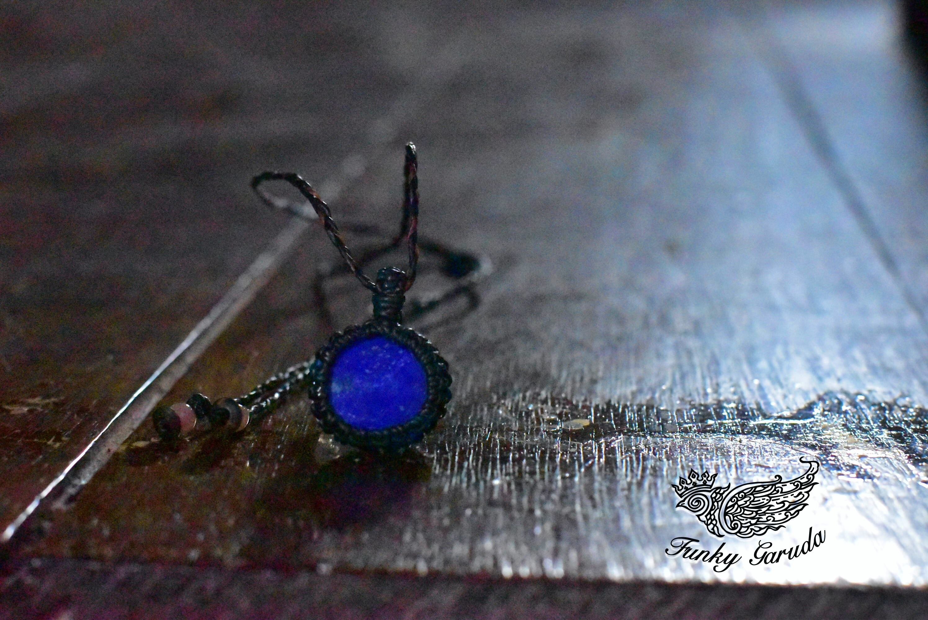 ぼつんとブルーが鮮やかなラピスラズリのタンブルをマクラメ編みにて巻き込んだシンプルなペンダントネックレス。主張しすぎない大きさでもあるもの。