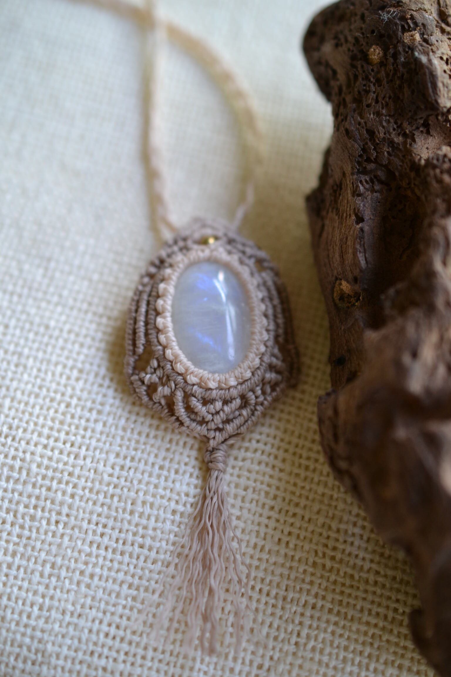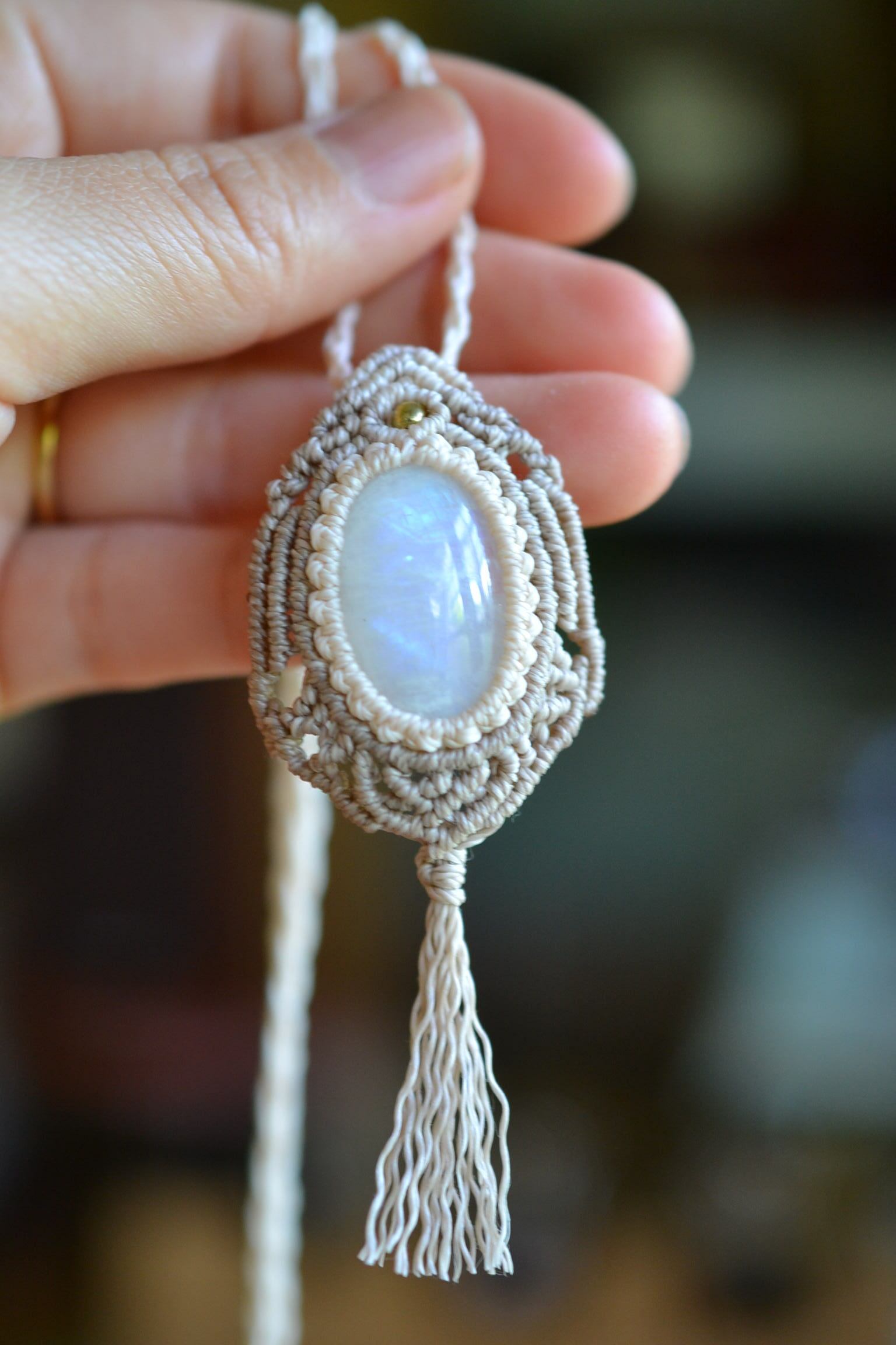 ネックレスを装着したときに、背守りとなる紐の先のエンド部分にはミルキークォーツビーズと真鍮ビーズも一緒に編み込んでマクラメ編み装飾を施しました。