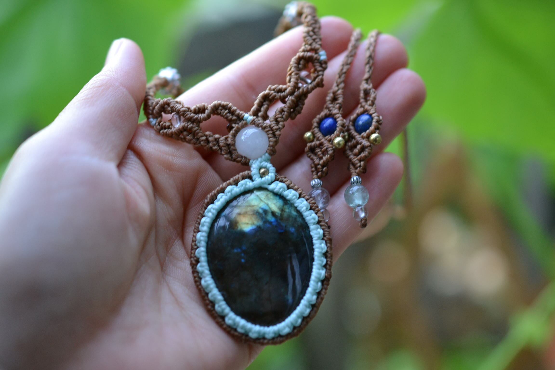 ネックレスを装着したときに、背守りとなる紐の先のエンド部分にはフローライトビーズ、ラピスラズリビーズ、スモーキークォーツビーズと真鍮ビーズも一緒に編み込んでマクラメ編み装飾を施しました。
