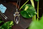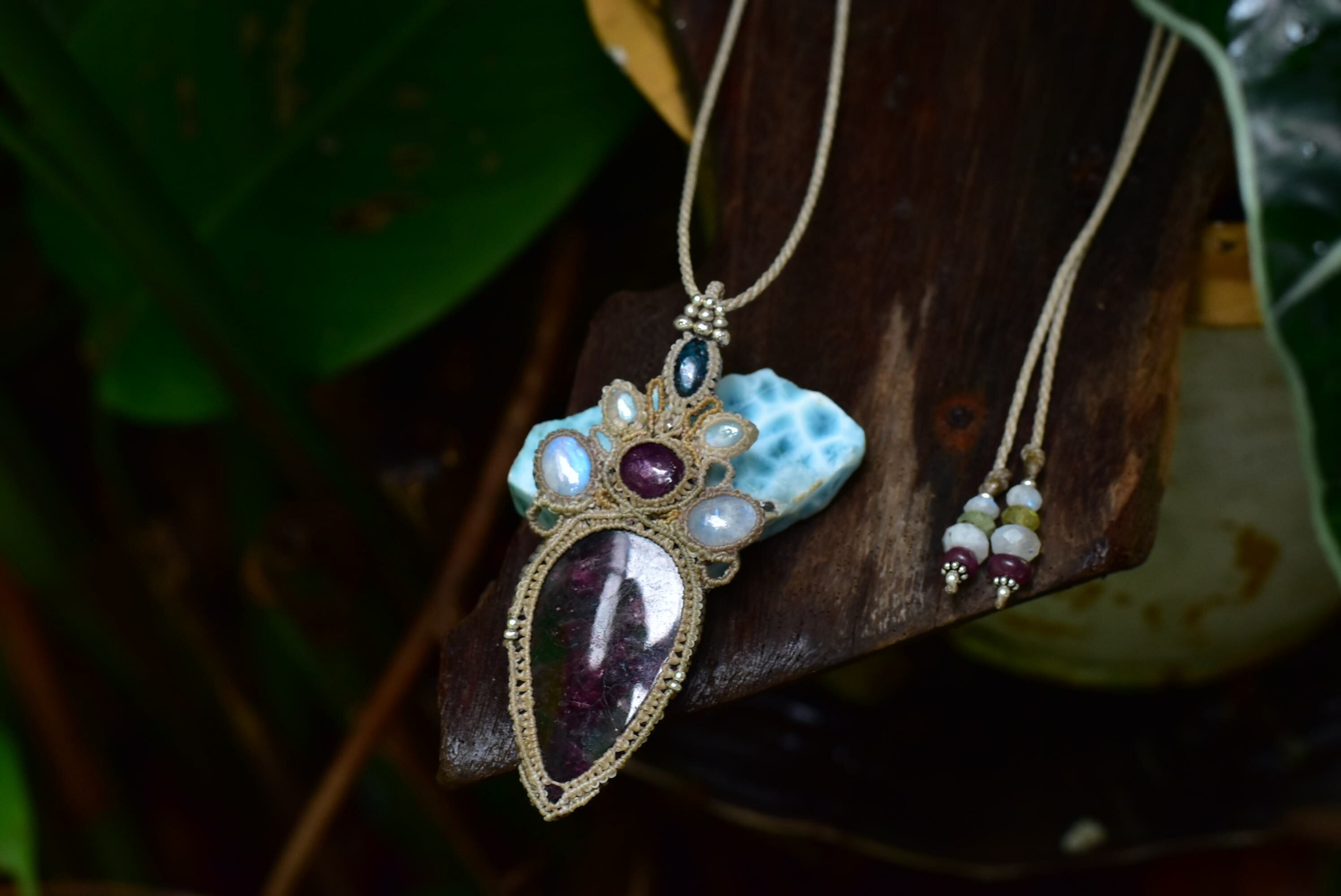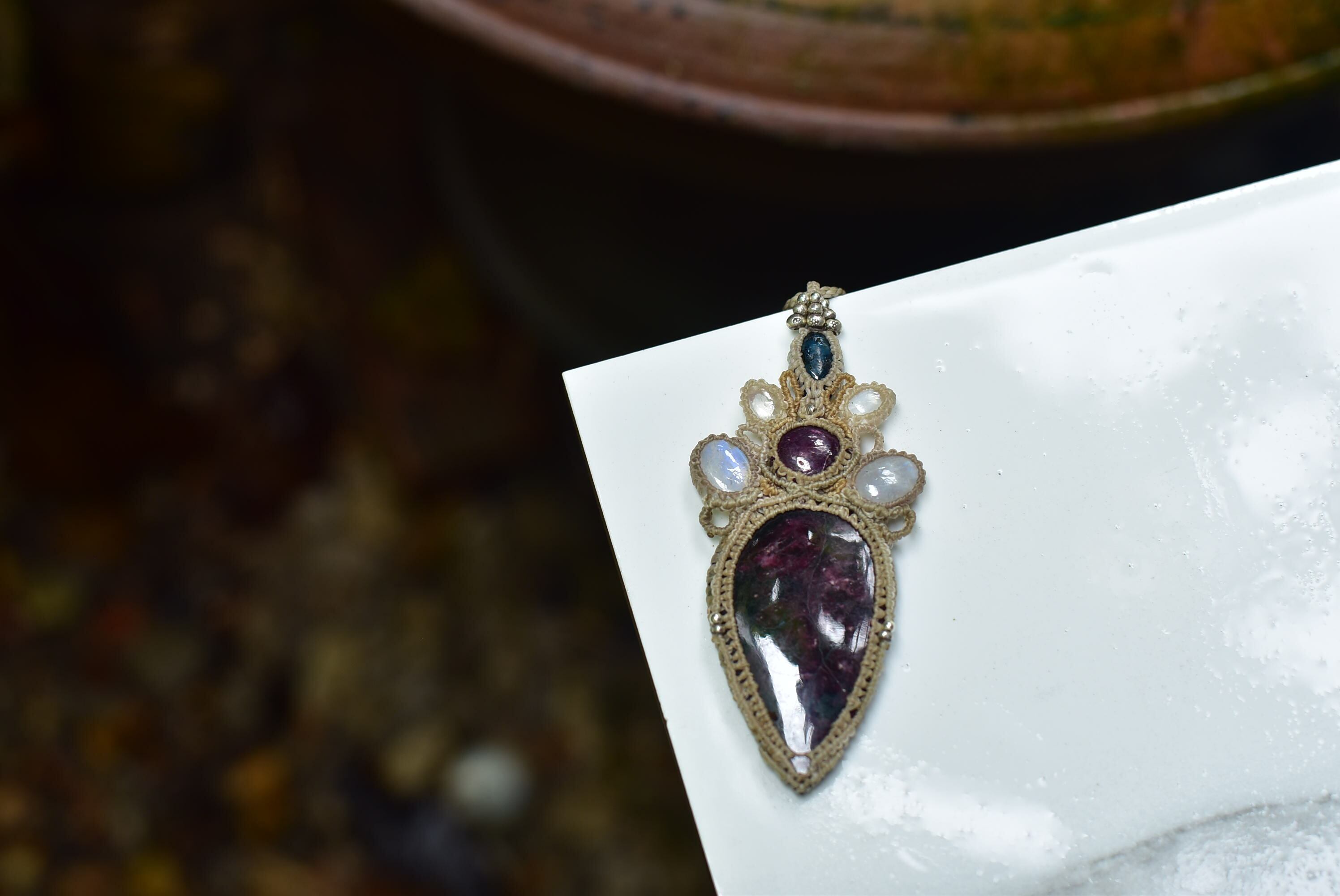 ボルダーバイオレットカラーが妖しく光る高品質ユーディアライトを土台に羽ばたく妖精のようなモチーフをヒントに仕上げたペンダント。真ん中にきらりと光るスタールビーは。そしてトップにはブルーグリーンカイヤナイトを使用して咲き乱れるジェムストーンを表現しました。それぞれ輝く小さなムーンストーンの輝きも愛らしいもの。