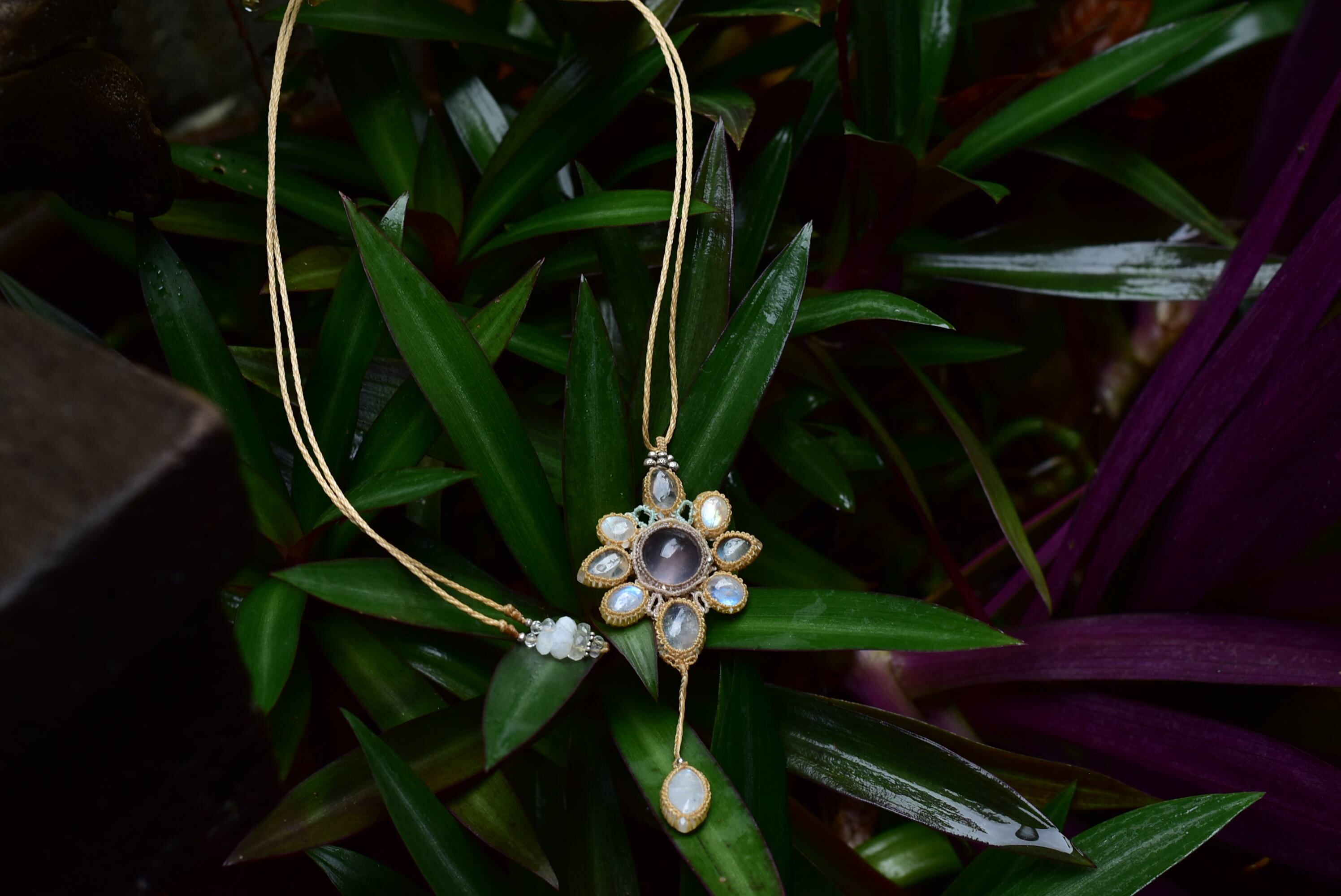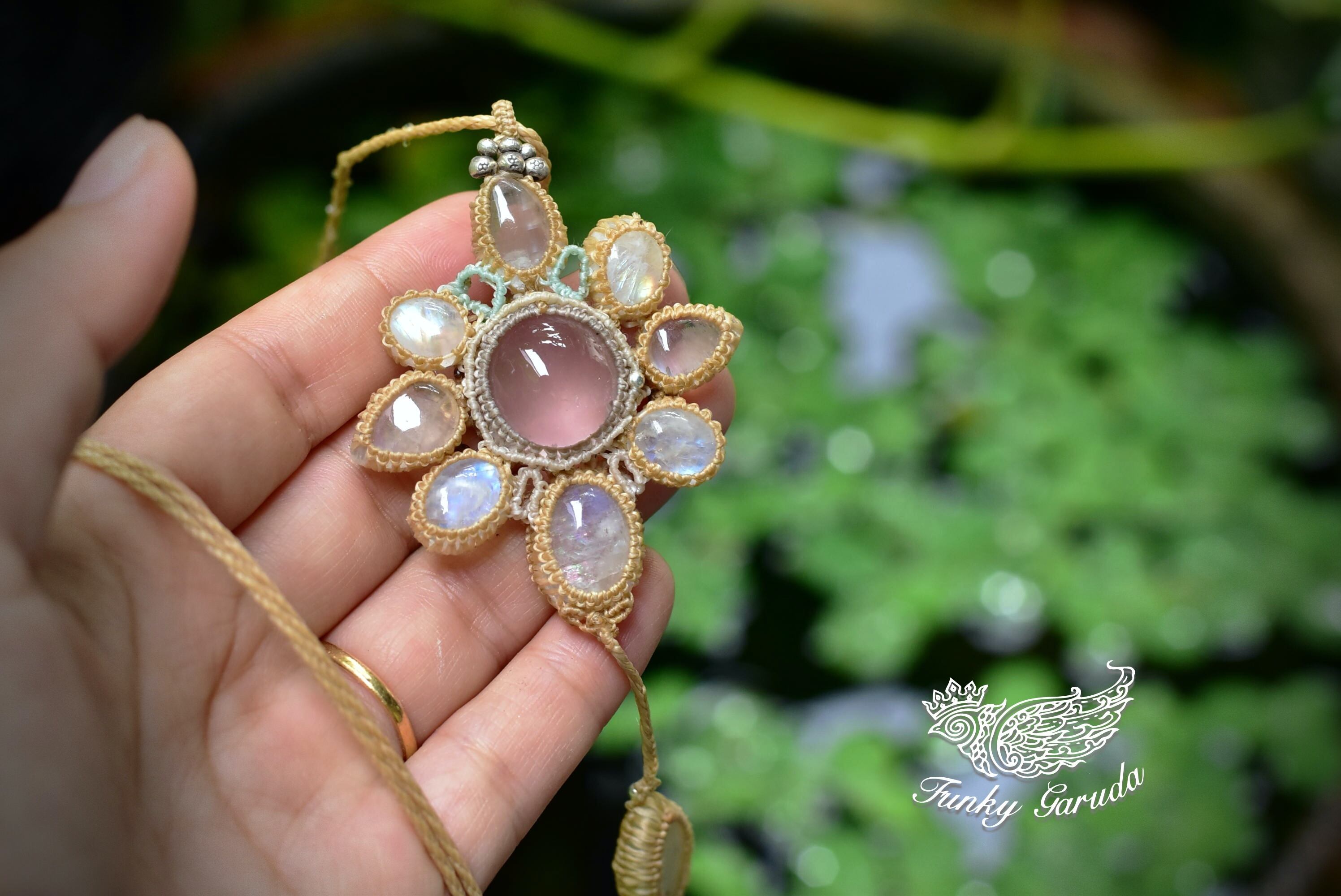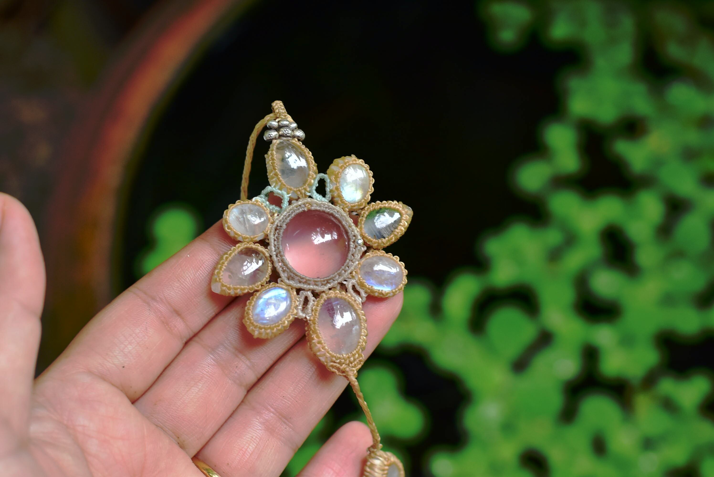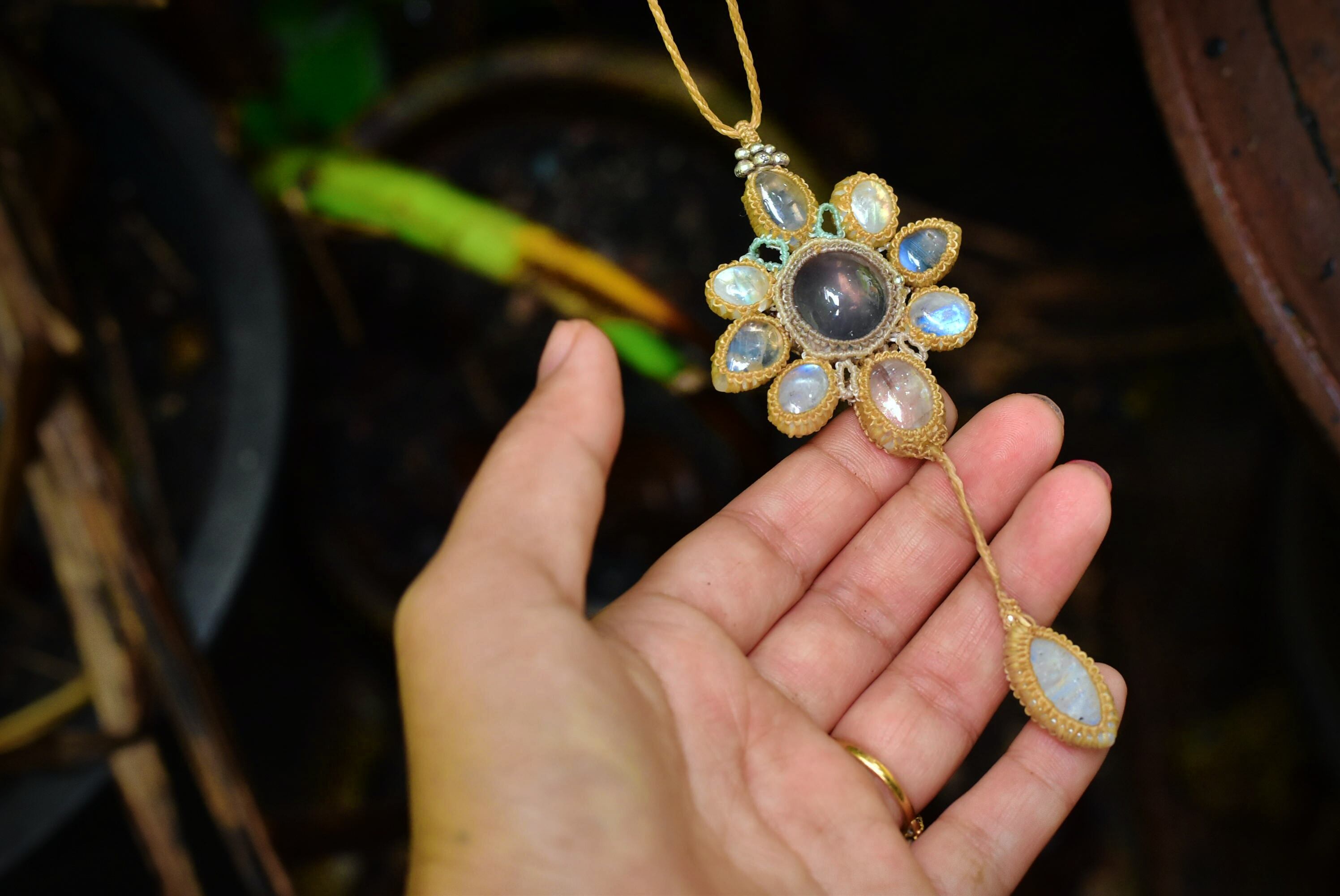 画像からは見てとることができないのですが、その他にもムーンストーンの中には虹が隠れていたり。ひと粒ひと粒を楽しめるレインボームーンストーンを花びらに、どことなく切ないお花ペンダントをマクラメ編み装飾して仕上げました。