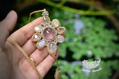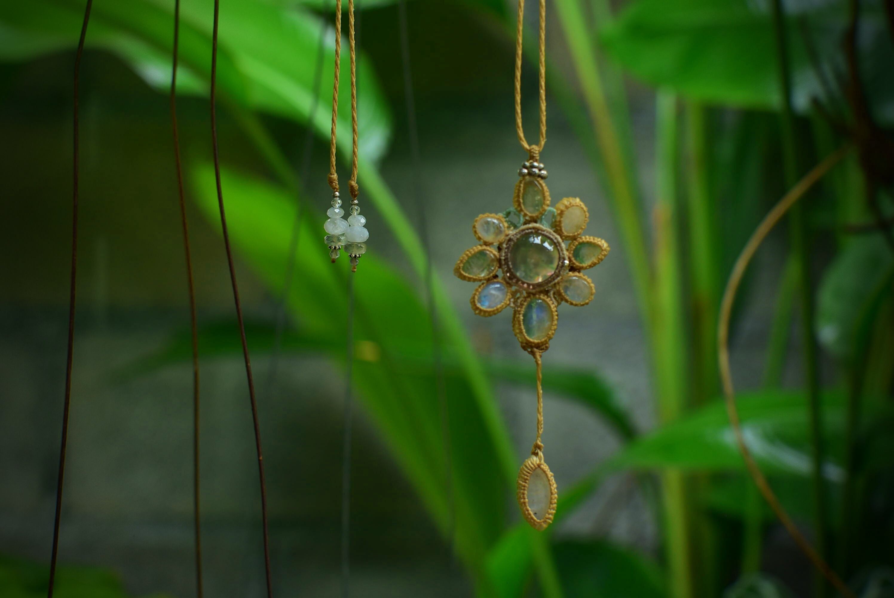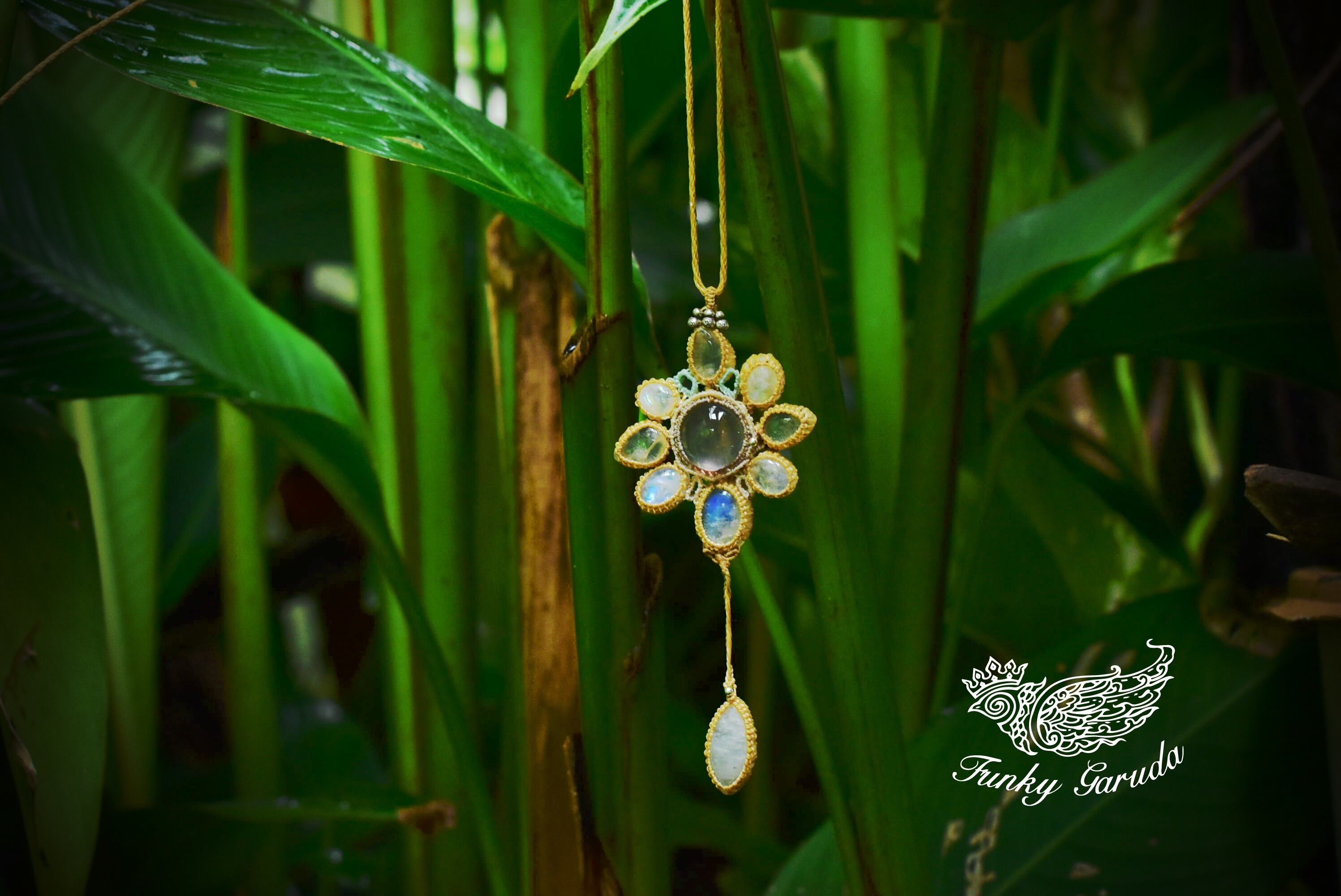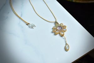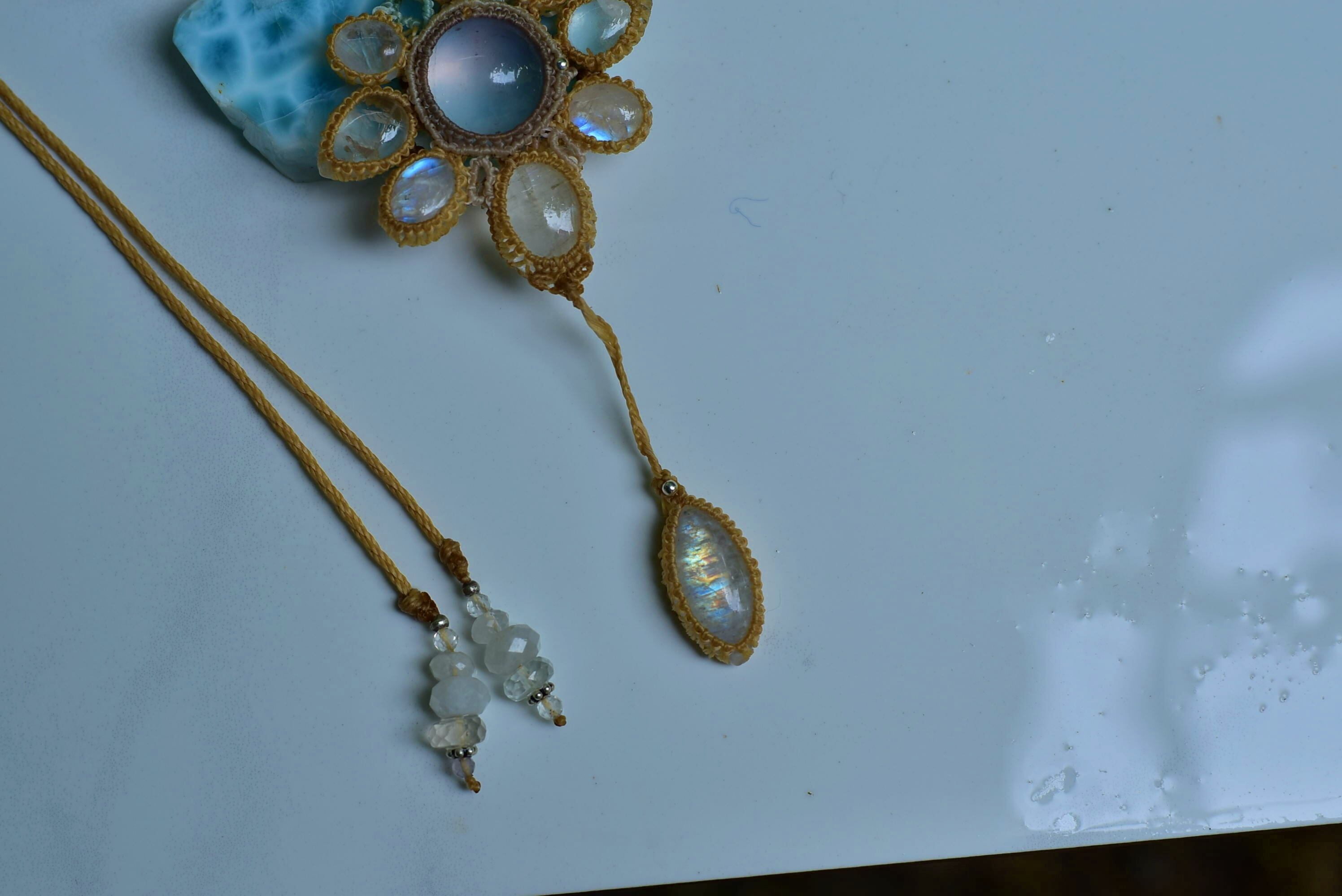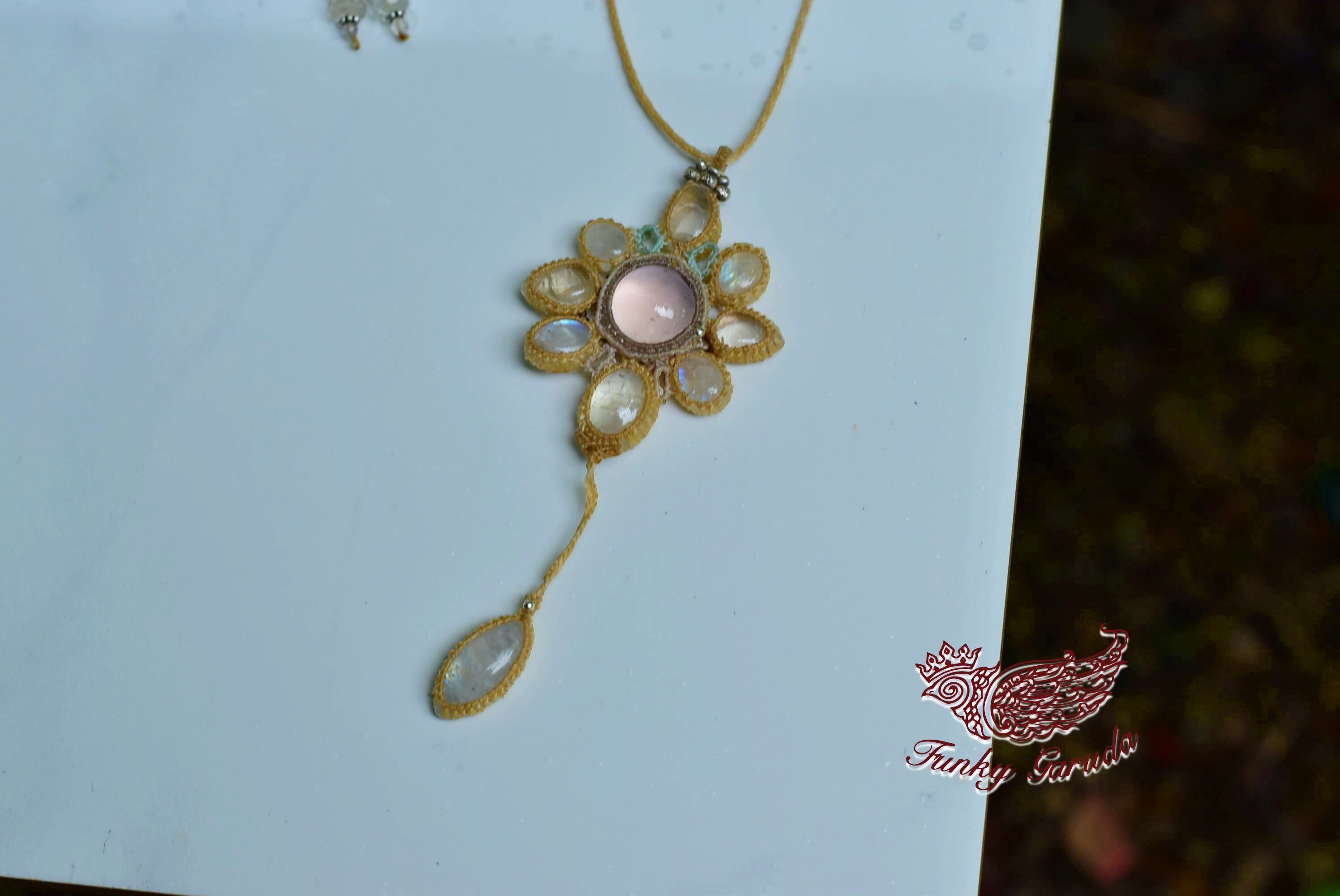 画像からは見てとることができないのですが、その他にもムーンストーンの中には虹が隠れていたり。ひと粒ひと粒を楽しめるレインボームーンストーンを花びらに、どことなく切ないお花ペンダントをマクラメ編み装飾して仕上げました。