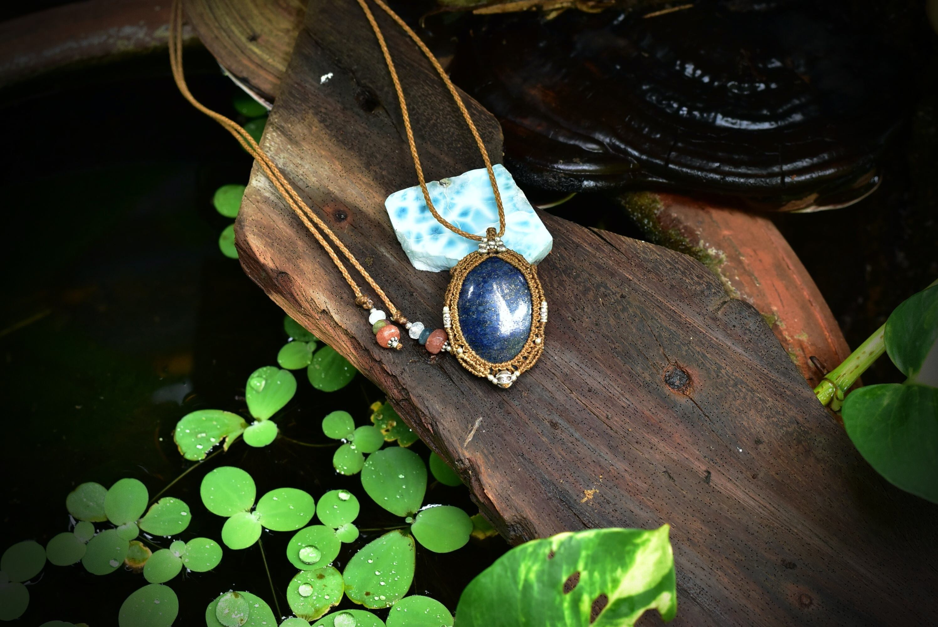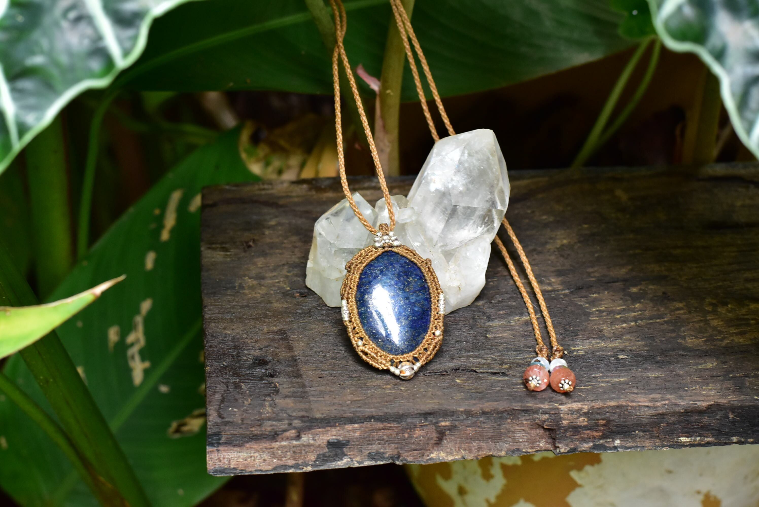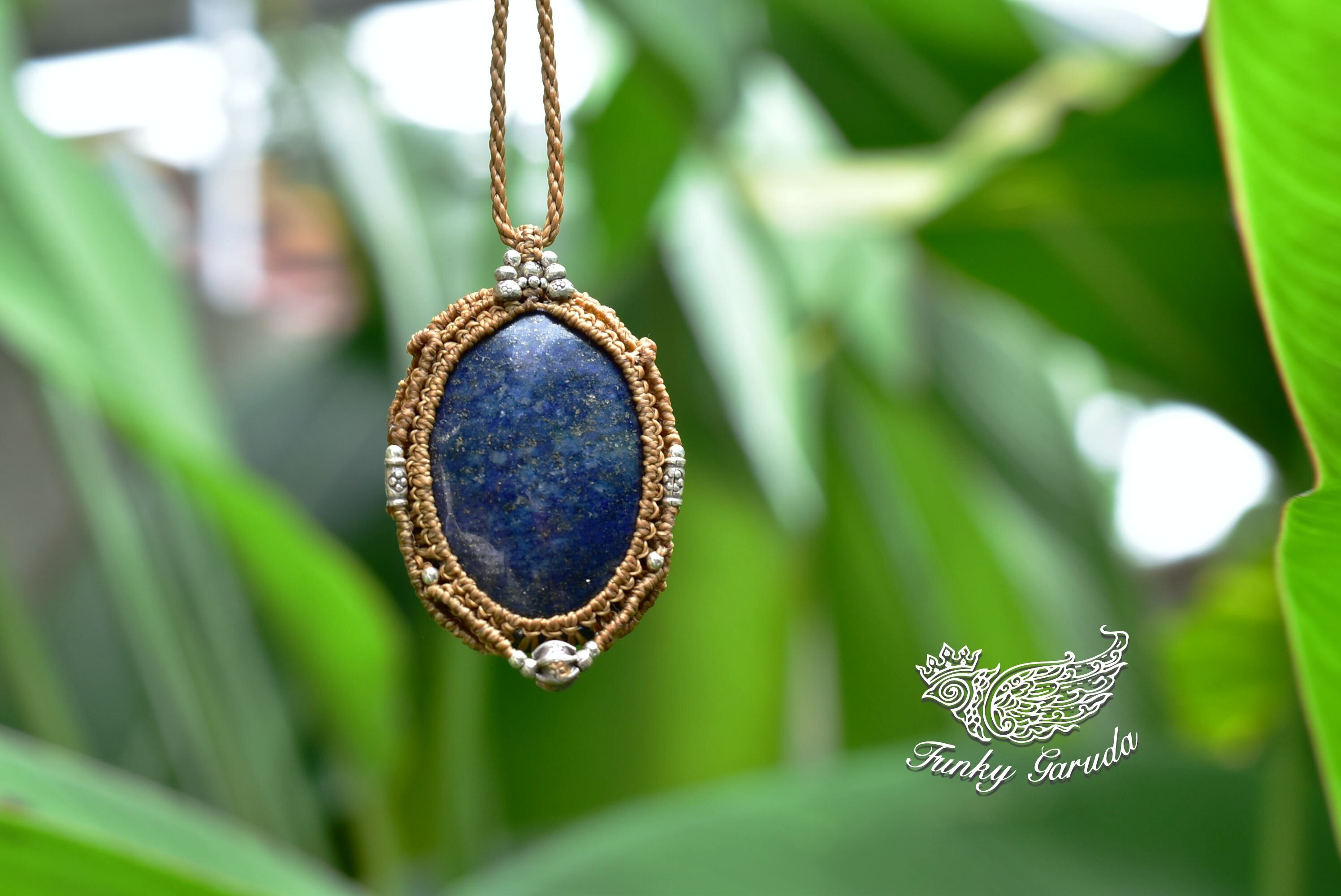 金色キラキラシラーをしっかりと見てとることができる重みあるラピスラズリ。研磨も美しく施されており、ディープなブルーカラーも良質な色合い。この石にカレンシルバーをそれぞれアクセントとして装着して編み込んだマクラメペンダントを仕上げました。