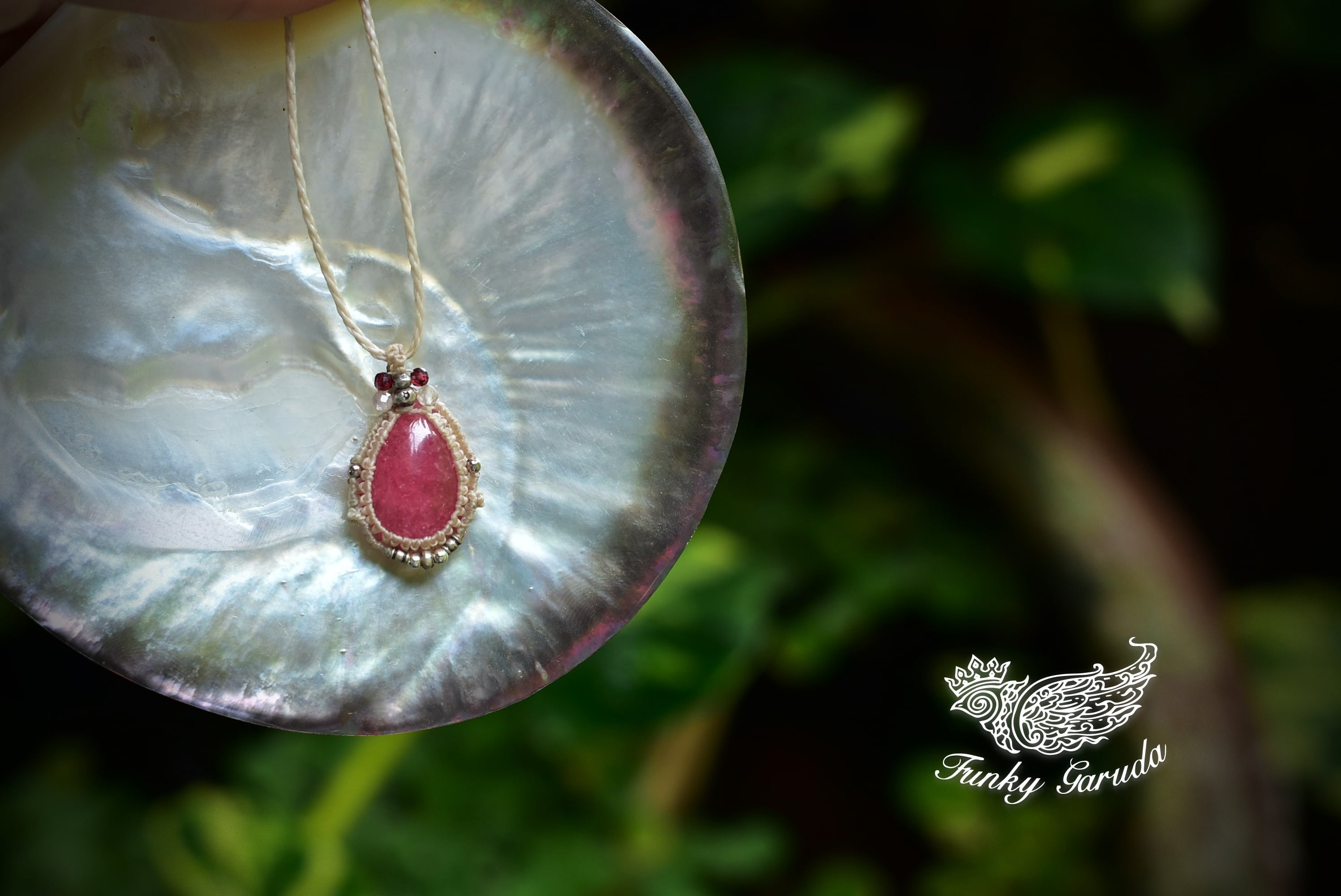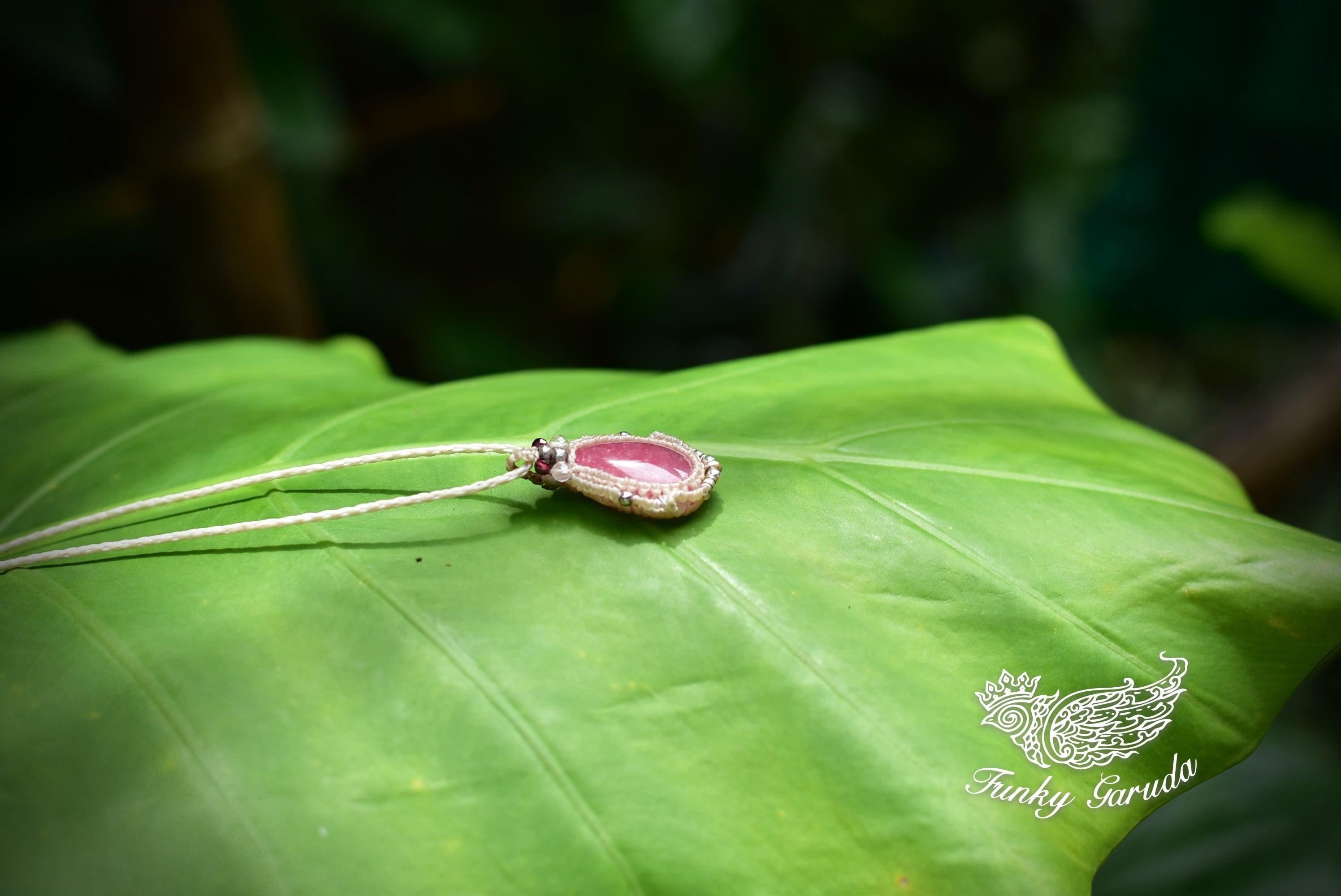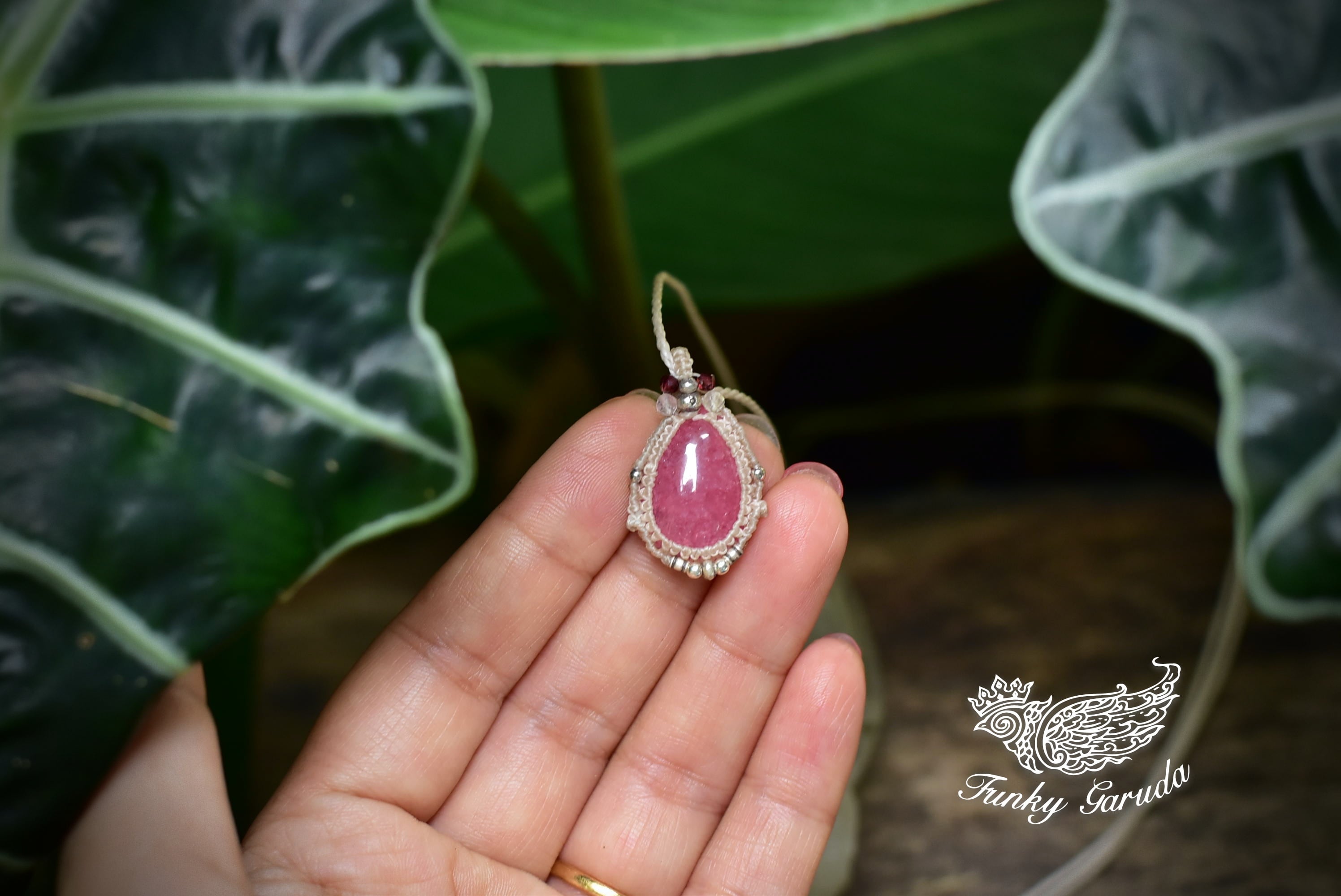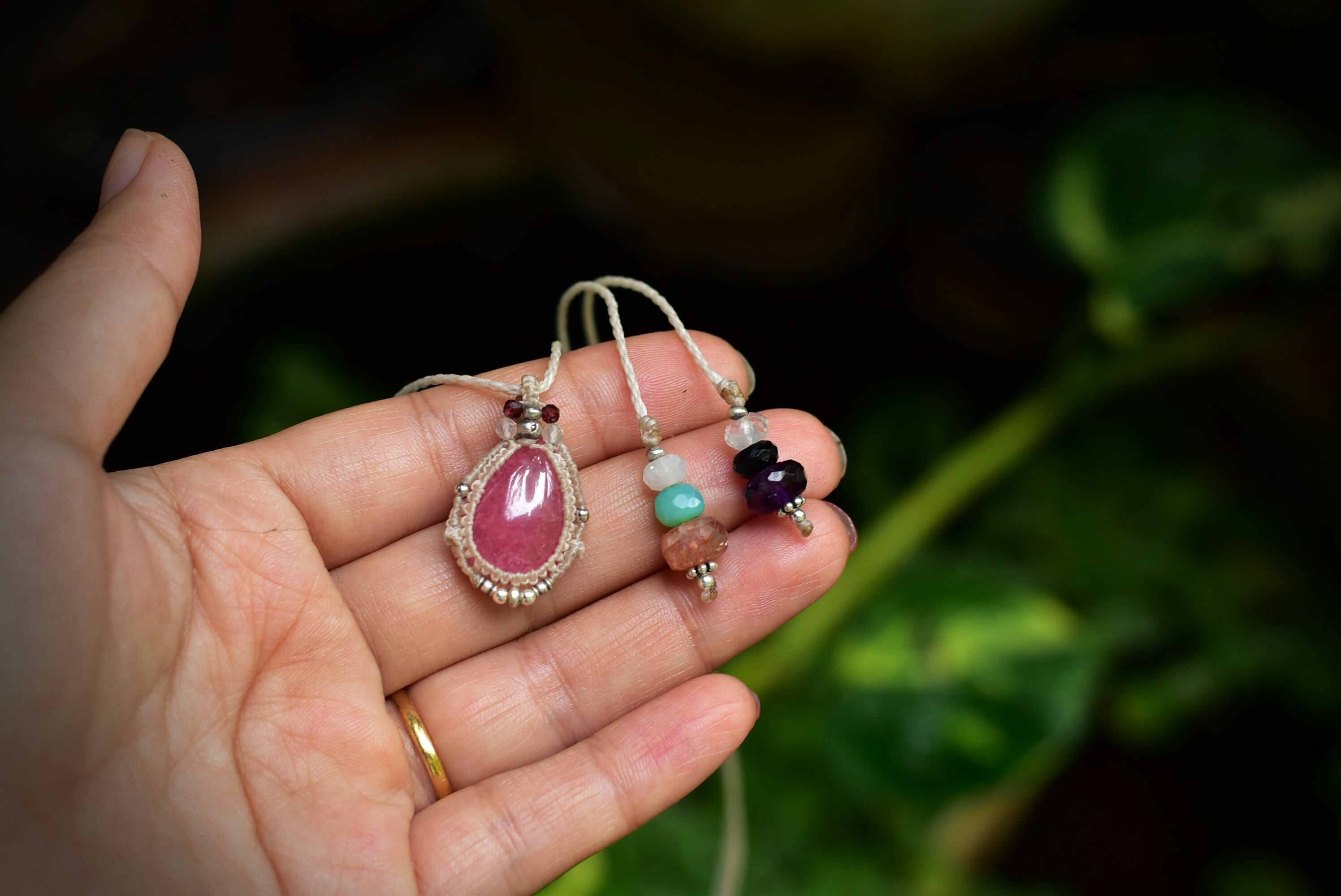 良質なピンク色を持つ愛の石、ロードナイトをシンプルにかつ、形がインパクトあるマクラメ編み装飾にて個性的に仕上げました。石の色味がよく出るようにデザインした、小粒ペンダント。 トップにはカットが施された水晶ビーズなどをあしらっています。