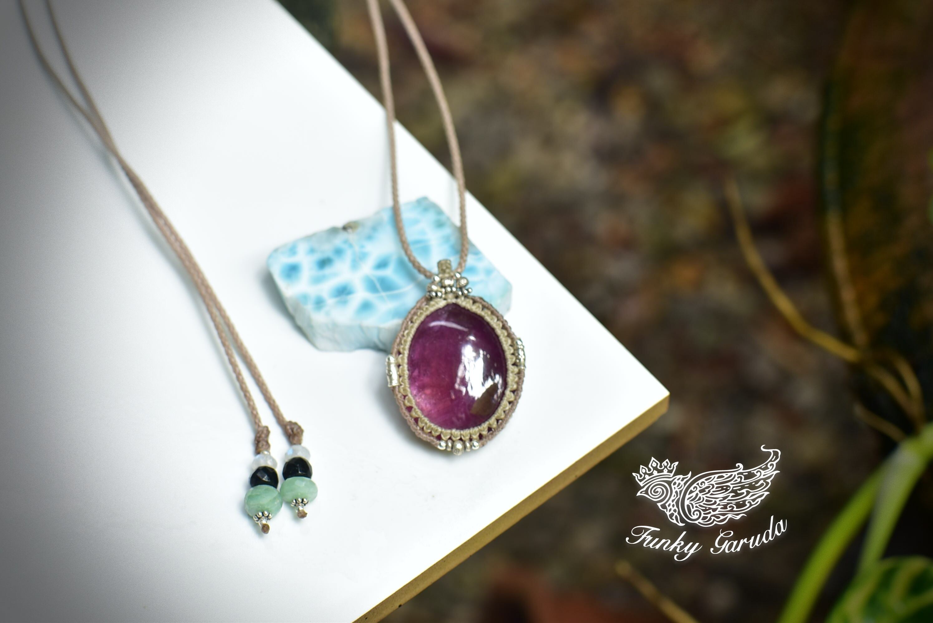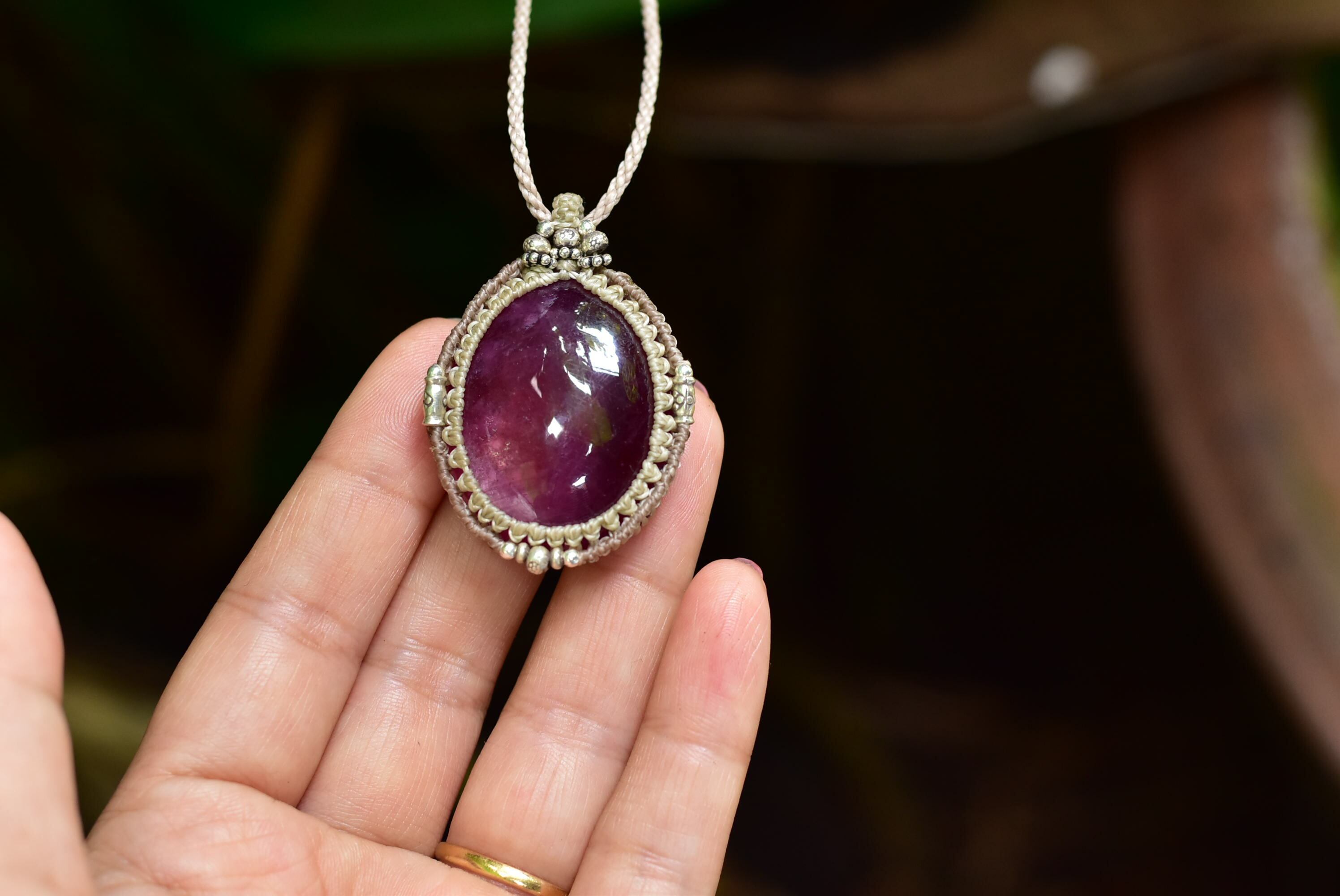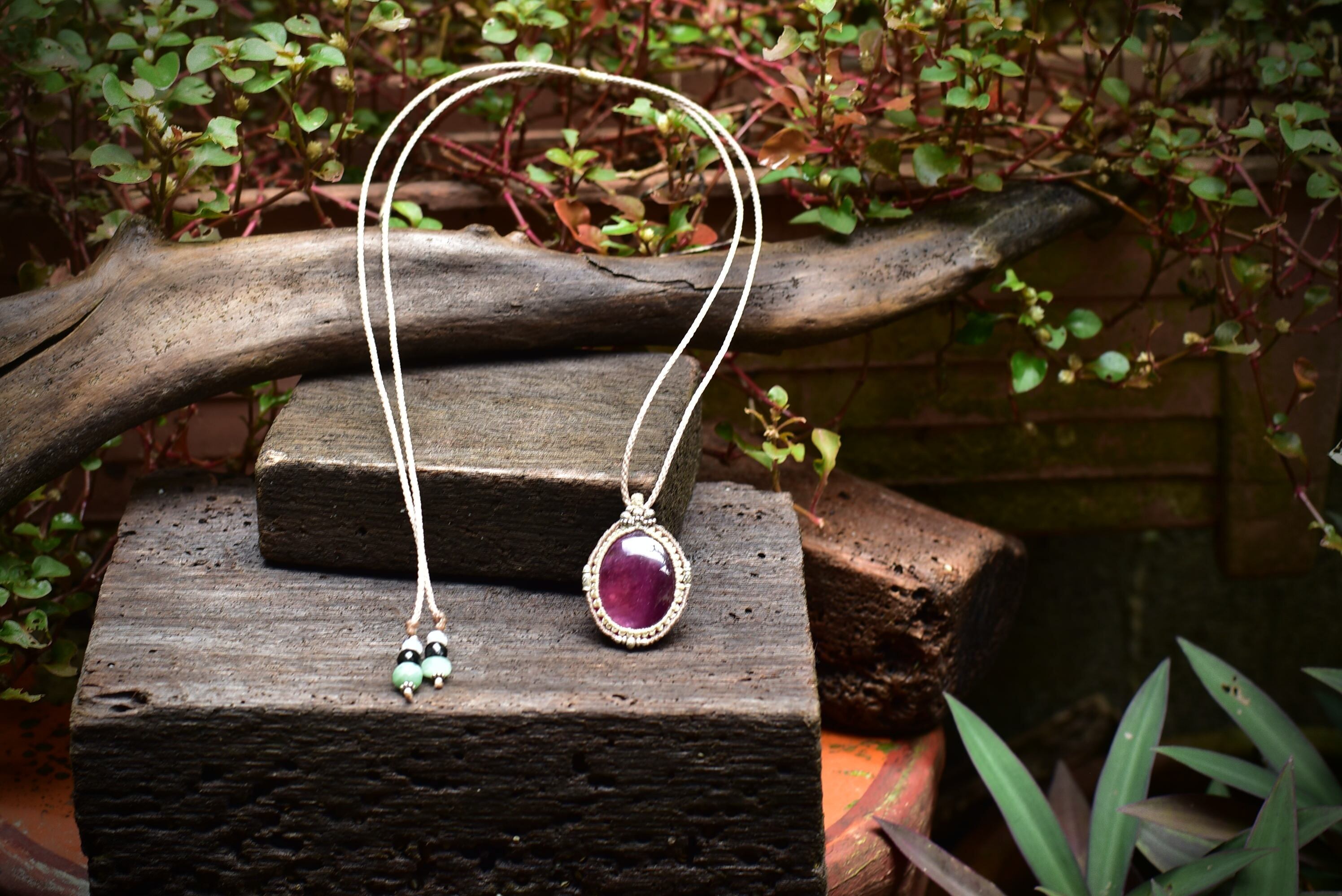 高品質なルビーの世界をマクラメ編み装飾することで金属を使用しない、ナチュラルなもの、天然石が体に密着するペンダントを目指して制作しています。