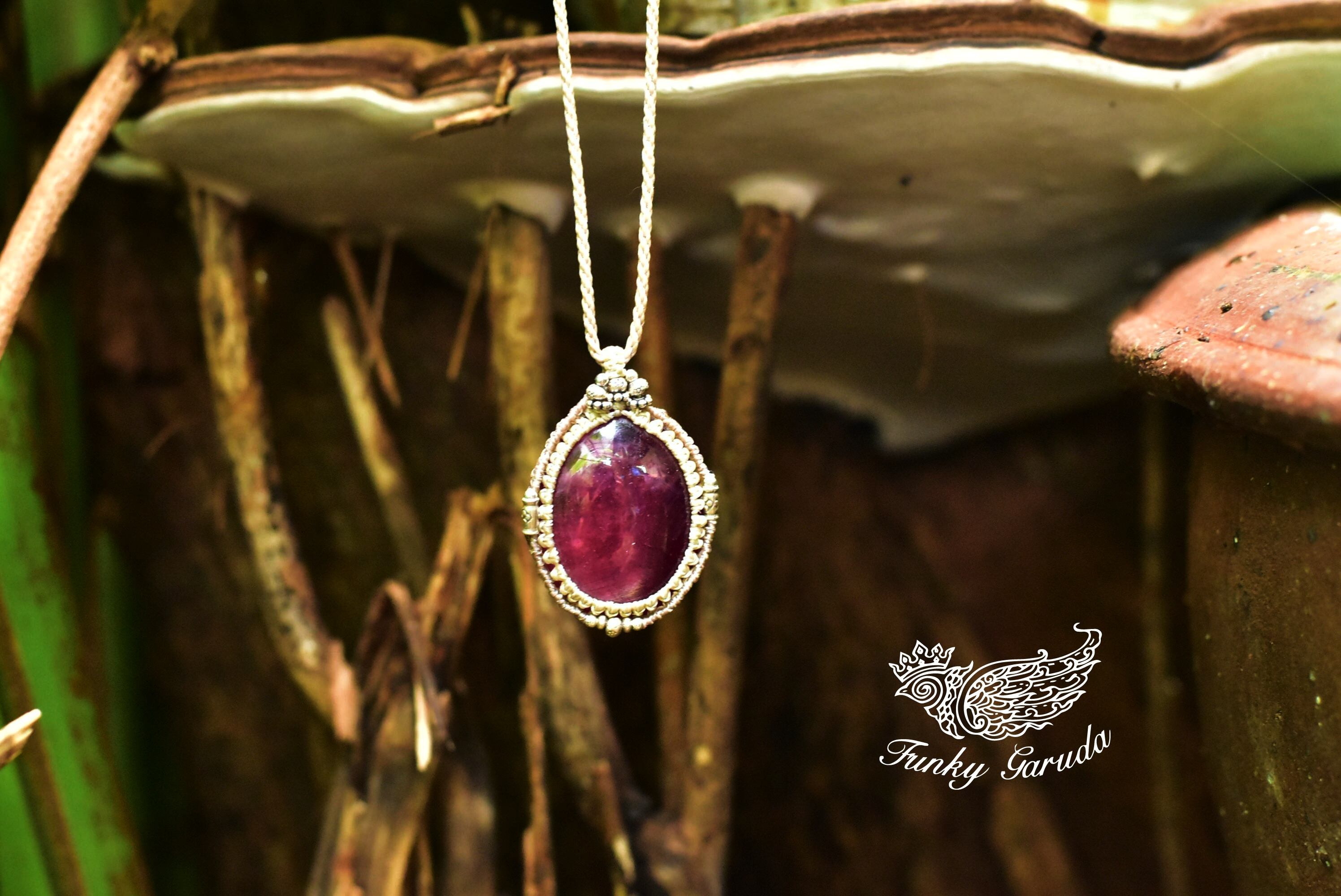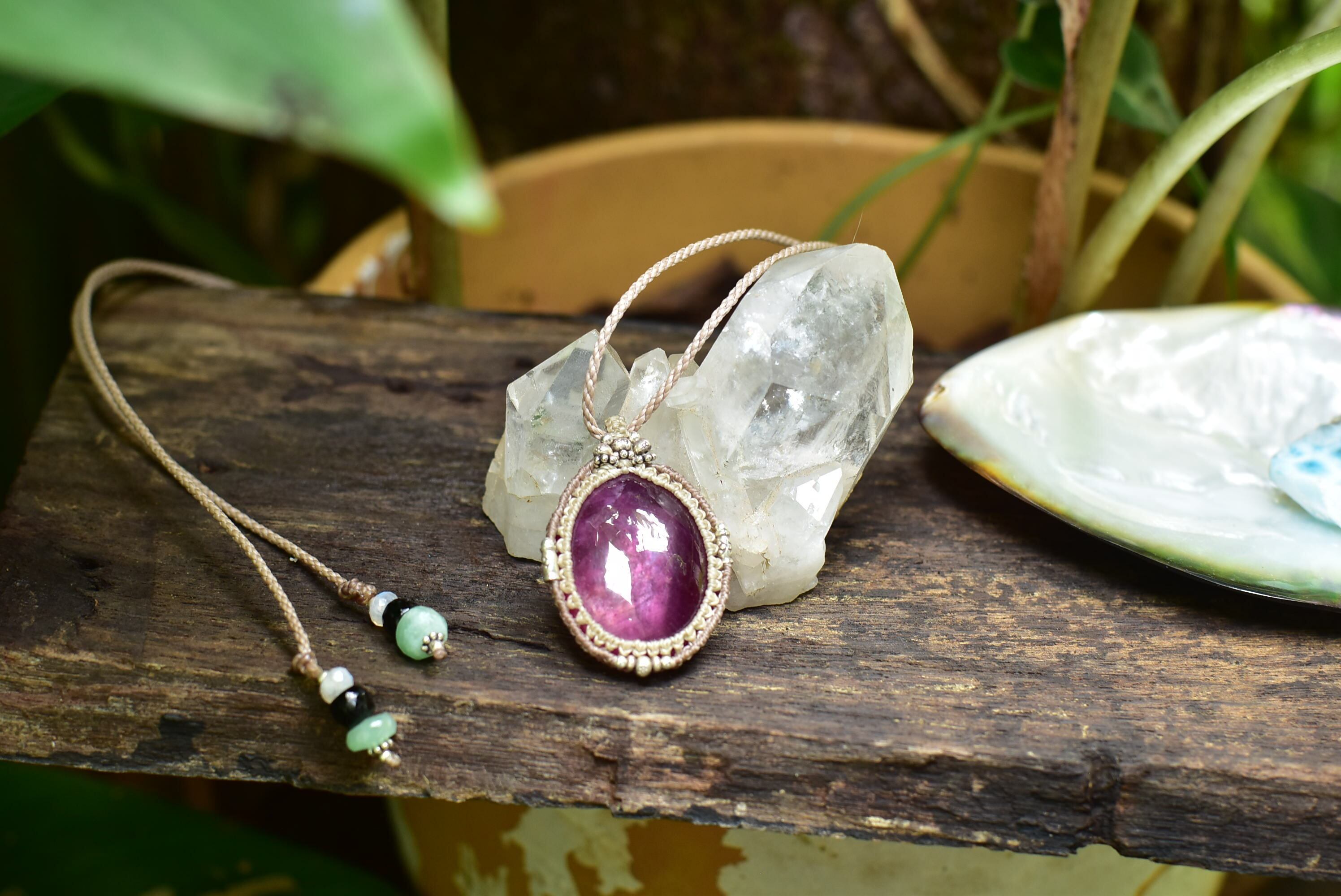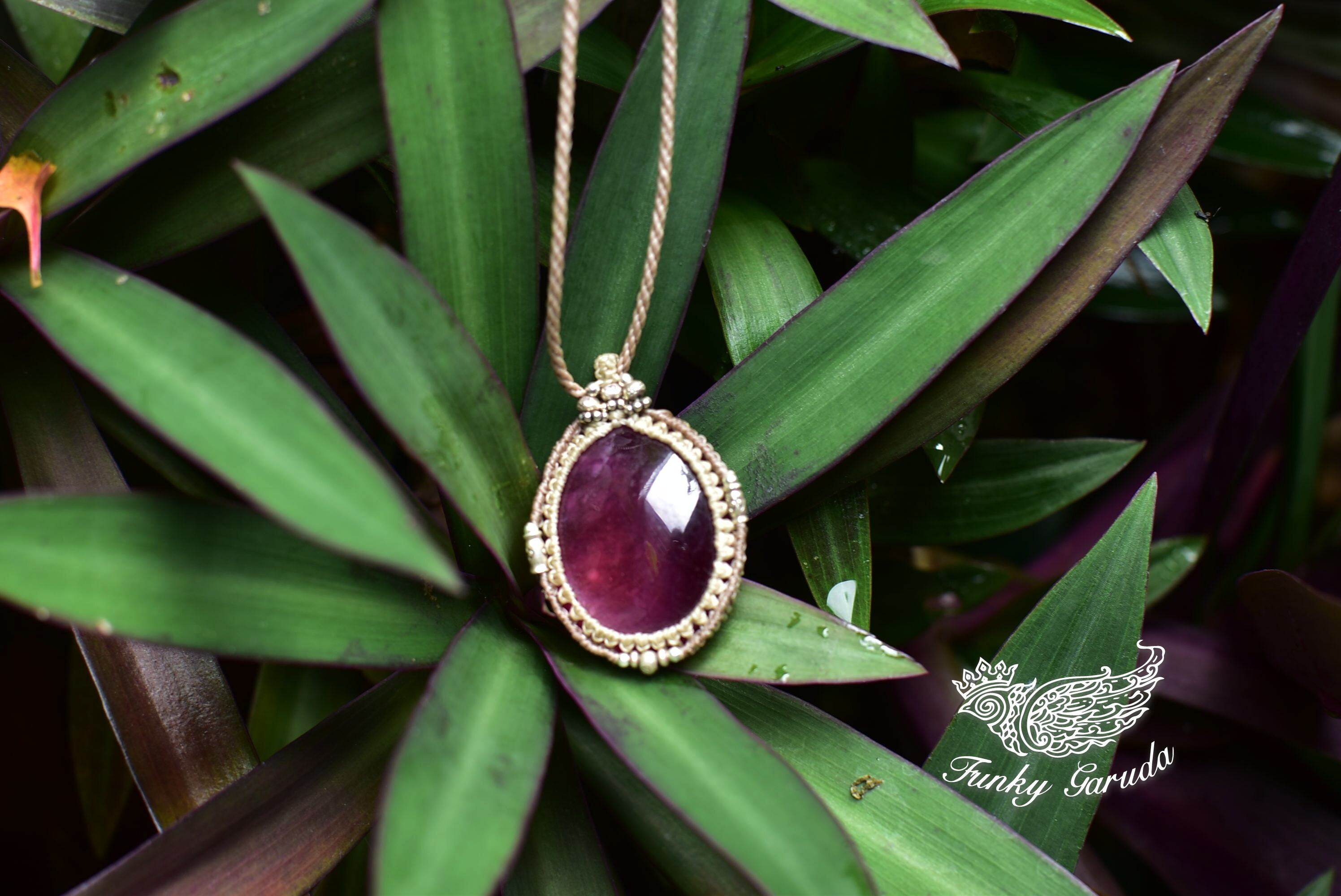 高品質なルビーの世界をマクラメ編み装飾することで金属を使用しない、ナチュラルなもの、天然石が体に密着するペンダントを目指して制作しています。