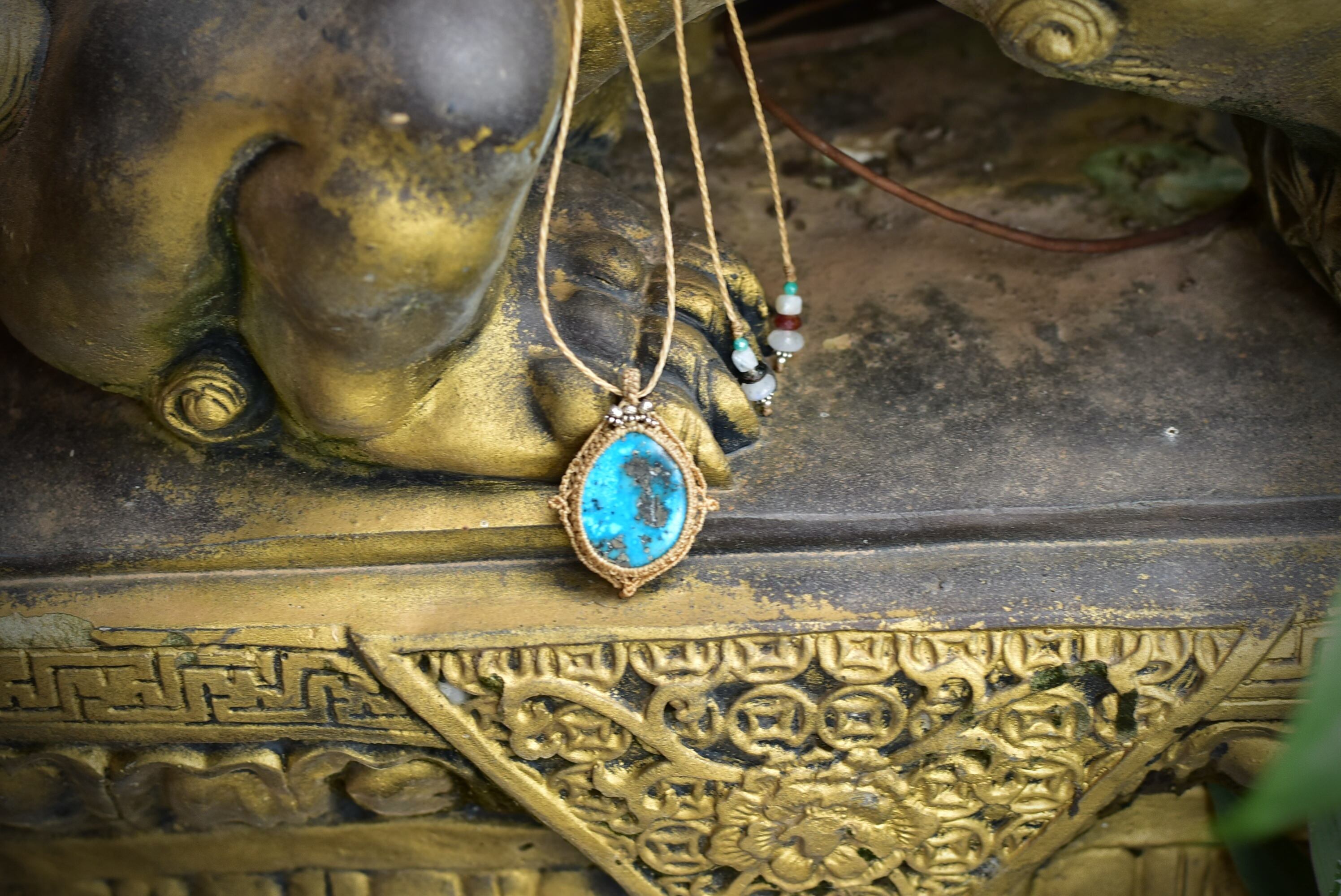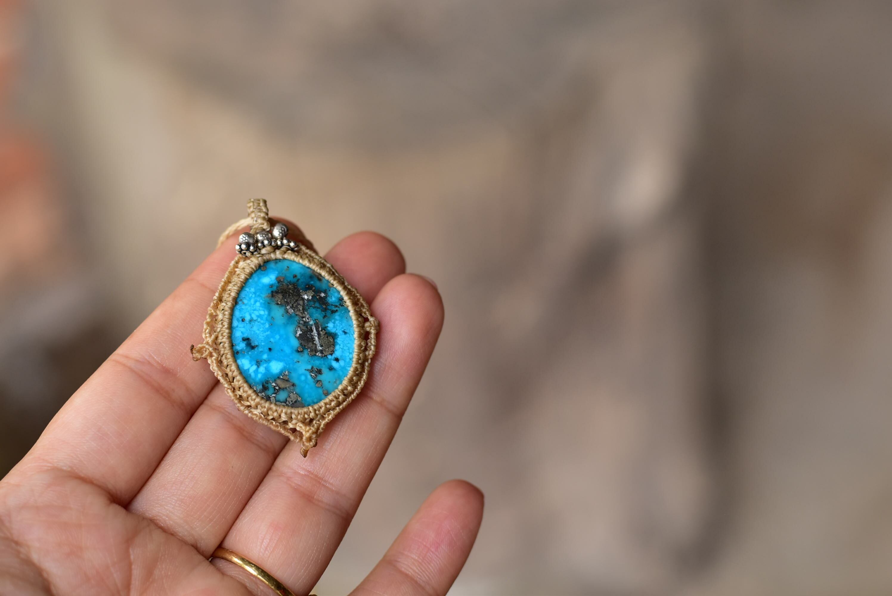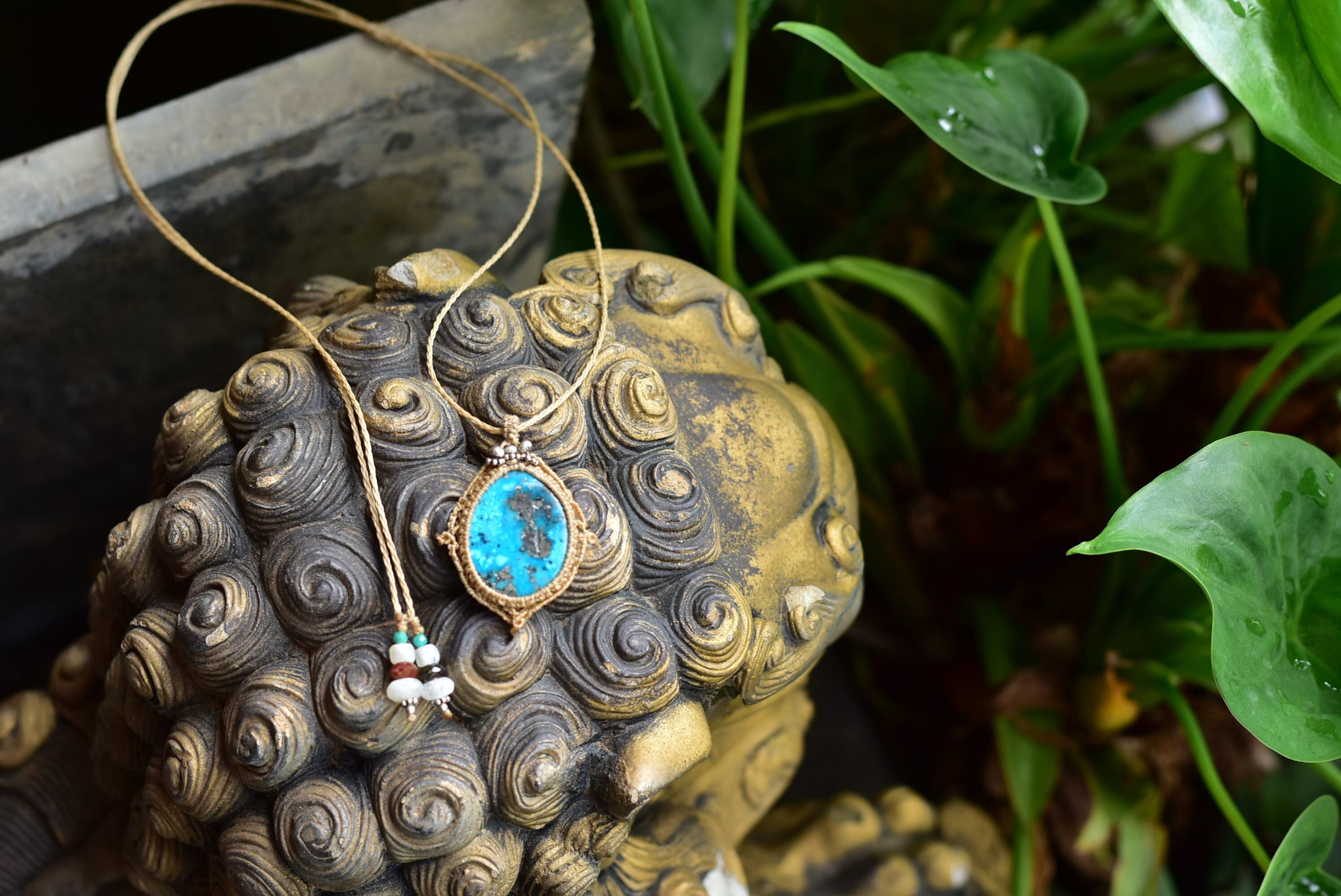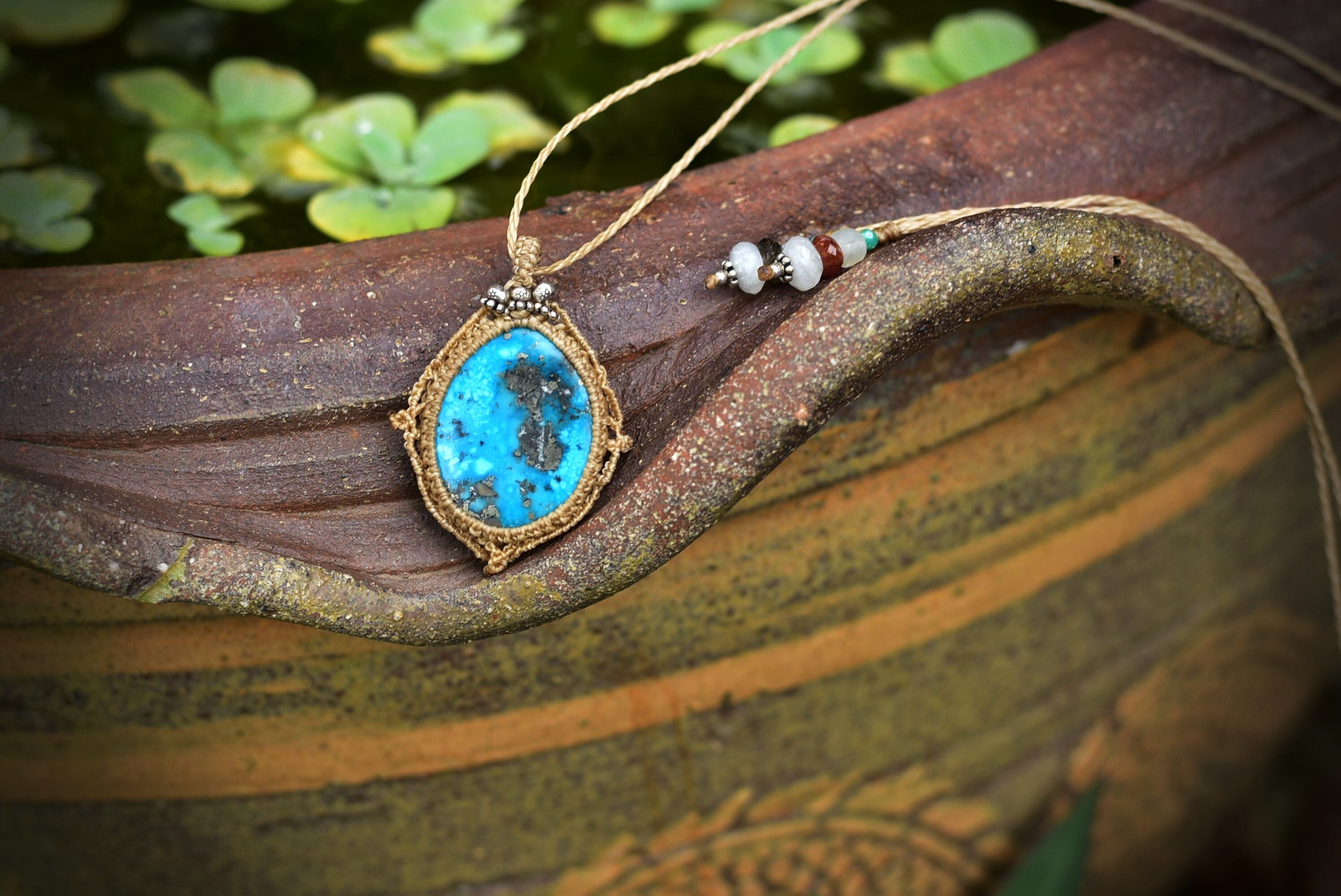 鮮やかな海の世界を表してくれているかのようなターコイズのブルー。個性的なピースをコンパスの道しるべに見立てて、マクラメ編み装飾を施しました。