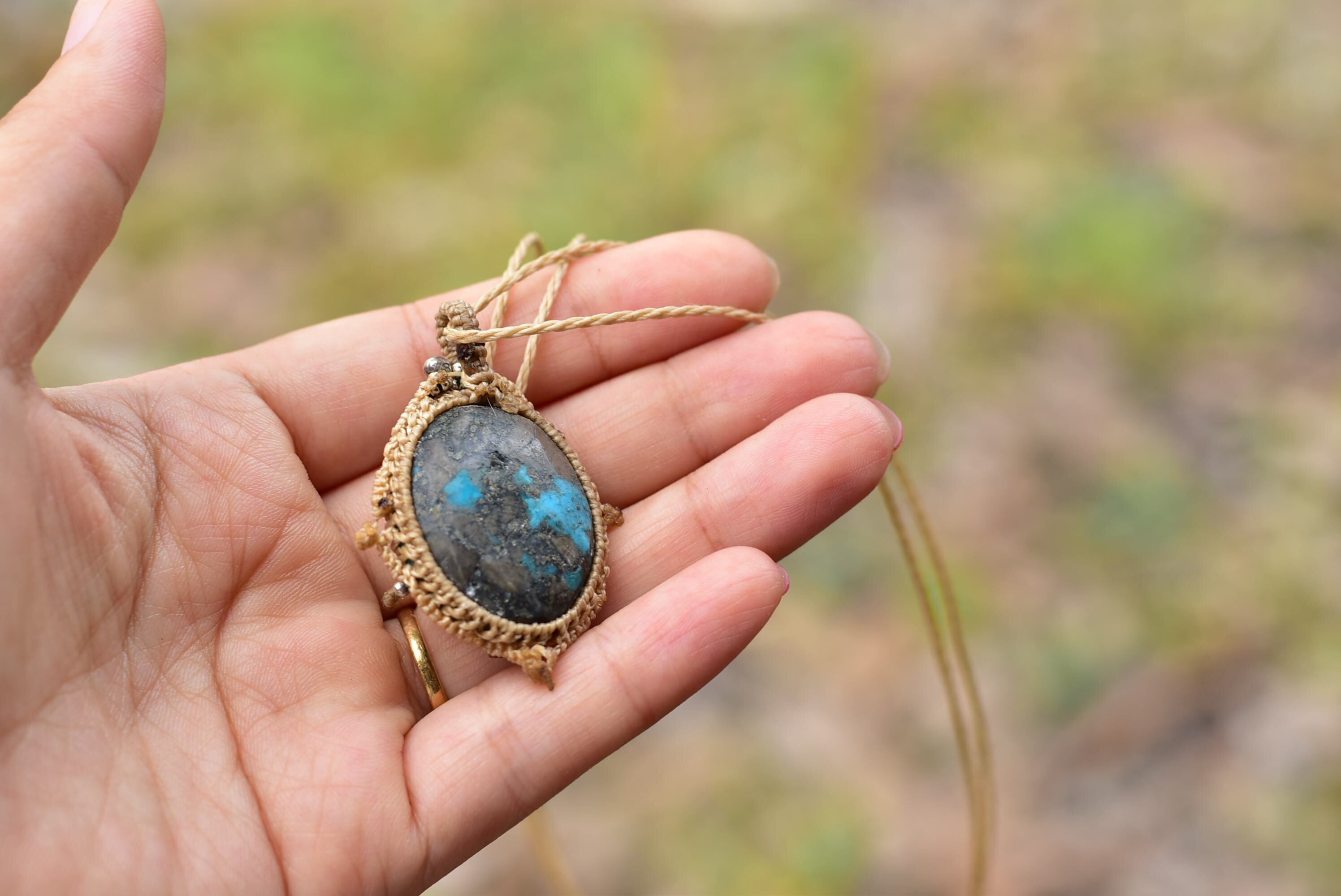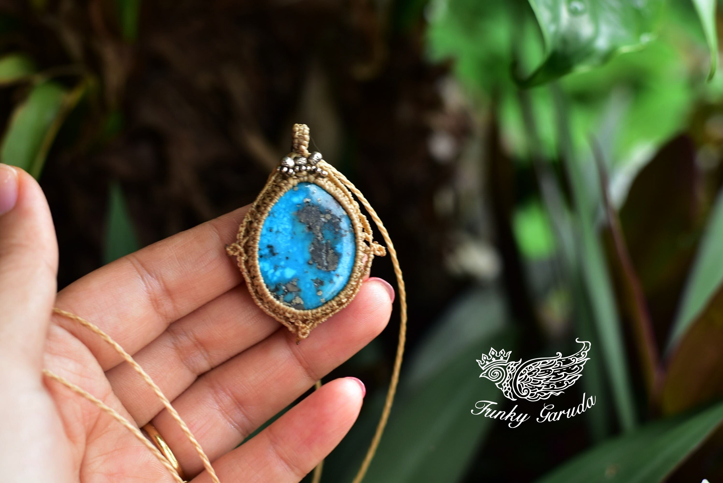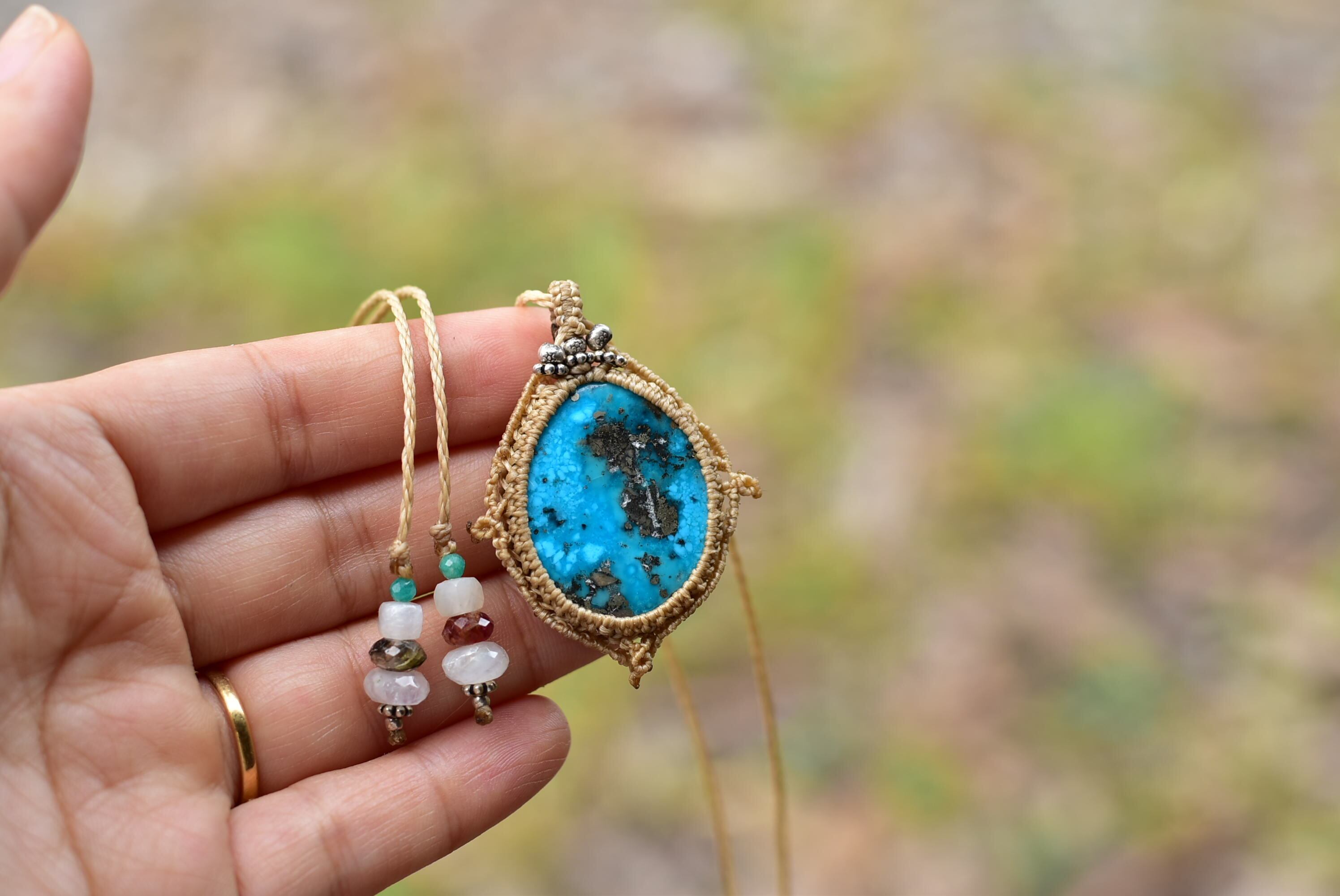 鮮やかブルーグリーン★ターコイズ マクラメペンダントtur020