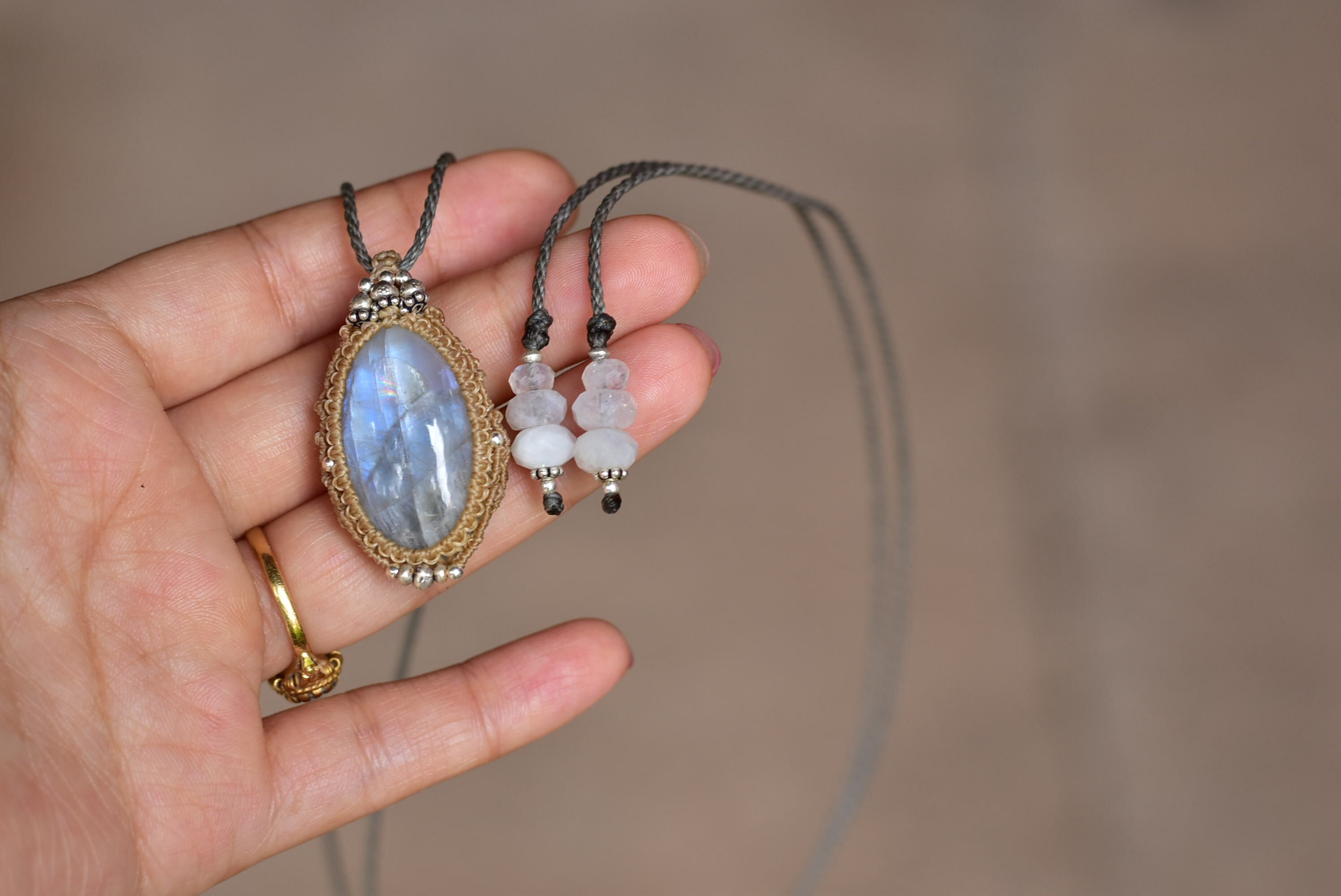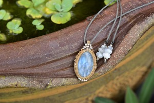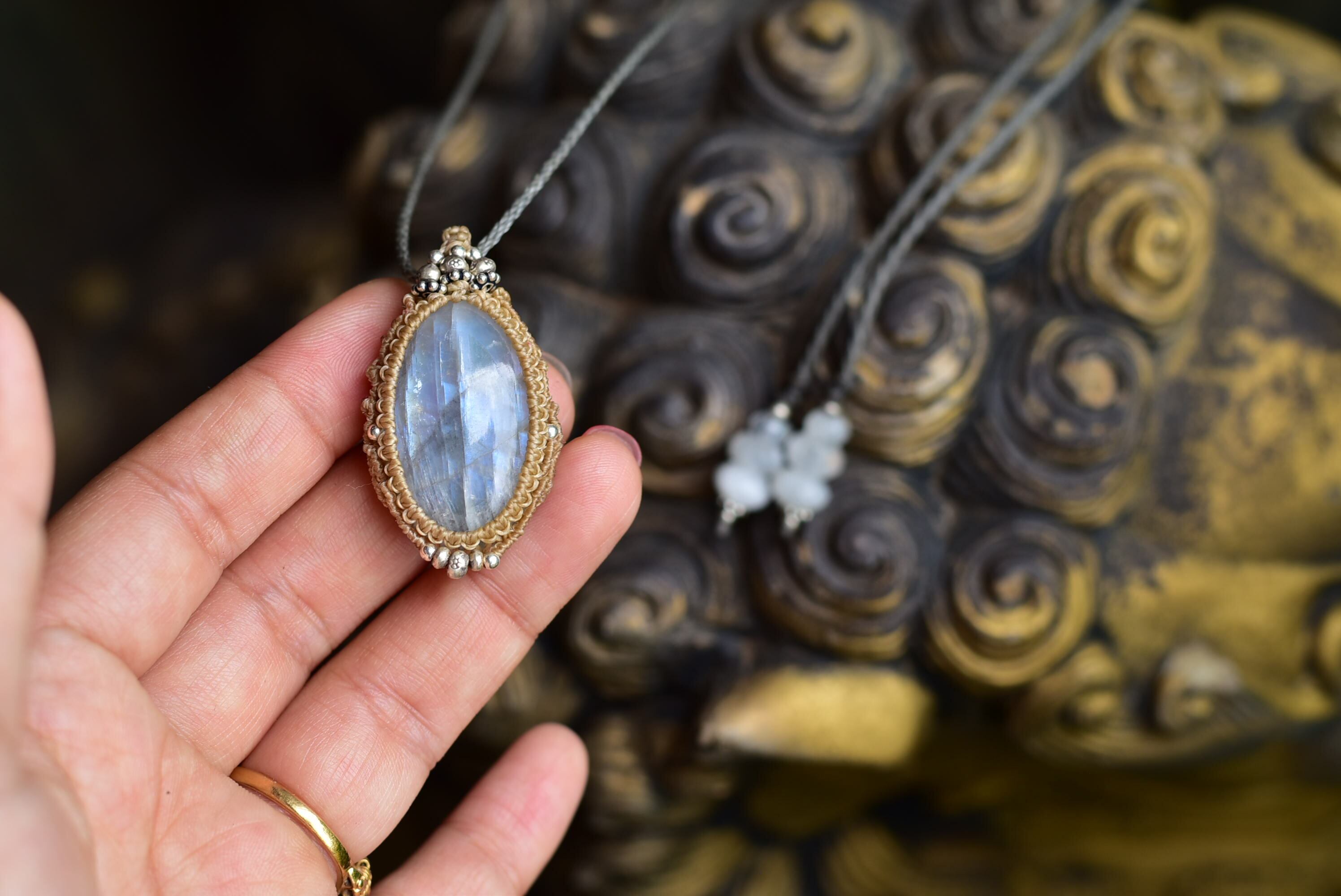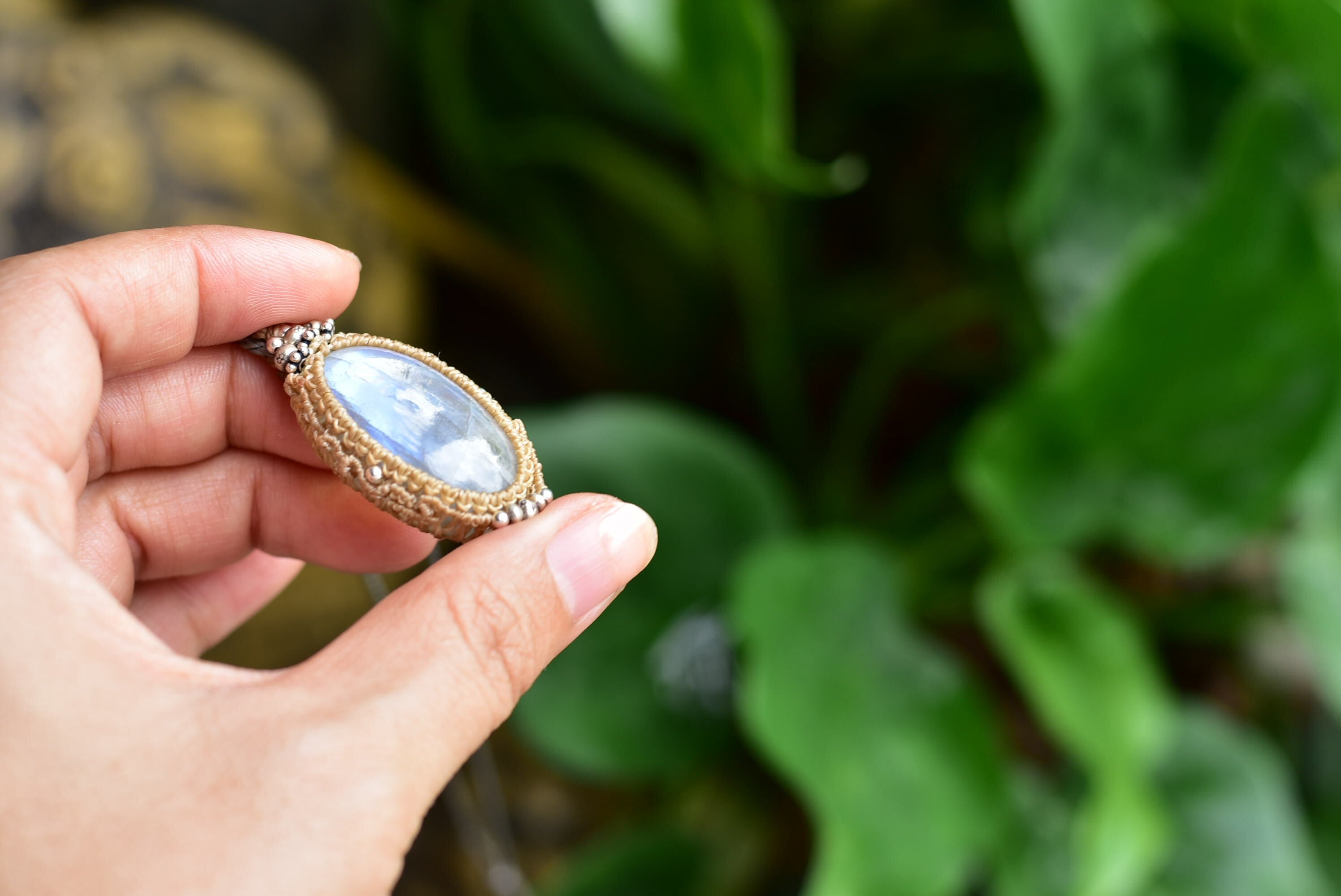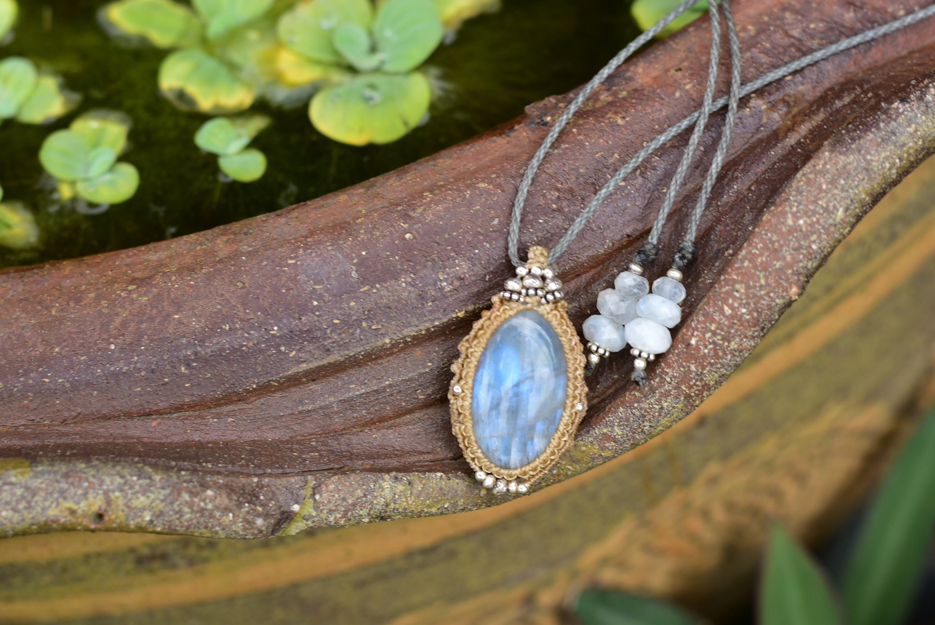 プラチナブルーのシラーがしっかりと見てとることのできる高品質なムーンストーンを細めの糸でしっかりと巻き、マクラメ編み装飾を施しました。